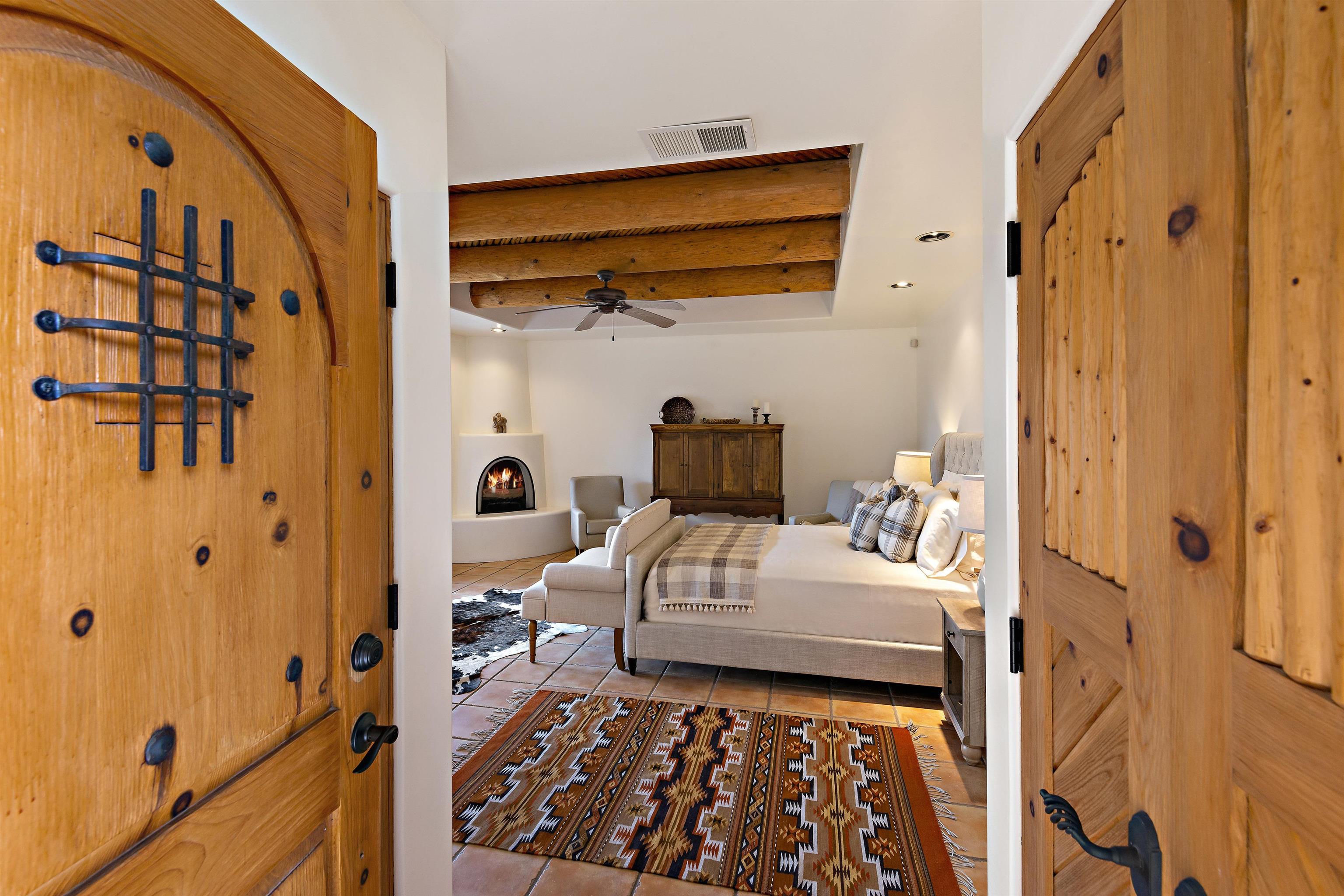 Quintessential Santa Fe Style, 3 bedroom, 3.5 bathroom home plus a 600 +/- square foot guest casita. Tall latilla ceilings, custom vigas, diamond plaster walls, traditional kiva fireplaces, and large windows with awe-inspiring Sangre de Cristo views throughout. The guest casita is perfectly equipped with full a bathroom and soaking tub, coffee station, separate entrance, and courtyard. This gorgeous home has a large back yard, on 1.36 acres, with two magnificent water features, an outdoor kiva, mature fruit trees, separate garden space, and oversized two car garage. The chef's kitchen is bright and open with Dakor cooktop and double ovens. The private primary suite--includes a large walk-in closet, a luxurious bath with whirlpool soaking tub and spacious step-in double shower-- which is well separated from the two guest bedrooms and their shared bath. This magnificent property is a peaceful retreat but only a short drive from the city center and amenities. With abundant walking trails throughout the Campo Conejos neighborhood for you to enjoy the sweet Santa Fe serenity.