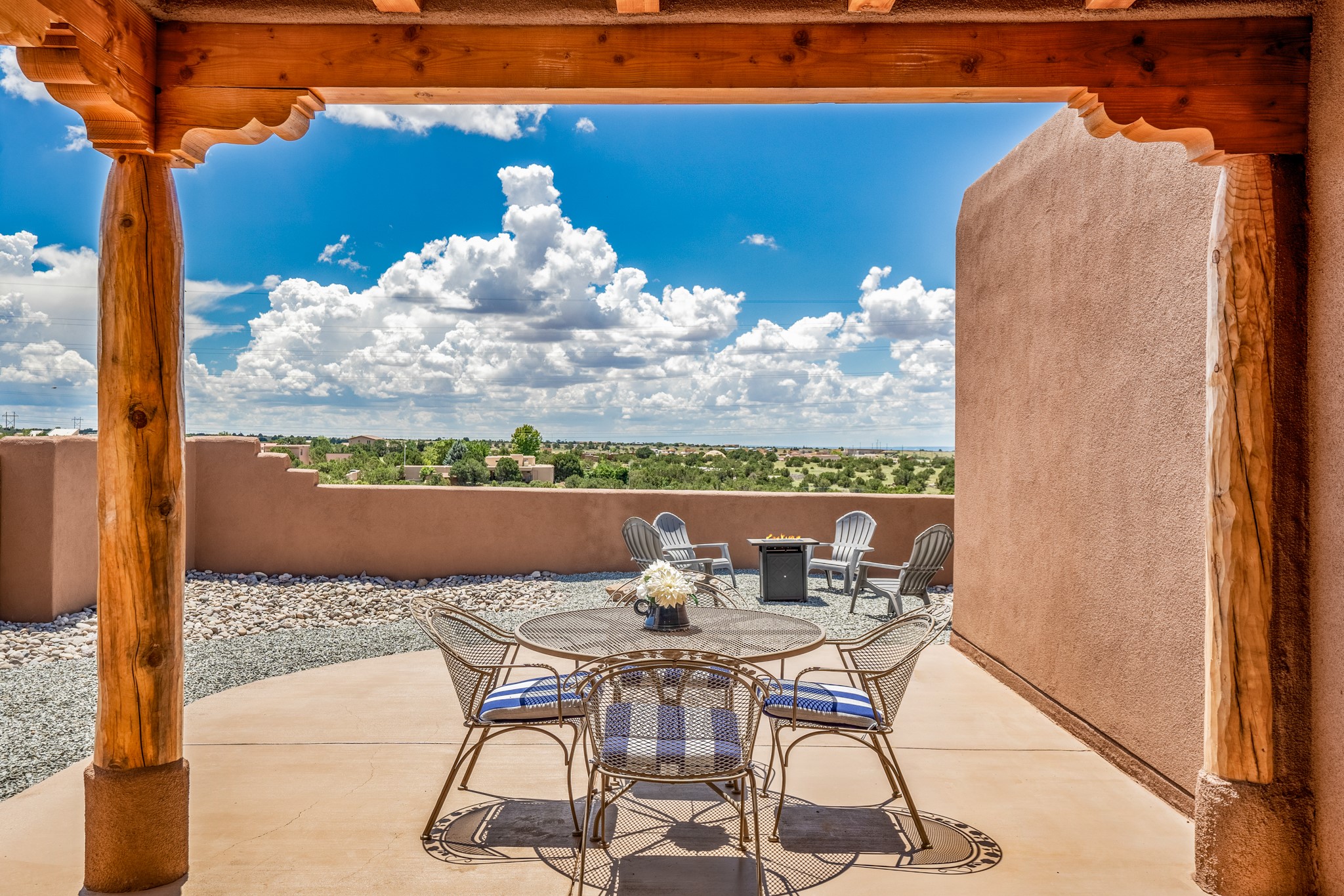 Welcome home, new and move in ready. New Price and a Great floor plan that flows from indoor to outdoor living. The living area offers a gas fireplace, beams, plenty of wall space to display artwork and sliding glass doors leading to the private outdoor area for entertaining and year-round enjoyment. A thoughtfully designed open concept kitchen is sure to please the cook, with plenty of cabinets, beautiful granite-tops, all new kitchen appliances, and a breakfast bar that open to the large dining room with a gorgeous bay window. The large master suite offers a walk-in closet, double vanity sinks, granite tops, a walk-in shower and a split floor plan with plenty of space from guest bedrooms. One of the guest bedrooms could easily be an office or studio. This home is one level, no stairs, conveniently located for shopping, medical, restaurants, and Pinon Elementary School District with easy access to the historic Santa Fe Plaza. New Construction with Santa Fe style, clean lines, corbels, beams, front and back portals, radiant heat, mini-splits, tankless water heater, plenty of storage, & fully enclosed yard. This NEW HOME is MOVE-IN-READY, no waiting for permits, materials or appliances this home has it all.