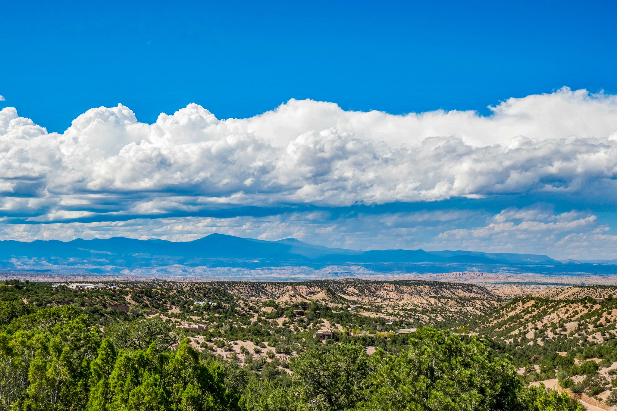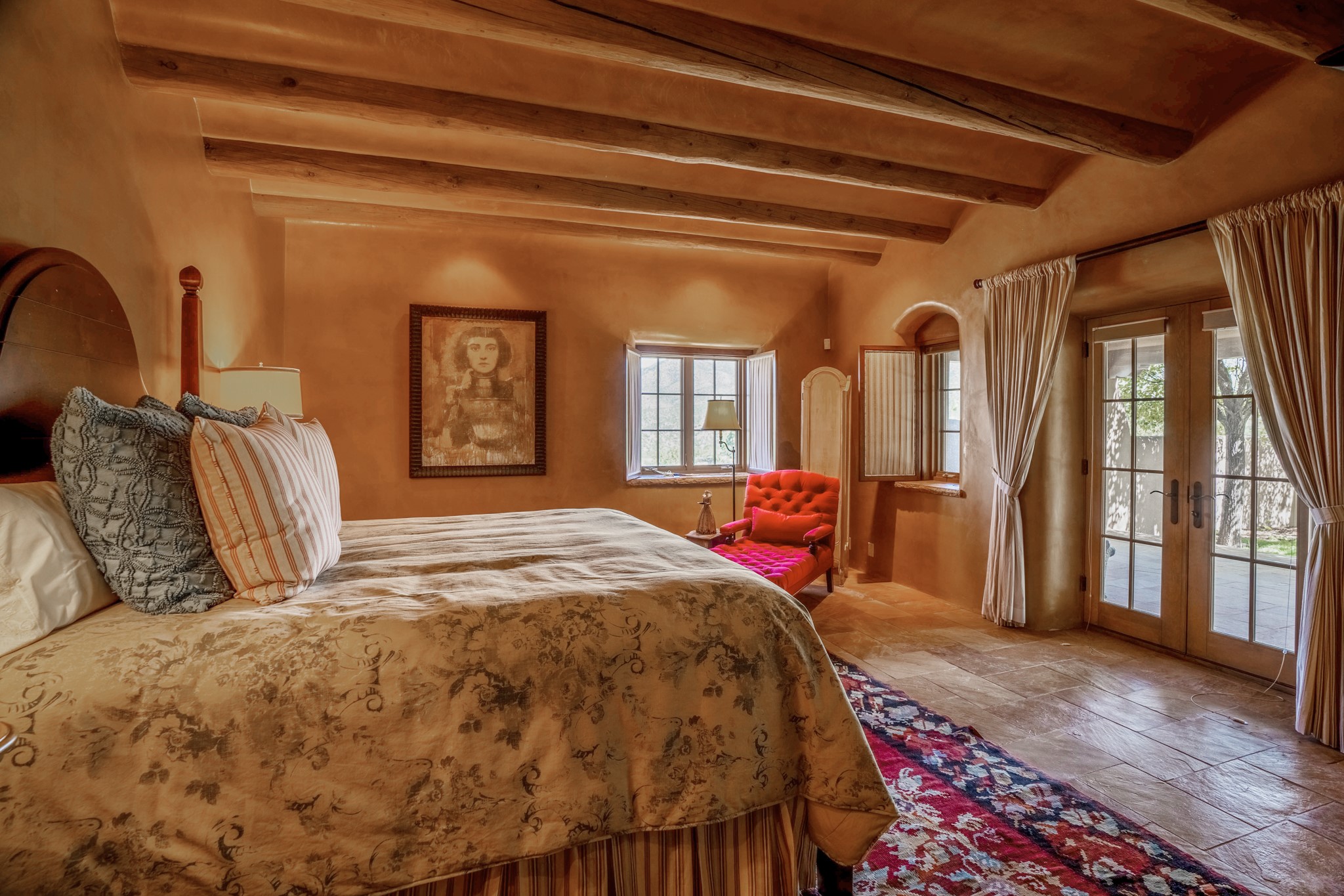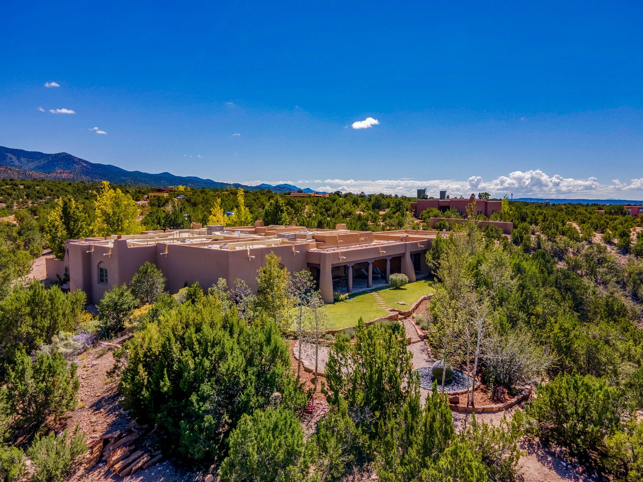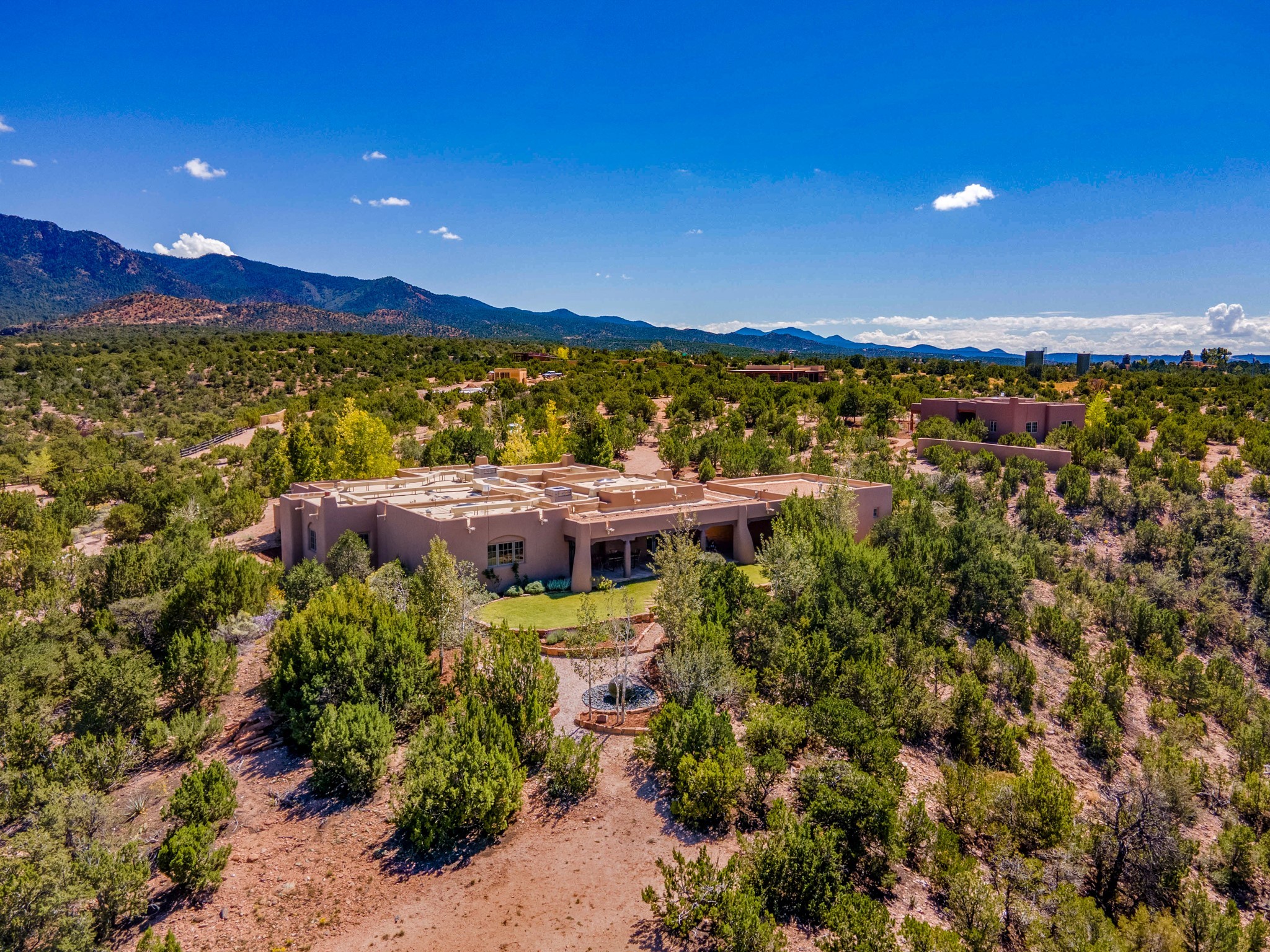 Panoramic, breathtaking views to the East, West and North. Located in a gated subdivision, Tesuque Villas, just 15 minutes from downtown Santa Fe, and minutes from the Four Seasons Rancho Encantado Resort and the Tesuque Village Market, this 3700 sq. ft. main house and 1400 sq. ft. guest house are sited on 3 individually parceled lots, where you are surrounded by 8.58 private acres with spectacular views. MAIN HOUSE: The 4 bedroom/3 bathroom main house has artistry throughout with high, coved viga ceilings, Roman columns, numerous nichos, fireplaces throughout, beautiful arches and 2' thick walls for superior thermal mass. The generous kitchen, with its large island and high-end stainless steel appliances flows into the dining and living rooms which all have direct access to the deep West-facing portal. The panoramic views from both the West and East-facing portals allow you the feeling of being nestled, yet also experiencing the beauty of the horizon. GUEST HOUSE: The guest house, which consists of 2 bedrooms, 1 large office, a bathroom and a gym is located at the adjacent 11 Heather Lane. It has its own, private driveway but is connected to the main house via a lovely walking path. If a kitchen is desired in the guest house, it is possible to convert the gym space into a kitchen. With 3 separately deeded lots, this impressive property offers the Buyer flexibility of use in the present and in the future! Magical views and exceptional craftsmanship combine to make this Southwestern estate your Santa Fe dream home.
