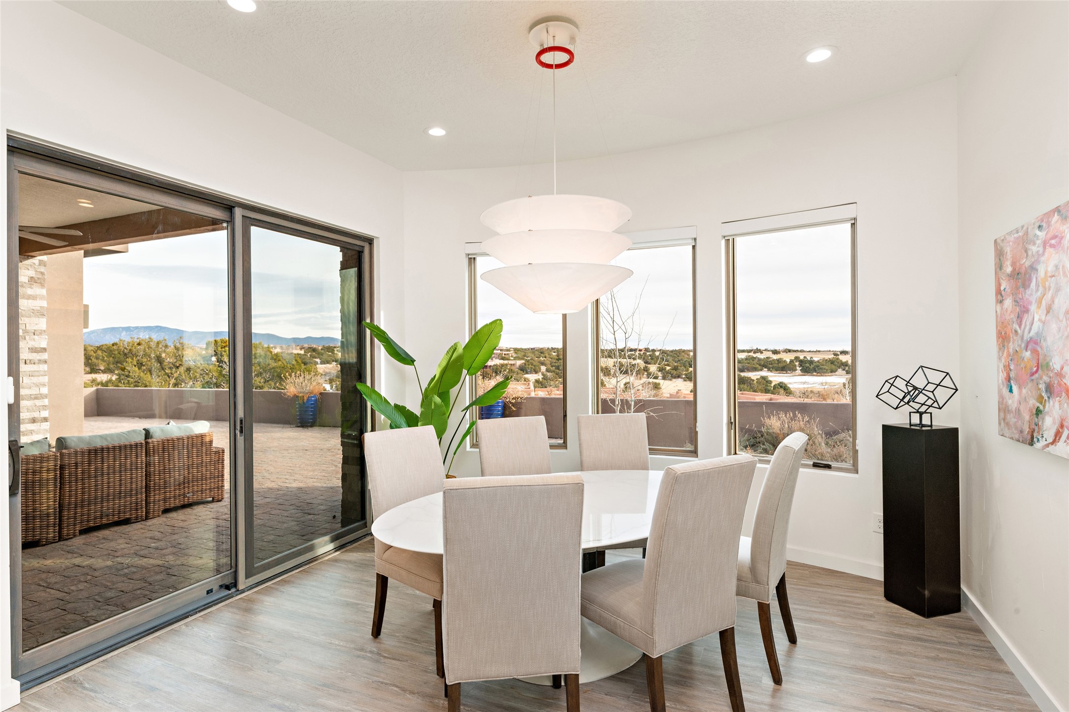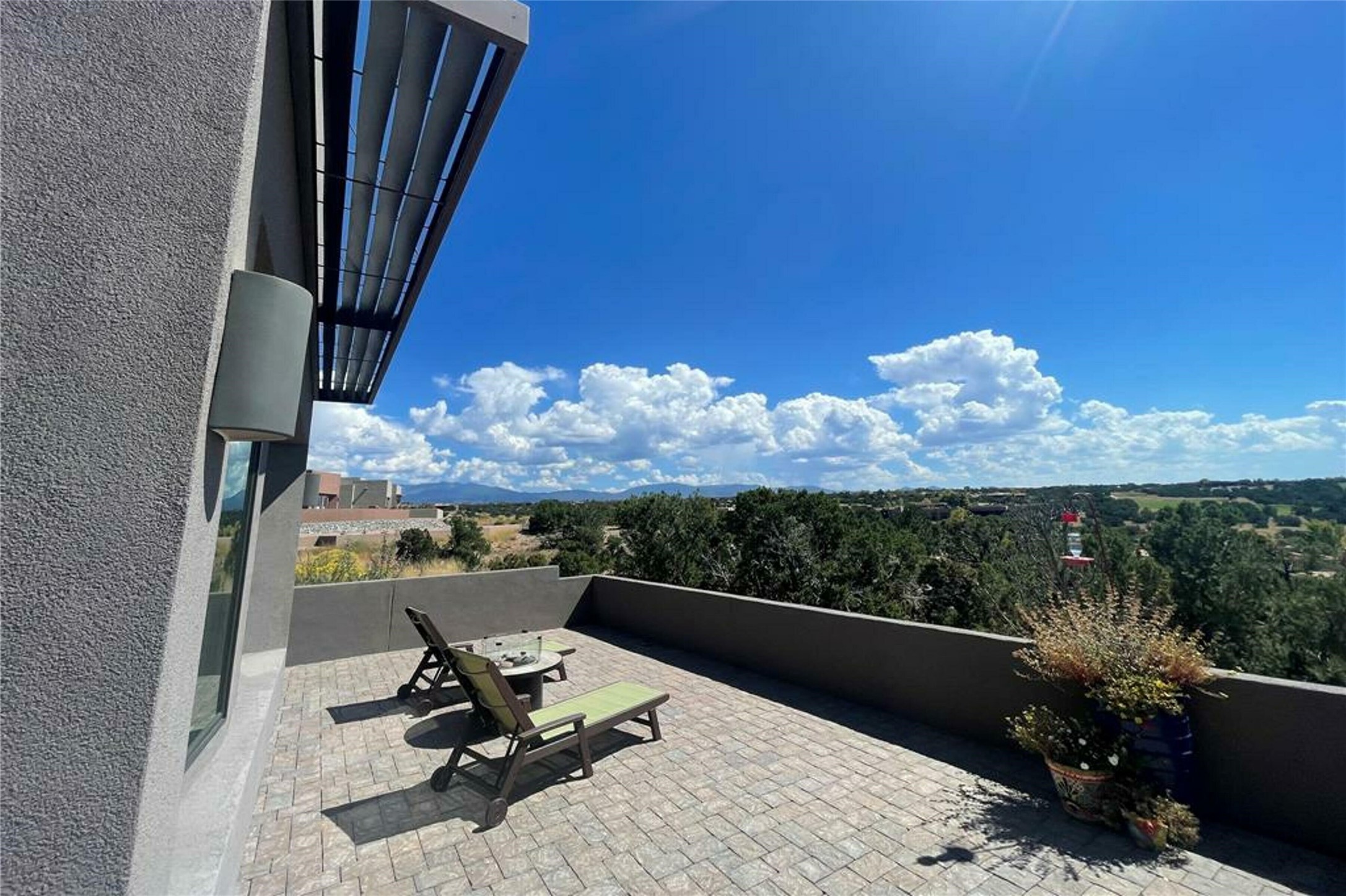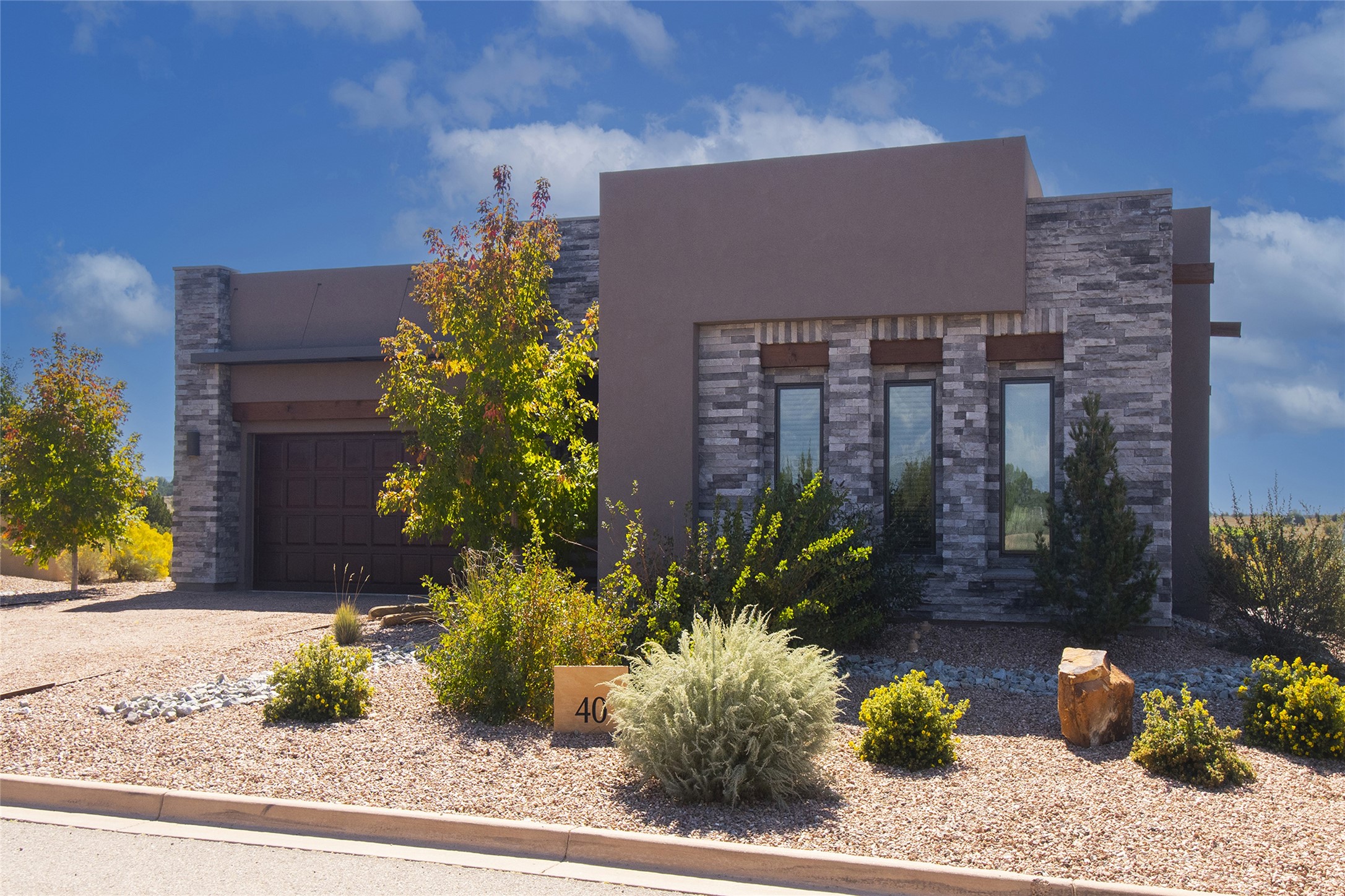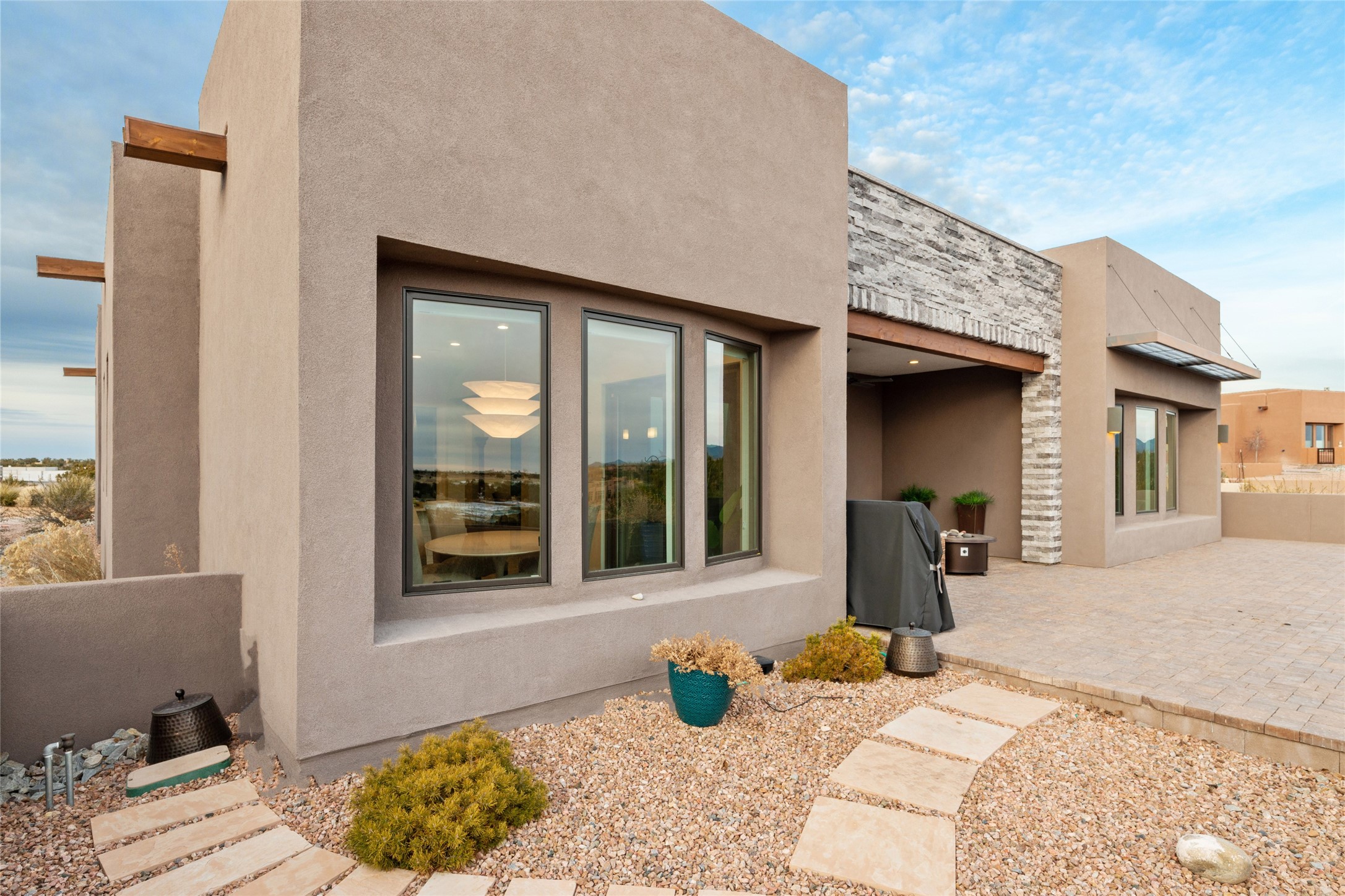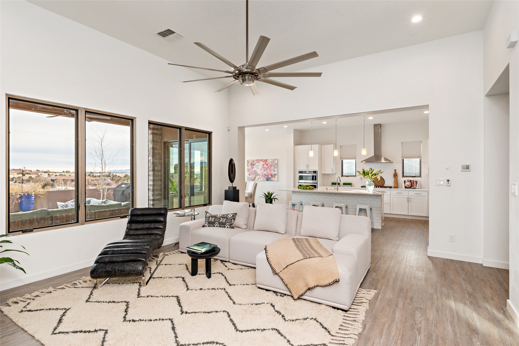 Floating on a ridge overlooking the Sunrise Golf Course in Las Campanas, this spacious, contemporary home captures beautiful views and sunsets, and has 4 bedrooms, 4 bathrooms and a 2-car garage. Enter through a gated breezeway and courtyard into a light-filled, open-concept great room with a gas fireplace, with stone surround, dining room, large, white kitchen that includes a big island, tons of cupboard space, walk-in pantry and cafe area. The luxurious portal spans the entire back of the home! Great for big parties! The beautiful owner's suite has large windows with motorized shades. The owner's bath also has motorized shades, with dual vanities, soaking tub, separate shower and a walk-in closet. Added features include luxury vinyl flooring throughout, ceiling fans, beautiful landscaping with drip irrigation, and a tranquil fountain in the front courtyard. HOA fees include maintenance of gated and paved roads, and common areas, 24-hour roaming security, and 24-hour EMTs on site. Membership to the Club at Las Campanas is optional and subject to approval. Amenities include swimming, both indoor and out, tennis, pickle ball, fitness facility, equestrian, fine dining, and two Jack Niclaus Signature golf courses.