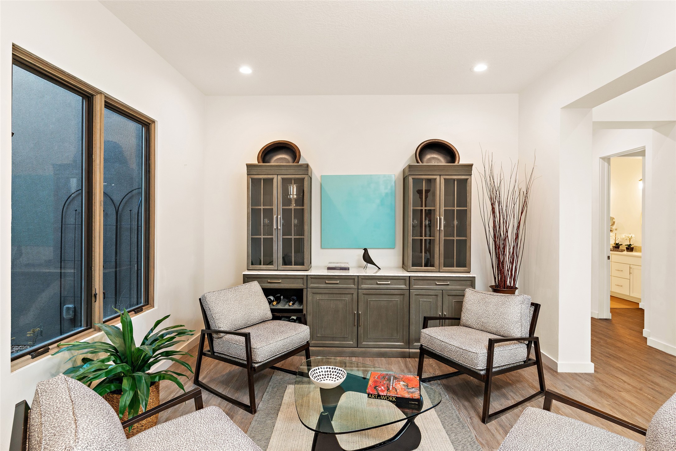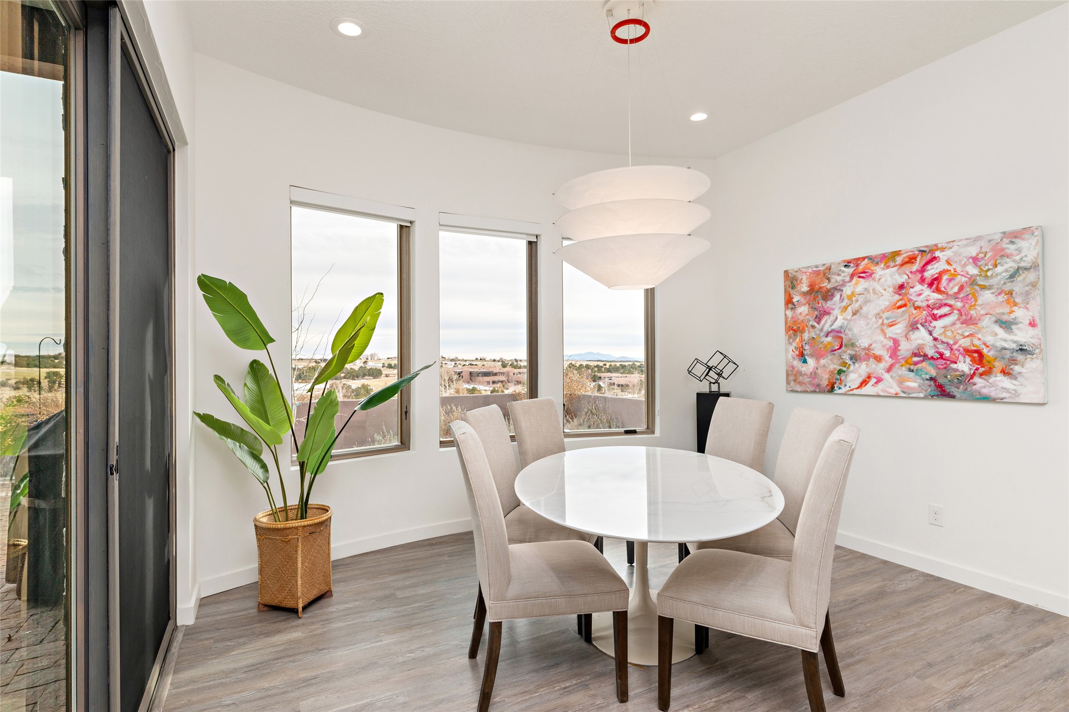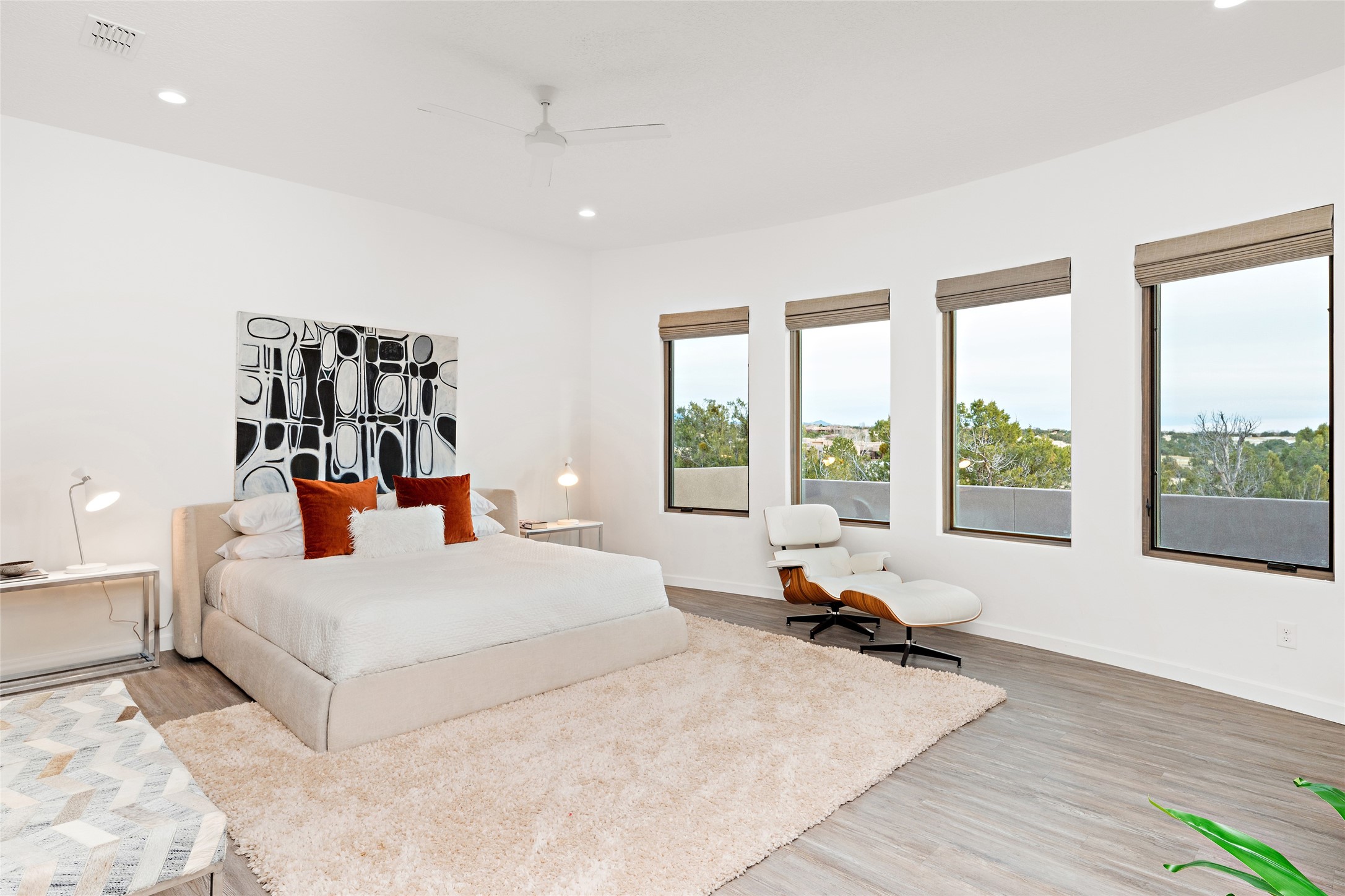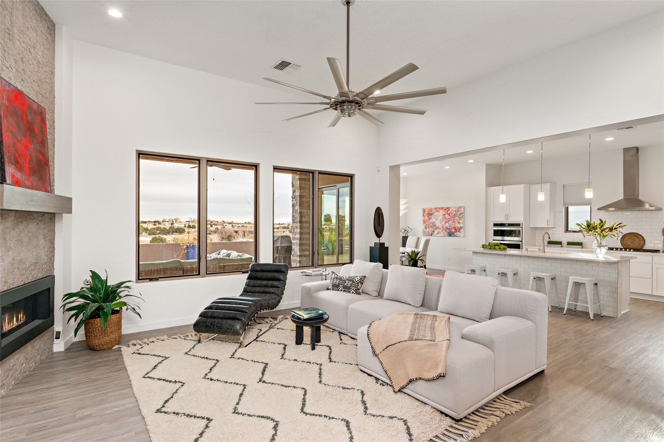 Floating on a ridge overlooking the Sunrise Golf Course in Las Campanas, this spacious, contemporary home captures beautiful views and sunsets, and has 4 bedrooms, 4 bathrooms and a 2-car garage. Enter through a gated breezeway and courtyard into a light-filled, open-concept great room with a gas fireplace, with stone surround, dining room, large, white kitchen that includes a big island, tons of cupboard space, walk-in pantry and cafe area. The luxurious portal spans the entire back of the home! Great for big parties! The beautiful owner's suite has large windows with motorized shades. The owner's bath also has motorized shades, with dual vanities, soaking tub, separate shower and a walk-in closet. Added features include luxury vinyl flooring throughout, ceiling fans, beautiful landscaping with drip irrigation, and a tranquil fountain in the front courtyard. HOA fees include maintenance of gated and paved roads, and common areas, 24-hour roaming security, and 24-hour EMTs on site. Membership to the Club at Las Campanas is optional and subject to approval. Amenities include swimming, both indoor and out, tennis, pickle ball, fitness facility, equestrian, fine dining, and two Jack Niclaus Signature golf courses.