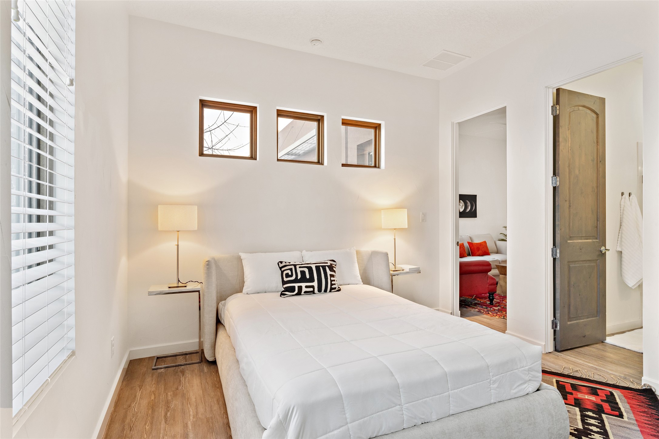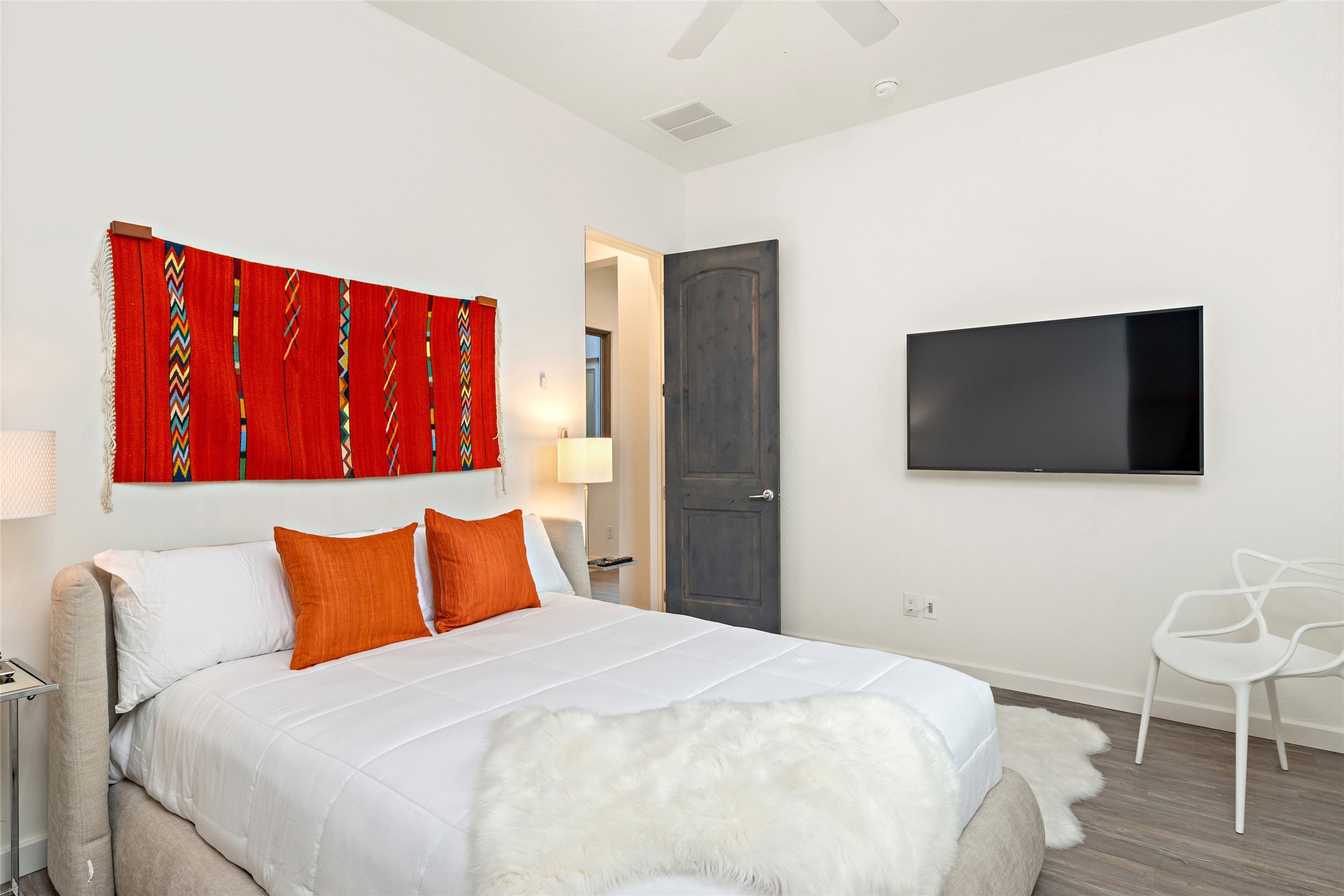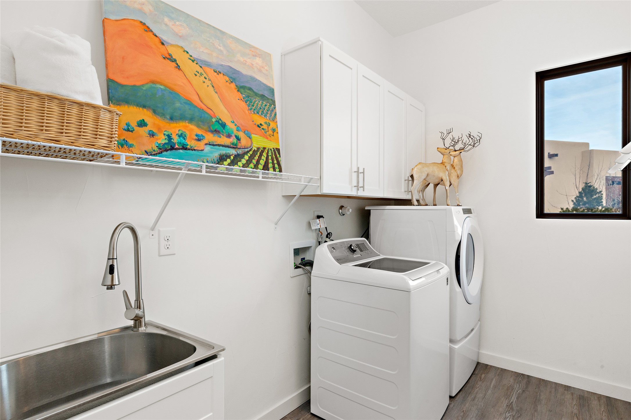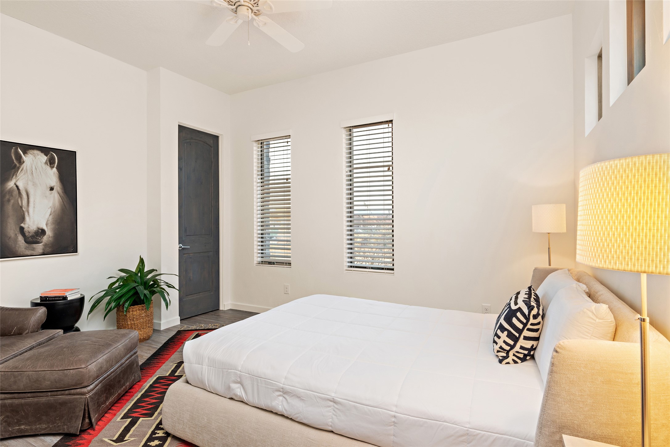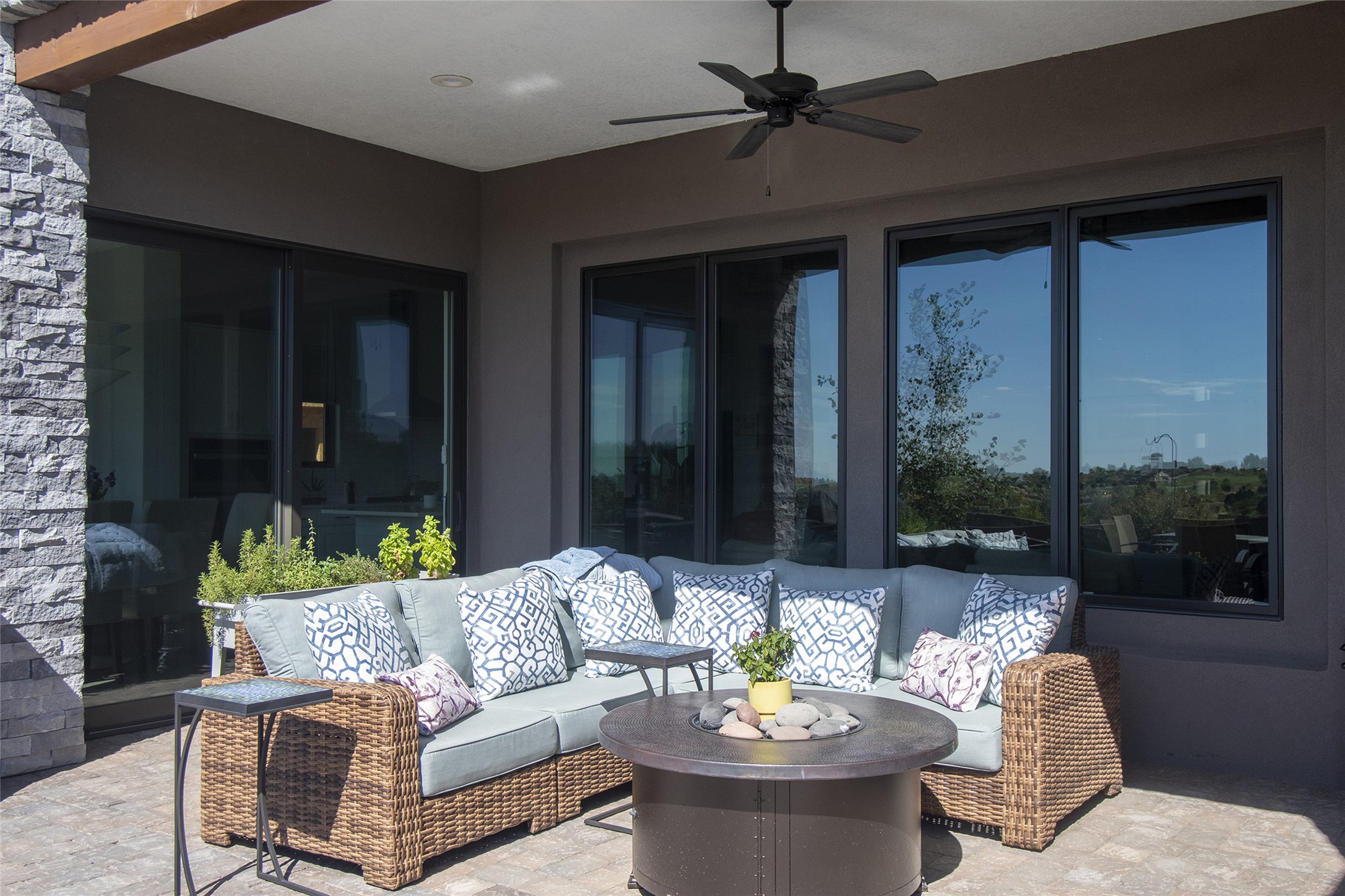 Floating on a ridge overlooking the Sunrise Golf Course in Las Campanas, this spacious, contemporary home captures beautiful views and sunsets, and has 4 bedrooms, 4 bathrooms and a 2-car garage. Enter through a gated breezeway and courtyard into a light-filled, open-concept great room with a gas fireplace, with stone surround, dining room, large, white kitchen that includes a big island, tons of cupboard space, walk-in pantry and cafe area. The luxurious portal spans the entire back of the home! Great for big parties! The beautiful owner's suite has large windows with motorized shades. The owner's bath also has motorized shades, with dual vanities, soaking tub, separate shower and a walk-in closet. Added features include luxury vinyl flooring throughout, ceiling fans, beautiful landscaping with drip irrigation, and a tranquil fountain in the front courtyard. HOA fees include maintenance of gated and paved roads, and common areas, 24-hour roaming security, and 24-hour EMTs on site. Membership to the Club at Las Campanas is optional and subject to approval. Amenities include swimming, both indoor and out, tennis, pickle ball, fitness facility, equestrian, fine dining, and two Jack Niclaus Signature golf courses.