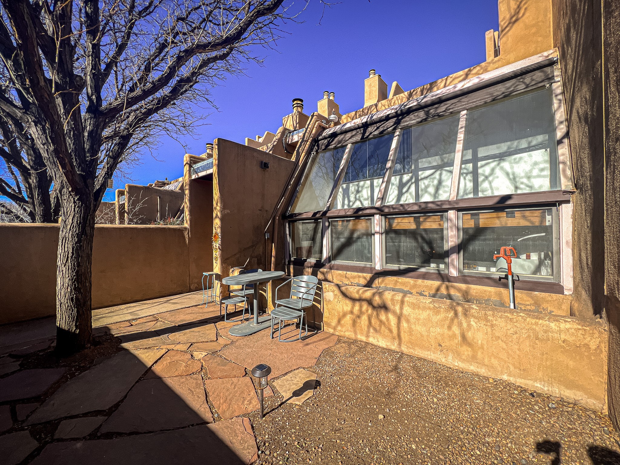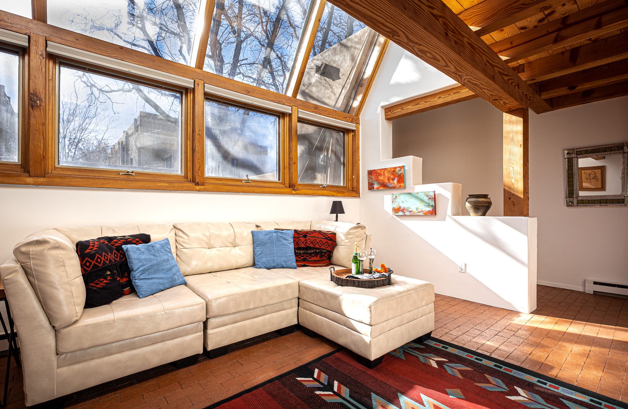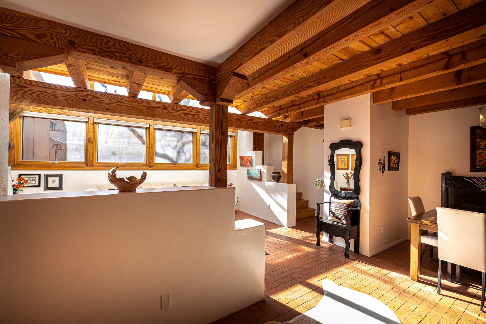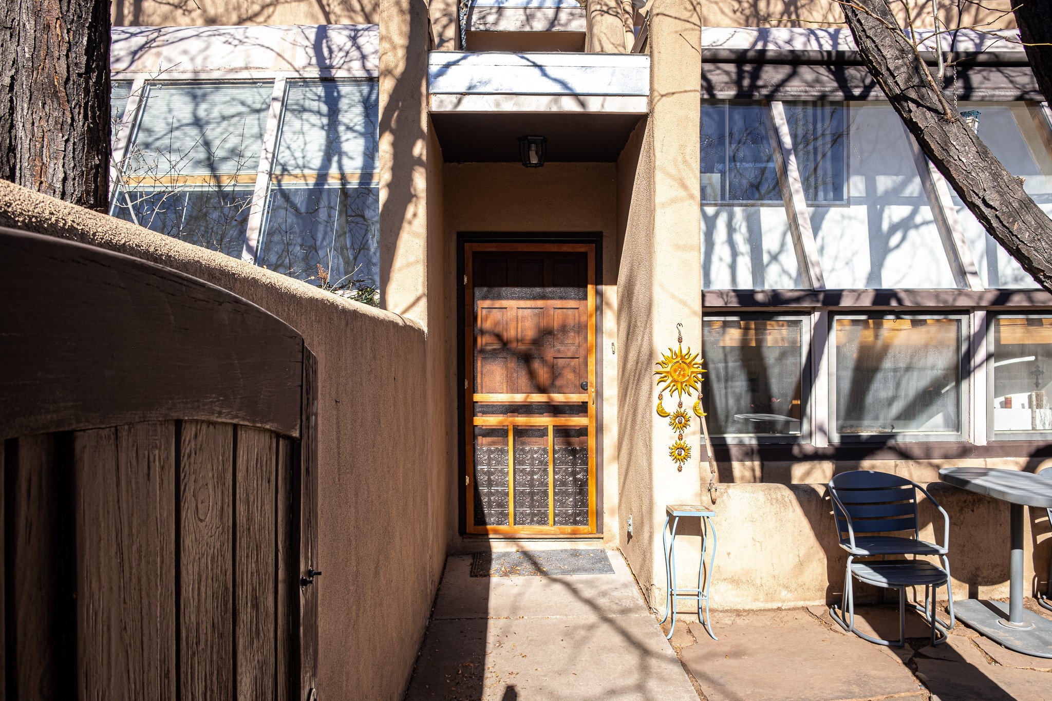 OPEN HOUSE ON SATURDAY- APRIL 1 AND SUNDAY- APRIL 2 FROM 1PM TO 4PM. SEE YOU THERE!This La Remuda condo is a hidden treasure, right in the heart of town!This unique property is located in a quiet, secluded area just 5 minutes from the plaza and 5 minutes from the interstate. You have a front patio area, large enough for entertaining. It is shaded in the summer by mature trees and there is plenty of parking for guests. Large, passive solar atrium windows bring in lots of bright sun light from the lower level of the condo to the upper level. You have a covered parking area and spacious storage at the back entrance of the condo. This is rare for Santa Fe. You enter the condo from the back door to a split level entrance where you may proceed upstairs to the bedrooms or downstairs to the living area. The tile on the stairs is newly installed as is the wood flooring upstairs. This home has been freshly painted throughout the lower living area and all vigas re-stained. The lower flooring is brick throughout the living, dining, powder room and kitchen area. High ceilings, beams and a kiva enhance the lower level for a very charming and inviting area. As it is below ground level, the lower level stays naturally cool in the summer. The upper level has an energy efficient mini split air conditioner in the master bedroom, which keeps the room as cool as you desire. come see for yourself and be sure to watch the video online as well. Home has a new roof as of NOV 2022..