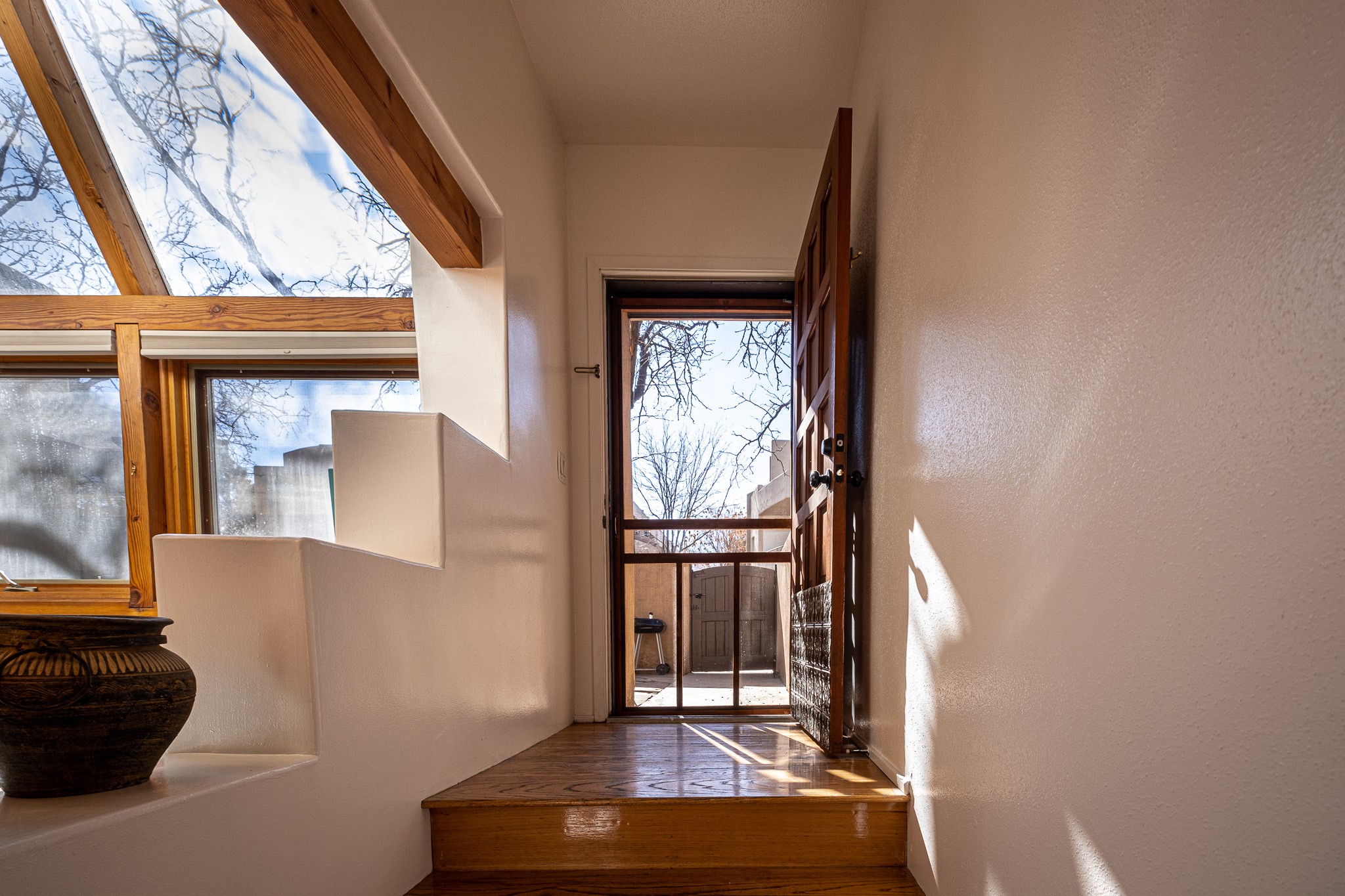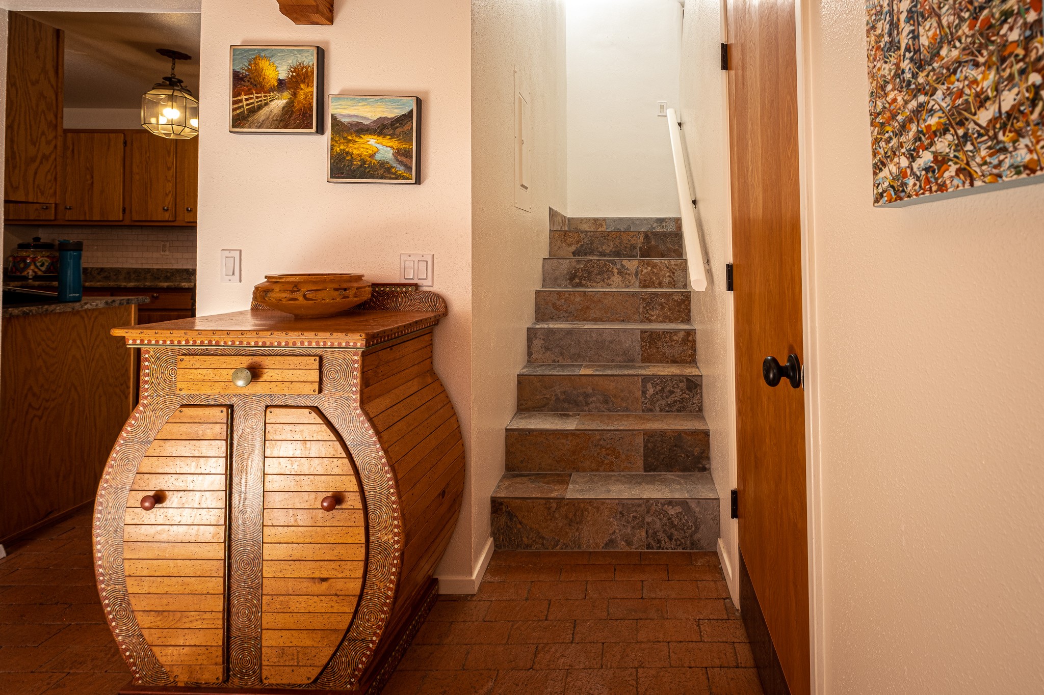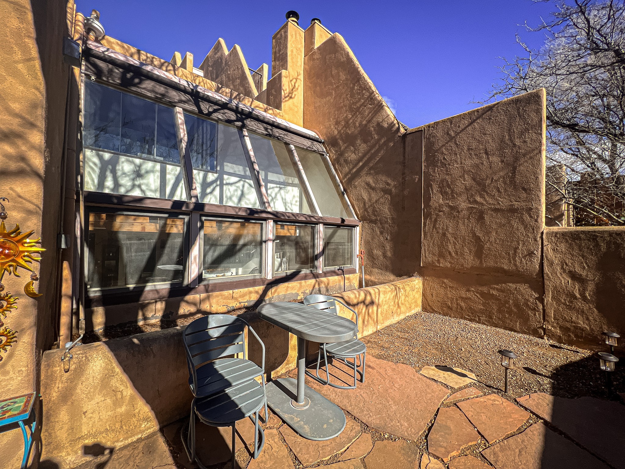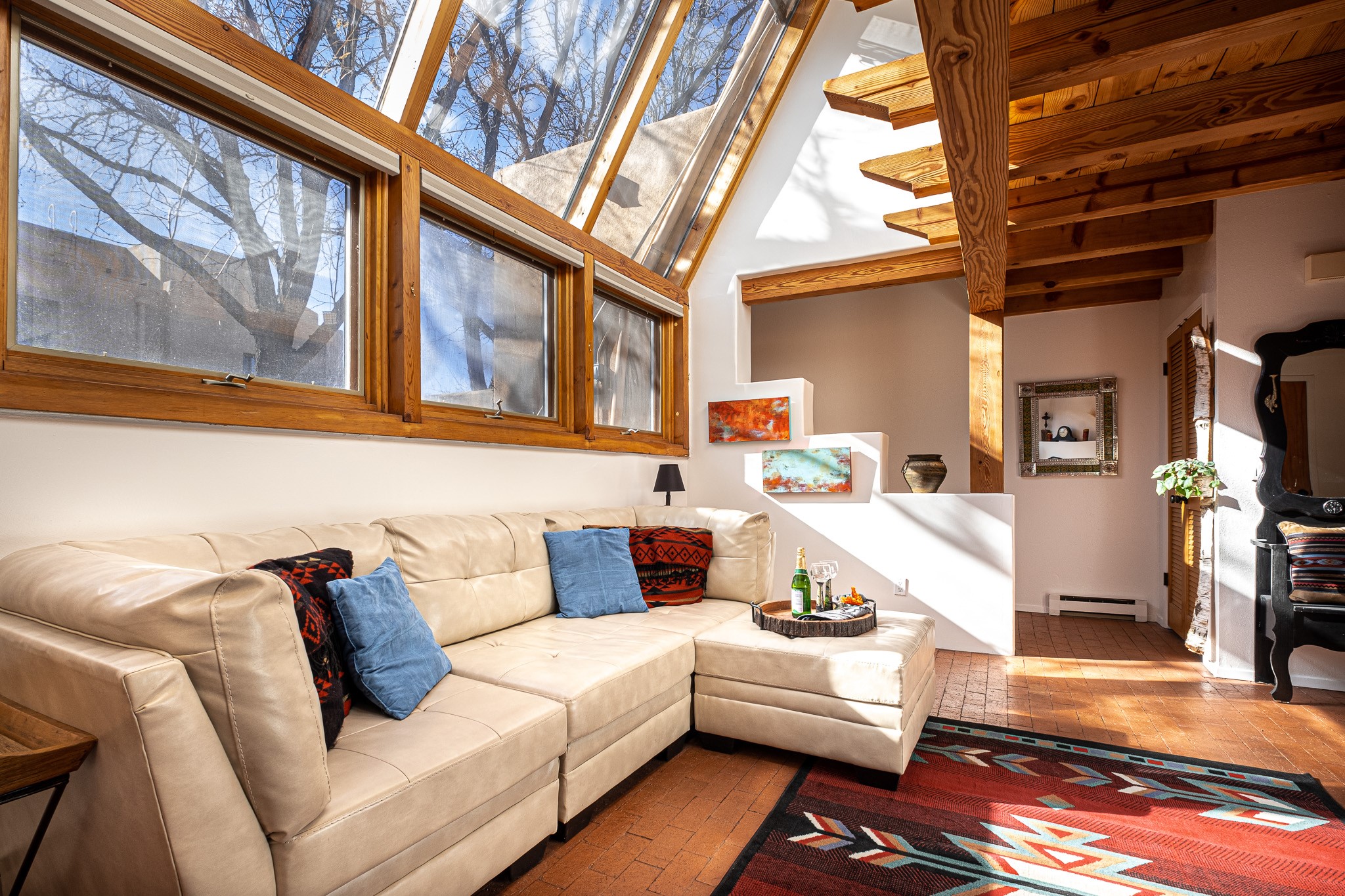OPEN HOUSE ON SATURDAY- APRIL 1 AND SUNDAY- APRIL 2 FROM 1PM TO 4PM. SEE YOU THERE!This La Remuda condo is a hidden treasure, right in the heart of town!This unique property is located in a quiet, secluded area just 5 minutes from the plaza and 5 minutes from the interstate. You have a front patio area, large enough for entertaining. It is shaded in the summer by mature trees and there is plenty of parking for guests. Large, passive solar atrium windows bring in lots of bright sun light from the lower level of the condo to the upper level. You have a covered parking area and spacious storage at the back entrance of the condo. This is rare for Santa Fe. You enter the condo from the back door to a split level entrance where you may proceed upstairs to the bedrooms or downstairs to the living area. The tile on the stairs is newly installed as is the wood flooring upstairs. This home has been freshly painted throughout the lower living area and all vigas re-stained. The lower flooring is brick throughout the living, dining, powder room and kitchen area. High ceilings, beams and a kiva enhance the lower level for a very charming and inviting area. As it is below ground level, the lower level stays naturally cool in the summer. The upper level has an energy efficient mini split air conditioner in the master bedroom, which keeps the room as cool as you desire. come see for yourself and be sure to watch the video online as well. Home has a new roof as of NOV 2022..