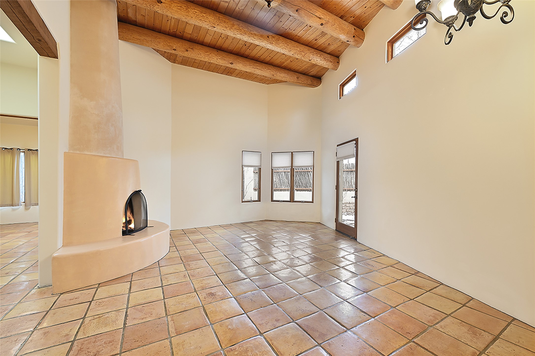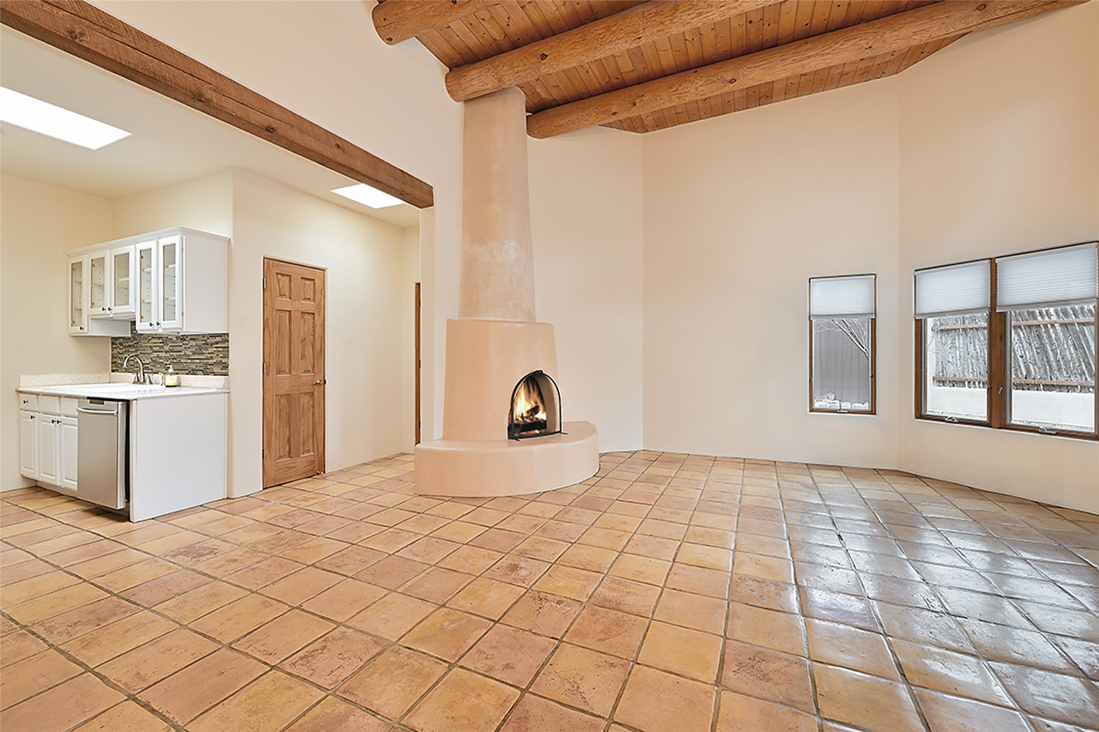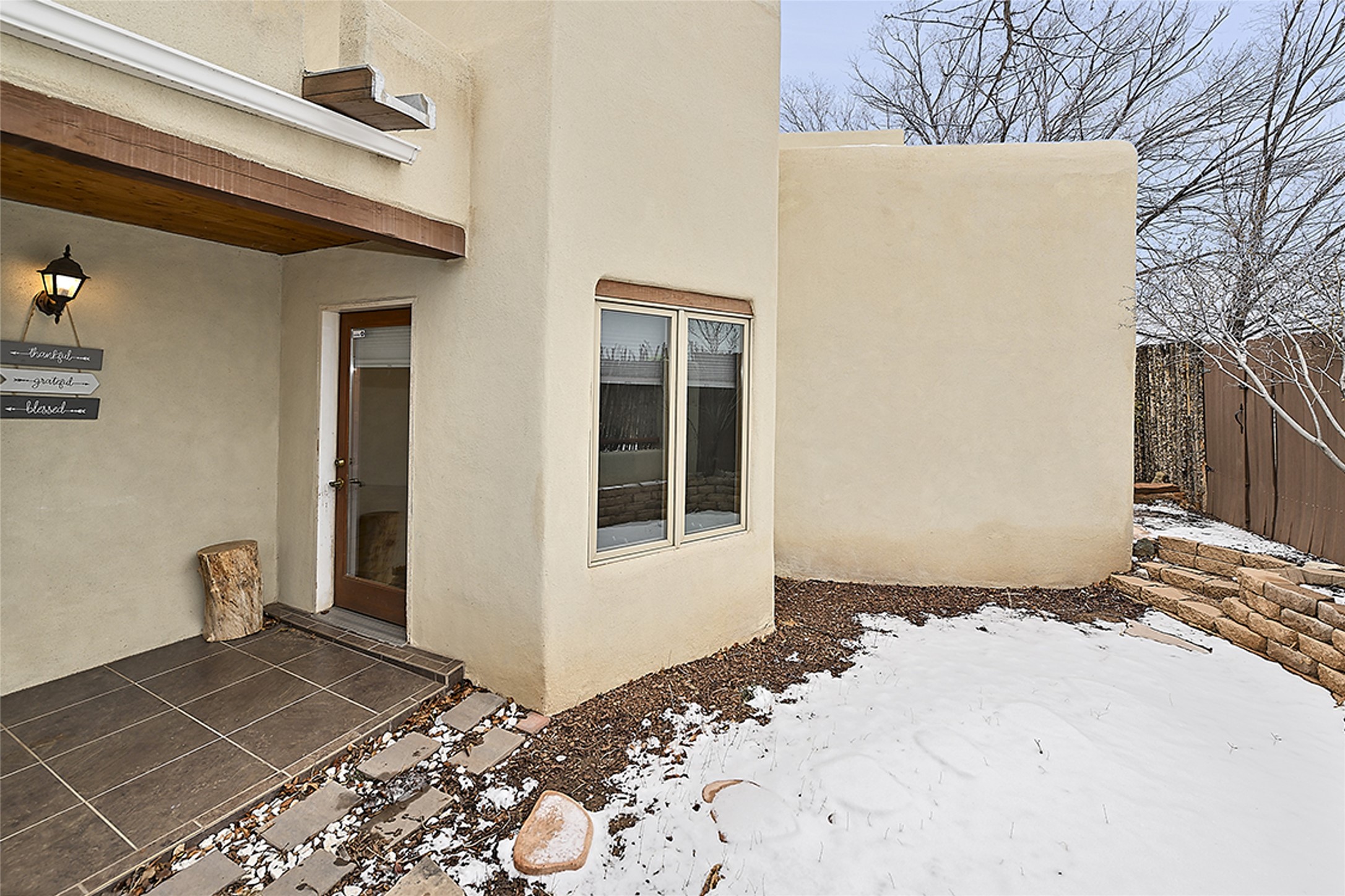 Located in a quiet neighborhood off Henry Lynch Road, this 2 bedroom 2 bath condo is defined by iconic Santa Fe features such as Saltillo tile floors, high ceilings with vigas, and a kiva fireplace. Galley kitchen is appointed with crisp white cabinets and newer stainless-steel appliances. No interior stairs and freshly painted throughout. Owner's bedroom has ensuite bathroom and walk-in closet. Second bedroom offers flex space as an office or studio. Both bathrooms incorporate beautiful Mexican tile. Washer and dryer. One-car carport. Close to shopping and restaurants with easy access to the Santa Fe Plaza and other cultural attractions. Backs to Nye Early Childhood Center.