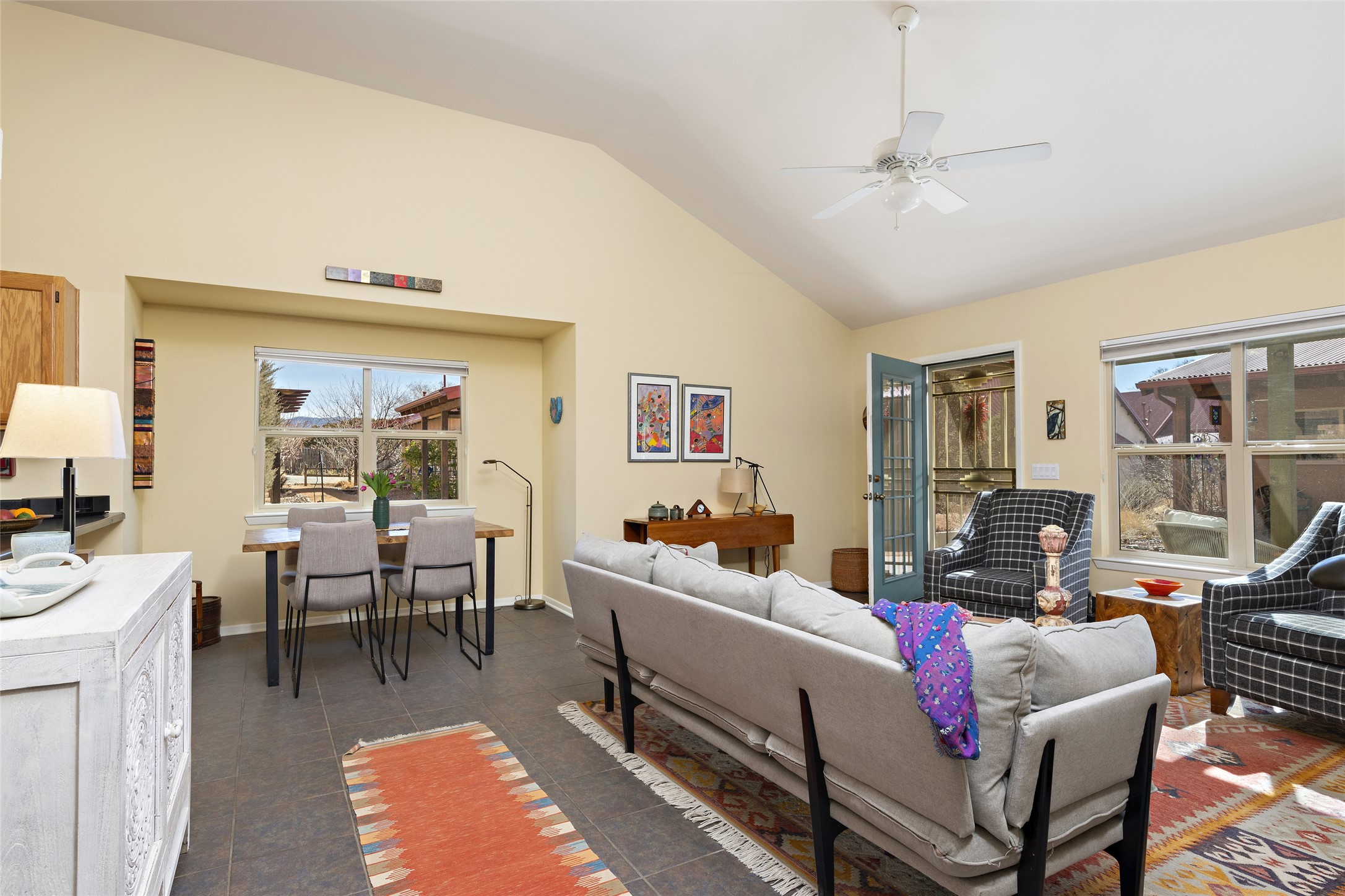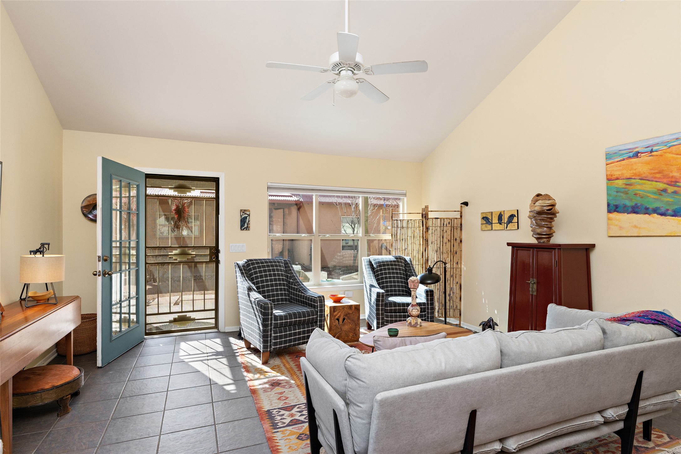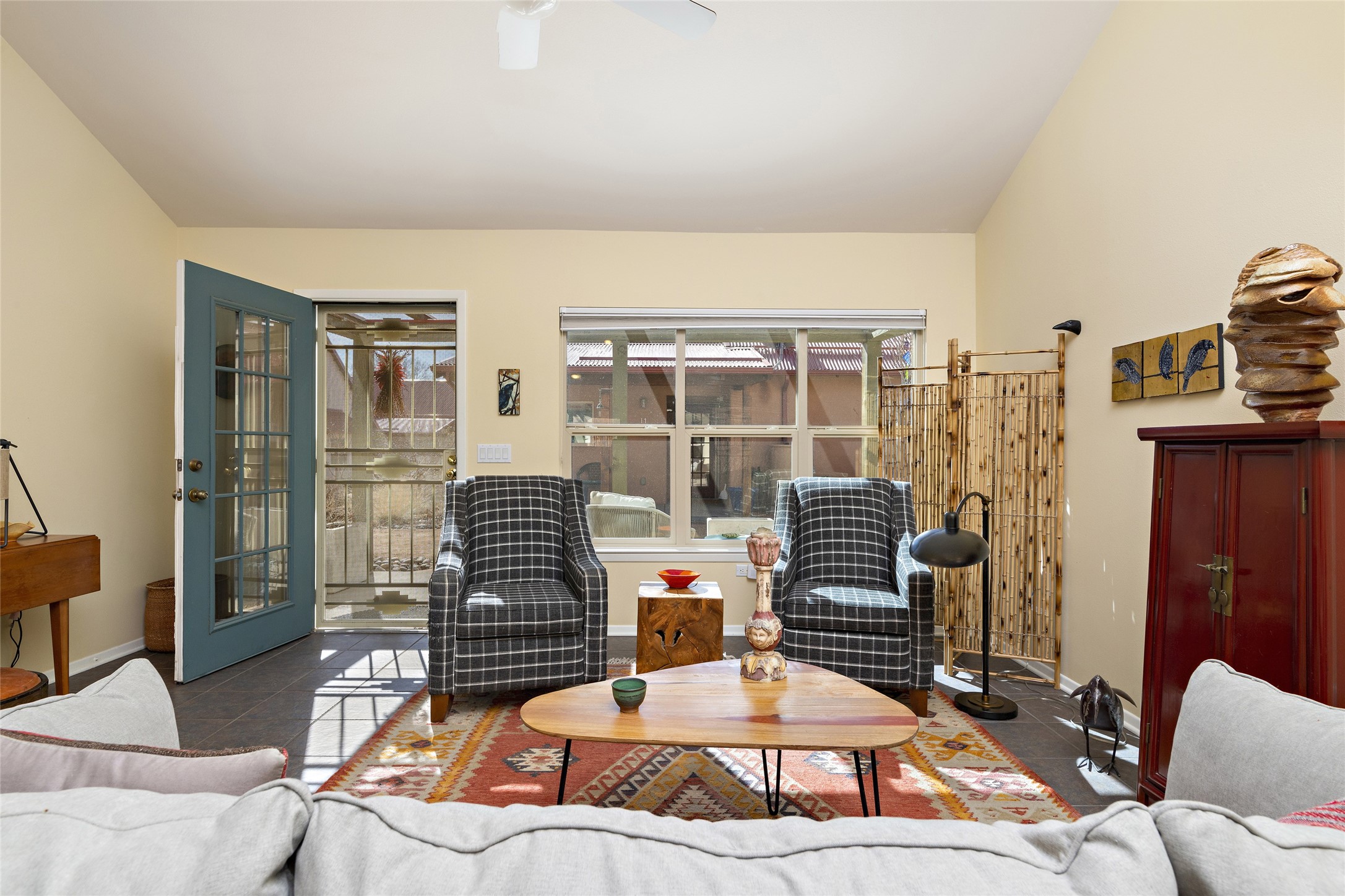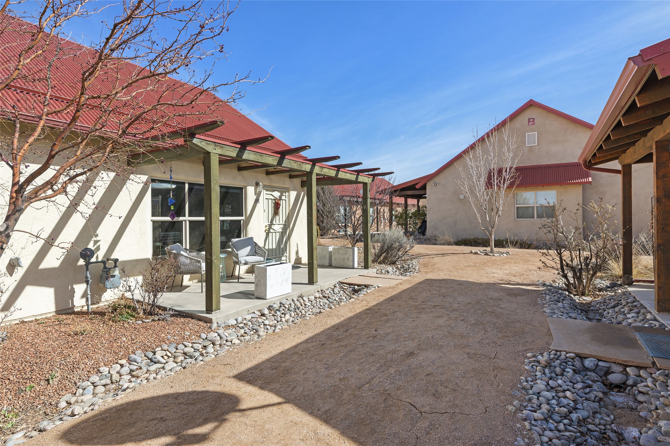 A terrific opportunity to live in a 55+ well-organized, thoughtfully designed community! Sand River is quiet and peaceful and residents are committed to living in collaboration. The complex consists of 28 units along with a community house offering a commercial kitchen, library, gathering spaces with fireplace, guest suite and laundry. These beautiful homes are situated among organic gardens to include an orchard and raised vegetable beds maintained and enjoyed by the residents. This is a 1082 sq. ft.* two bedroom/one bath unit meticulously maintained by its owner. The interior offers a soft, neutral palette, accentuating the natural light. The front portal is ideal for enjoying morning coffee, while the back patio has been upgraded with flagstone and coyote fencing for low maintenance and privacy. Numerous Seller upgrades to include: South-facing windows and door have UV ray blocking film; gas stove, hood and refrigerator updated; new hardware on cupboards; new sink and faucet in kitchen; pullout shelves in pantry; fitted sunshade on front portal; addition of raintree. The COA covers costs for roofing, exterior stucco and common area maintenance. Conveniently located within minutes of grocery, restaurant, retail, bank and health care facilities. Parking located close to the unit.
