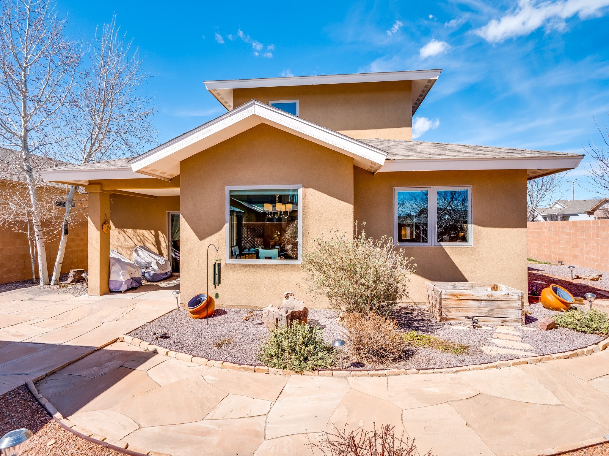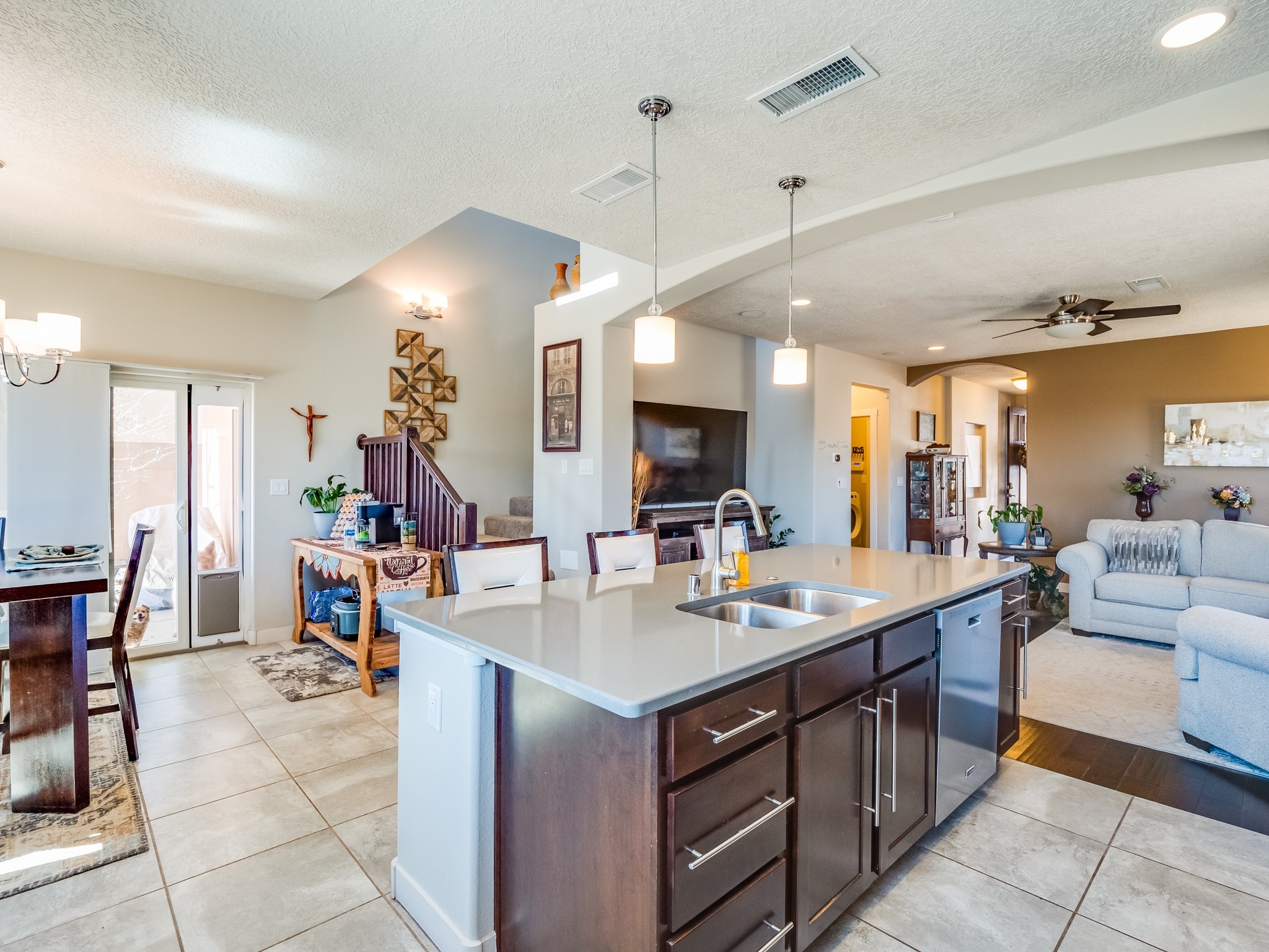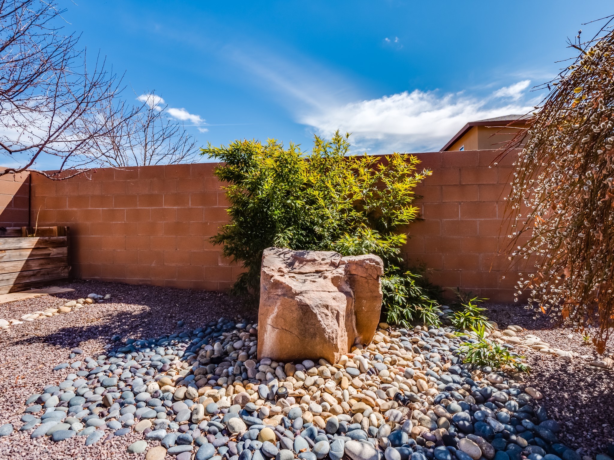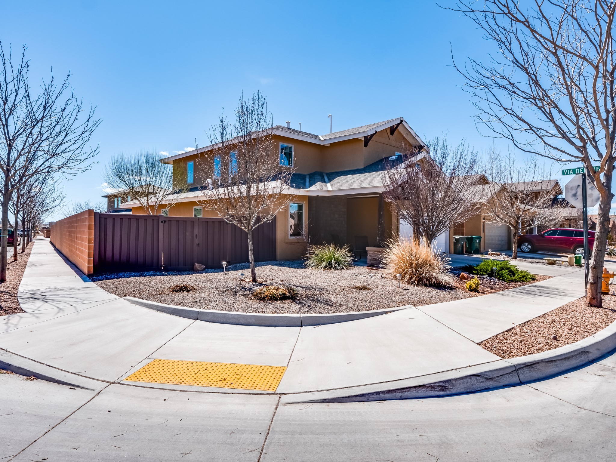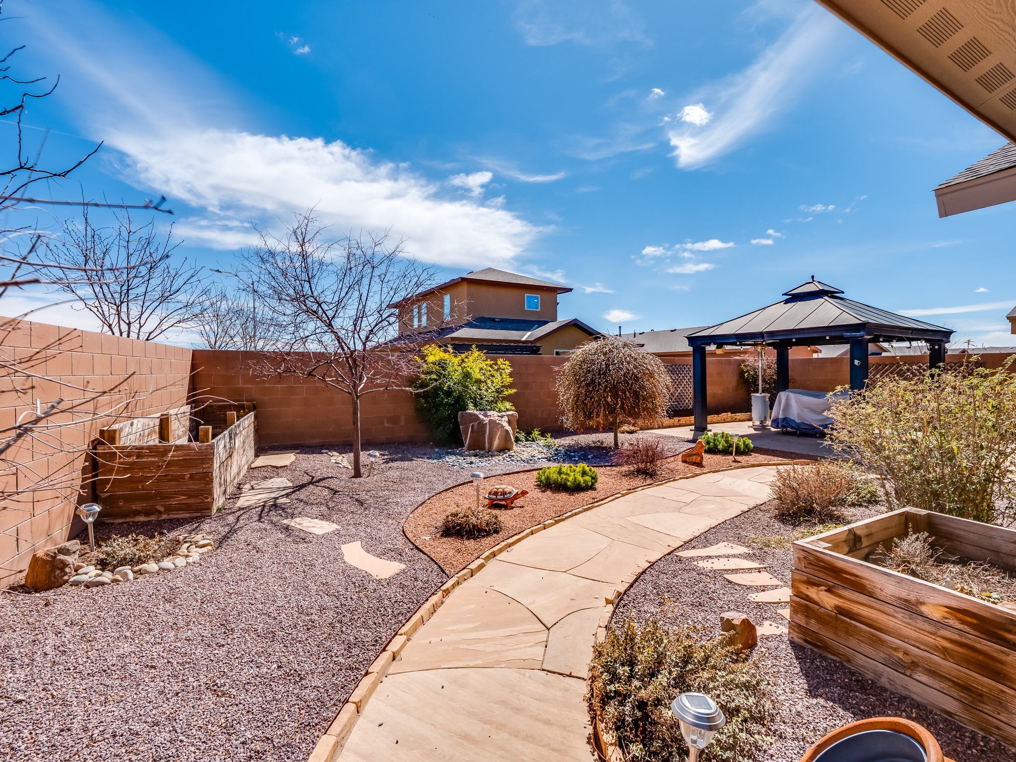 This Stunning two-story modern home located on a corner lot is outfitted with all the bells and whistles! The main Living area is a large, open Great Room that's optimal for entertainment with the Kitchen being the heart of the home. With a center Island and bar seating, dark wood cabinets with chrome hardware, Quartz counters, mosaic tile backsplash, stainless steel appliances and tile flooring that's continued into the Dining Area that has sliding door access to the backyard. Wood Floors in the Living Room and continued into the rest of the first floor. The spacious Primary En-Suite has access to the backyards covered patio, two large walk-in closets and a wonderful bathroom with a double sink vanity and granite tops, Tile flooring and walk-in tiled shower. Also on the first floor is a guest bedroom with barn doors, a powder room, and a Laundry room with access to the two car garage. Carpeted second floor with a cozy loft space, two nice sized guest bedrooms, and a full guest bathroom. Your outdoor space is like your very own oasis to indulge all of your senses. Low maintenance but still visually pleasing with beautiful flower beds and trellises covered in flowering vines, a calming rock water feature, grass lawn, mature trees, and a large flagstone patio with gazebo is the perfect spot to relax under on those summer days. This home has A/C with a Nest thermostat, room intercom and built-in speaker system. This fantastic home wont last for long, book a tour today!