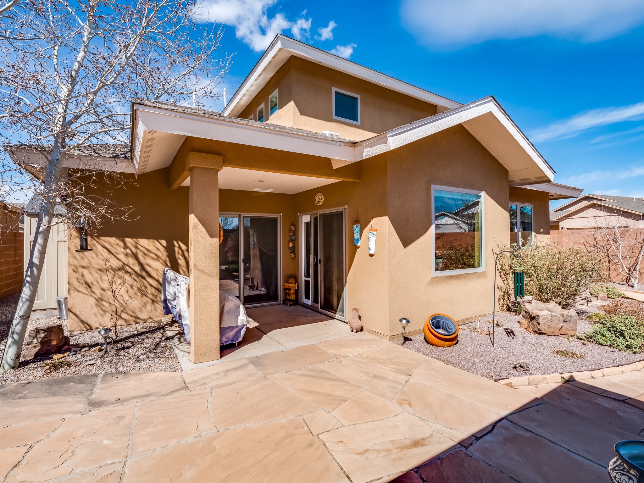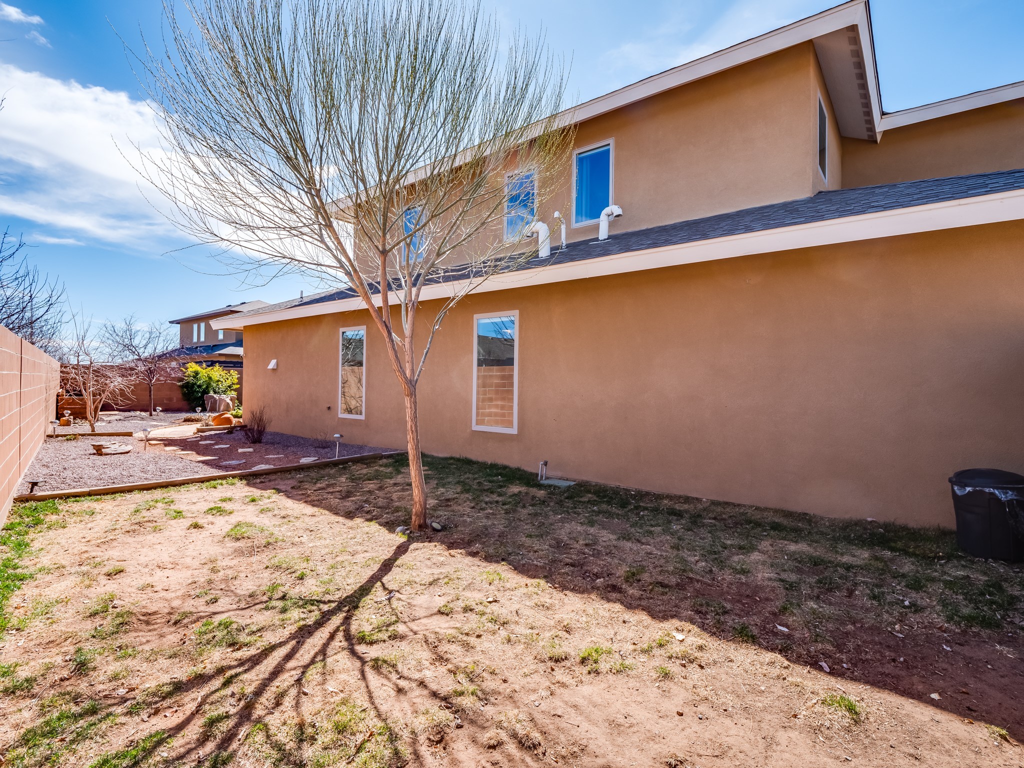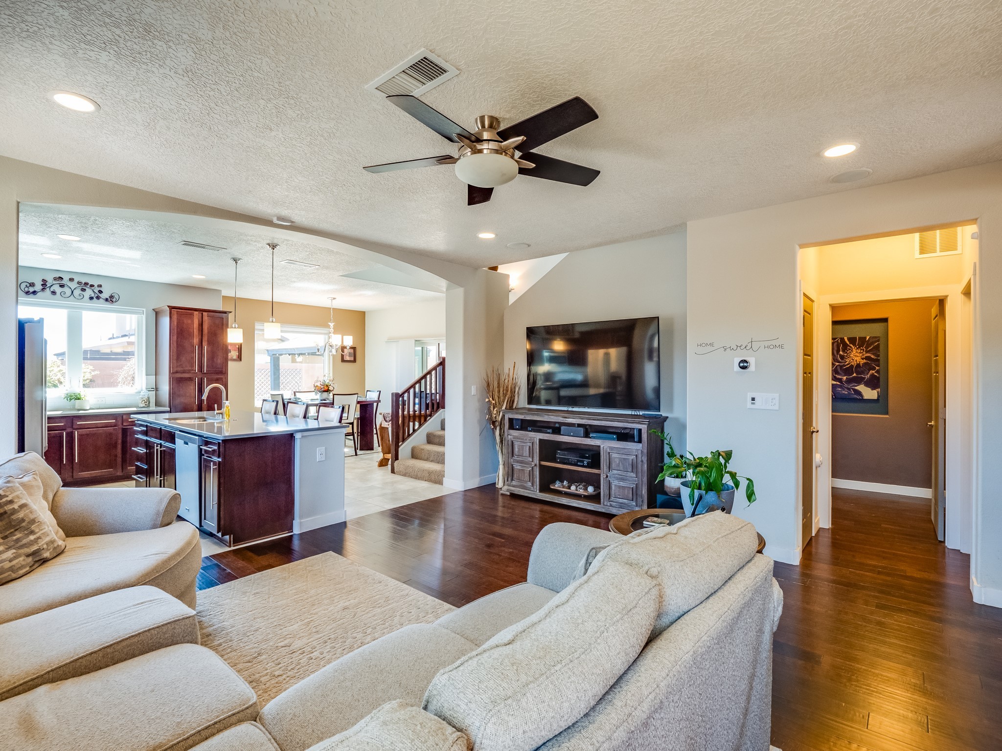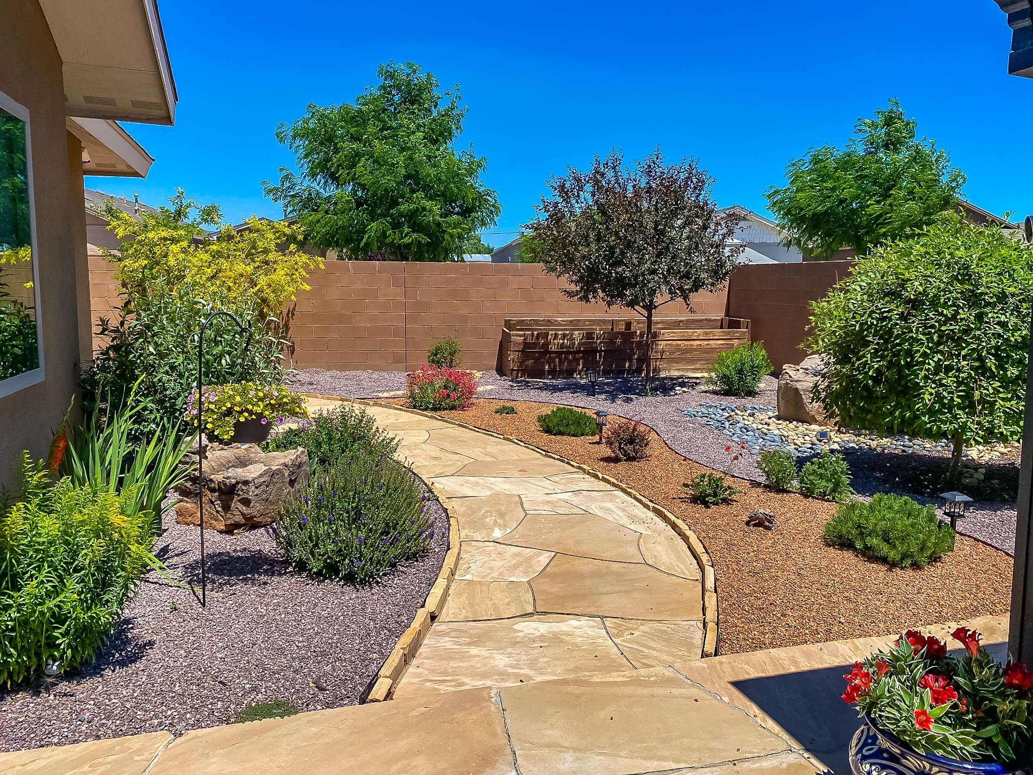 This Stunning two-story modern home located on a corner lot is outfitted with all the bells and whistles! The main Living area is a large, open Great Room that's optimal for entertainment with the Kitchen being the heart of the home. With a center Island and bar seating, dark wood cabinets with chrome hardware, Quartz counters, mosaic tile backsplash, stainless steel appliances and tile flooring that's continued into the Dining Area that has sliding door access to the backyard. Wood Floors in the Living Room and continued into the rest of the first floor. The spacious Primary En-Suite has access to the backyards covered patio, two large walk-in closets and a wonderful bathroom with a double sink vanity and granite tops, Tile flooring and walk-in tiled shower. Also on the first floor is a guest bedroom with barn doors, a powder room, and a Laundry room with access to the two car garage. Carpeted second floor with a cozy loft space, two nice sized guest bedrooms, and a full guest bathroom. Your outdoor space is like your very own oasis to indulge all of your senses. Low maintenance but still visually pleasing with beautiful flower beds and trellises covered in flowering vines, a calming rock water feature, grass lawn, mature trees, and a large flagstone patio with gazebo is the perfect spot to relax under on those summer days. This home has A/C with a Nest thermostat, room intercom and built-in speaker system. This fantastic home wont last for long, book a tour today!