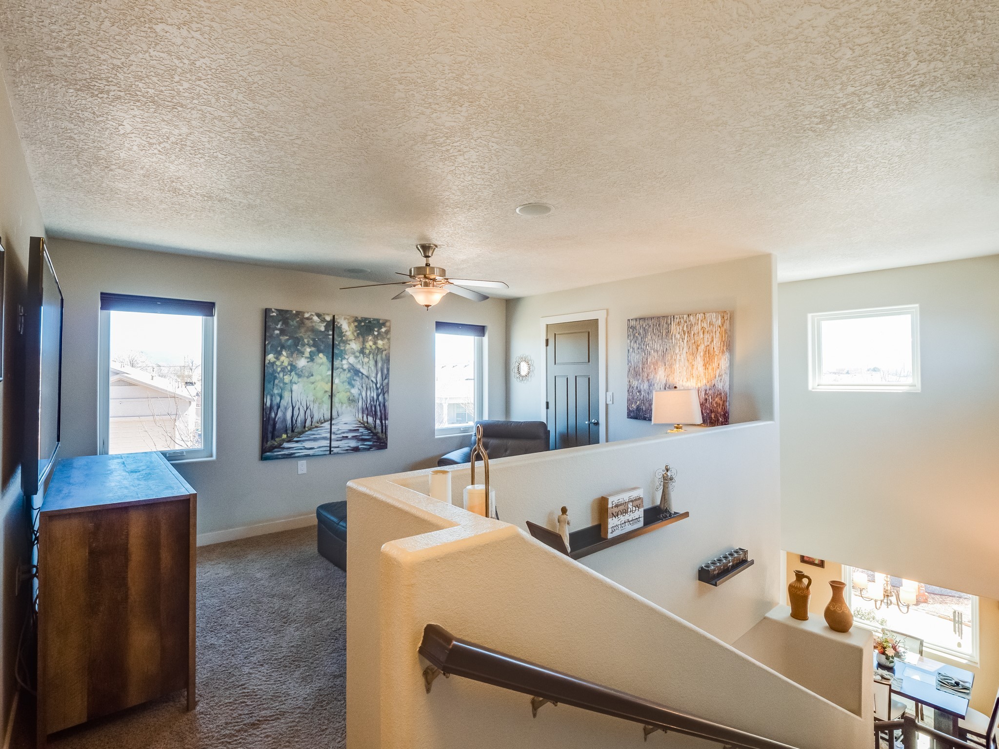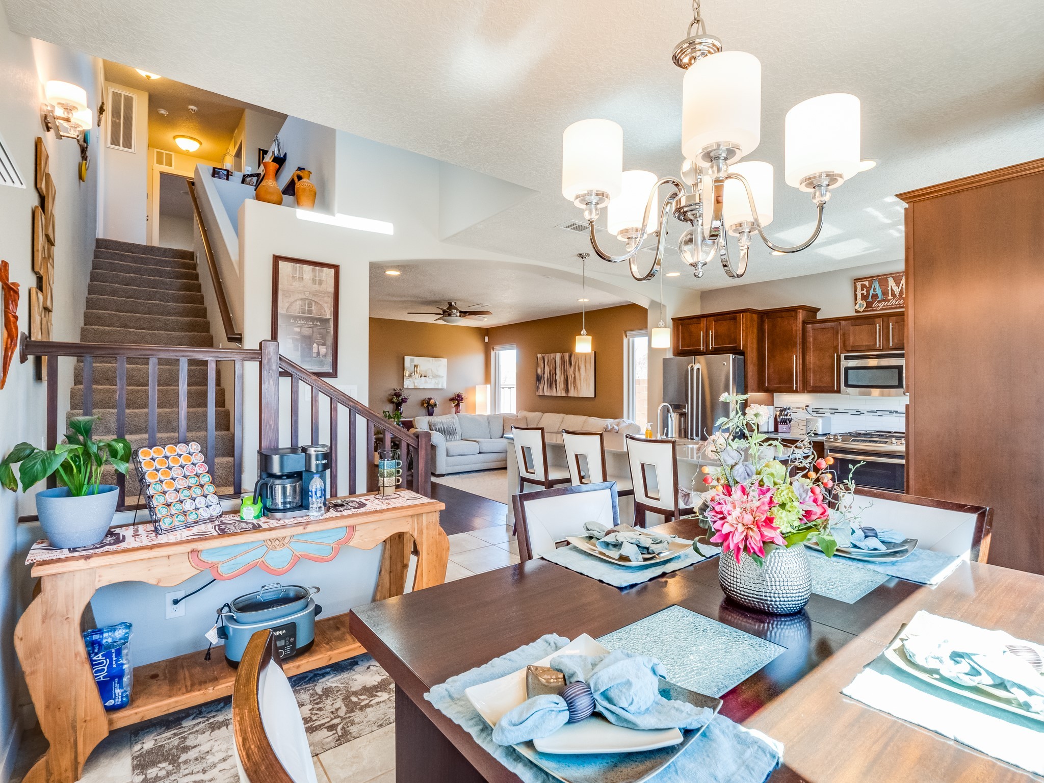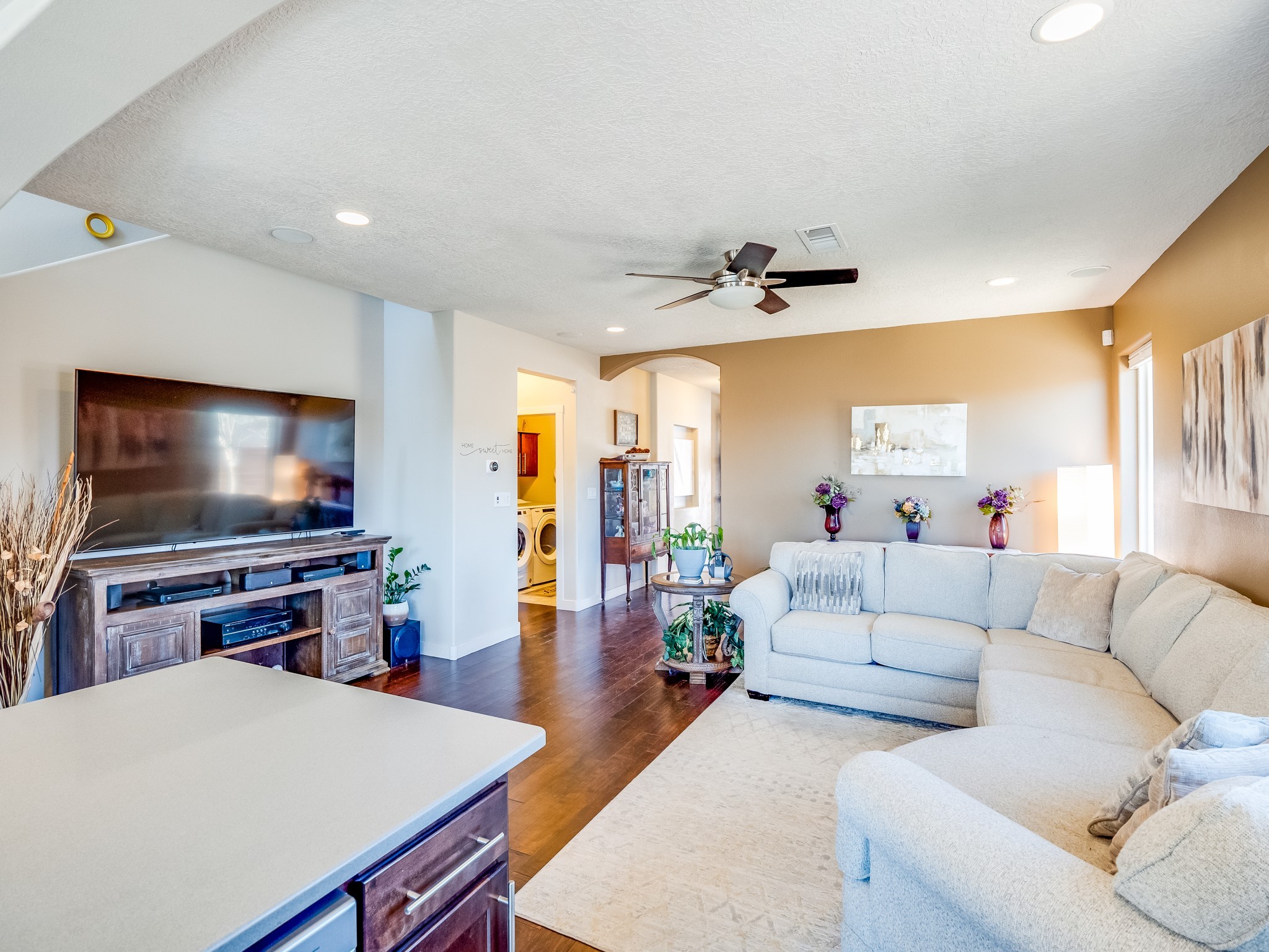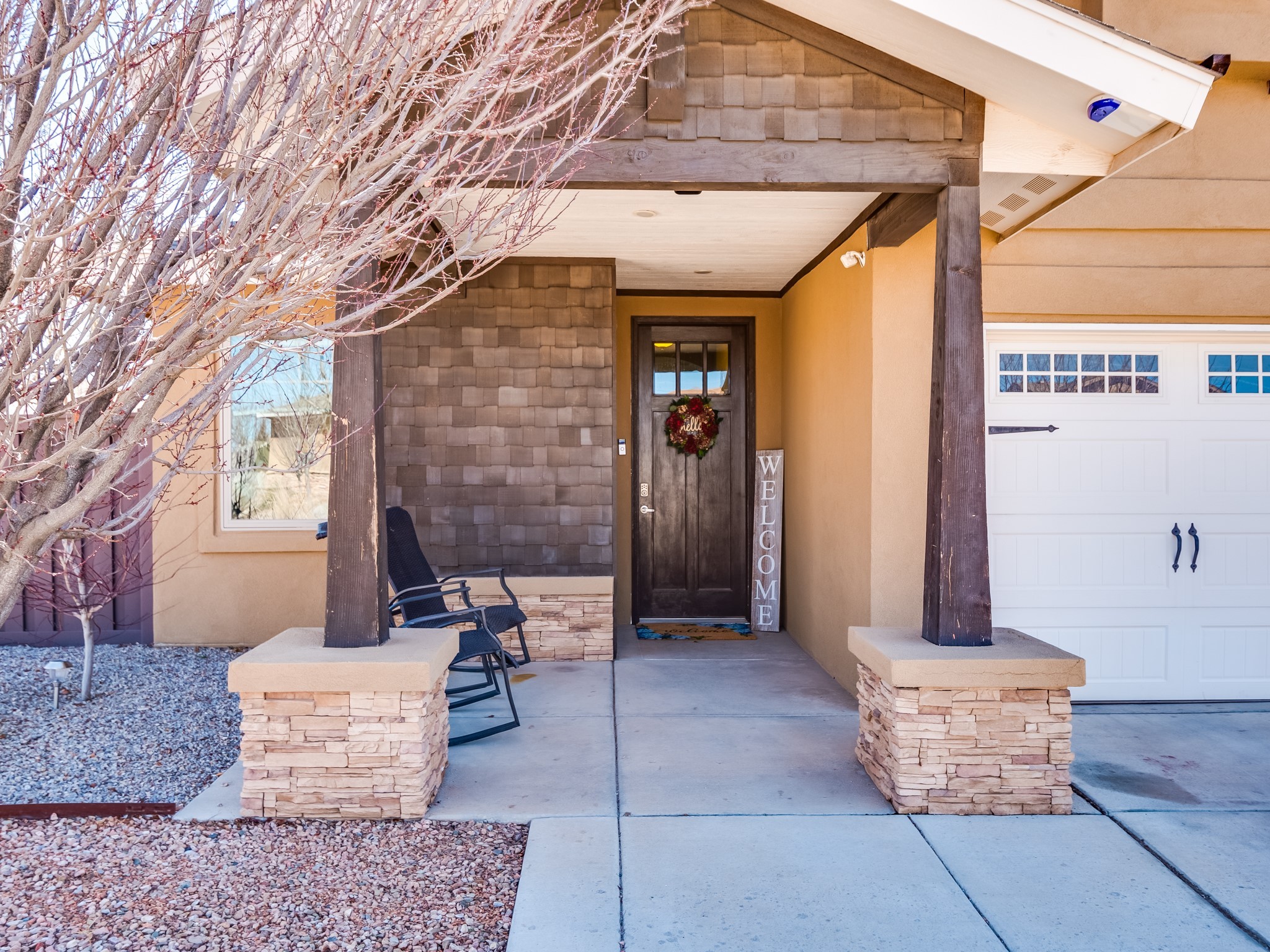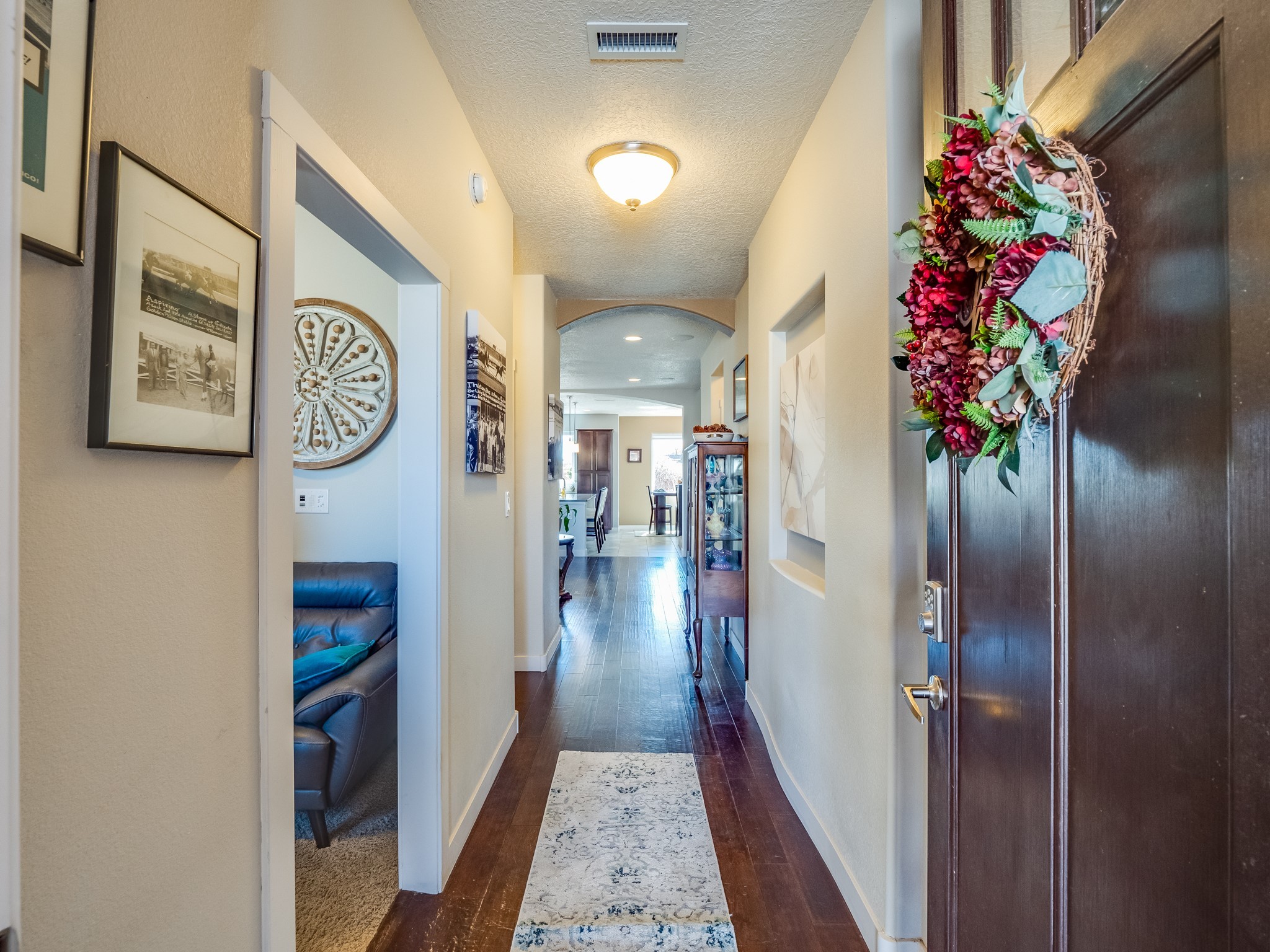 This Stunning two-story modern home located on a corner lot is outfitted with all the bells and whistles! The main Living area is a large, open Great Room that's optimal for entertainment with the Kitchen being the heart of the home. With a center Island and bar seating, dark wood cabinets with chrome hardware, Quartz counters, mosaic tile backsplash, stainless steel appliances and tile flooring that's continued into the Dining Area that has sliding door access to the backyard. Wood Floors in the Living Room and continued into the rest of the first floor. The spacious Primary En-Suite has access to the backyards covered patio, two large walk-in closets and a wonderful bathroom with a double sink vanity and granite tops, Tile flooring and walk-in tiled shower. Also on the first floor is a guest bedroom with barn doors, a powder room, and a Laundry room with access to the two car garage. Carpeted second floor with a cozy loft space, two nice sized guest bedrooms, and a full guest bathroom. Your outdoor space is like your very own oasis to indulge all of your senses. Low maintenance but still visually pleasing with beautiful flower beds and trellises covered in flowering vines, a calming rock water feature, grass lawn, mature trees, and a large flagstone patio with gazebo is the perfect spot to relax under on those summer days. This home has A/C with a Nest thermostat, room intercom and built-in speaker system. This fantastic home wont last for long, book a tour today!