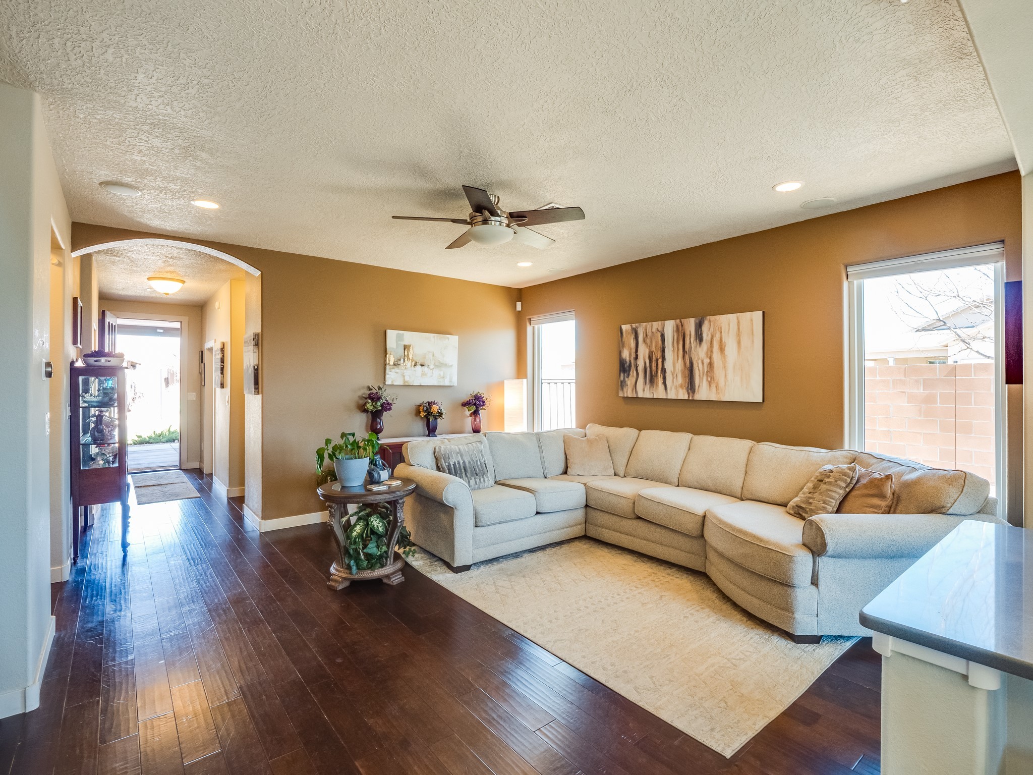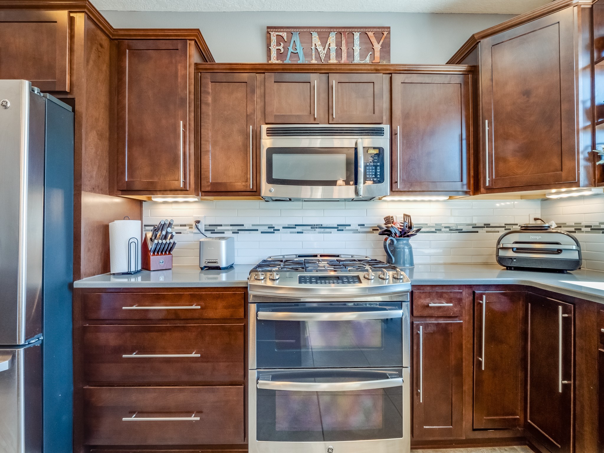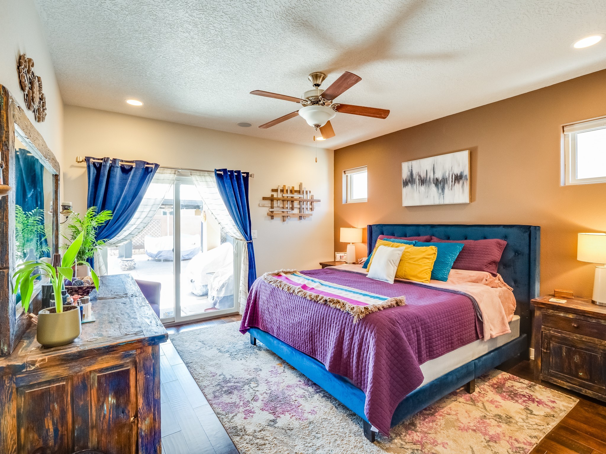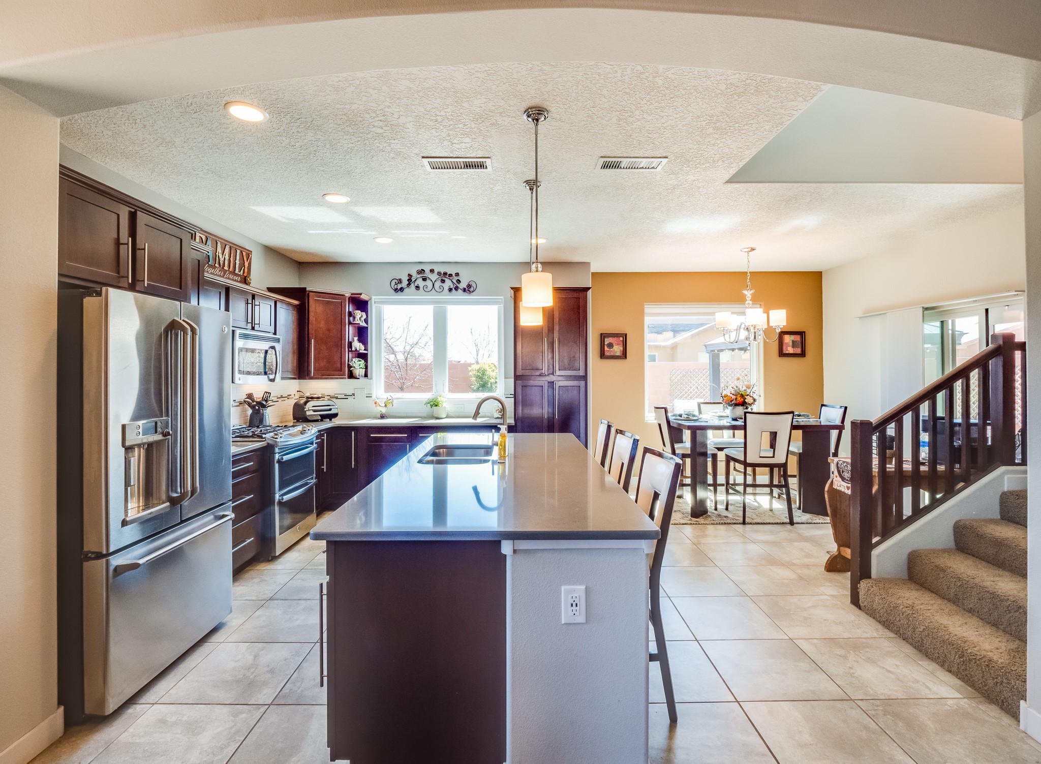 This Stunning two-story modern home located on a corner lot is outfitted with all the bells and whistles! The main Living area is a large, open Great Room that's optimal for entertainment with the Kitchen being the heart of the home. With a center Island and bar seating, dark wood cabinets with chrome hardware, Quartz counters, mosaic tile backsplash, stainless steel appliances and tile flooring that's continued into the Dining Area that has sliding door access to the backyard. Wood Floors in the Living Room and continued into the rest of the first floor. The spacious Primary En-Suite has access to the backyards covered patio, two large walk-in closets and a wonderful bathroom with a double sink vanity and granite tops, Tile flooring and walk-in tiled shower. Also on the first floor is a guest bedroom with barn doors, a powder room, and a Laundry room with access to the two car garage. Carpeted second floor with a cozy loft space, two nice sized guest bedrooms, and a full guest bathroom. Your outdoor space is like your very own oasis to indulge all of your senses. Low maintenance but still visually pleasing with beautiful flower beds and trellises covered in flowering vines, a calming rock water feature, grass lawn, mature trees, and a large flagstone patio with gazebo is the perfect spot to relax under on those summer days. This home has A/C with a Nest thermostat, room intercom and built-in speaker system. This fantastic home wont last for long, book a tour today!
