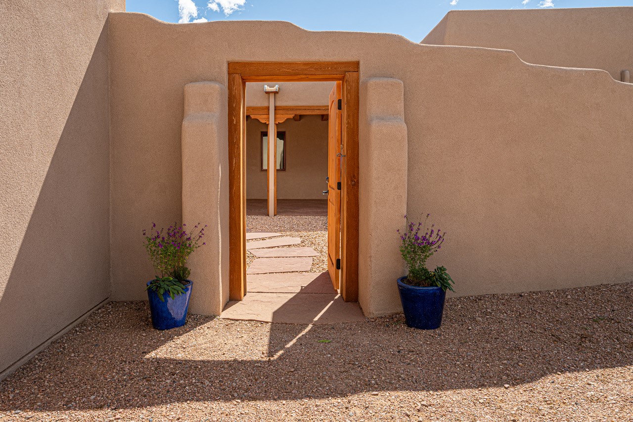 Stunning Adobe contemporary pueblo masterpiece by one of Santa Fe's premier adobe builders, Jeff Fagley of Shaylube Construction. This home has never been lived in, is waiting for the first owner to enjoy. Open plan design with dramatic corbelled beam ceiling and Kiva fireplace in great room, tiled floors and gleaming thick smooth plastered walls throughout complement the classic elements of Santa Fe style. Spacious feel with high ceilings throughout, split 3 bedrooms plus office, large owners suite with private walled portal, 4 bathrooms separate guest suite. Natural gas radiant heat plus 5 mini splits for heating and cooling complementing the radiant in floor heating and passive solar design. A sunny chefs kitchen with butlers pantry and large central island, large formal dining area opening to a wraparound portal for private outside dining and entertainment. A walled courtyard entry with wrap around portal also provides the access to both main home and guest quarters. There is a second privacy walled south courtyard with bricked portals accessed from living room and master suite also excellent for sunset mountain viewing. Roof drainage to 2 cisterns already installed underground catch the rainfall for landscaping. A large 3 car garage for lots of toys or hobbies, plenty of guest parking and lovely views with 7+acres to enjoy. Horses allowed. Enjoy access to local Eldorado area shopping, schools, senior center and library plus only minutes into Santa Fe.
