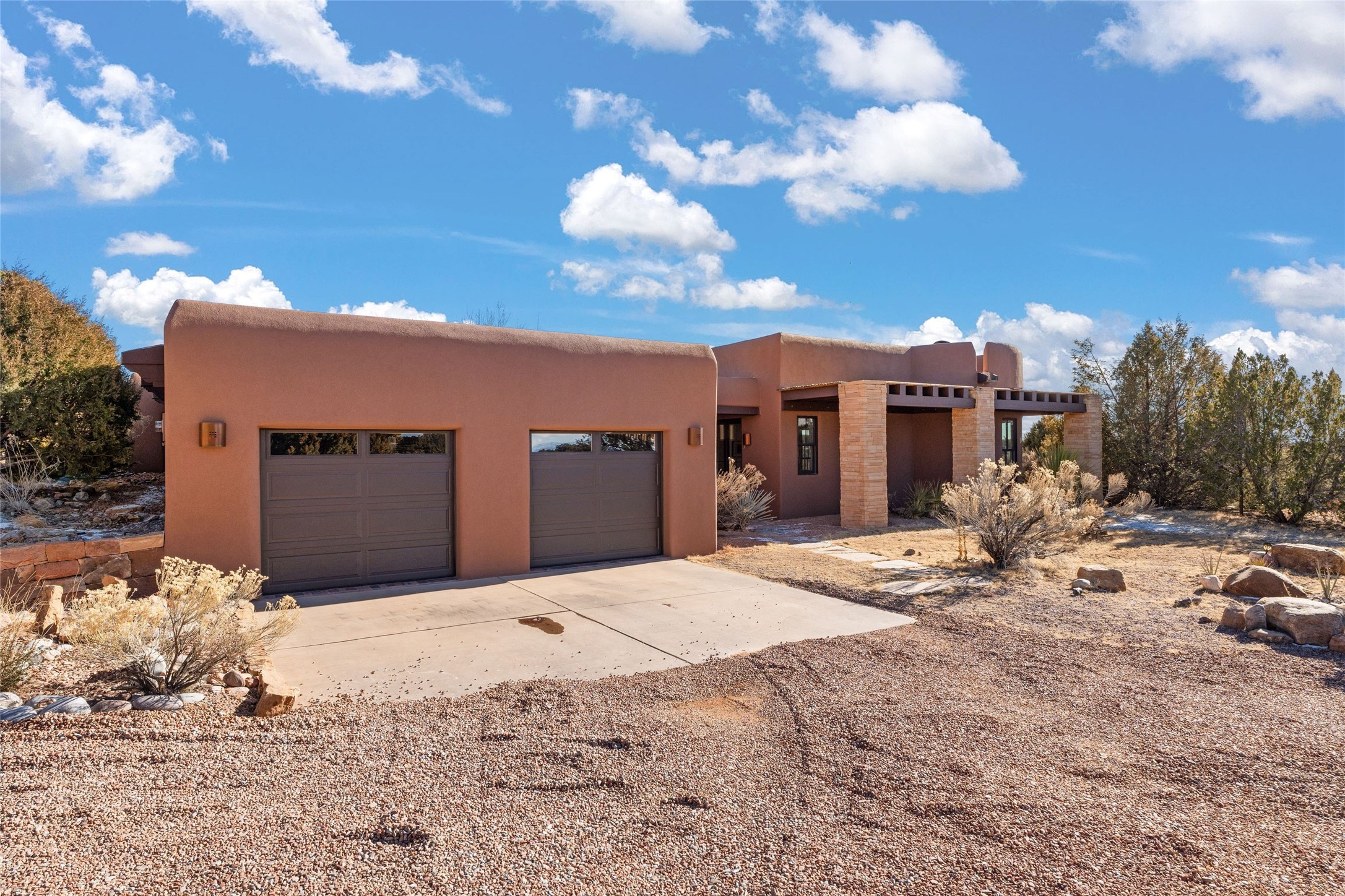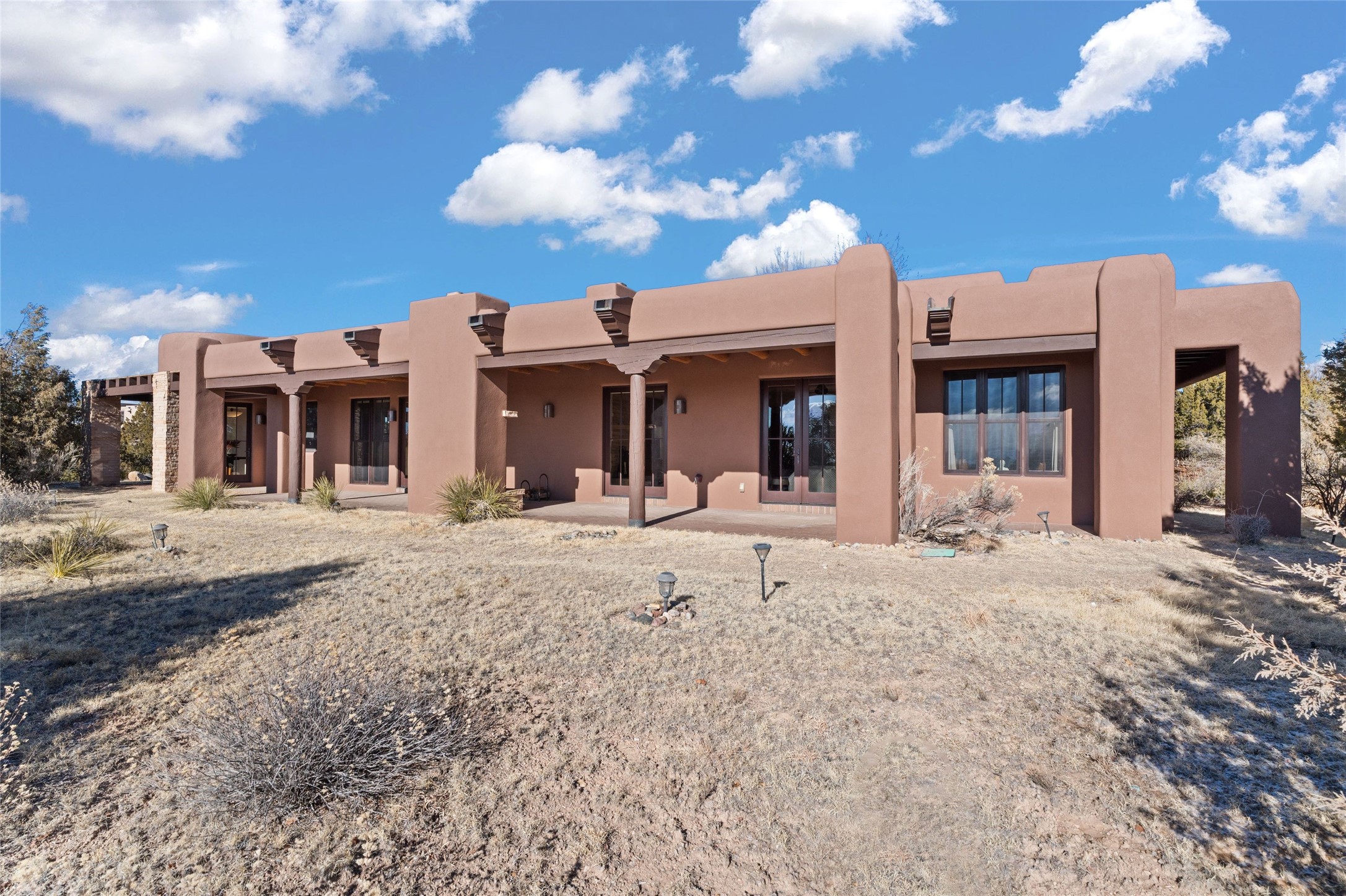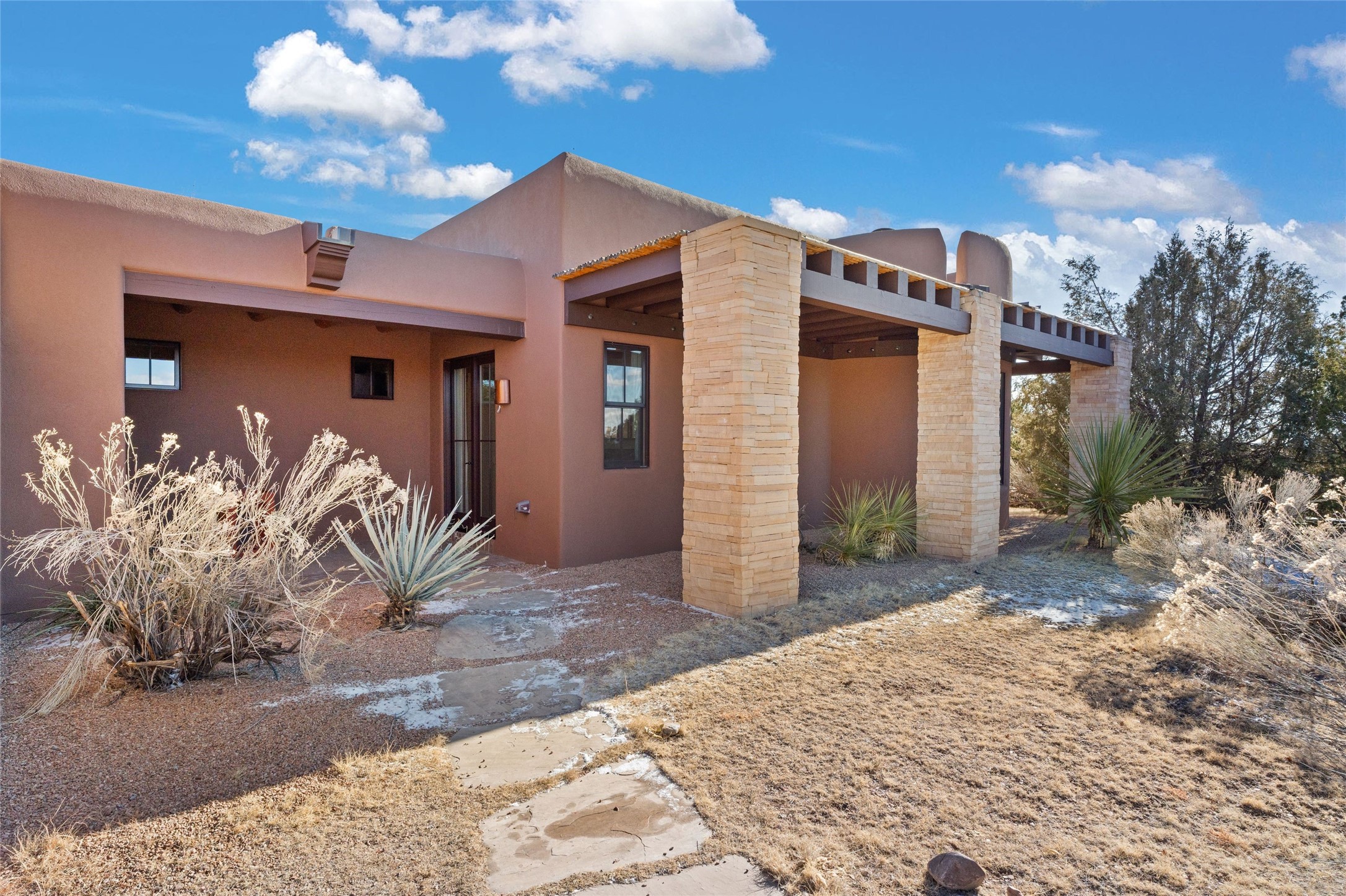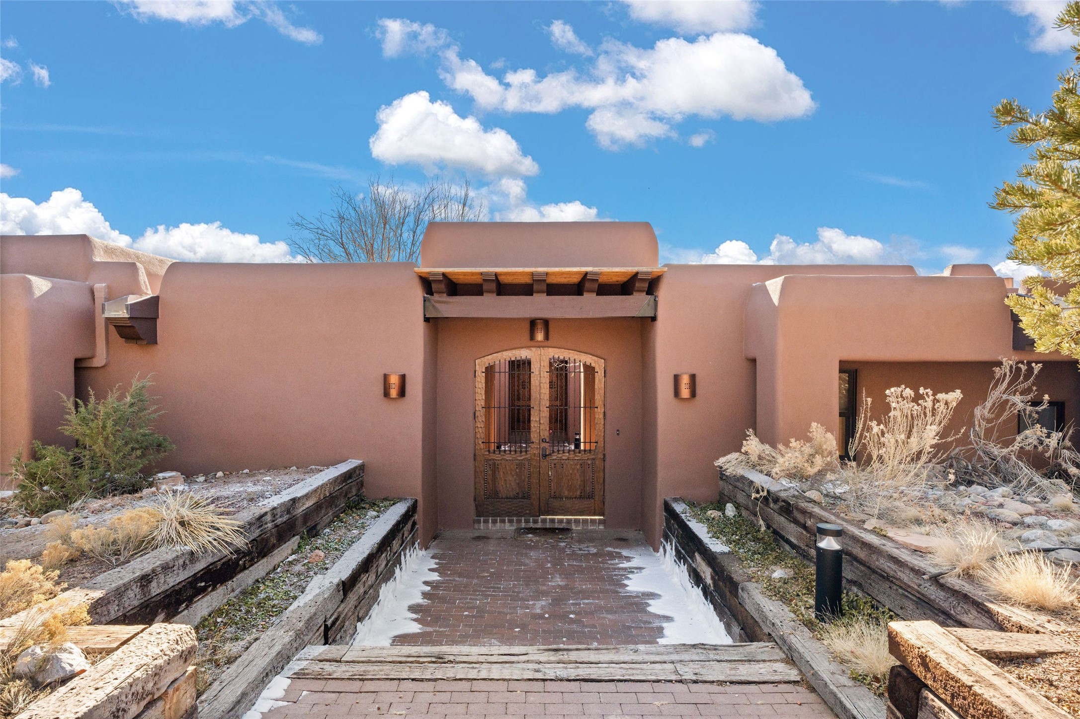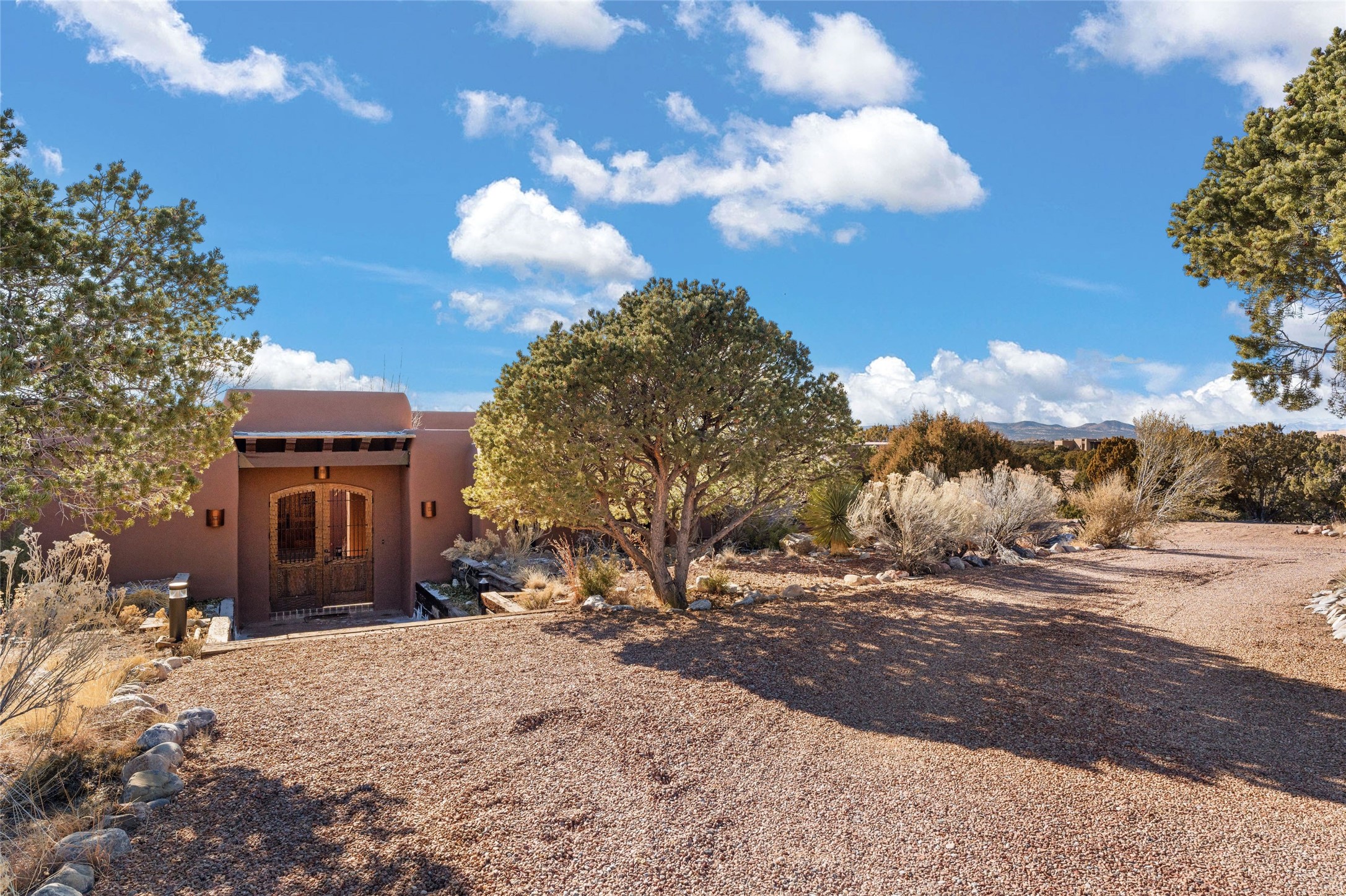 Nestled in the serene El Prado Subdivision, this 3,200 sq ft custom-built home on 6 acres offers a perfect blend of elegance, privacy, and modern convenience. Built in 2006, this meticulously maintained residence features three bedrooms, three full baths, and a spacious library, all on a single level with no interior steps.Step inside to discover the warm embrace of radiant floor heating, beautiful vigas, and diamond plaster walls. The heart of the home boasts a stunning stone-detailed two-sided fireplace, seamlessly connecting the living spaces to expansive outdoor portals, ideal for entertaining or simply enjoying the tranquility of the surroundings.The primary suite is a private oasis, complete with a walk-in shower, jetted bathtub, and a serene outdoor sitting area. A mini-split system provides efficient air conditioning and additional heating for the primary and first guest bedrooms, ensuring year-round comfort. The two guest suites offer privacy and comfort, making this home perfect for family and visitors alike.Outdoors, you'll find a cozy living space with a fireplace, perfect for cool Santa Fe evenings. An underground cistern efficiently collects rainwater from the roof, emphasizing the home's eco-friendly design. Access to this feature is conveniently located through the charming courtyard.Additional amenities include a 2-car garage with extra storage, energy-efficient Pumice-Crete construction, and a beautifully designed landscape that enhances the natural beauty of the property. Just 20 minutes from downtown Santa Fe, 34 Coppermallow offers a luxurious, peaceful retreat with all the conveniences of modern living. Schedule your private tour today and experience the unique charm of this stunning home!