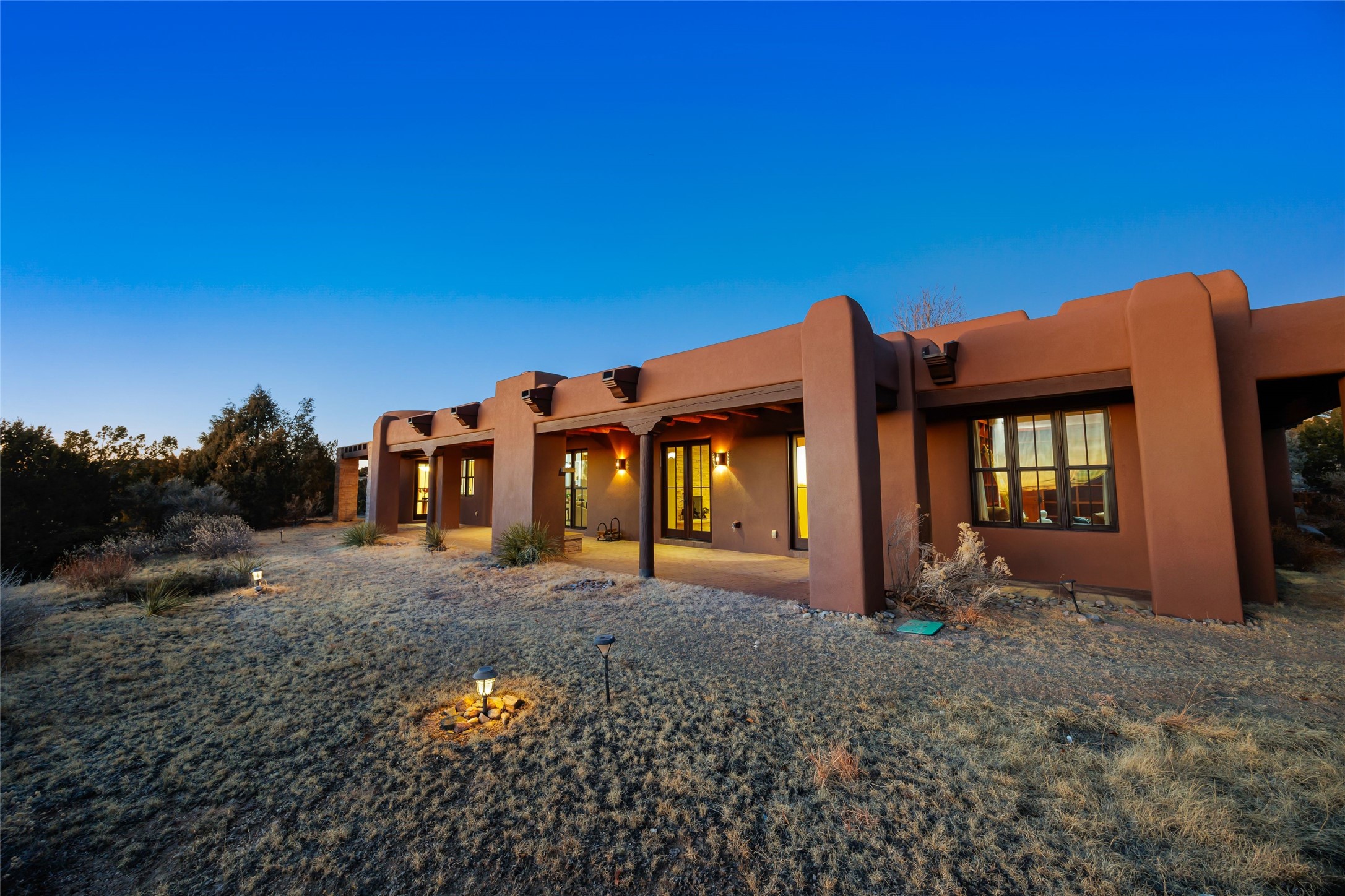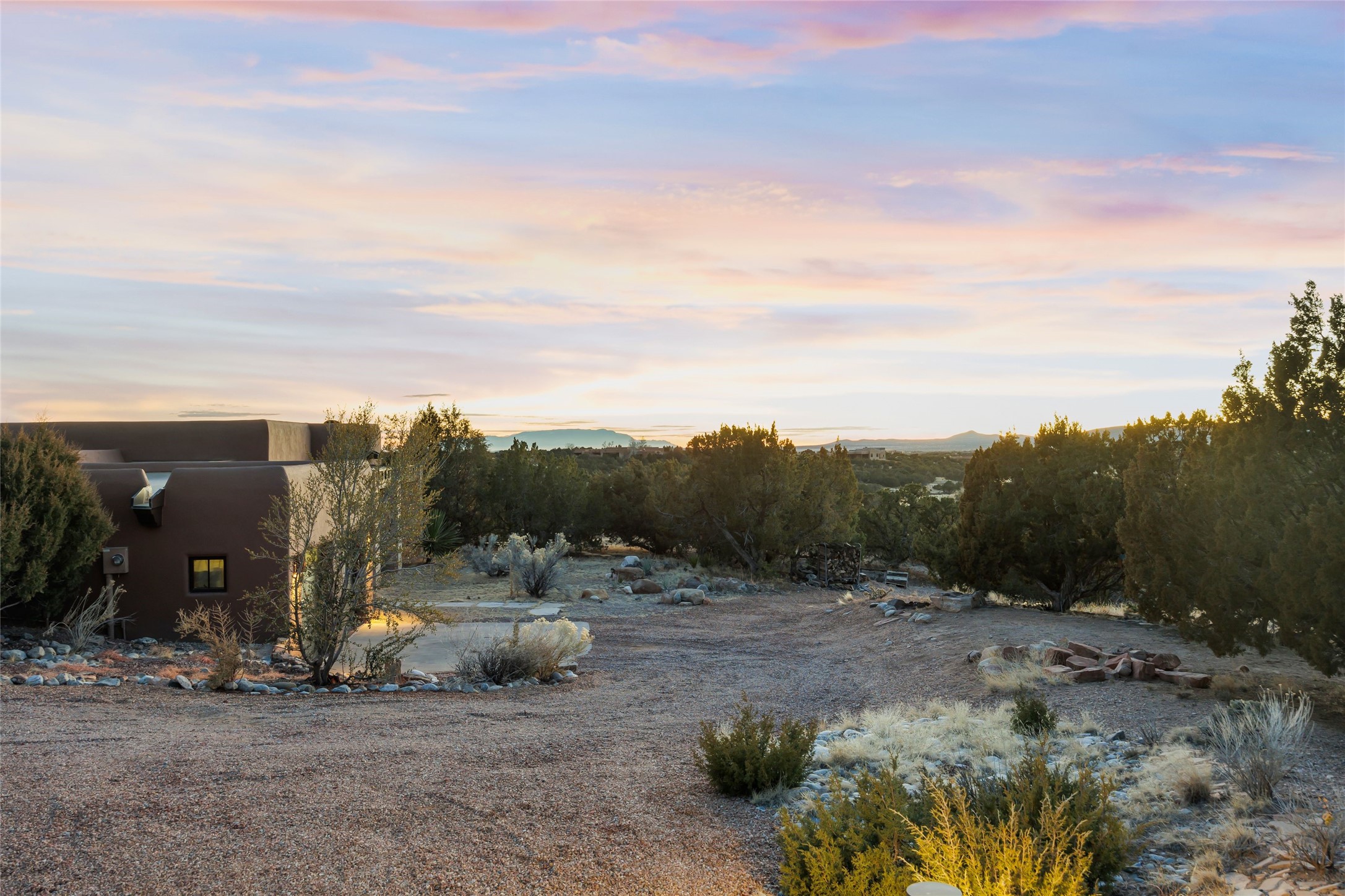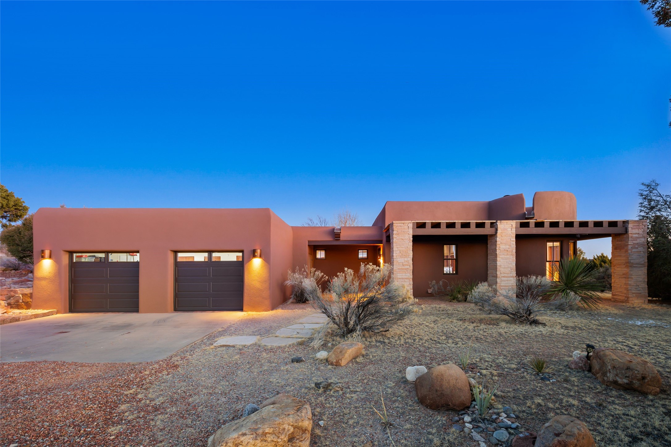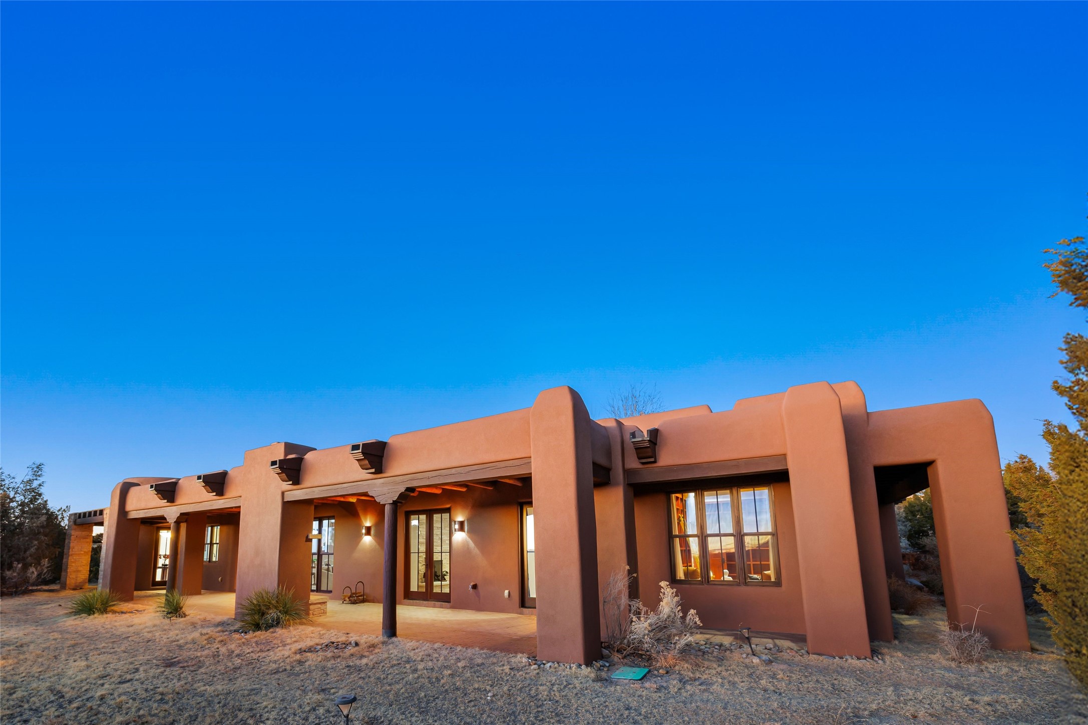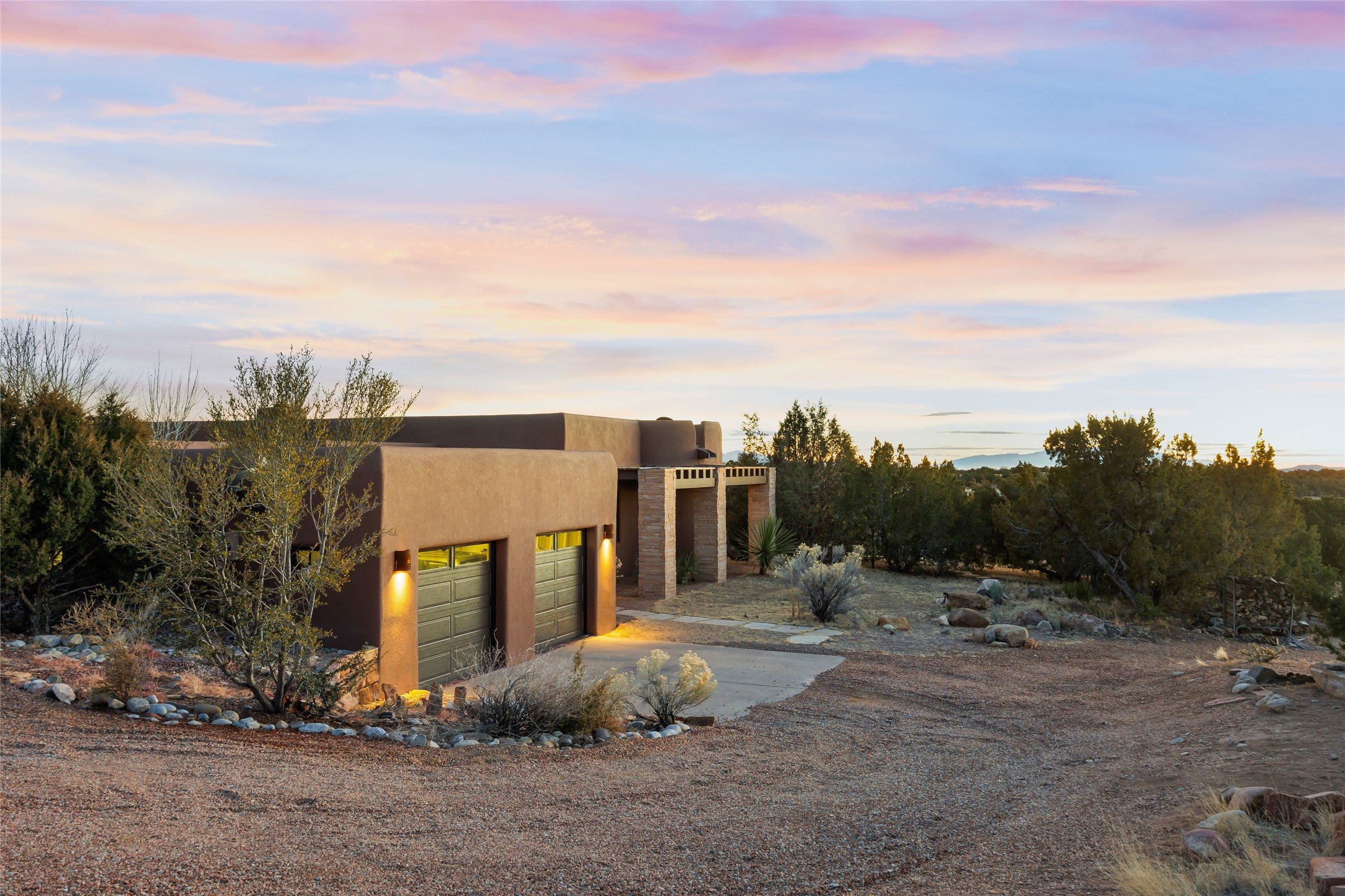 Nestled in the serene El Prado Subdivision, this 3,200 sq ft custom-built home on 6 acres offers a perfect blend of elegance, privacy, and modern convenience. Built in 2006, this meticulously maintained residence features three bedrooms, three full baths, and a spacious library, all on a single level with no interior steps.Step inside to discover the warm embrace of radiant floor heating, beautiful vigas, and diamond plaster walls. The heart of the home boasts a stunning stone-detailed two-sided fireplace, seamlessly connecting the living spaces to expansive outdoor portals, ideal for entertaining or simply enjoying the tranquility of the surroundings.The primary suite is a private oasis, complete with a walk-in shower, jetted bathtub, and a serene outdoor sitting area. A mini-split system provides efficient air conditioning and additional heating for the primary and first guest bedrooms, ensuring year-round comfort. The two guest suites offer privacy and comfort, making this home perfect for family and visitors alike.Outdoors, you'll find a cozy living space with a fireplace, perfect for cool Santa Fe evenings. An underground cistern efficiently collects rainwater from the roof, emphasizing the home's eco-friendly design. Access to this feature is conveniently located through the charming courtyard.Additional amenities include a 2-car garage with extra storage, energy-efficient Pumice-Crete construction, and a beautifully designed landscape that enhances the natural beauty of the property. Just 20 minutes from downtown Santa Fe, 34 Coppermallow offers a luxurious, peaceful retreat with all the conveniences of modern living. Schedule your private tour today and experience the unique charm of this stunning home!