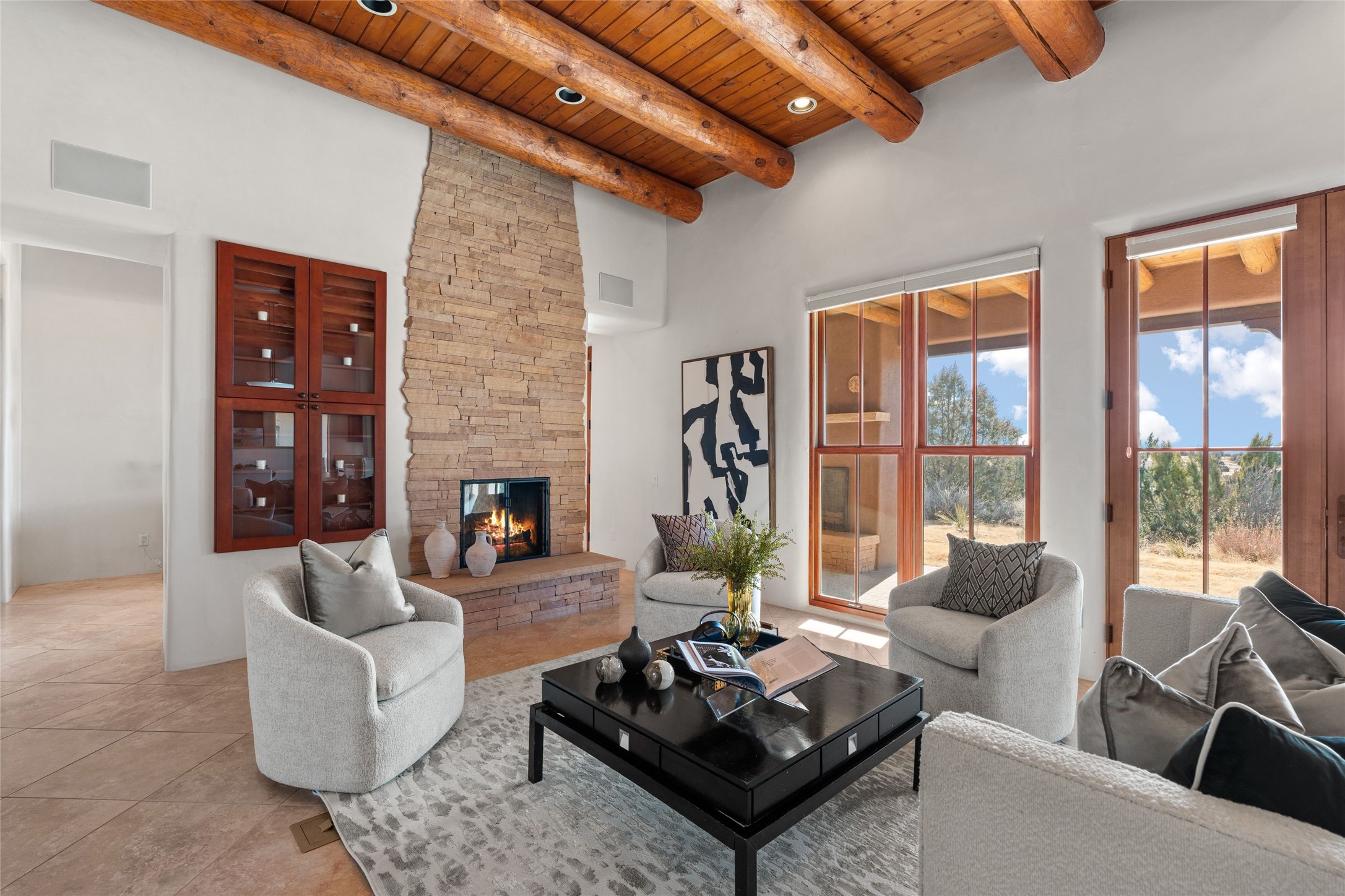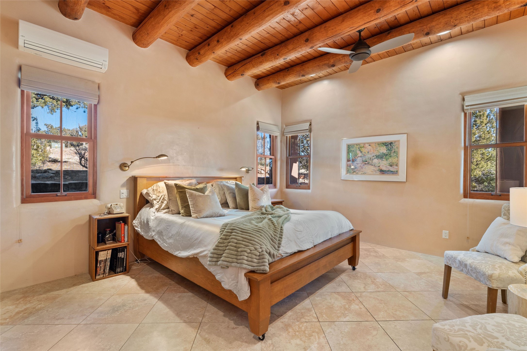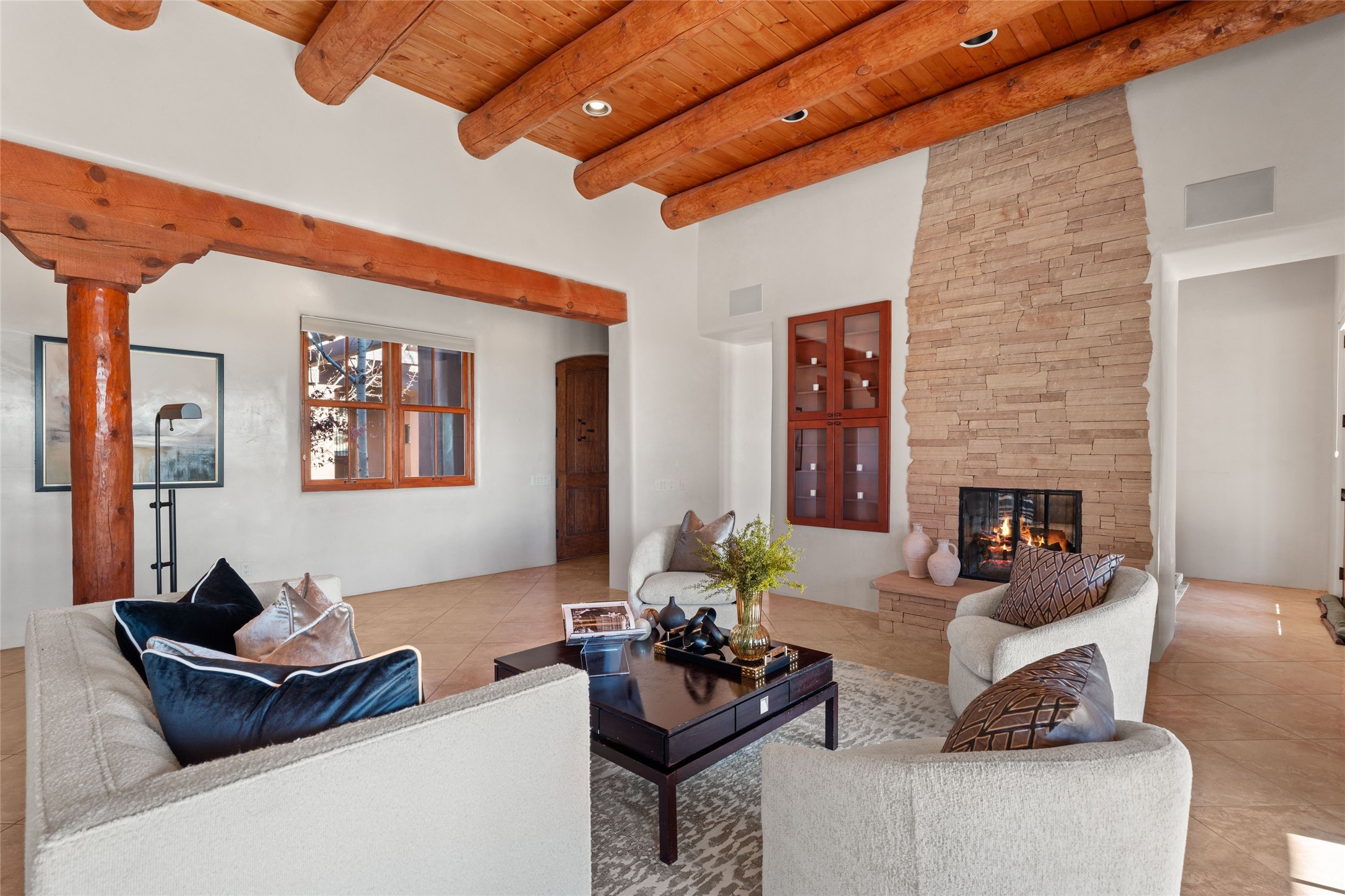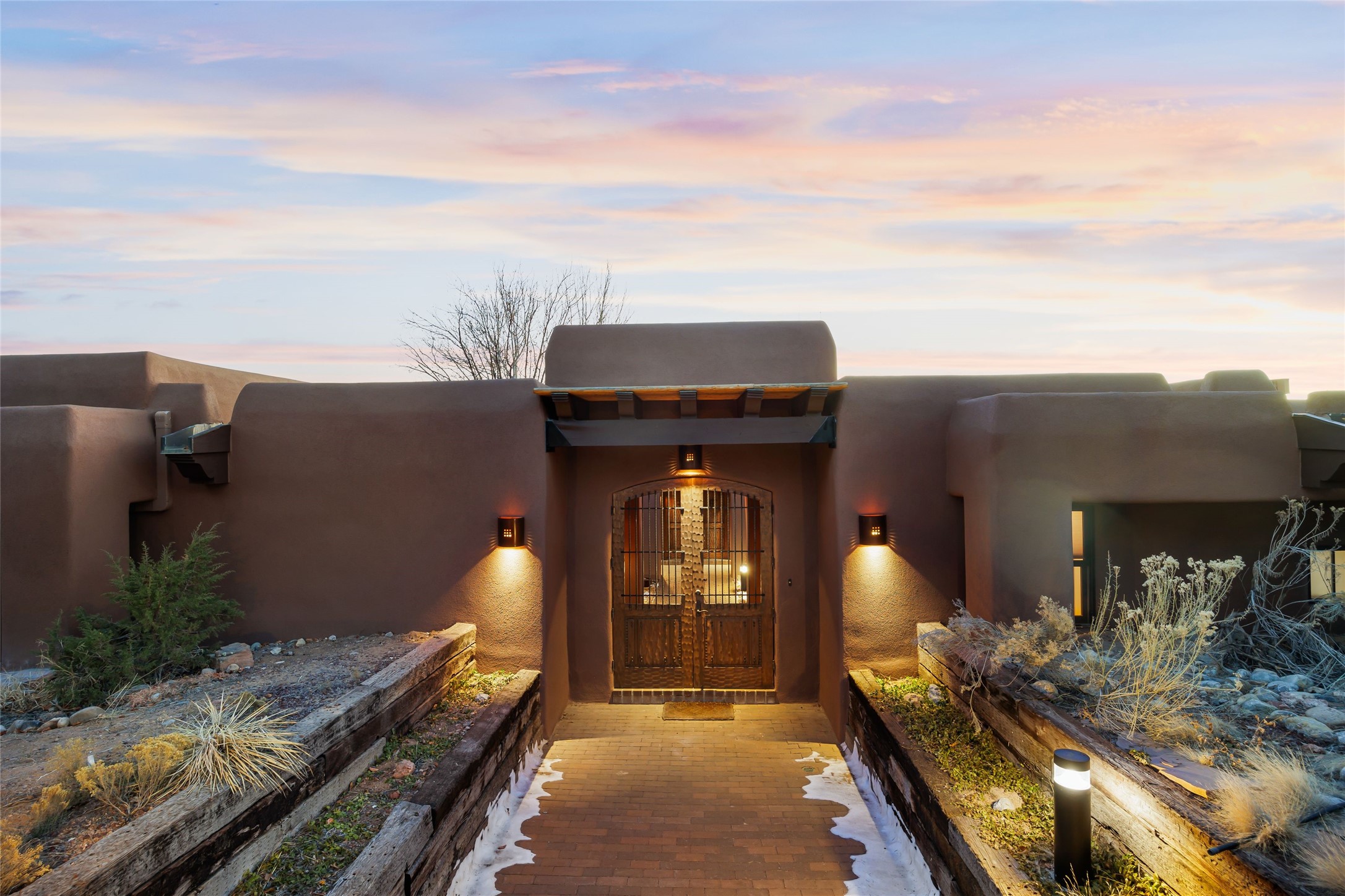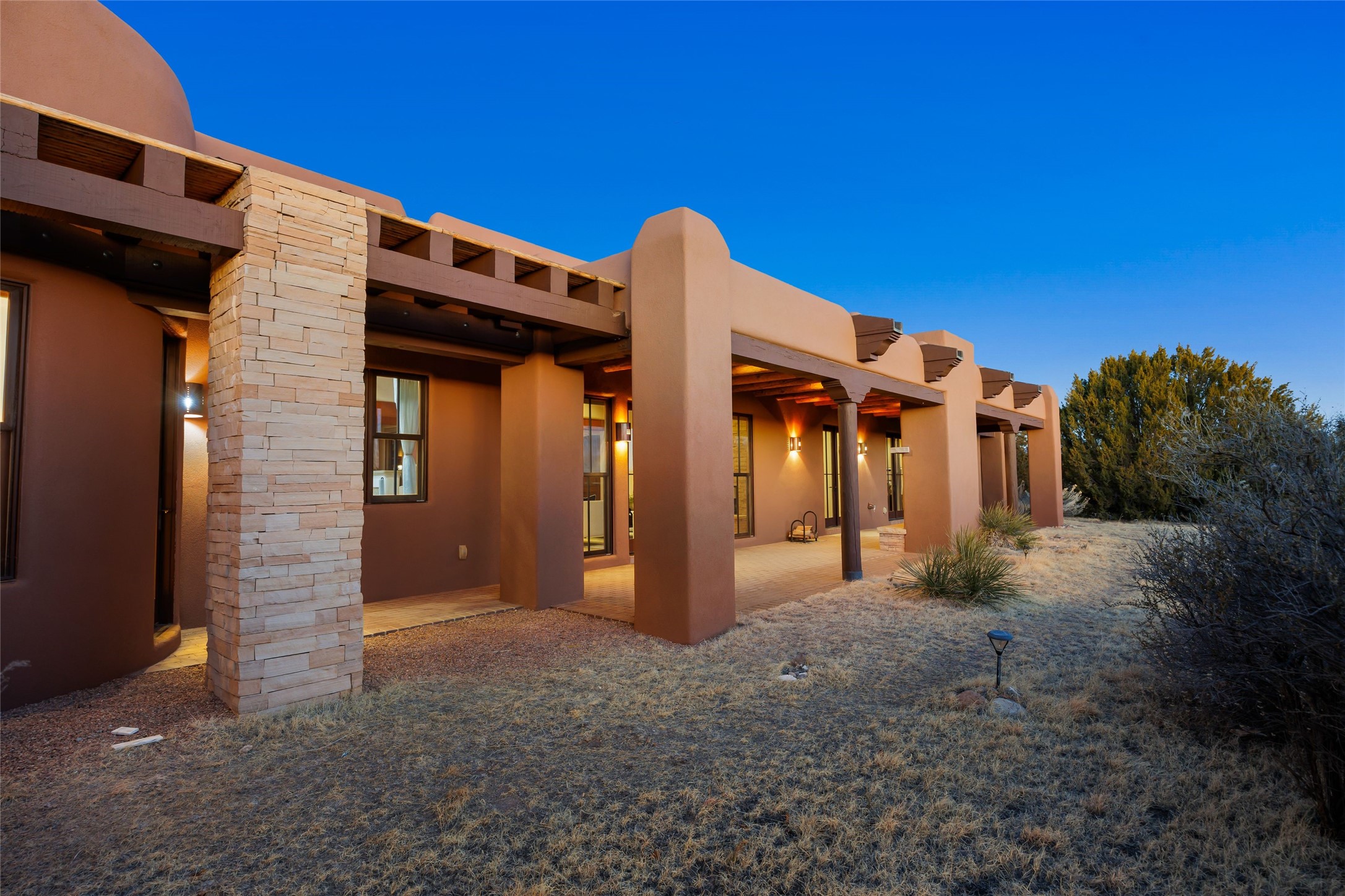 Nestled in the serene El Prado Subdivision, this 3,200 sq ft custom-built home on 6 acres offers a perfect blend of elegance, privacy, and modern convenience. Built in 2006, this meticulously maintained residence features three bedrooms, three full baths, and a spacious library, all on a single level with no interior steps.Step inside to discover the warm embrace of radiant floor heating, beautiful vigas, and diamond plaster walls. The heart of the home boasts a stunning stone-detailed two-sided fireplace, seamlessly connecting the living spaces to expansive outdoor portals, ideal for entertaining or simply enjoying the tranquility of the surroundings.The primary suite is a private oasis, complete with a walk-in shower, jetted bathtub, and a serene outdoor sitting area. A mini-split system provides efficient air conditioning and additional heating for the primary and first guest bedrooms, ensuring year-round comfort. The two guest suites offer privacy and comfort, making this home perfect for family and visitors alike.Outdoors, you'll find a cozy living space with a fireplace, perfect for cool Santa Fe evenings. An underground cistern efficiently collects rainwater from the roof, emphasizing the home's eco-friendly design. Access to this feature is conveniently located through the charming courtyard.Additional amenities include a 2-car garage with extra storage, energy-efficient Pumice-Crete construction, and a beautifully designed landscape that enhances the natural beauty of the property. Just 20 minutes from downtown Santa Fe, 34 Coppermallow offers a luxurious, peaceful retreat with all the conveniences of modern living. Schedule your private tour today and experience the unique charm of this stunning home!