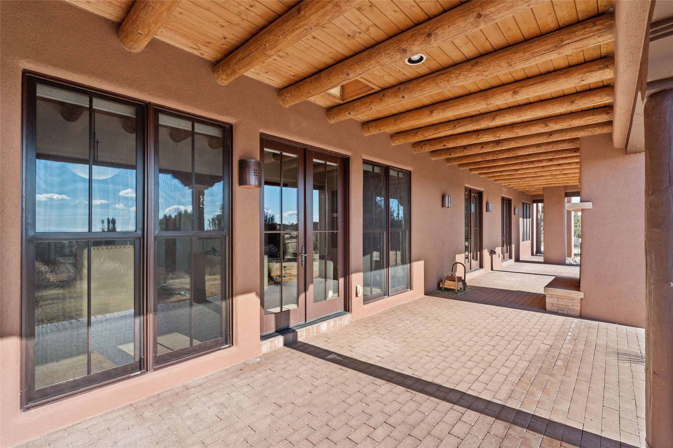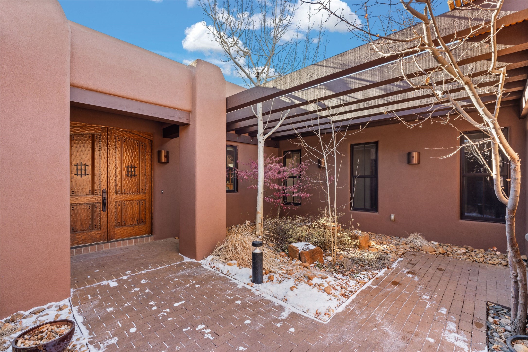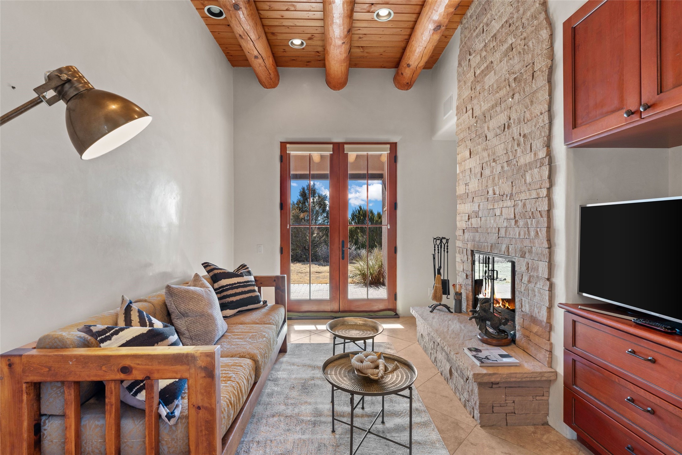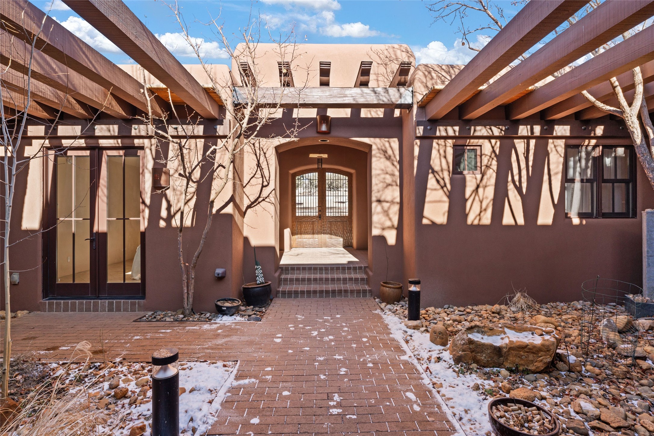 Nestled in the serene El Prado Subdivision, this 3,200 sq ft custom-built home on 6 acres offers a perfect blend of elegance, privacy, and modern convenience. Built in 2006, this meticulously maintained residence features three bedrooms, three full baths, and a spacious library, all on a single level with no interior steps.Step inside to discover the warm embrace of radiant floor heating, beautiful vigas, and diamond plaster walls. The heart of the home boasts a stunning stone-detailed two-sided fireplace, seamlessly connecting the living spaces to expansive outdoor portals, ideal for entertaining or simply enjoying the tranquility of the surroundings.The primary suite is a private oasis, complete with a walk-in shower, jetted bathtub, and a serene outdoor sitting area. A mini-split system provides efficient air conditioning and additional heating for the primary and first guest bedrooms, ensuring year-round comfort. The two guest suites offer privacy and comfort, making this home perfect for family and visitors alike.Outdoors, you'll find a cozy living space with a fireplace, perfect for cool Santa Fe evenings. An underground cistern efficiently collects rainwater from the roof, emphasizing the home's eco-friendly design. Access to this feature is conveniently located through the charming courtyard.Additional amenities include a 2-car garage with extra storage, energy-efficient Pumice-Crete construction, and a beautifully designed landscape that enhances the natural beauty of the property. Just 20 minutes from downtown Santa Fe, 34 Coppermallow offers a luxurious, peaceful retreat with all the conveniences of modern living. Schedule your private tour today and experience the unique charm of this stunning home!
