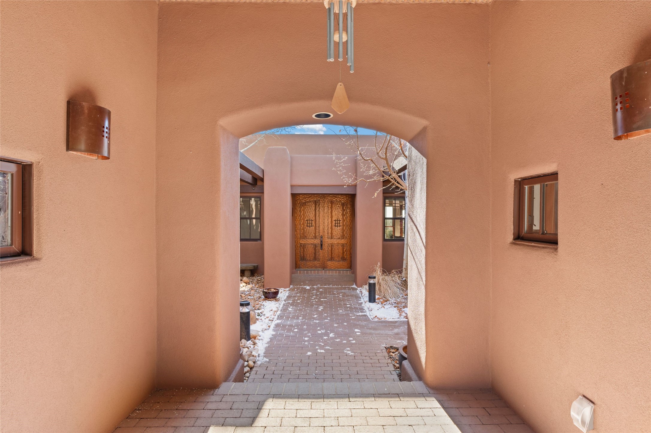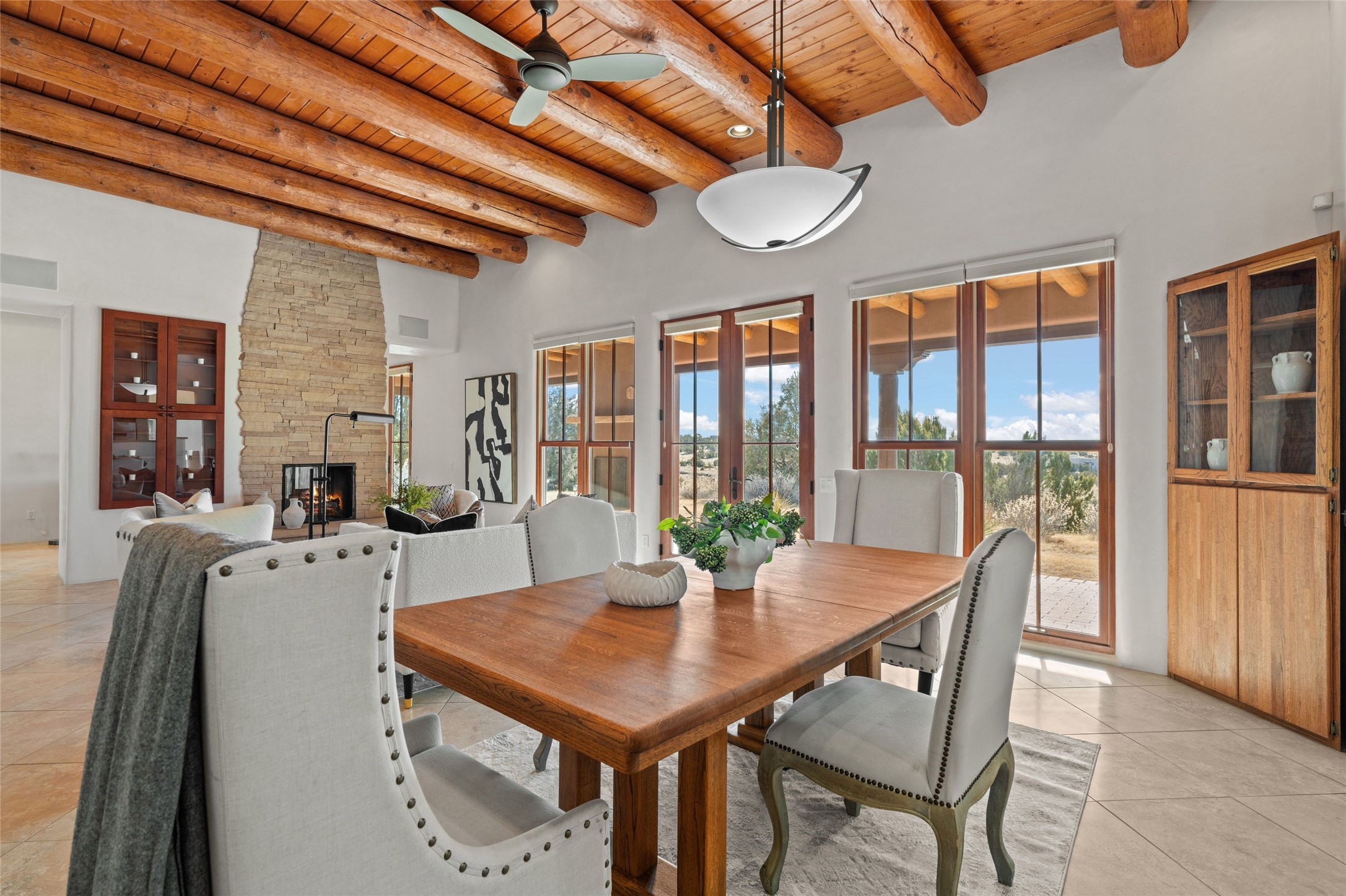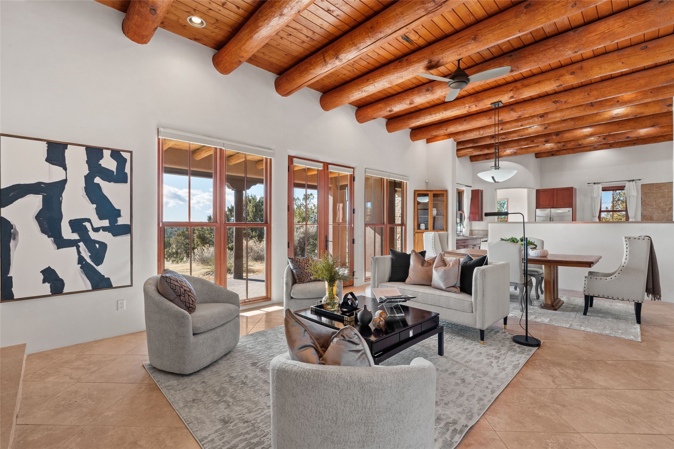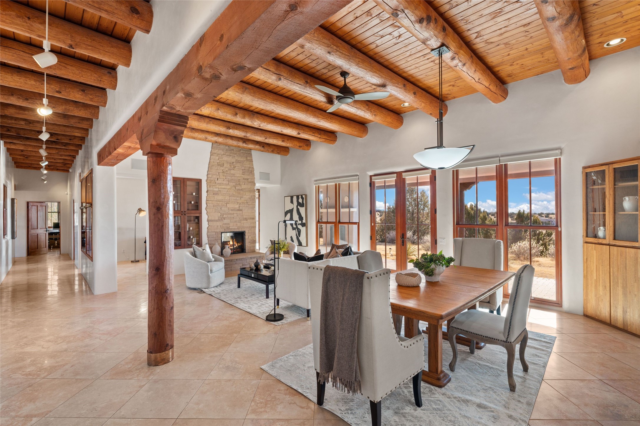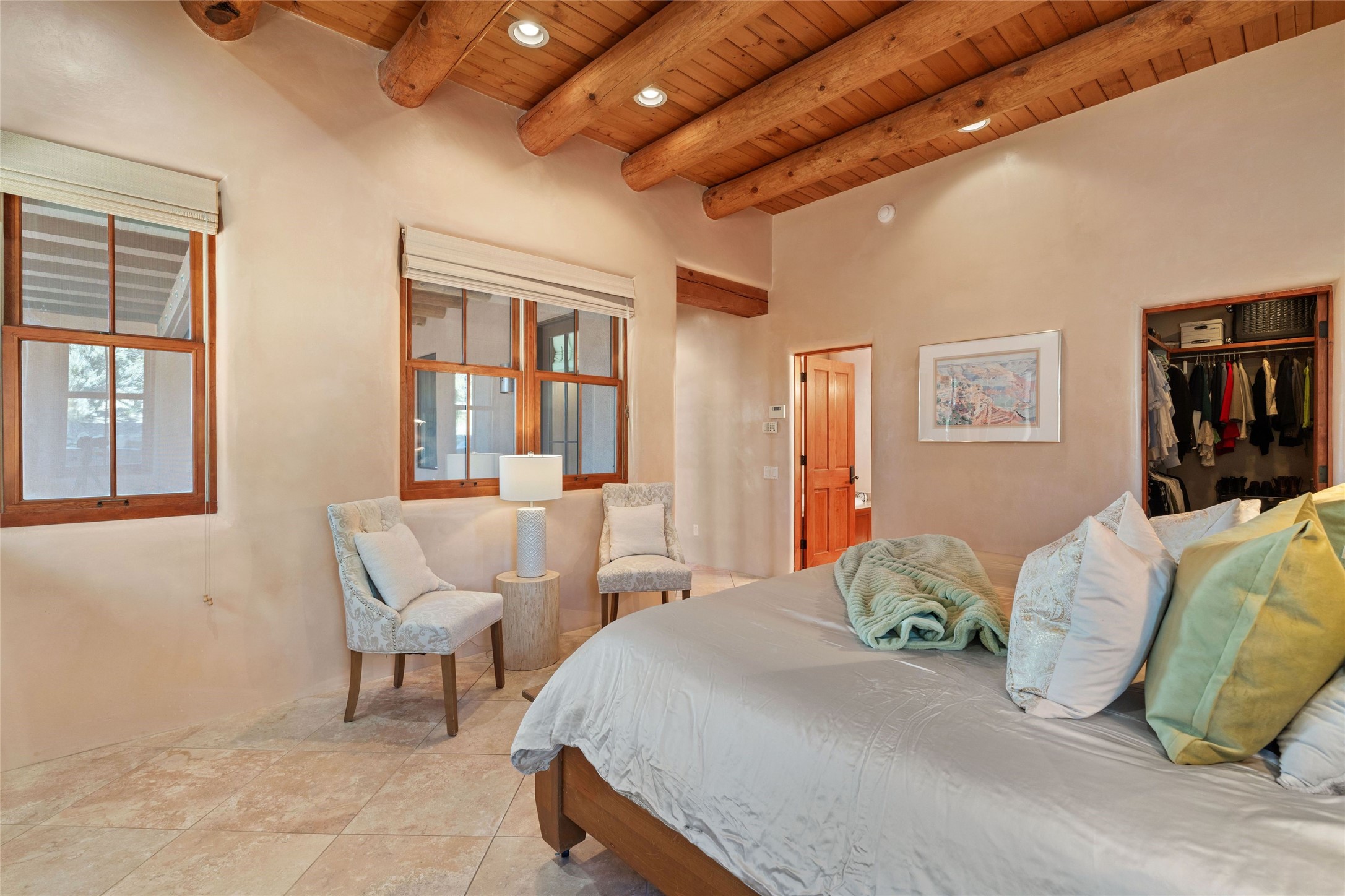 Nestled in the serene El Prado Subdivision, this 3,200 sq ft custom-built home on 6 acres offers a perfect blend of elegance, privacy, and modern convenience. Built in 2006, this meticulously maintained residence features three bedrooms, three full baths, and a spacious library, all on a single level with no interior steps.Step inside to discover the warm embrace of radiant floor heating, beautiful vigas, and diamond plaster walls. The heart of the home boasts a stunning stone-detailed two-sided fireplace, seamlessly connecting the living spaces to expansive outdoor portals, ideal for entertaining or simply enjoying the tranquility of the surroundings.The primary suite is a private oasis, complete with a walk-in shower, jetted bathtub, and a serene outdoor sitting area. A mini-split system provides efficient air conditioning and additional heating for the primary and first guest bedrooms, ensuring year-round comfort. The two guest suites offer privacy and comfort, making this home perfect for family and visitors alike.Outdoors, you'll find a cozy living space with a fireplace, perfect for cool Santa Fe evenings. An underground cistern efficiently collects rainwater from the roof, emphasizing the home's eco-friendly design. Access to this feature is conveniently located through the charming courtyard.Additional amenities include a 2-car garage with extra storage, energy-efficient Pumice-Crete construction, and a beautifully designed landscape that enhances the natural beauty of the property. Just 20 minutes from downtown Santa Fe, 34 Coppermallow offers a luxurious, peaceful retreat with all the conveniences of modern living. Schedule your private tour today and experience the unique charm of this stunning home!