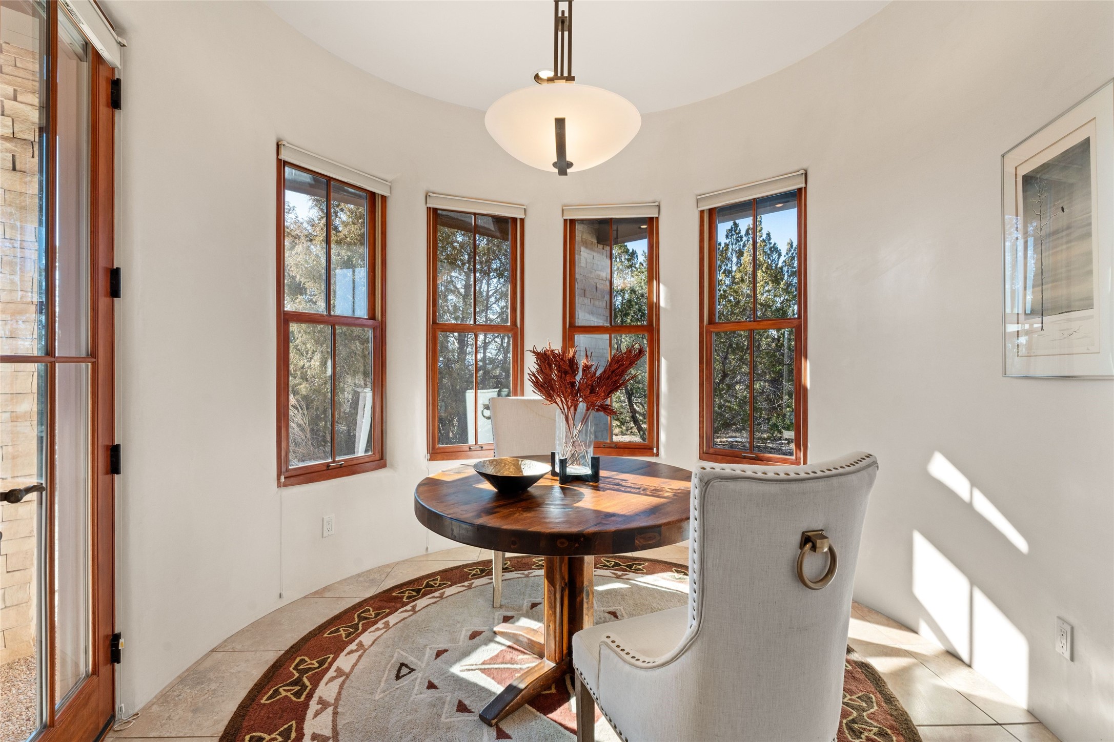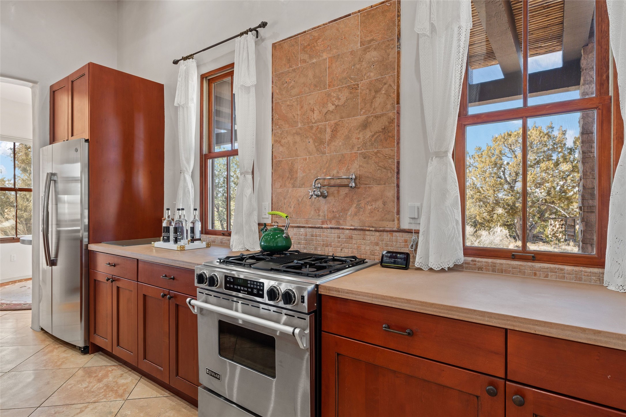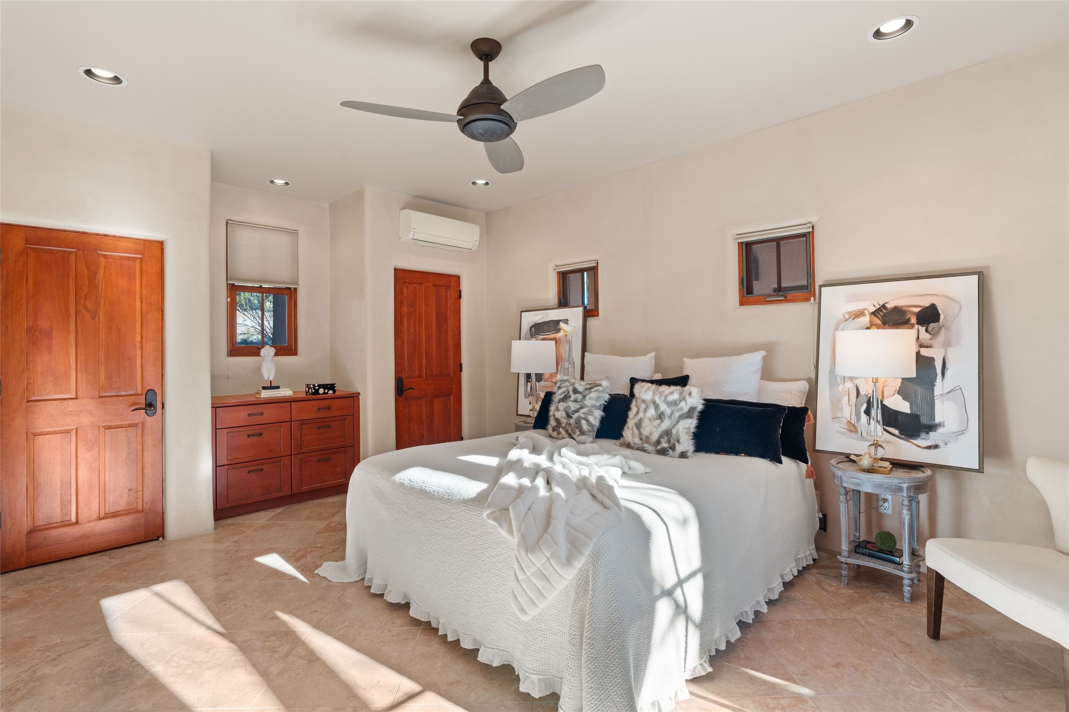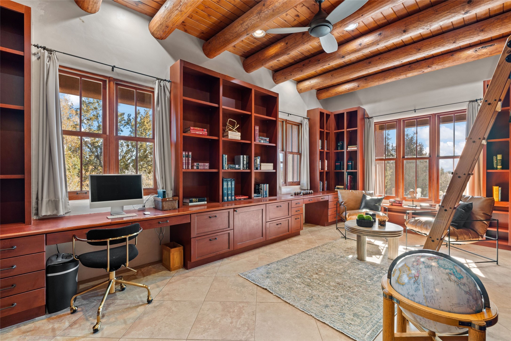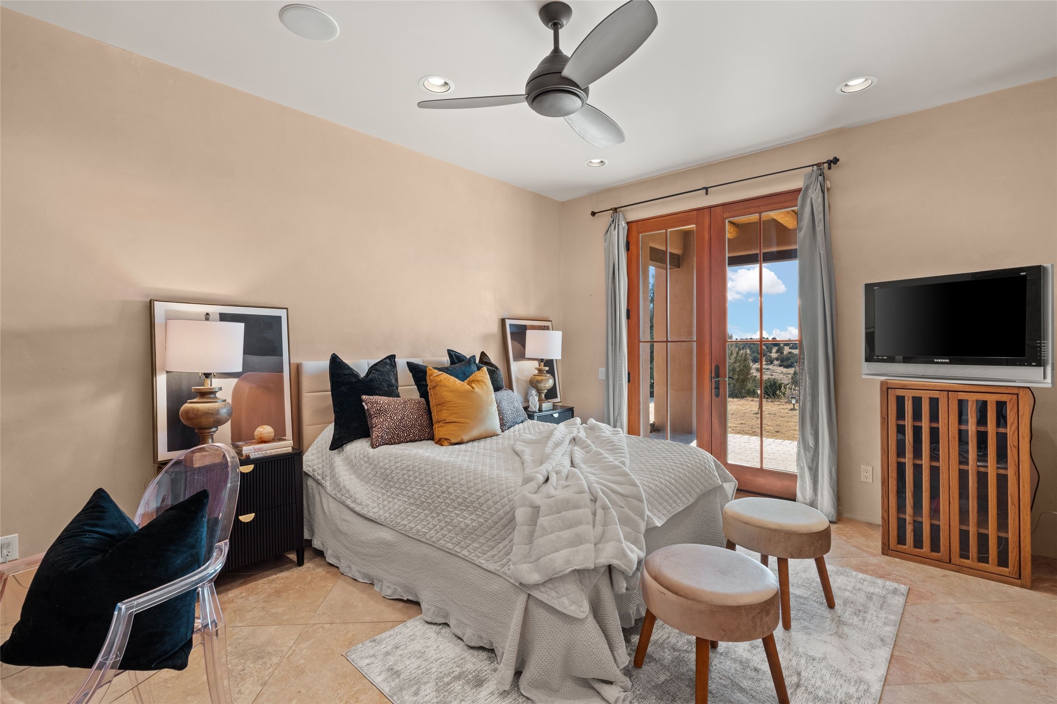 Nestled in the serene El Prado Subdivision, this 3,200 sq ft custom-built home on 6 acres offers a perfect blend of elegance, privacy, and modern convenience. Built in 2006, this meticulously maintained residence features three bedrooms, three full baths, and a spacious library, all on a single level with no interior steps.Step inside to discover the warm embrace of radiant floor heating, beautiful vigas, and diamond plaster walls. The heart of the home boasts a stunning stone-detailed two-sided fireplace, seamlessly connecting the living spaces to expansive outdoor portals, ideal for entertaining or simply enjoying the tranquility of the surroundings.The primary suite is a private oasis, complete with a walk-in shower, jetted bathtub, and a serene outdoor sitting area. A mini-split system provides efficient air conditioning and additional heating for the primary and first guest bedrooms, ensuring year-round comfort. The two guest suites offer privacy and comfort, making this home perfect for family and visitors alike.Outdoors, you'll find a cozy living space with a fireplace, perfect for cool Santa Fe evenings. An underground cistern efficiently collects rainwater from the roof, emphasizing the home's eco-friendly design. Access to this feature is conveniently located through the charming courtyard.Additional amenities include a 2-car garage with extra storage, energy-efficient Pumice-Crete construction, and a beautifully designed landscape that enhances the natural beauty of the property. Just 20 minutes from downtown Santa Fe, 34 Coppermallow offers a luxurious, peaceful retreat with all the conveniences of modern living. Schedule your private tour today and experience the unique charm of this stunning home!