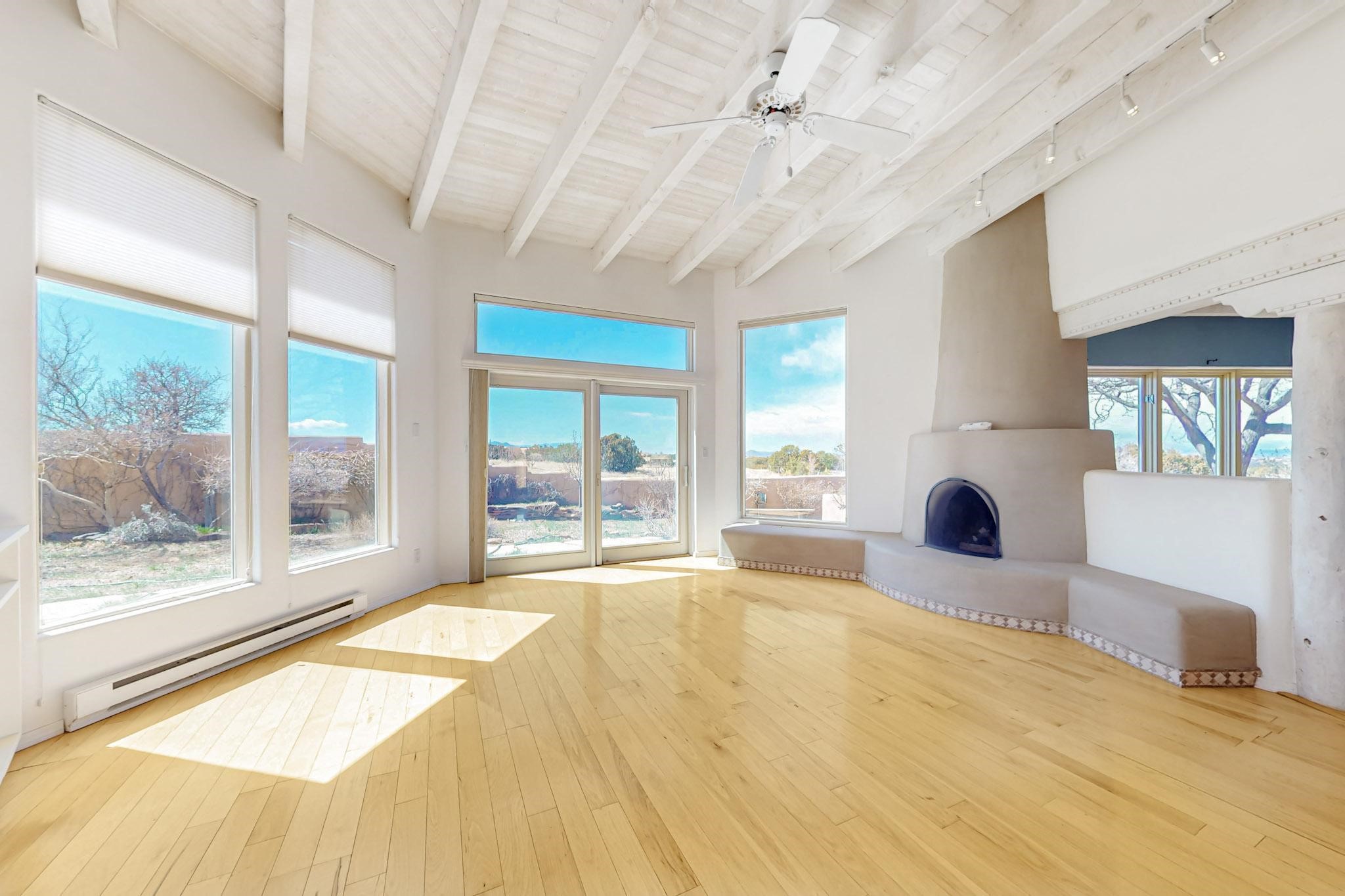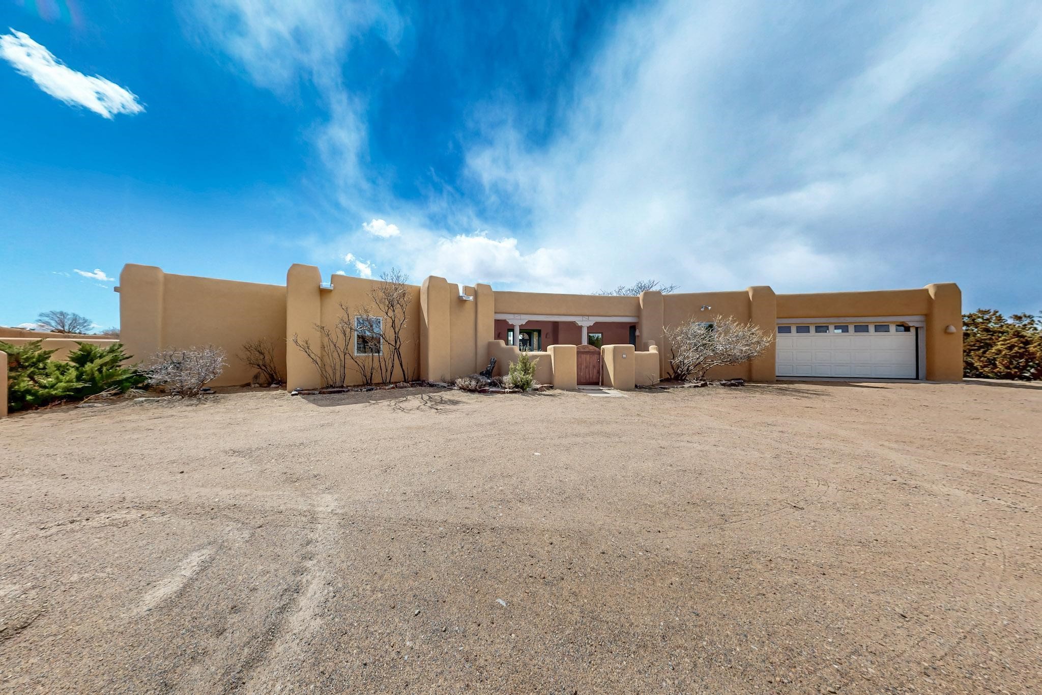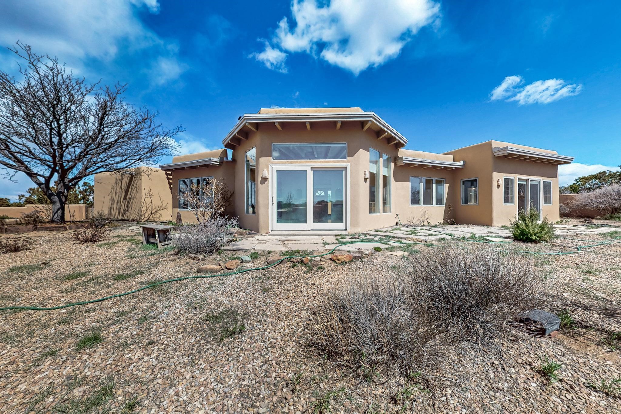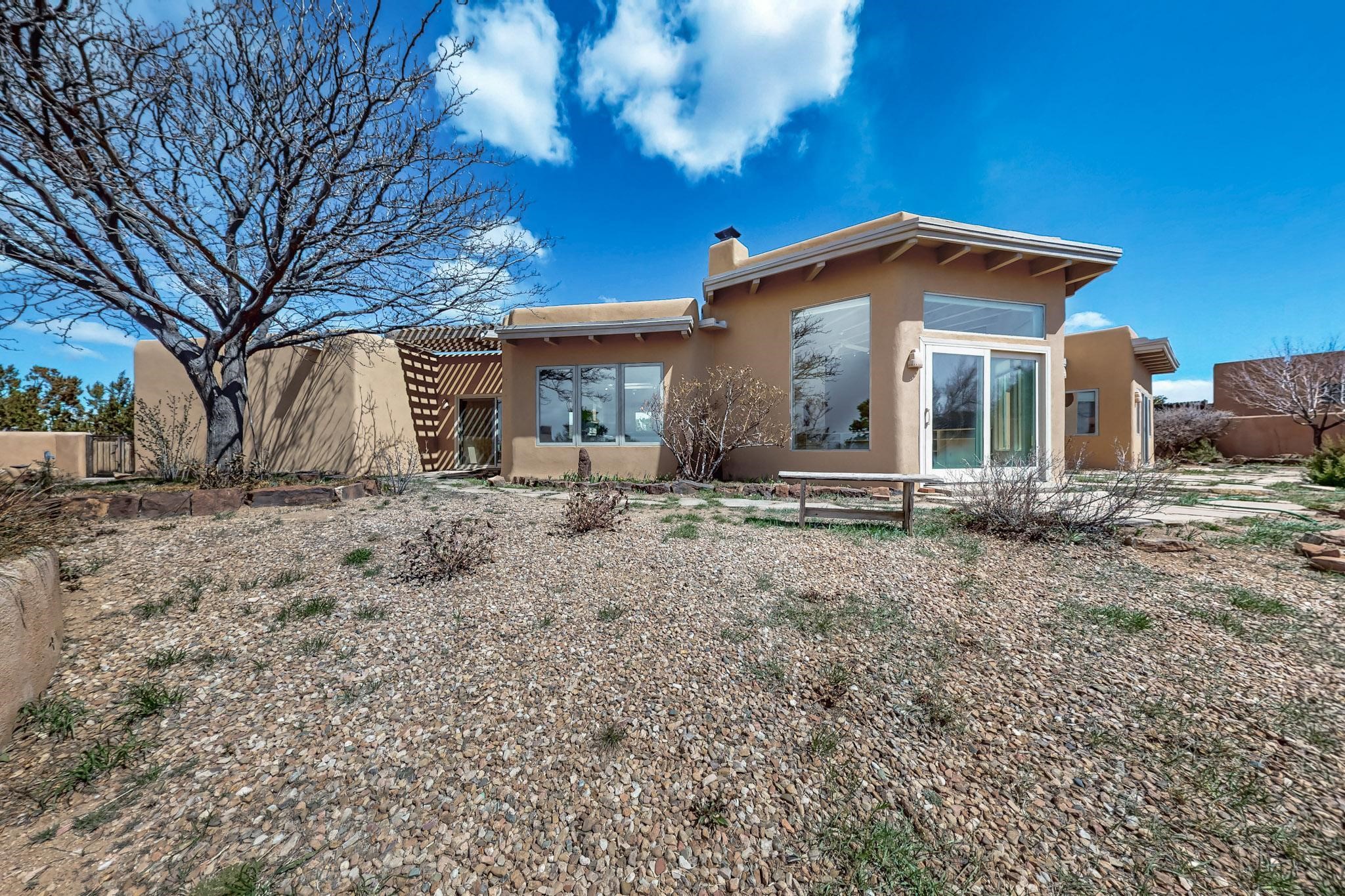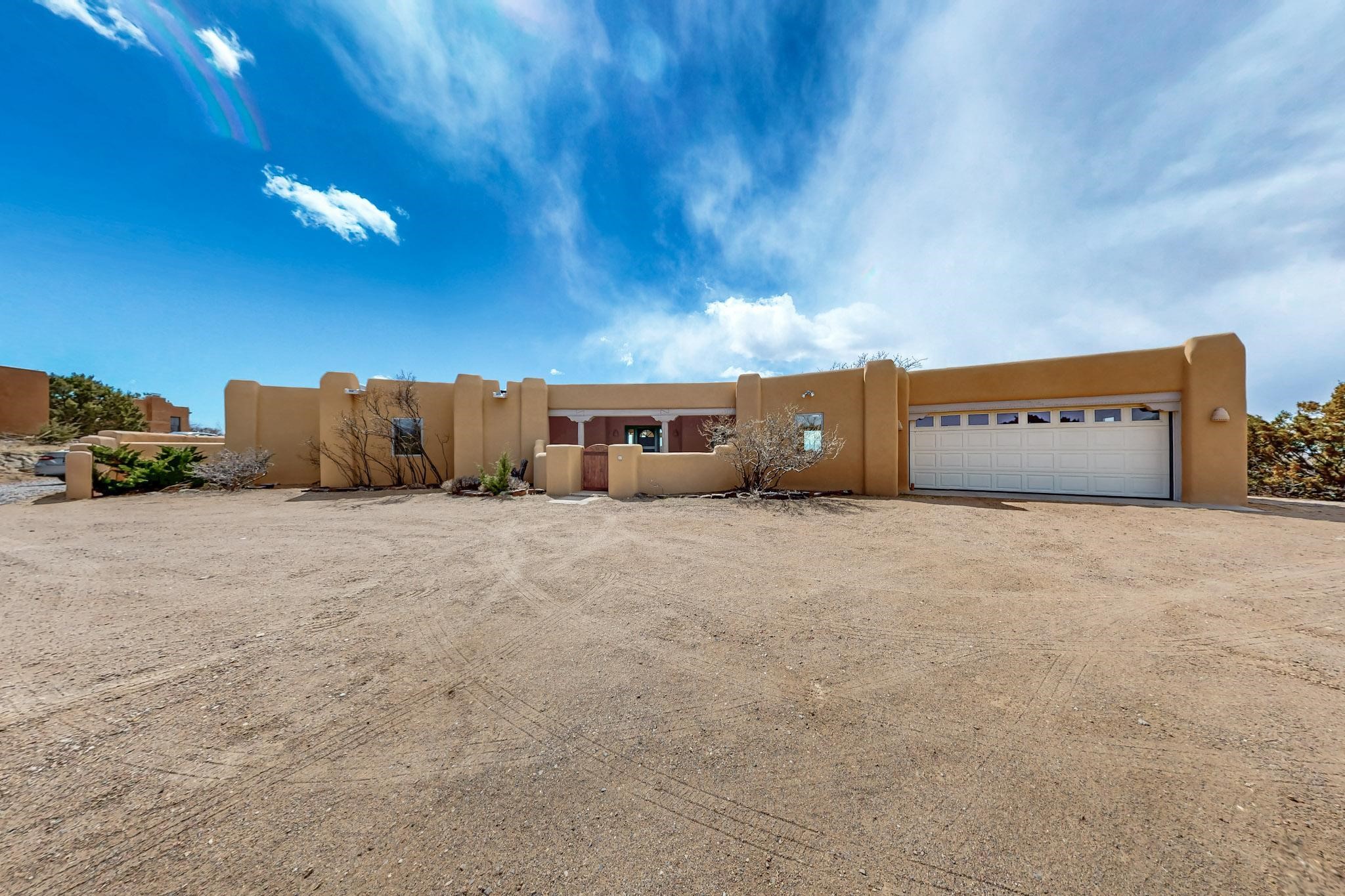 Classic popular design created by architect Rad Acton and built by one of Santa Fe's premier builders Kim Dressel in 1989. This home and garden is waiting to be loved again. Contemporary pueblo design with Santa Fe detailing throughout. Passive solar and electric baseboard heating, hickory wood floors, carved wood beams and a traditional masonry kiva fireplace. Brand new Stucco, upgraded roof with a 2 year warranty, brand new skylights, maintained windows and a new driveway all in 2024. A studio / play room separates the kitchen from the oversized 2 car garage. There are wonderful walled outside garden spaces ready for the avid gardener with sunset and mountain vistas. Needs a little loving uplift to bring it back. This home is in an ideal location for access to the Rail Trail, all of Eldorado Amenities, 2 local shopping centers, library, schools, senior center and parks. Only minutes into Santa Fe