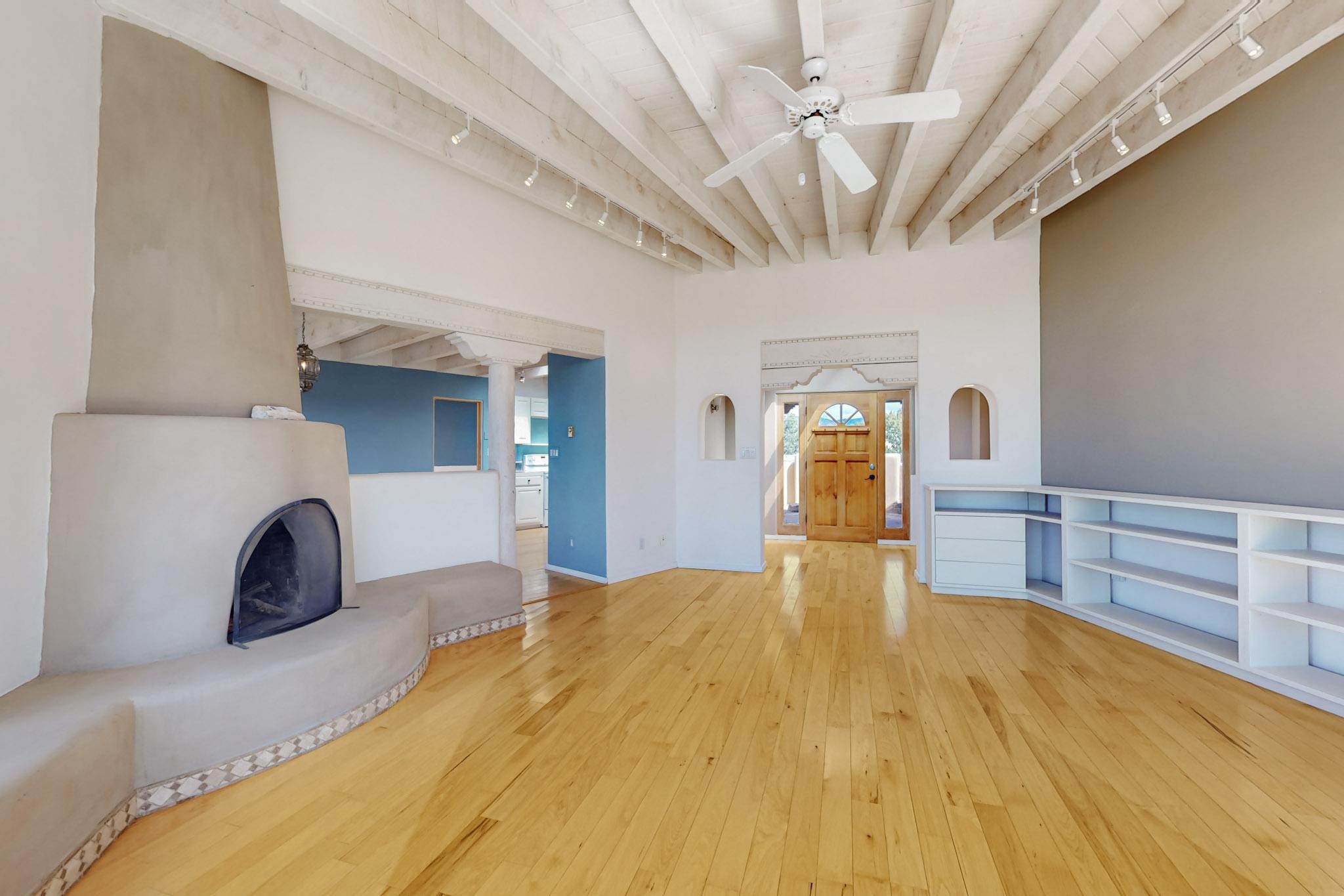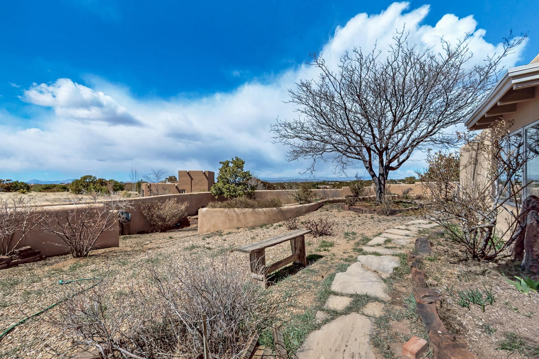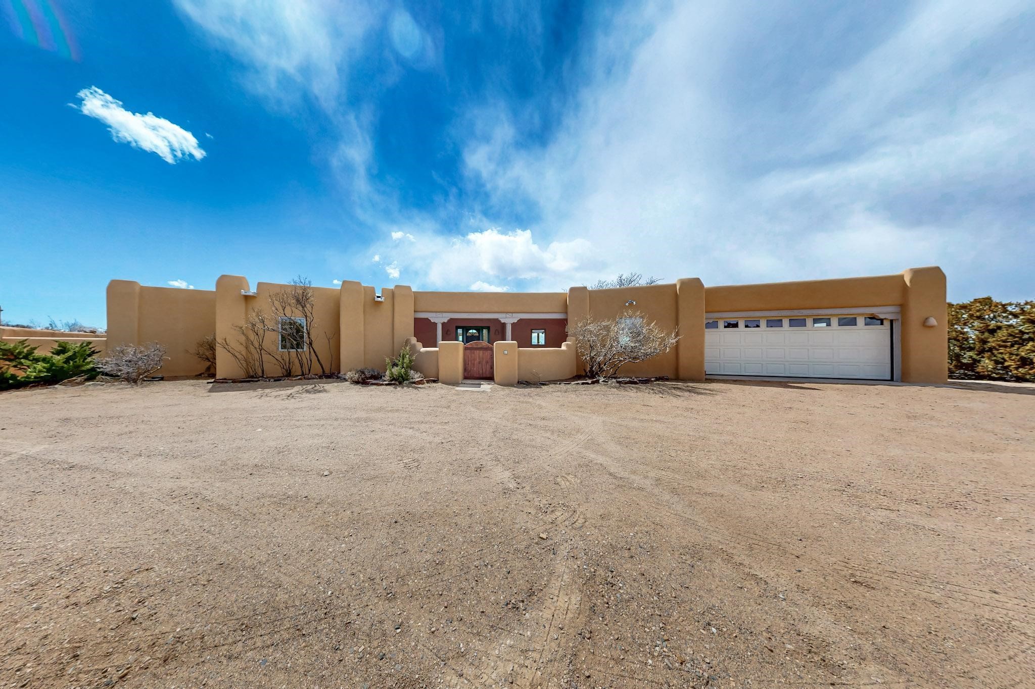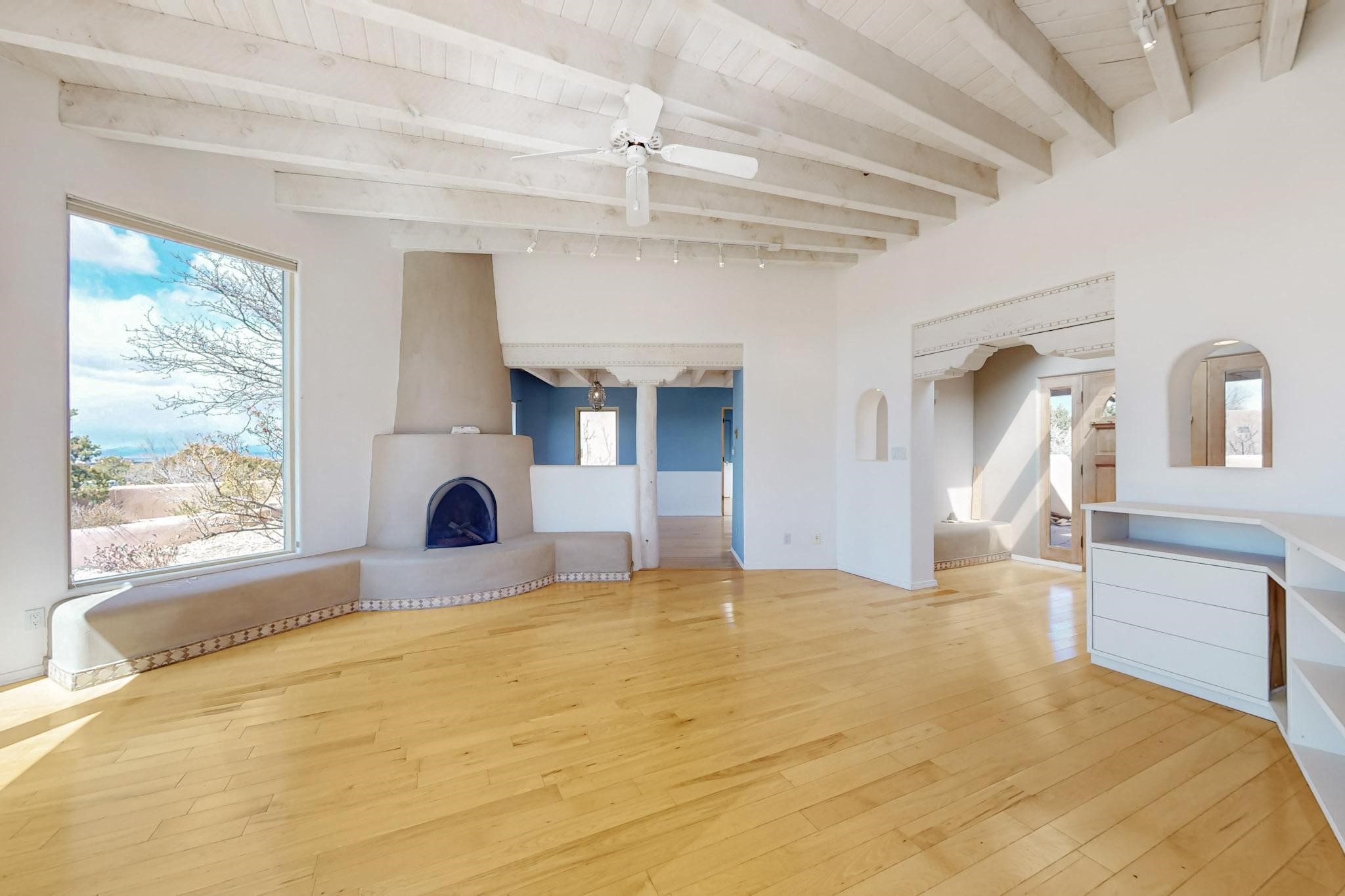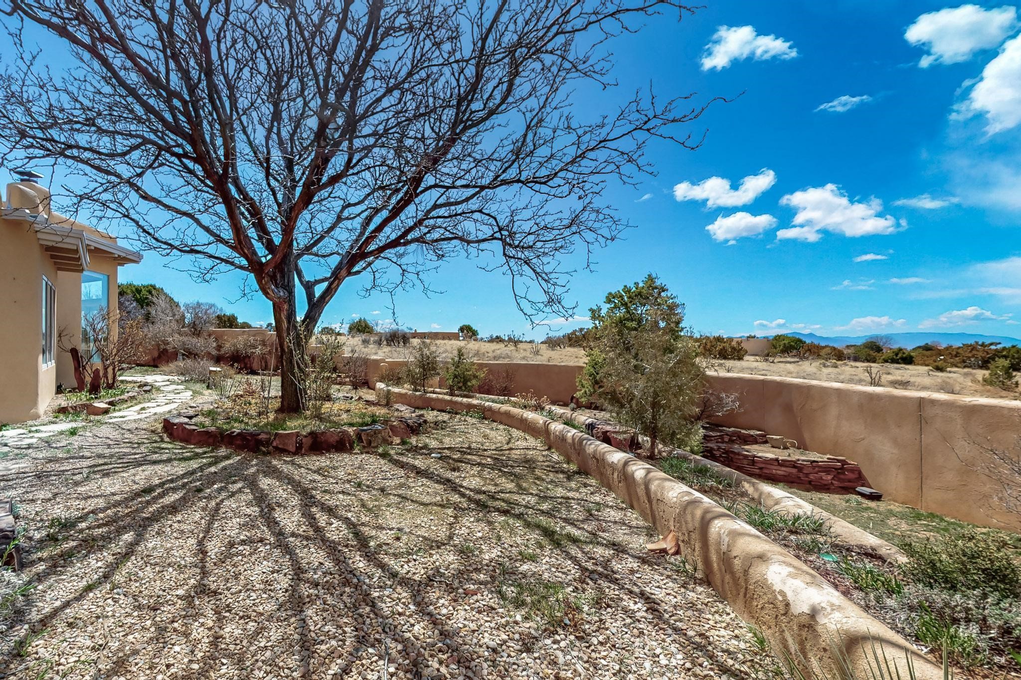 Classic popular design created by architect Rad Acton and built by one of Santa Fe's premier builders Kim Dressel in 1989. This home and garden is waiting to be loved again. Contemporary pueblo design with Santa Fe detailing throughout. Passive solar and electric baseboard heating, hickory wood floors, carved wood beams and a traditional masonry kiva fireplace. Brand new Stucco, upgraded roof with a 2 year warranty, brand new skylights, maintained windows and a new driveway all in 2024. A studio / play room separates the kitchen from the oversized 2 car garage. There are wonderful walled outside garden spaces ready for the avid gardener with sunset and mountain vistas. Needs a little loving uplift to bring it back. This home is in an ideal location for access to the Rail Trail, all of Eldorado Amenities, 2 local shopping centers, library, schools, senior center and parks. Only minutes into Santa Fe