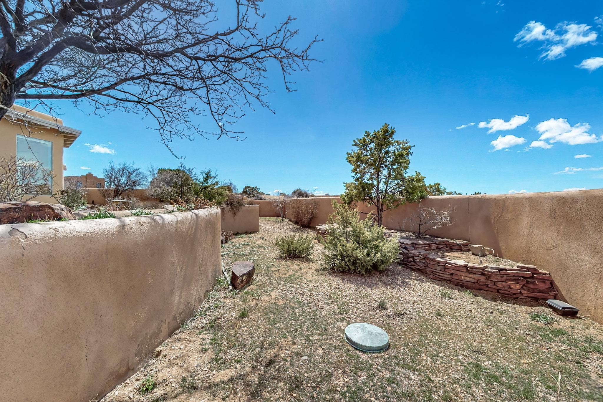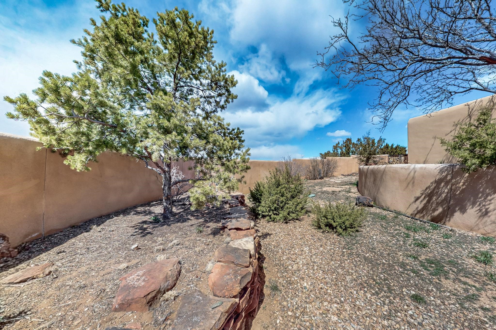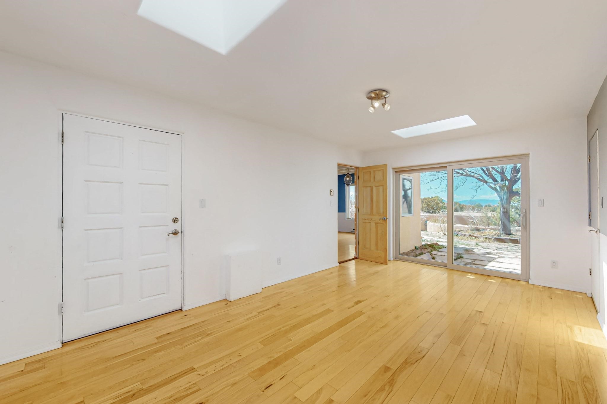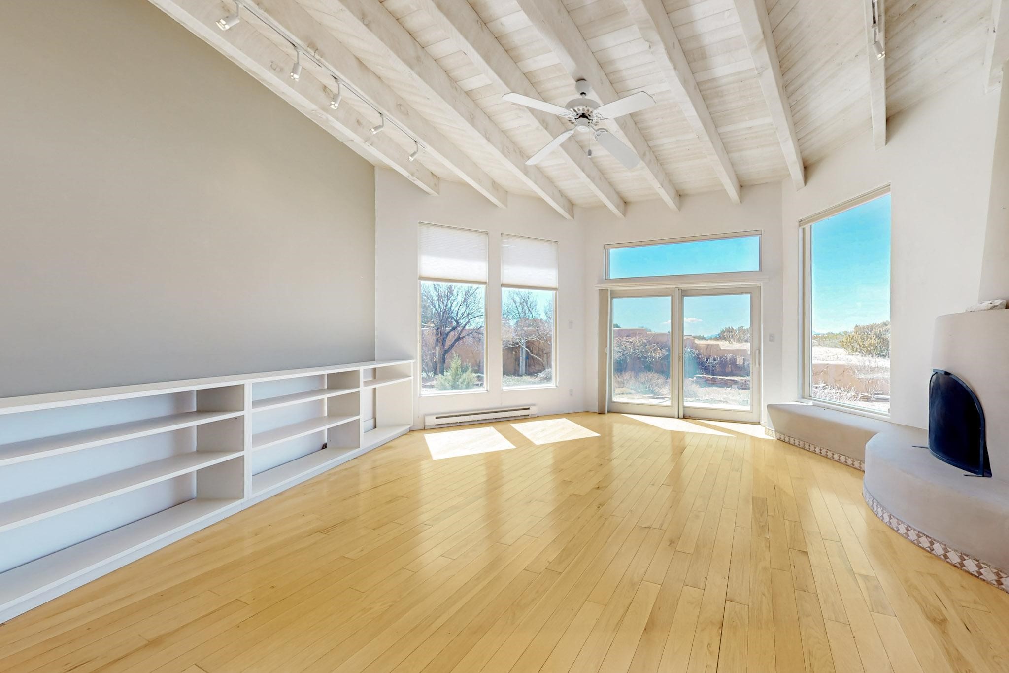Classic popular design created by architect Rad Acton and built by one of Santa Fe's premier builders Kim Dressel in 1989. This home and garden is waiting to be loved again. Contemporary pueblo design with Santa Fe detailing throughout. Passive solar and electric baseboard heating, hickory wood floors, carved wood beams and a traditional masonry kiva fireplace. Brand new Stucco, upgraded roof with a 2 year warranty, brand new skylights, maintained windows and a new driveway all in 2024. A studio / play room separates the kitchen from the oversized 2 car garage. There are wonderful walled outside garden spaces ready for the avid gardener with sunset and mountain vistas. Needs a little loving uplift to bring it back. This home is in an ideal location for access to the Rail Trail, all of Eldorado Amenities, 2 local shopping centers, library, schools, senior center and parks. Only minutes into Santa Fe
