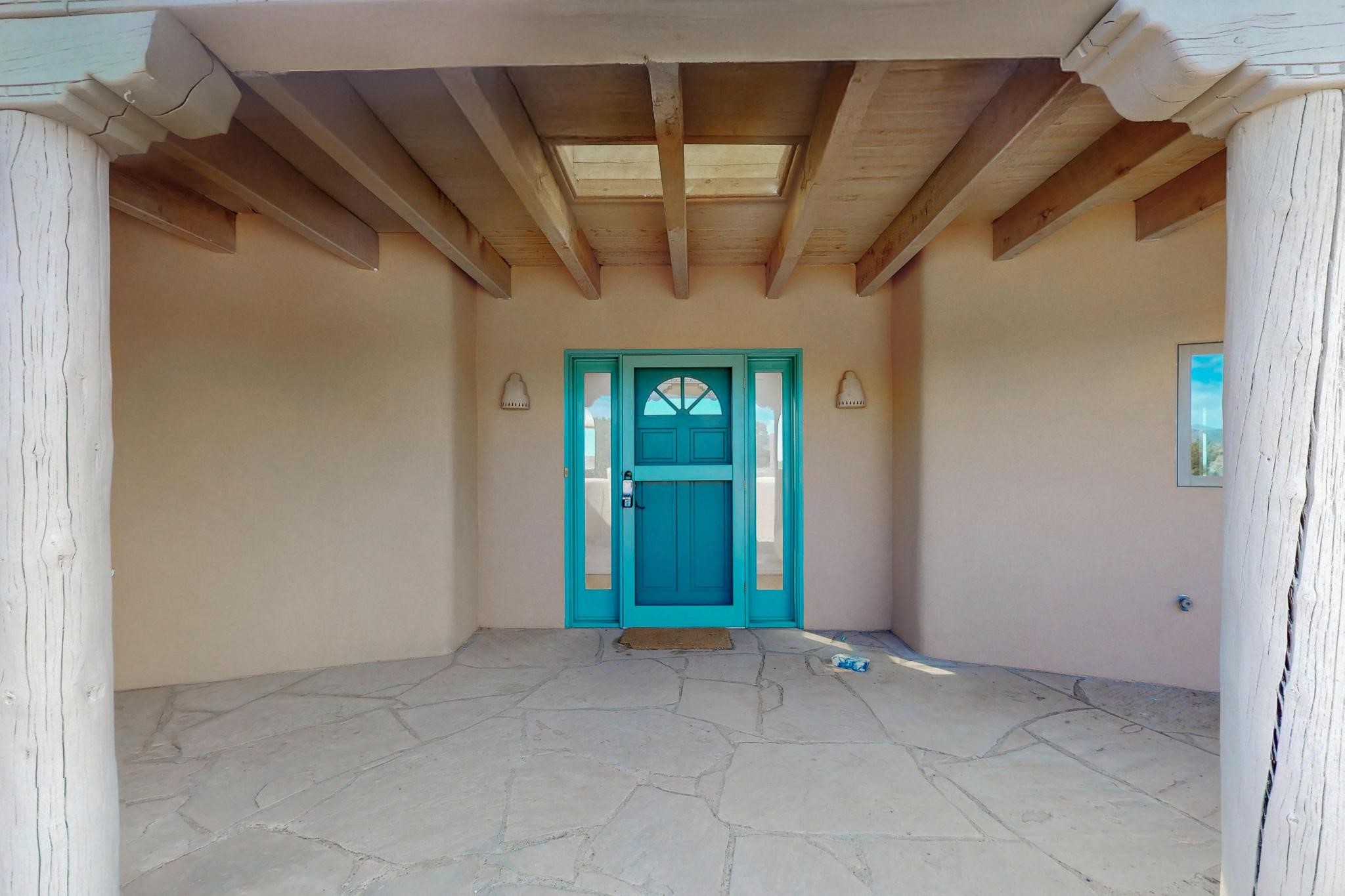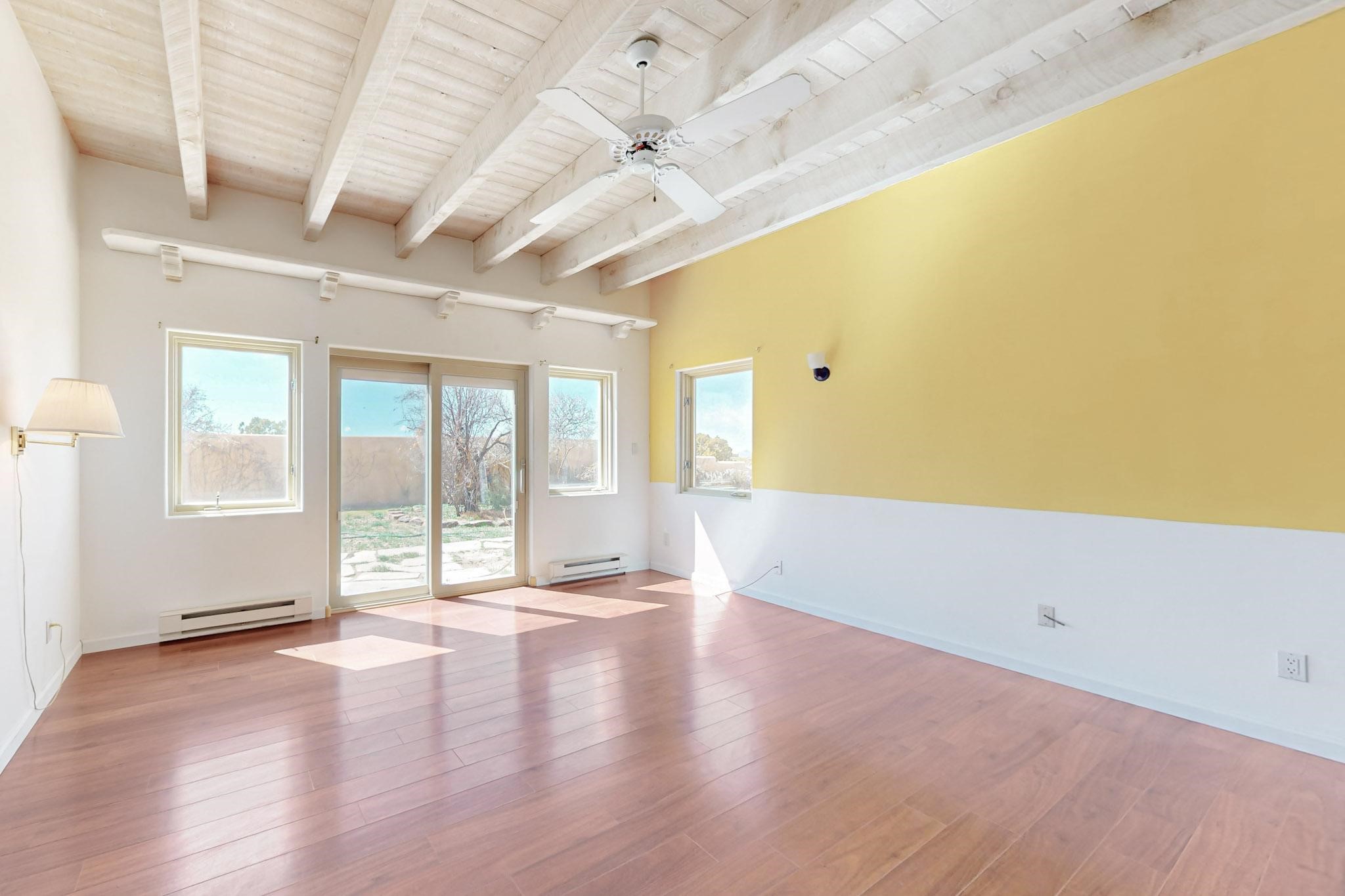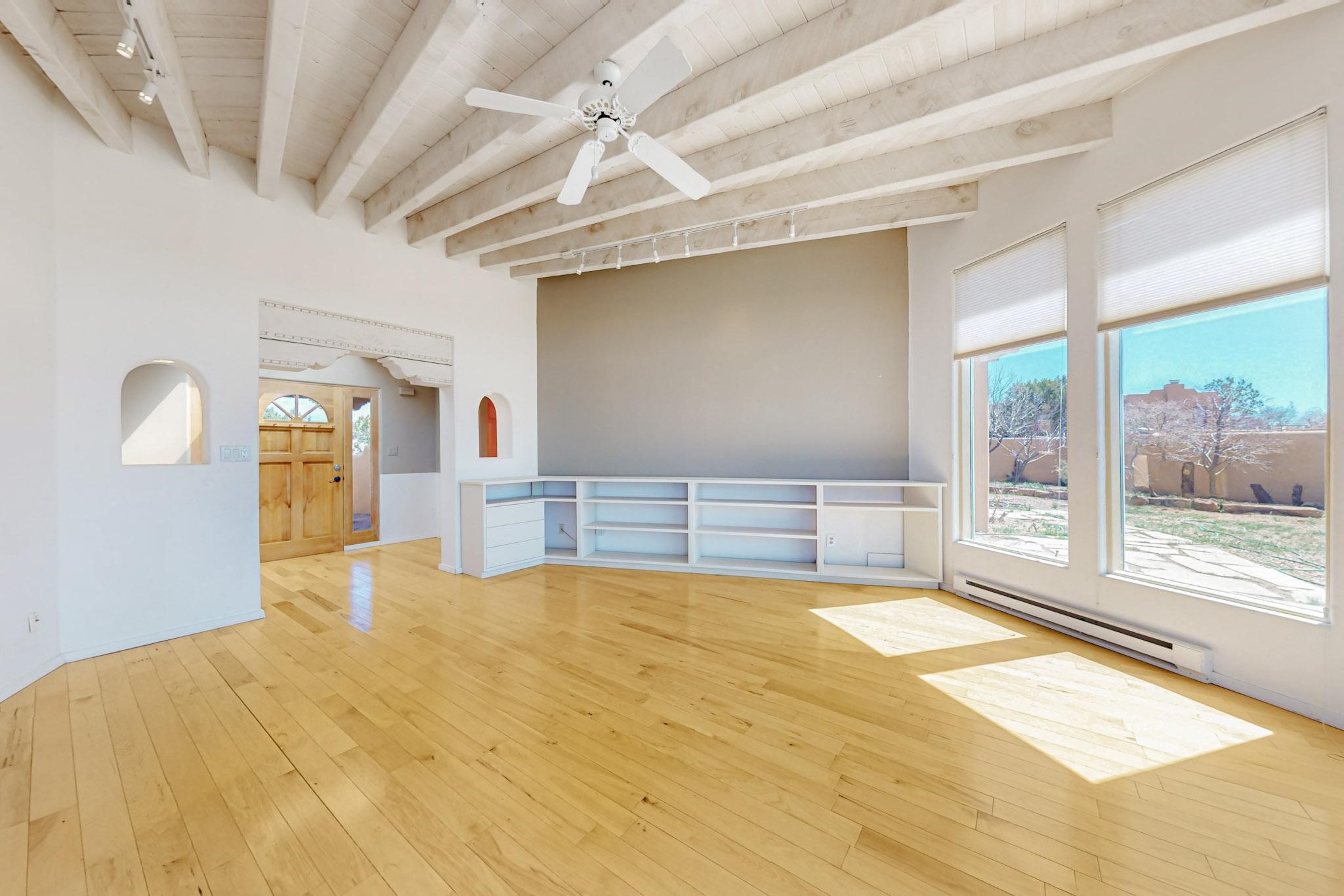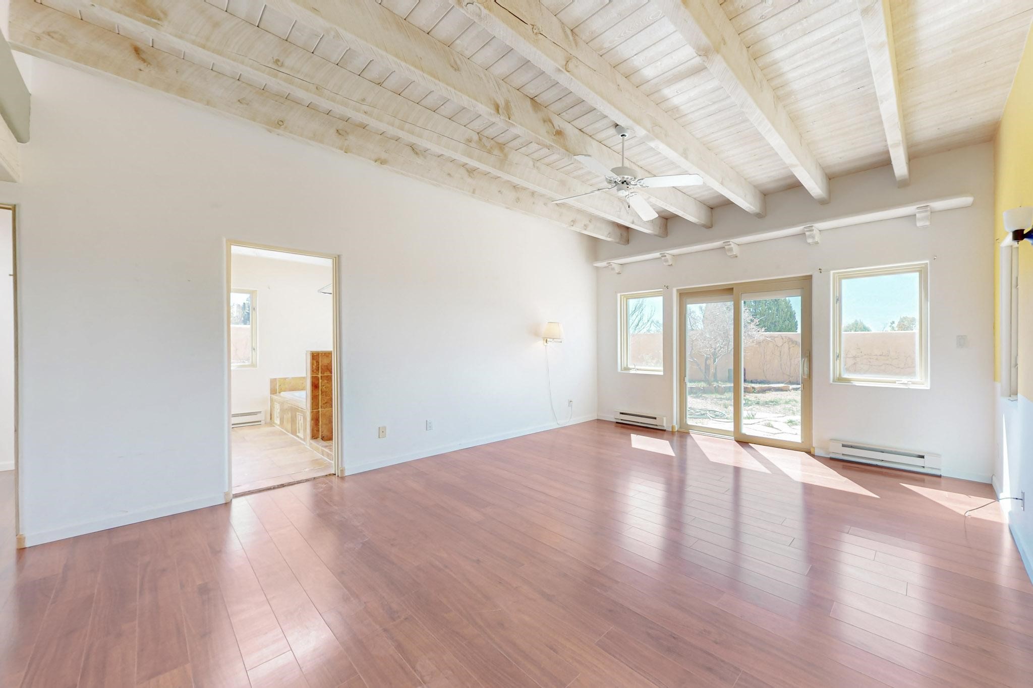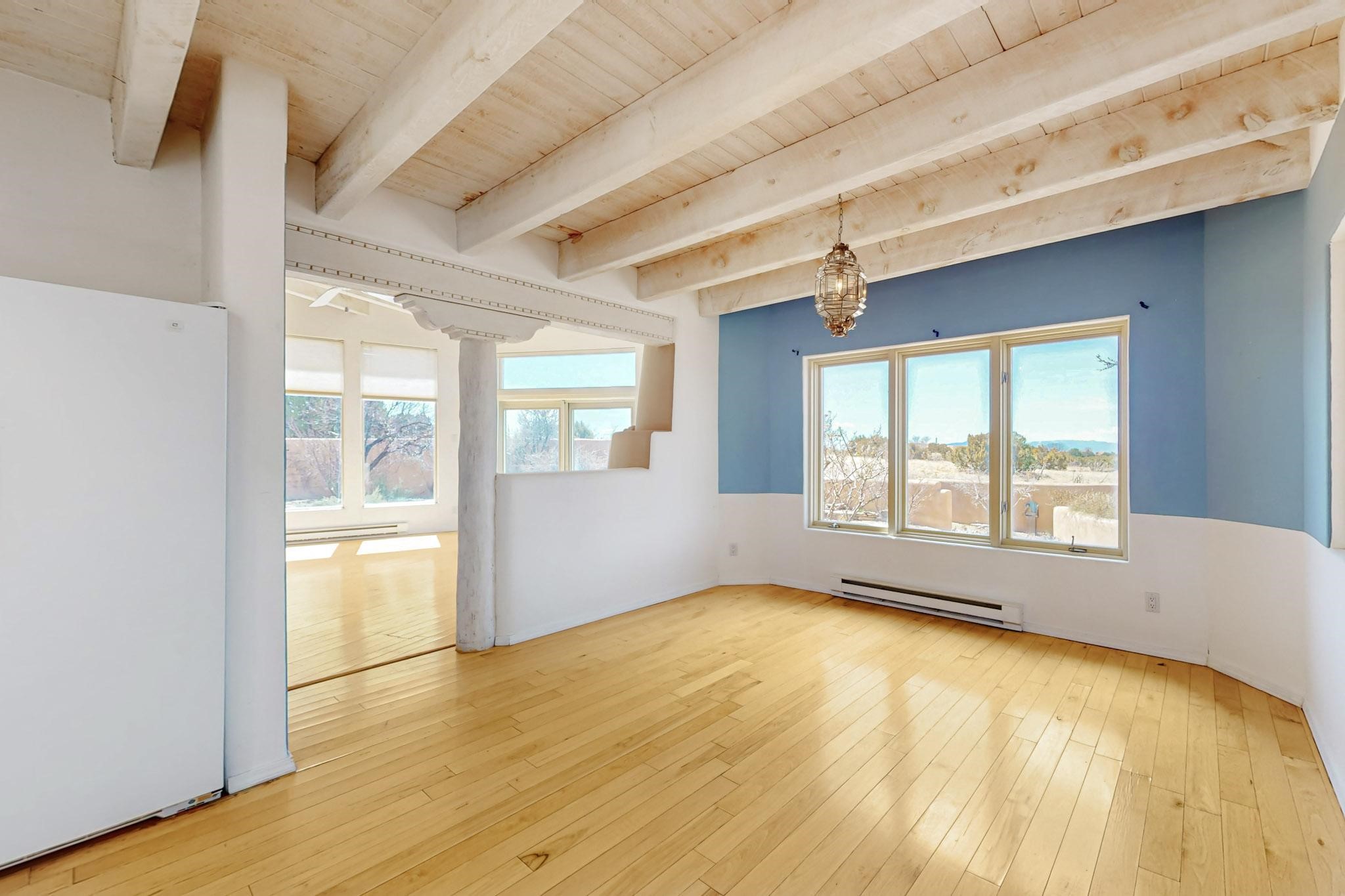 Classic popular design created by architect Rad Acton and built by one of Santa Fe's premier builders Kim Dressel in 1989. This home and garden is waiting to be loved again. Contemporary pueblo design with Santa Fe detailing throughout. Passive solar and electric baseboard heating, hickory wood floors, carved wood beams and a traditional masonry kiva fireplace. Brand new Stucco, upgraded roof with a 2 year warranty, brand new skylights, maintained windows and a new driveway all in 2024. A studio / play room separates the kitchen from the oversized 2 car garage. There are wonderful walled outside garden spaces ready for the avid gardener with sunset and mountain vistas. Needs a little loving uplift to bring it back. This home is in an ideal location for access to the Rail Trail, all of Eldorado Amenities, 2 local shopping centers, library, schools, senior center and parks. Only minutes into Santa Fe