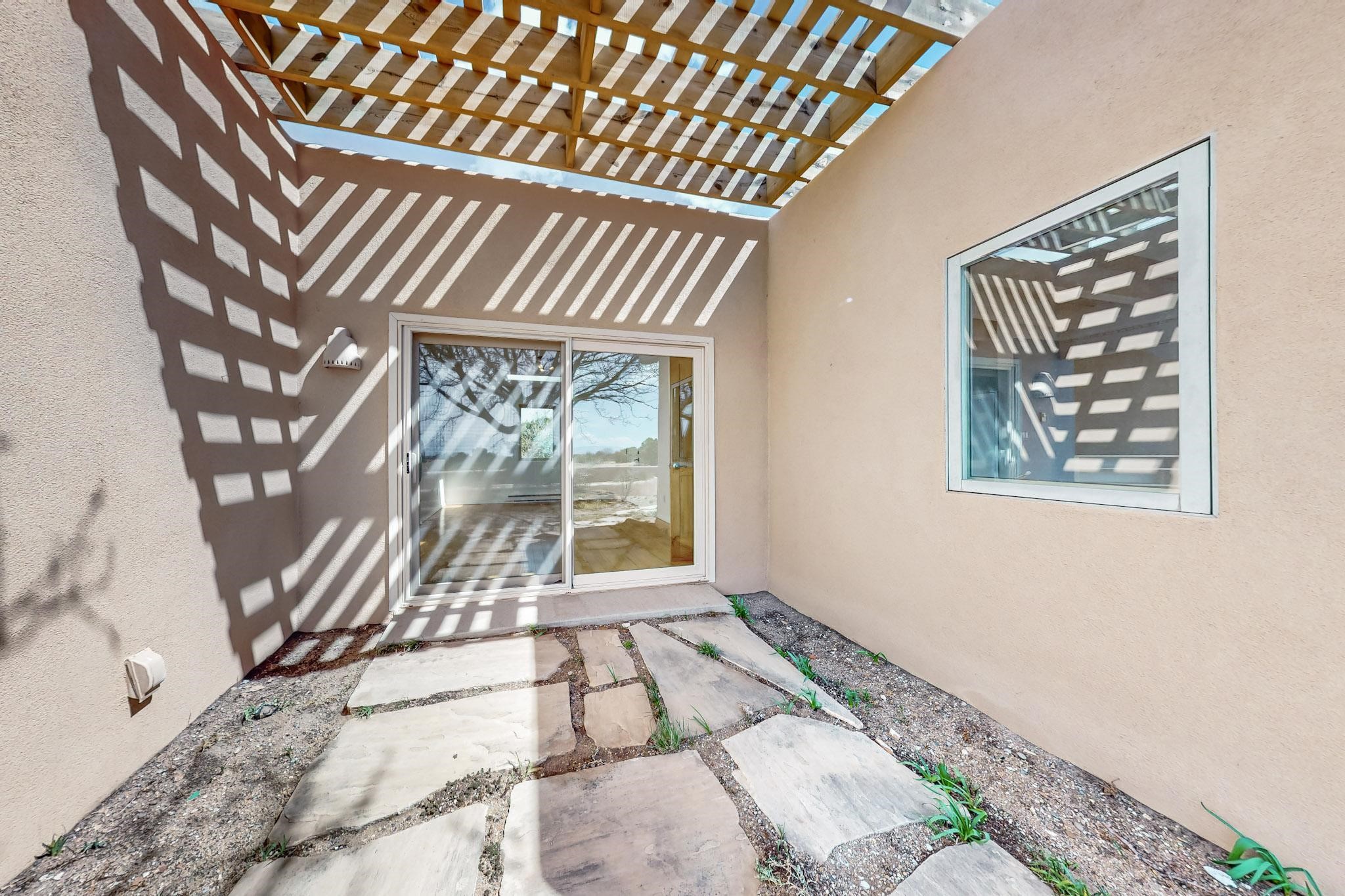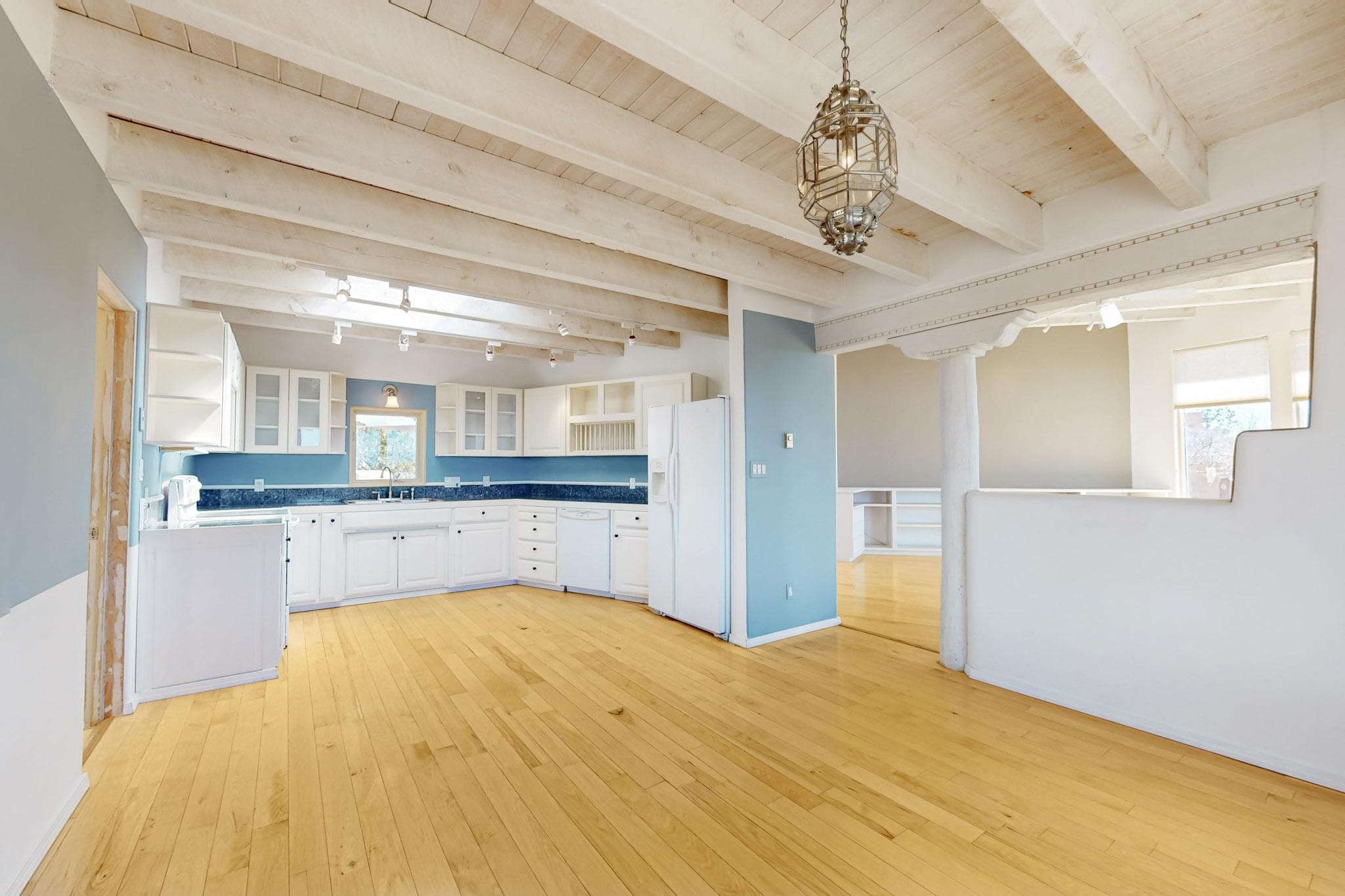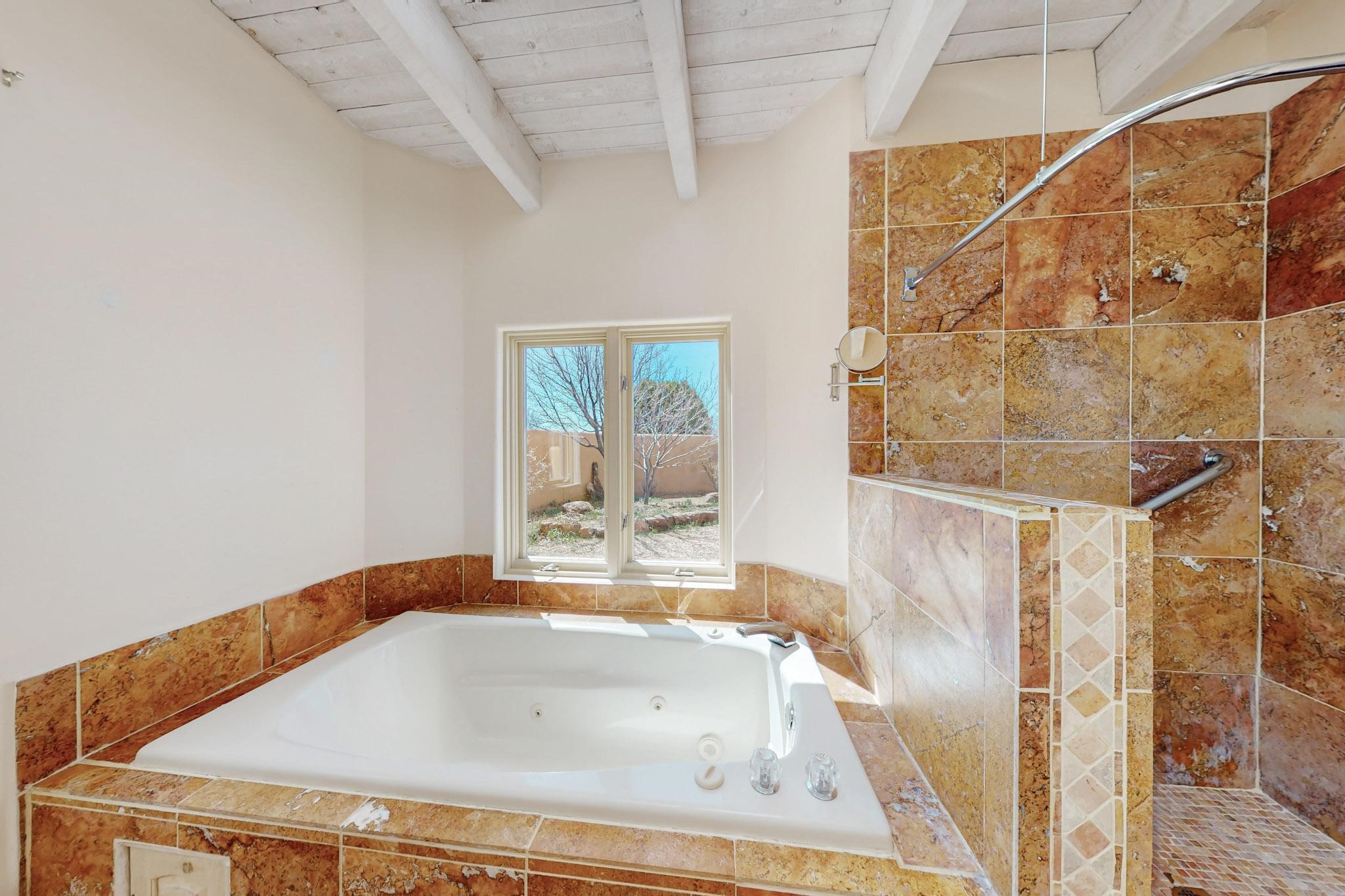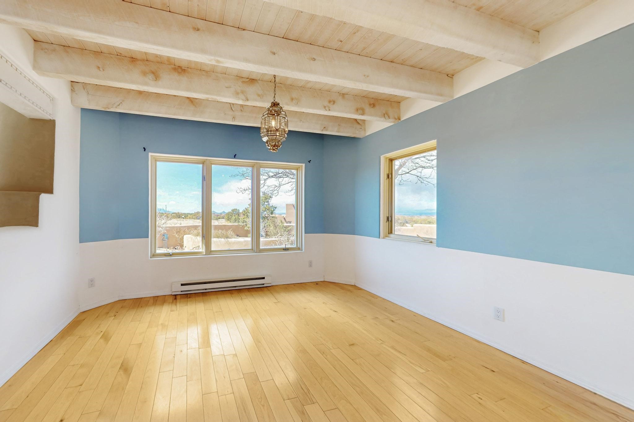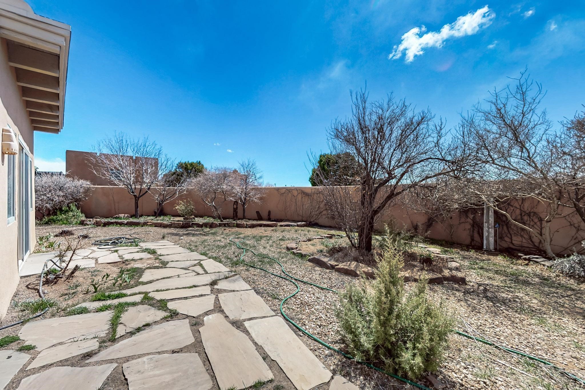 Classic popular design created by architect Rad Acton and built by one of Santa Fe's premier builders Kim Dressel in 1989. This home and garden is waiting to be loved again. Contemporary pueblo design with Santa Fe detailing throughout. Passive solar and electric baseboard heating, hickory wood floors, carved wood beams and a traditional masonry kiva fireplace. Brand new Stucco, upgraded roof with a 2 year warranty, brand new skylights, maintained windows and a new driveway all in 2024. A studio / play room separates the kitchen from the oversized 2 car garage. There are wonderful walled outside garden spaces ready for the avid gardener with sunset and mountain vistas. Needs a little loving uplift to bring it back. This home is in an ideal location for access to the Rail Trail, all of Eldorado Amenities, 2 local shopping centers, library, schools, senior center and parks. Only minutes into Santa Fe