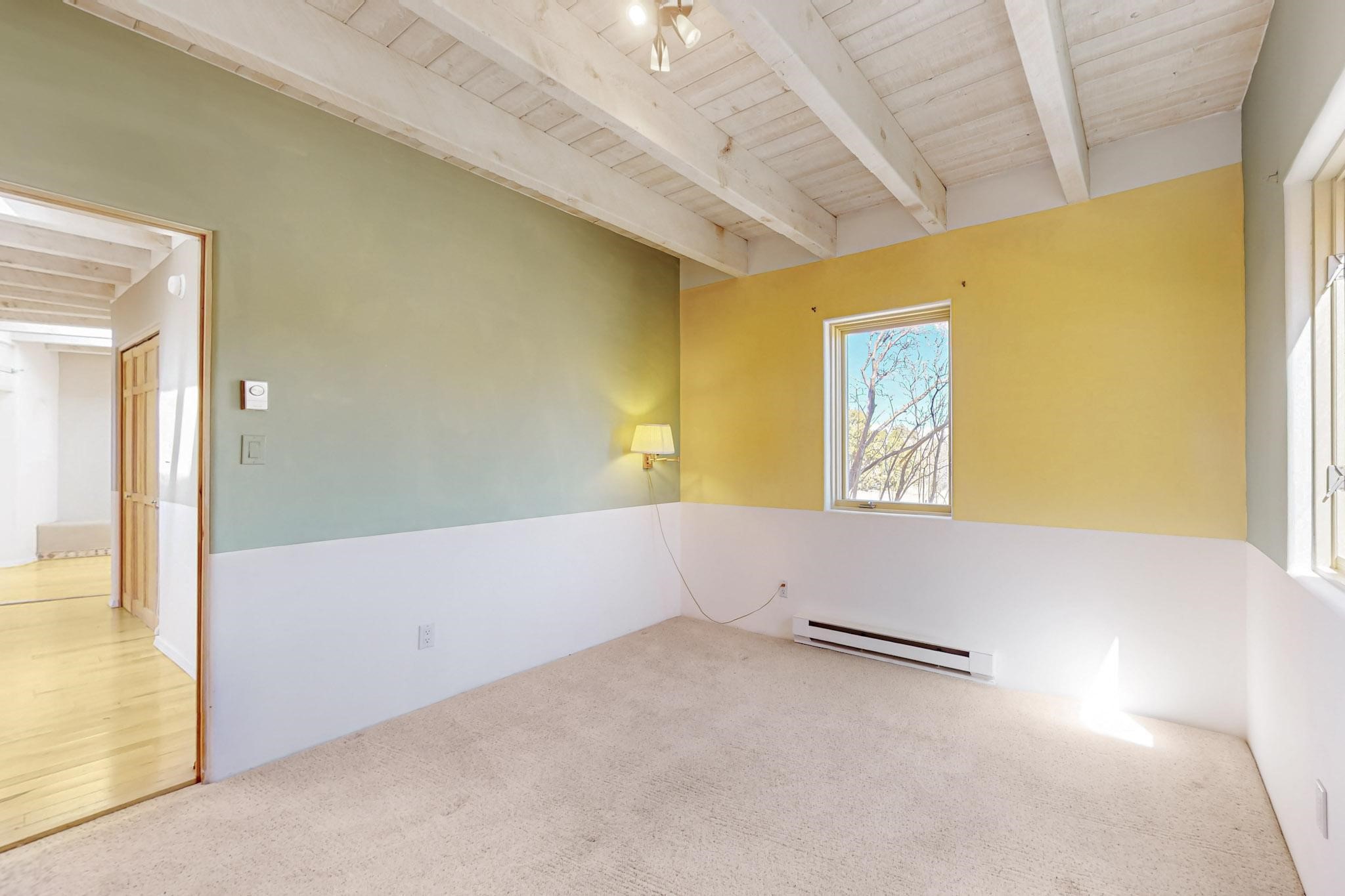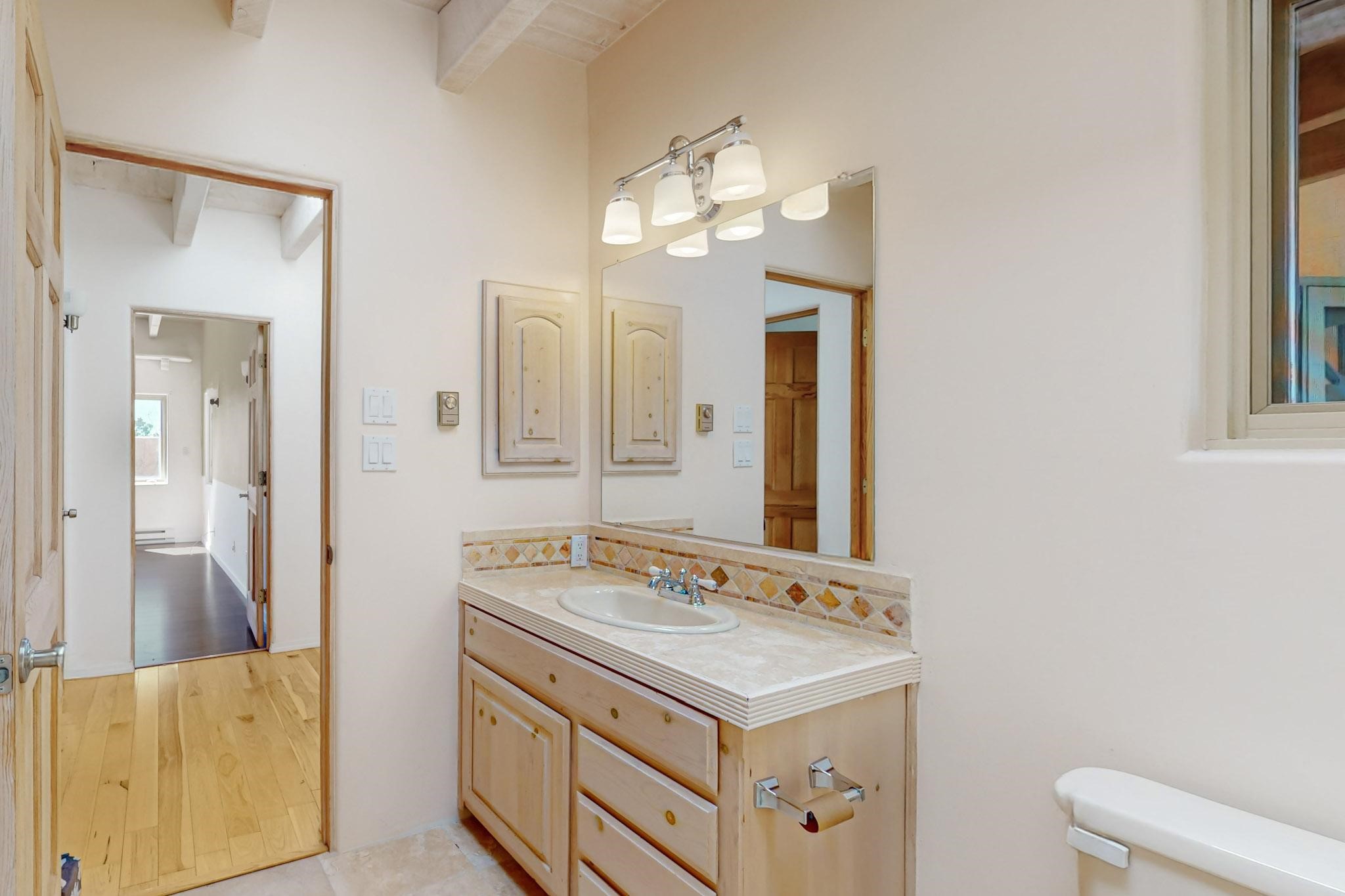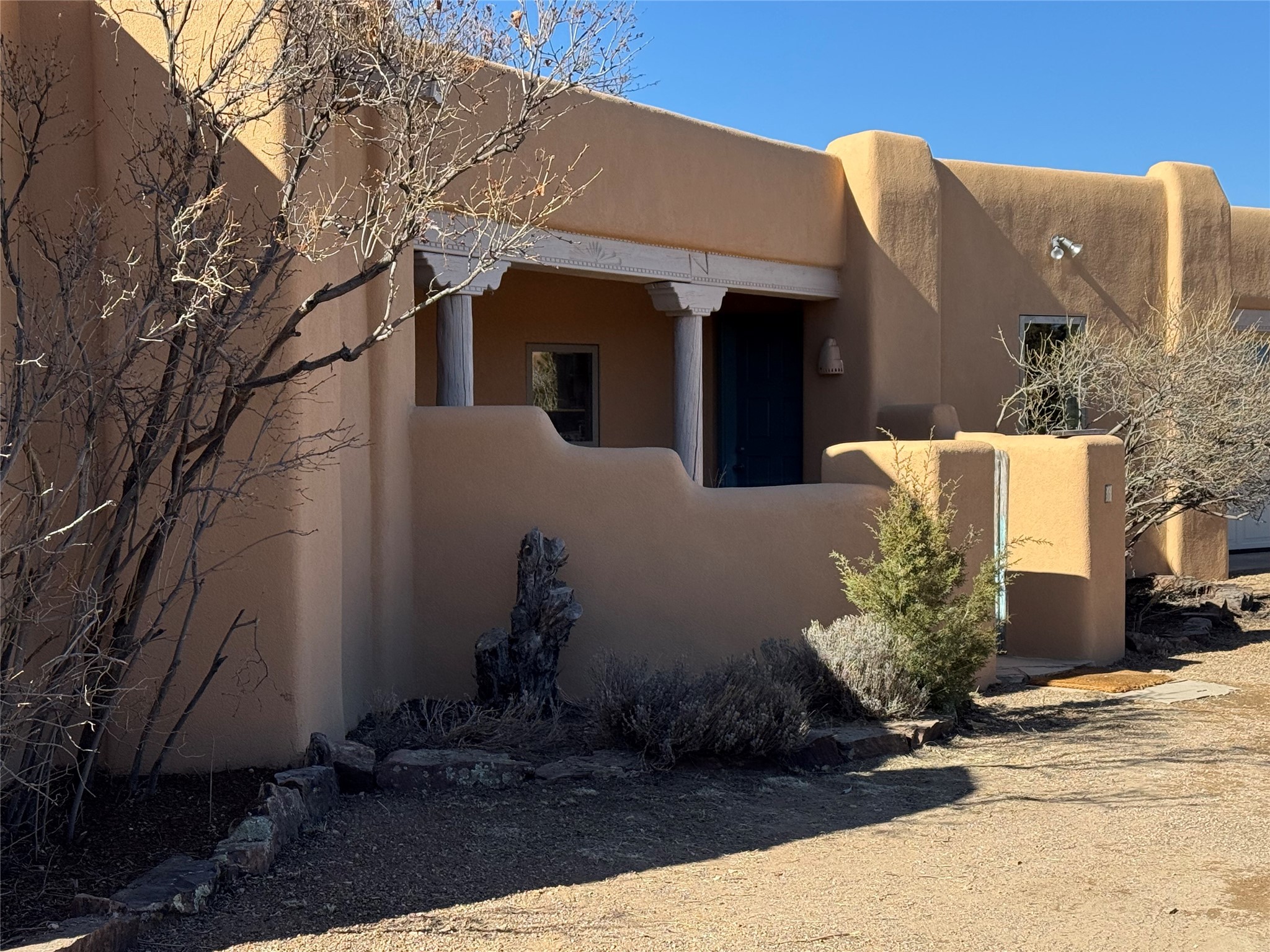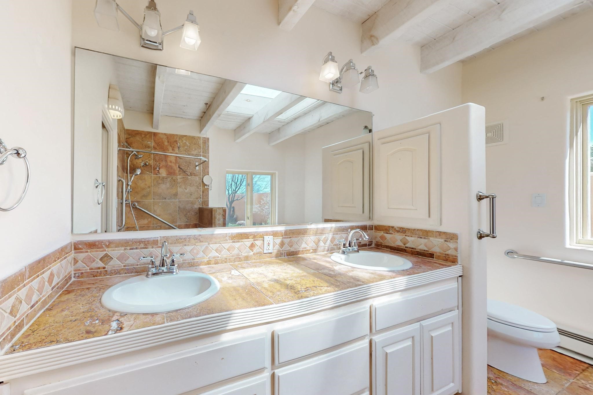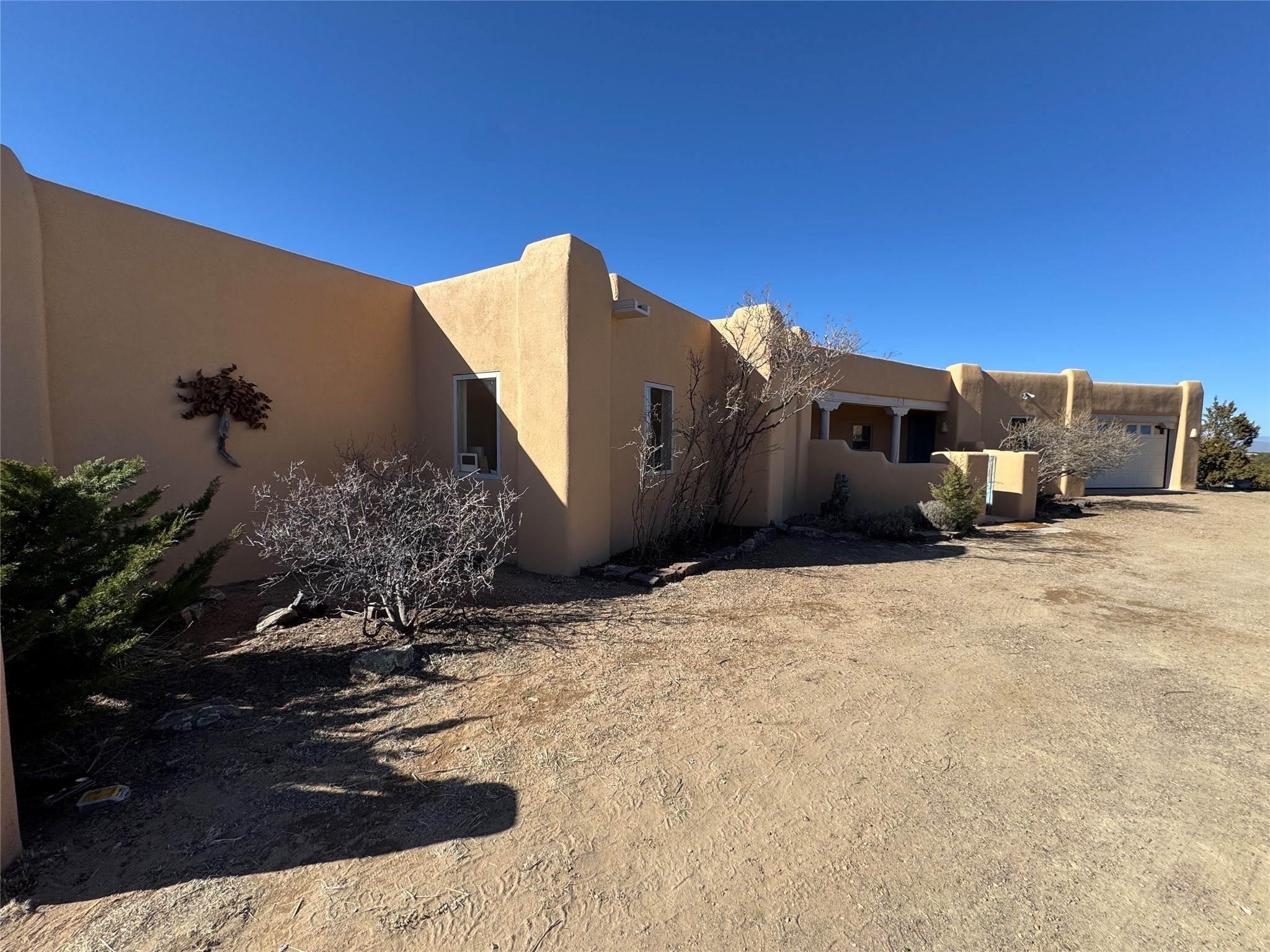 Classic popular design created by architect Rad Acton and built by one of Santa Fe's premier builders Kim Dressel in 1989. This home and garden is waiting to be loved again. Contemporary pueblo design with Santa Fe detailing throughout. Passive solar and electric baseboard heating, hickory wood floors, carved wood beams and a traditional masonry kiva fireplace. Brand new Stucco, upgraded roof with a 2 year warranty, brand new skylights, maintained windows and a new driveway all in 2024. A studio / play room separates the kitchen from the oversized 2 car garage. There are wonderful walled outside garden spaces ready for the avid gardener with sunset and mountain vistas. Needs a little loving uplift to bring it back. This home is in an ideal location for access to the Rail Trail, all of Eldorado Amenities, 2 local shopping centers, library, schools, senior center and parks. Only minutes into Santa Fe