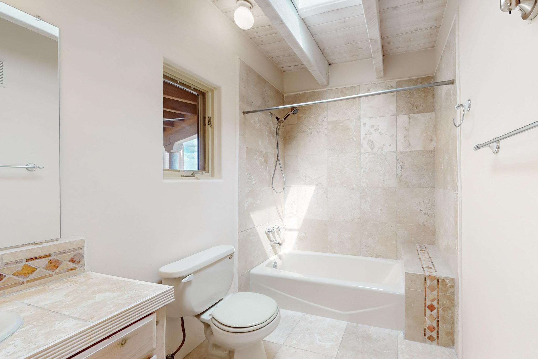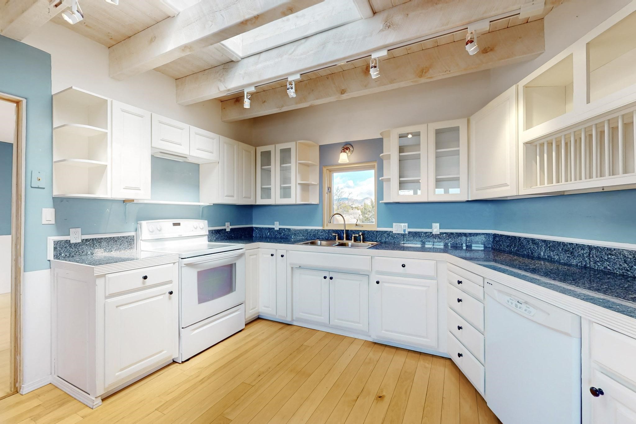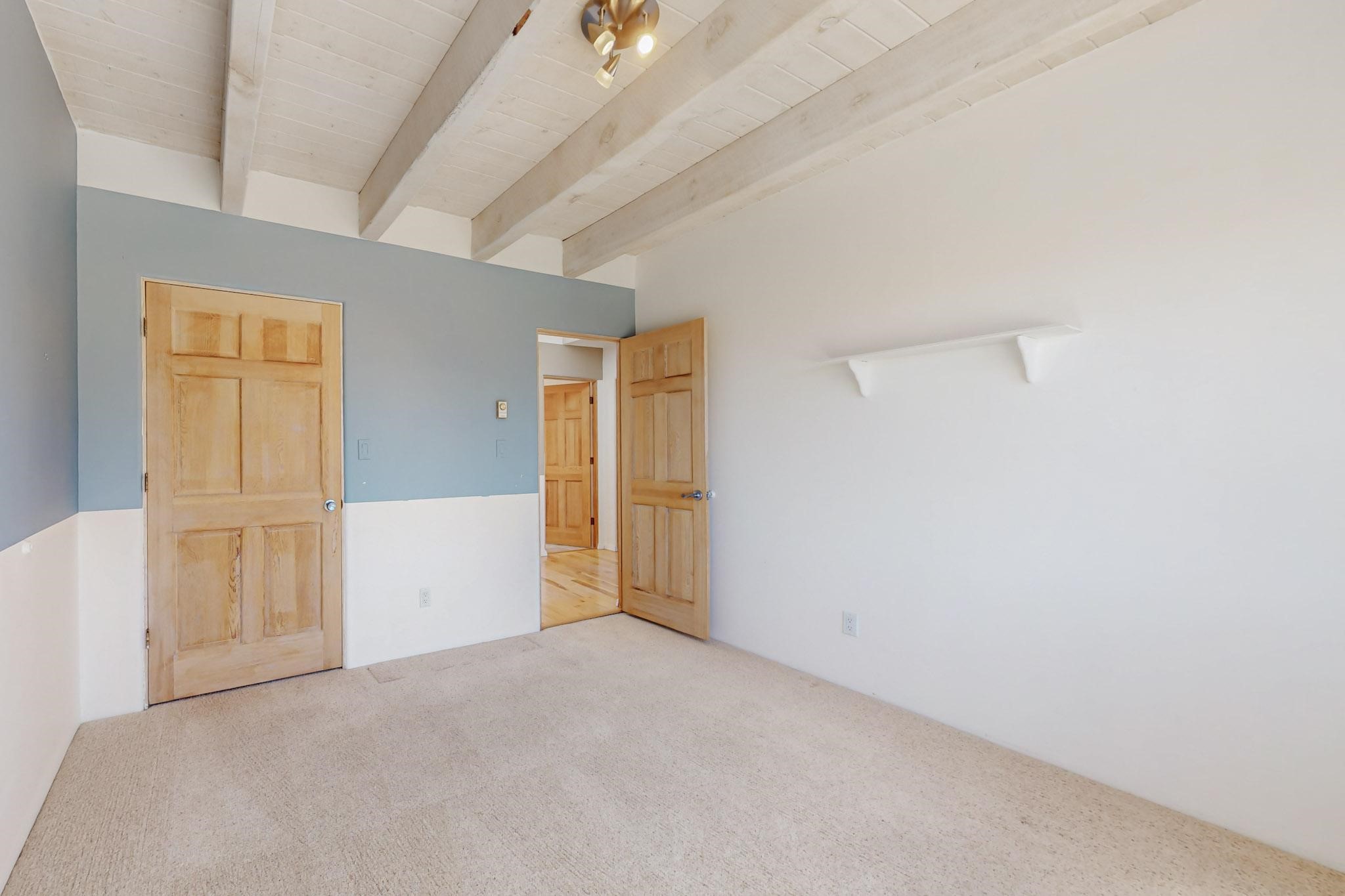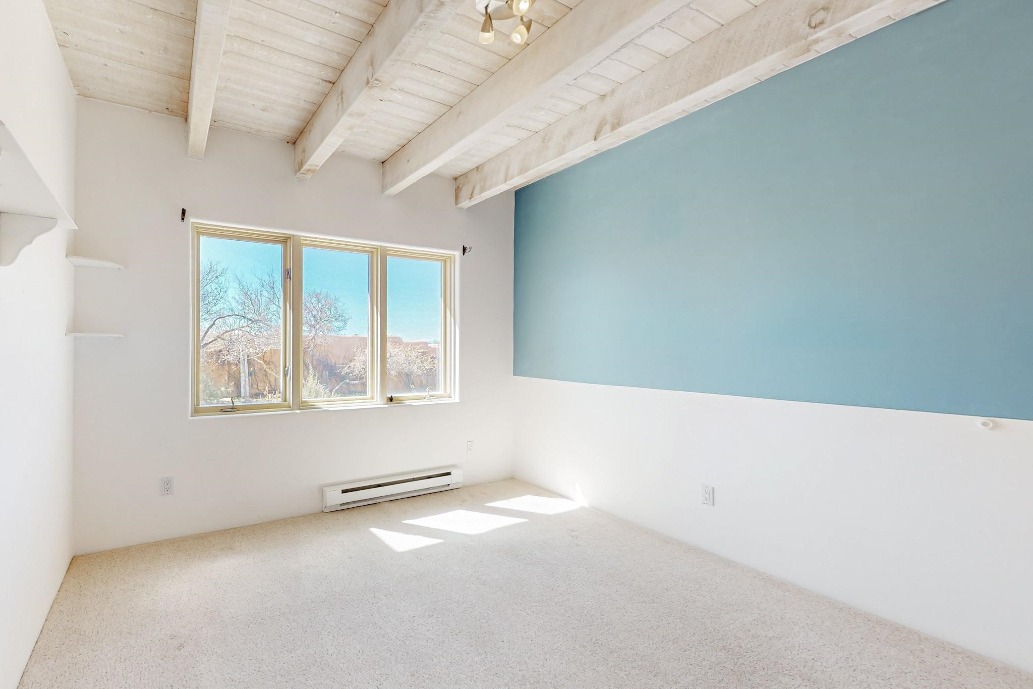 Classic popular design created by architect Rad Acton and built by one of Santa Fe's premier builders Kim Dressel in 1989. This home and garden is waiting to be loved again. Contemporary pueblo design with Santa Fe detailing throughout. Passive solar and electric baseboard heating, hickory wood floors, carved wood beams and a traditional masonry kiva fireplace. Brand new Stucco, upgraded roof with a 2 year warranty, brand new skylights, maintained windows and a new driveway all in 2024. A studio / play room separates the kitchen from the oversized 2 car garage. There are wonderful walled outside garden spaces ready for the avid gardener with sunset and mountain vistas. Needs a little loving uplift to bring it back. This home is in an ideal location for access to the Rail Trail, all of Eldorado Amenities, 2 local shopping centers, library, schools, senior center and parks. Only minutes into Santa Fe