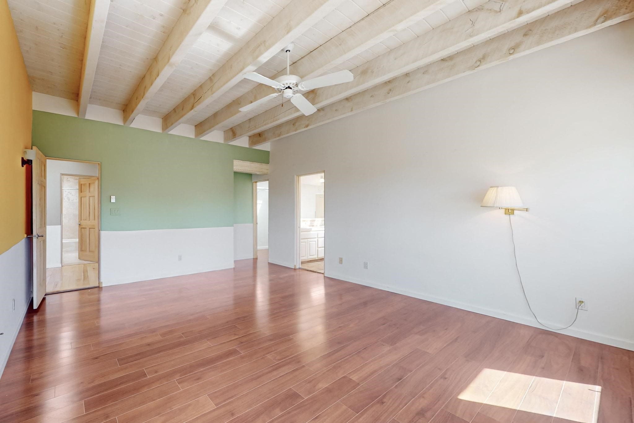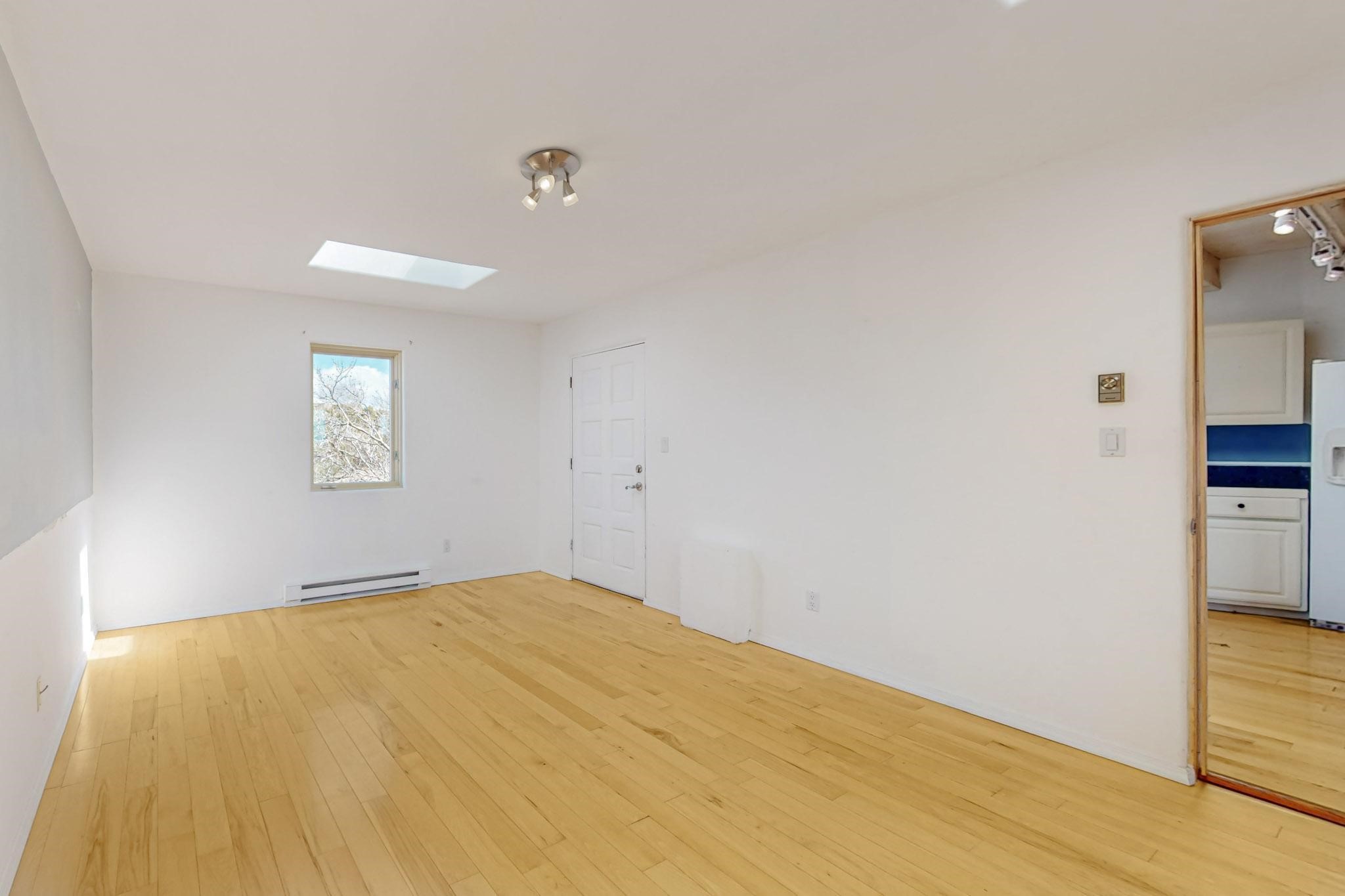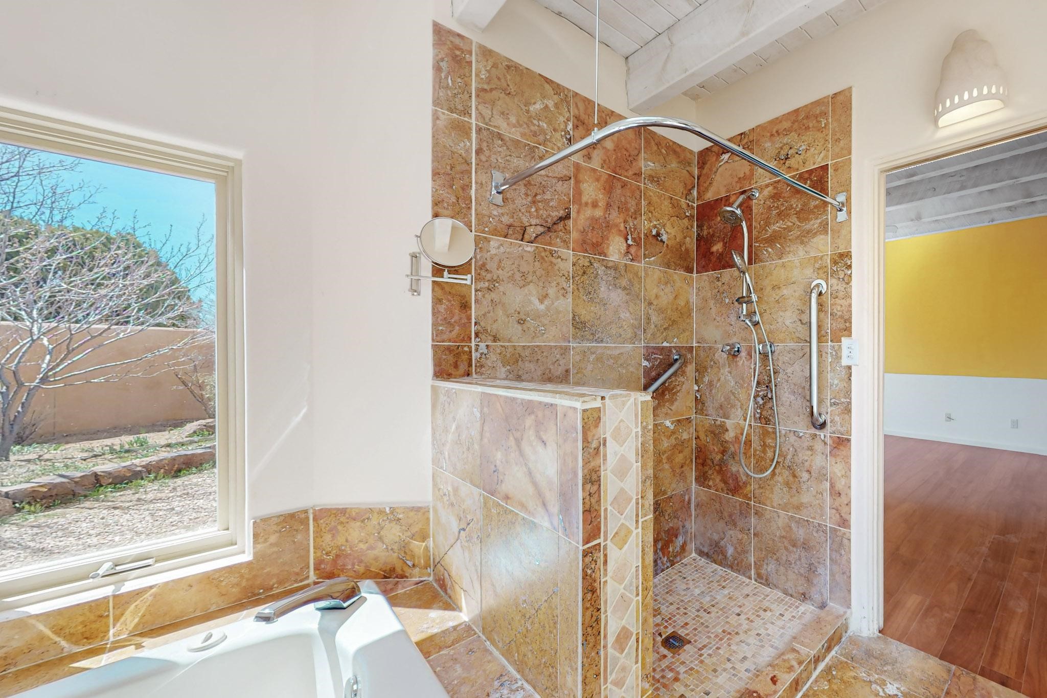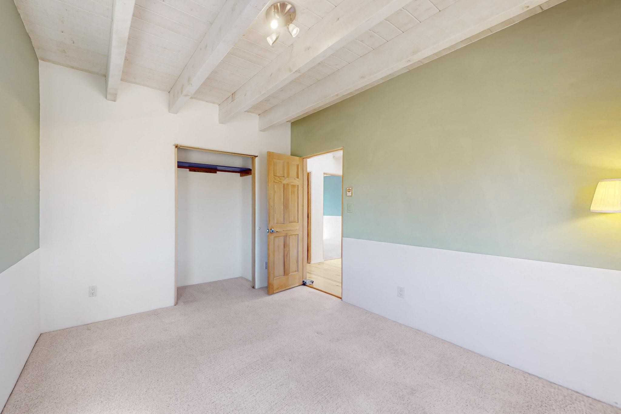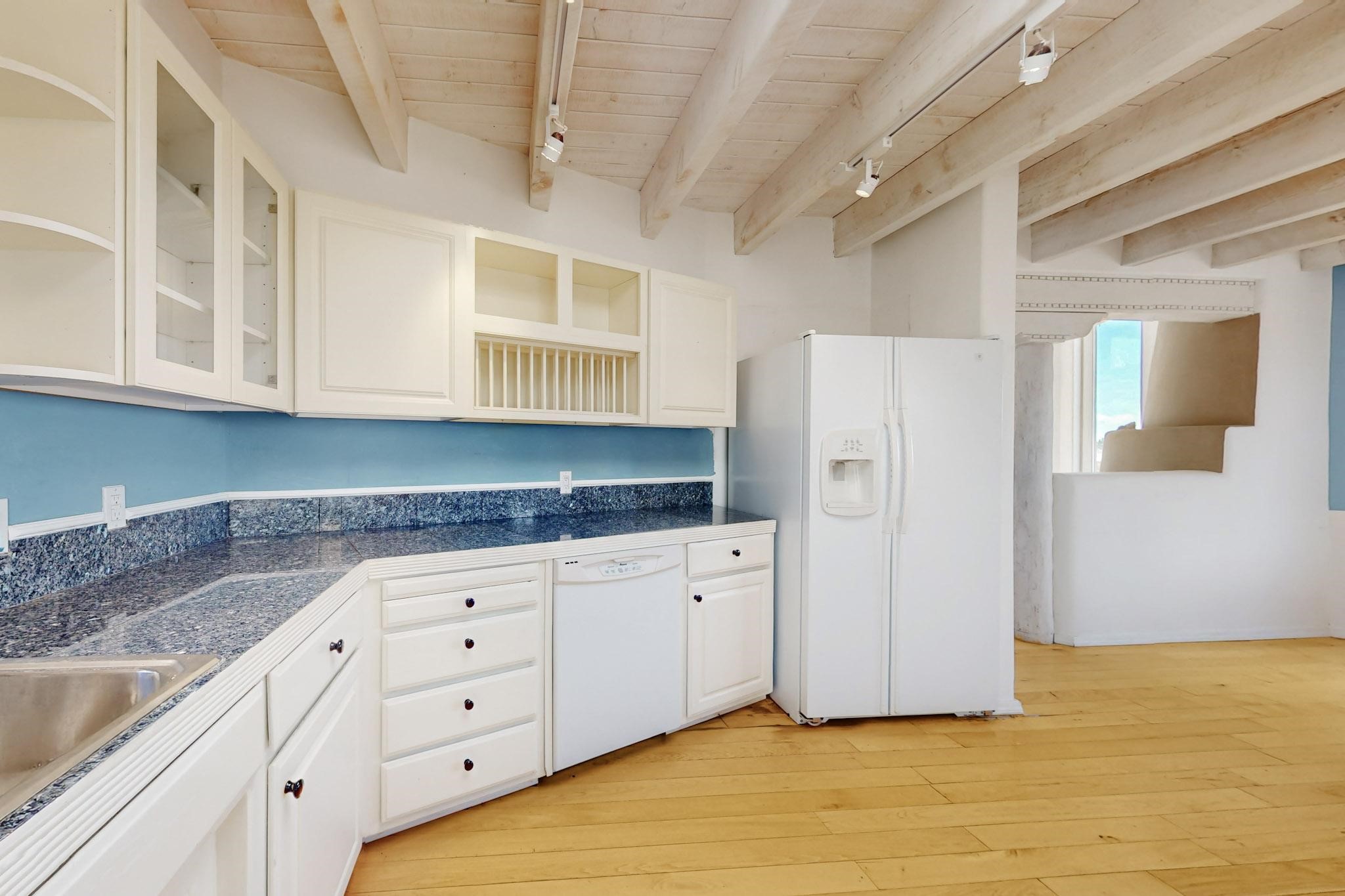 Classic popular design created by architect Rad Acton and built by one of Santa Fe's premier builders Kim Dressel in 1989. This home and garden is waiting to be loved again. Contemporary pueblo design with Santa Fe detailing throughout. Passive solar and electric baseboard heating, hickory wood floors, carved wood beams and a traditional masonry kiva fireplace. Brand new Stucco, upgraded roof with a 2 year warranty, brand new skylights, maintained windows and a new driveway all in 2024. A studio / play room separates the kitchen from the oversized 2 car garage. There are wonderful walled outside garden spaces ready for the avid gardener with sunset and mountain vistas. Needs a little loving uplift to bring it back. This home is in an ideal location for access to the Rail Trail, all of Eldorado Amenities, 2 local shopping centers, library, schools, senior center and parks. Only minutes into Santa Fe
