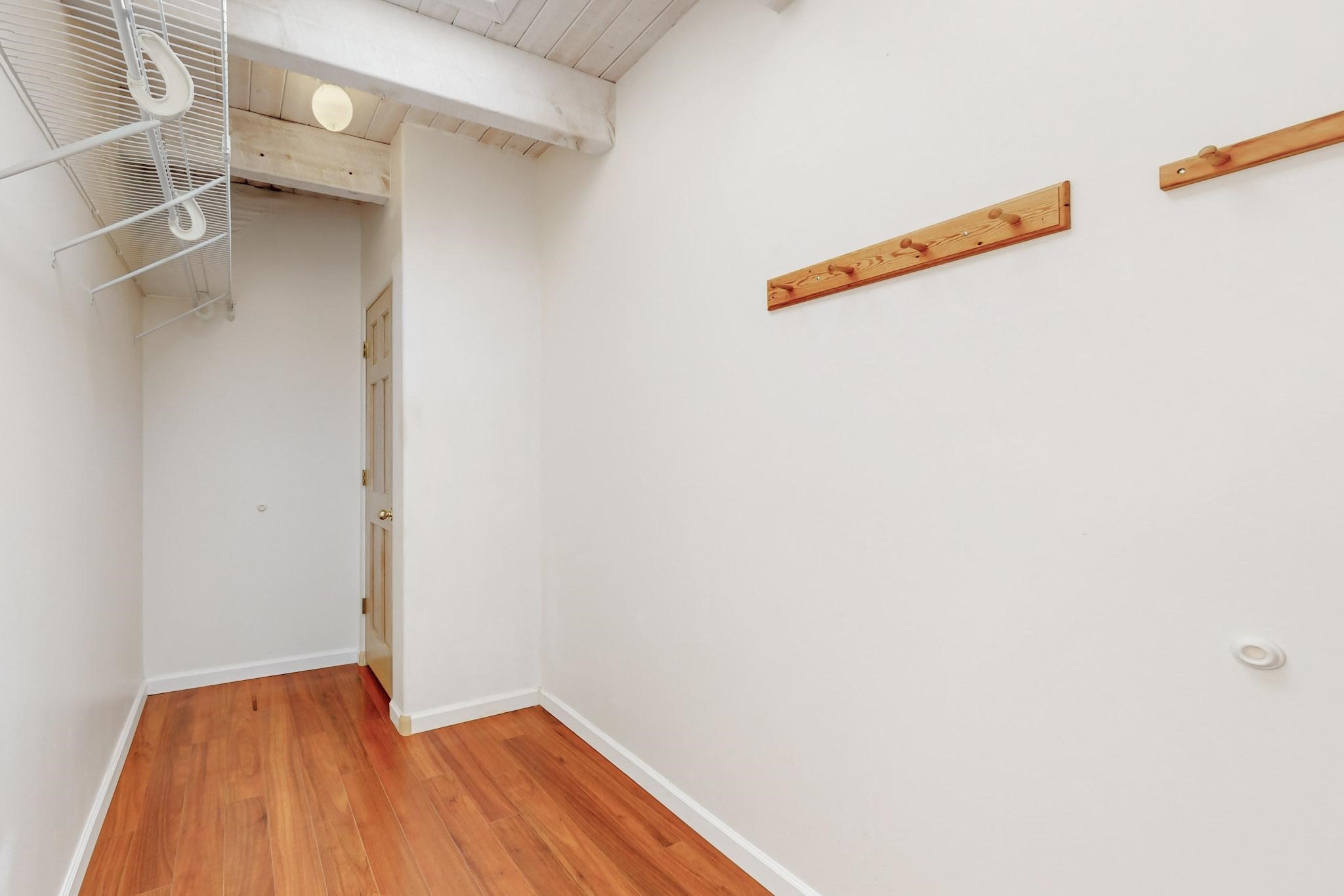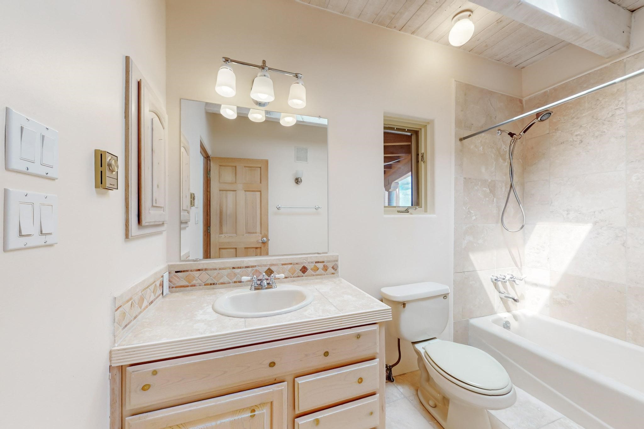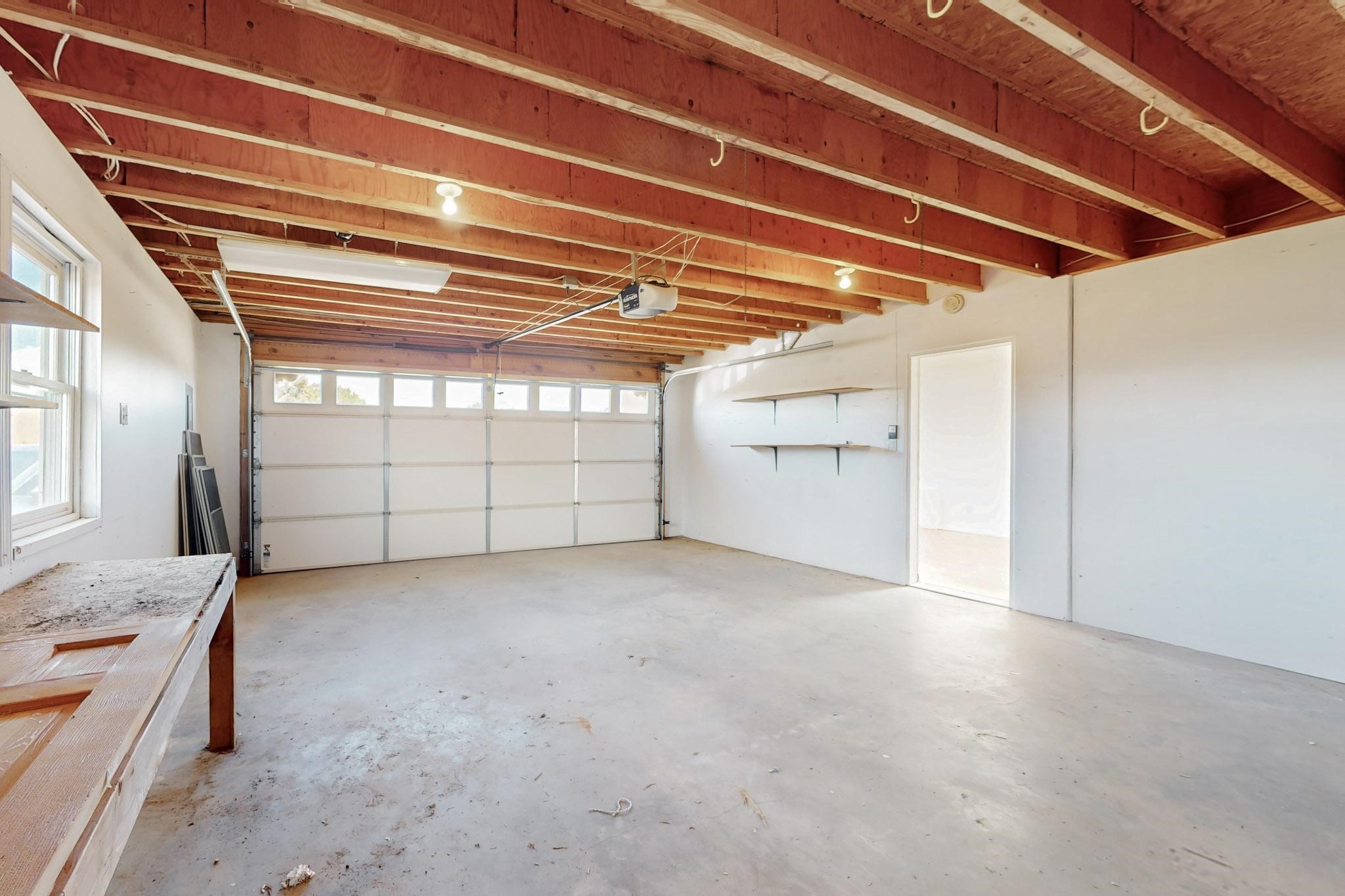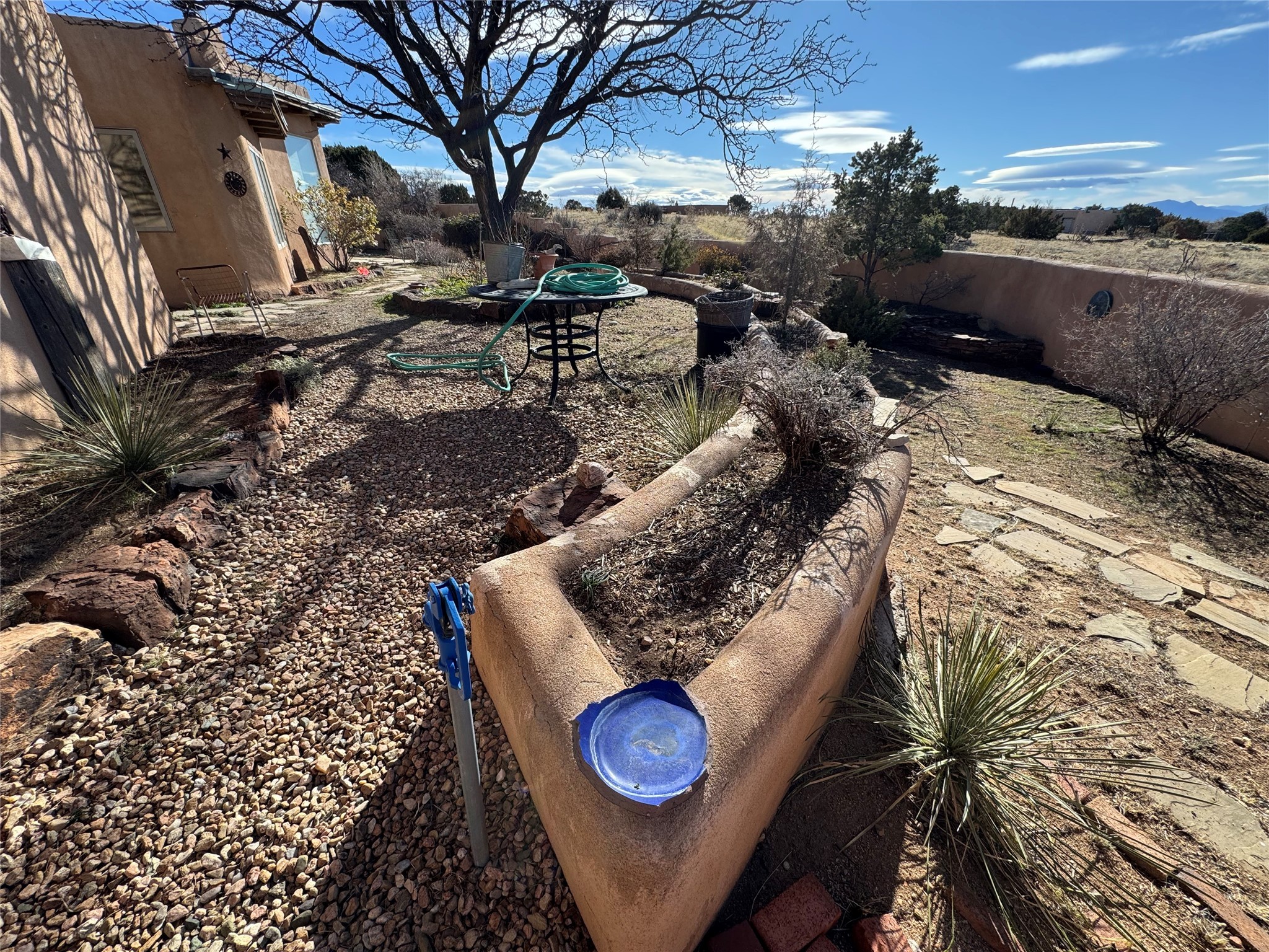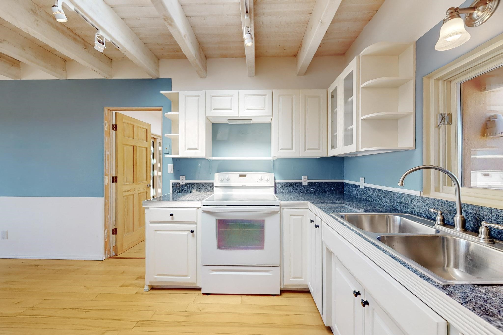 Classic popular design created by architect Rad Acton and built by one of Santa Fe's premier builders Kim Dressel in 1989. This home and garden is waiting to be loved again. Contemporary pueblo design with Santa Fe detailing throughout. Passive solar and electric baseboard heating, hickory wood floors, carved wood beams and a traditional masonry kiva fireplace. Brand new Stucco, upgraded roof with a 2 year warranty, brand new skylights, maintained windows and a new driveway all in 2024. A studio / play room separates the kitchen from the oversized 2 car garage. There are wonderful walled outside garden spaces ready for the avid gardener with sunset and mountain vistas. Needs a little loving uplift to bring it back. This home is in an ideal location for access to the Rail Trail, all of Eldorado Amenities, 2 local shopping centers, library, schools, senior center and parks. Only minutes into Santa Fe