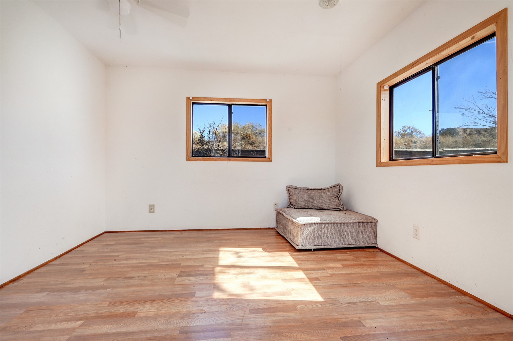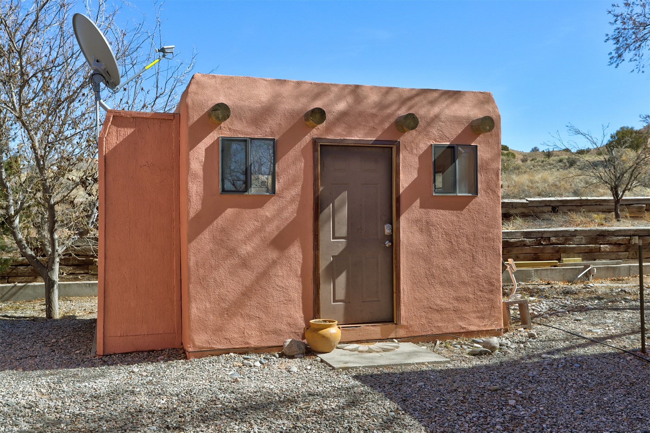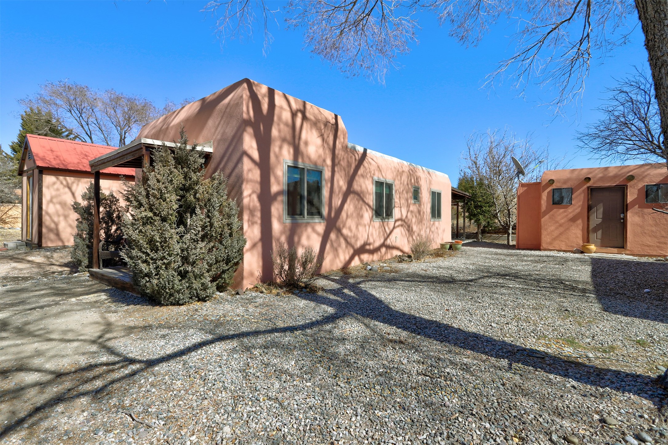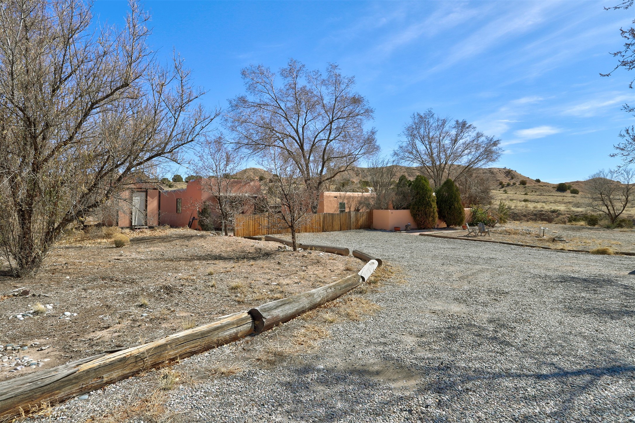 This charming, well-maintained, bright and airy Pueblo-style home is move-in ready and offers a unique blend of tranquility and modern upgrades. Nestled at the end of a private driveway, this 3-bedroom, 2-bath main house comes with a detached 1-bedroom, 1-bath casita, providing privacy and flexibility for guests or potential rental income. Surrounded on two sides by a 600-acre wildlife preserve, the home offers a peaceful retreat with stunning Jemez Mountain views and direct access to miles of hiking trails. Despite its serene setting, it is conveniently located just 20 miles from Santa Fe and Los Alamos.The main house has been thoughtfully updated in 2022 with a new TPO roof, elastomeric stucco painting, a new evaporative cooler, new Andersen windows with stylish new window treatments, a new soapstone wood stove for cozy winter nights, new wood laminate flooring in the living room, and newer carpeting in the bedrooms. Skylights in each bedroom enhance the natural light, creating a warm and inviting atmosphere.The detached casita, approximately 600 square feet, features high ceilings, a private patio, and a fresh modern feel. Recent updates include a new TPO roof, new windows, new wood laminate flooring, and fresh paint, making it a perfect retreat for guests, a rental, or a studio space.Between the main house and the casita, a small detached studio (approximately 120 sq. ft.) offers endless possibilities as a home office, yoga space, or artist's studio. While this unheated building with 220 electric is not included in the total square footage, it adds valuable flexible space.The enclosed courtyard is landscaped with mature trees that provide refreshing summer shade, while the low-maintenance design ensures easy upkeep. Additionally, an insulated storage shed provides extra space for tools and outdoor gear.Offering a rare combination of privacy, stunning natural surroundings, and modern updates, this peaceful oasis is the perfect place to call home.