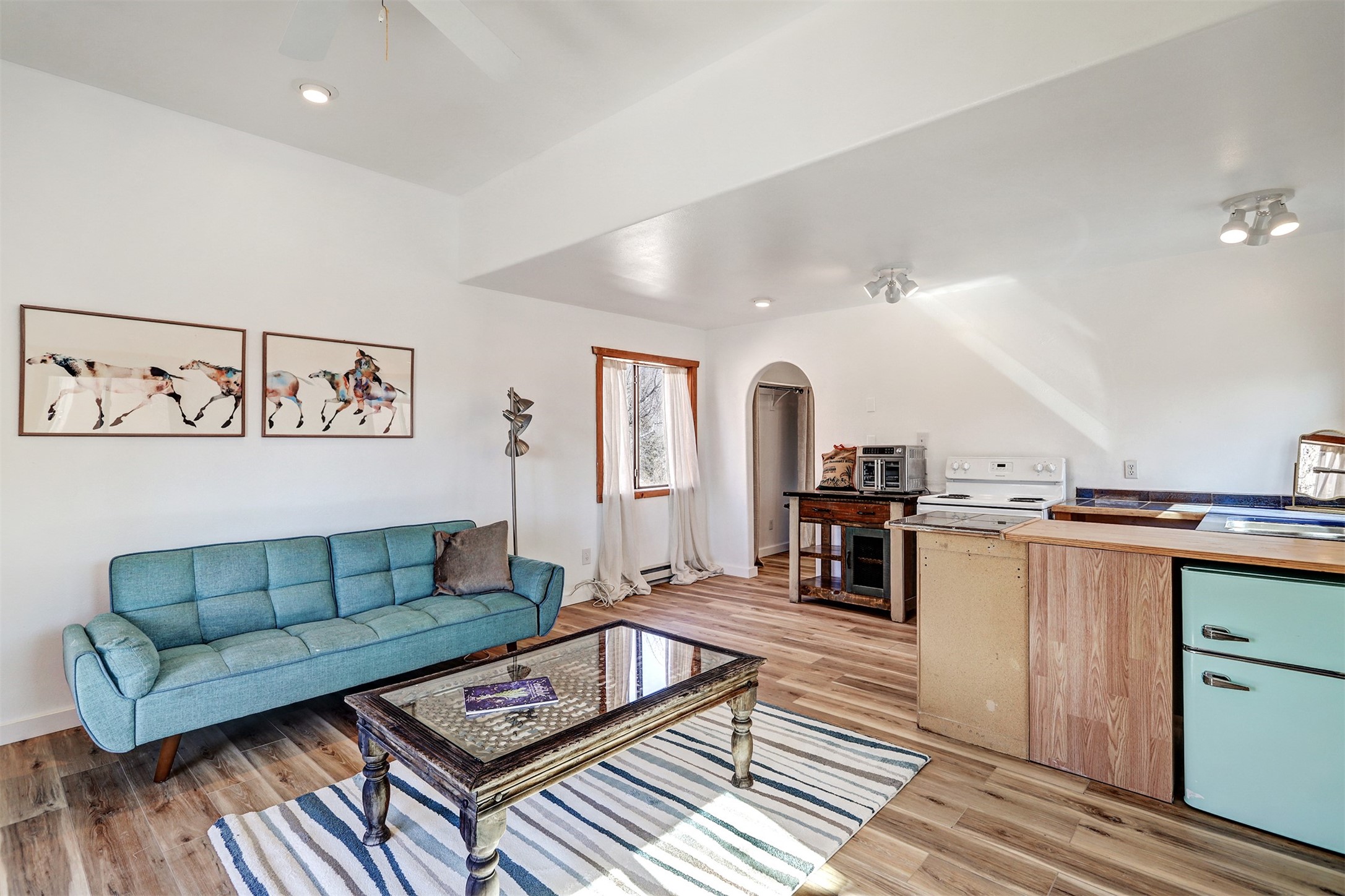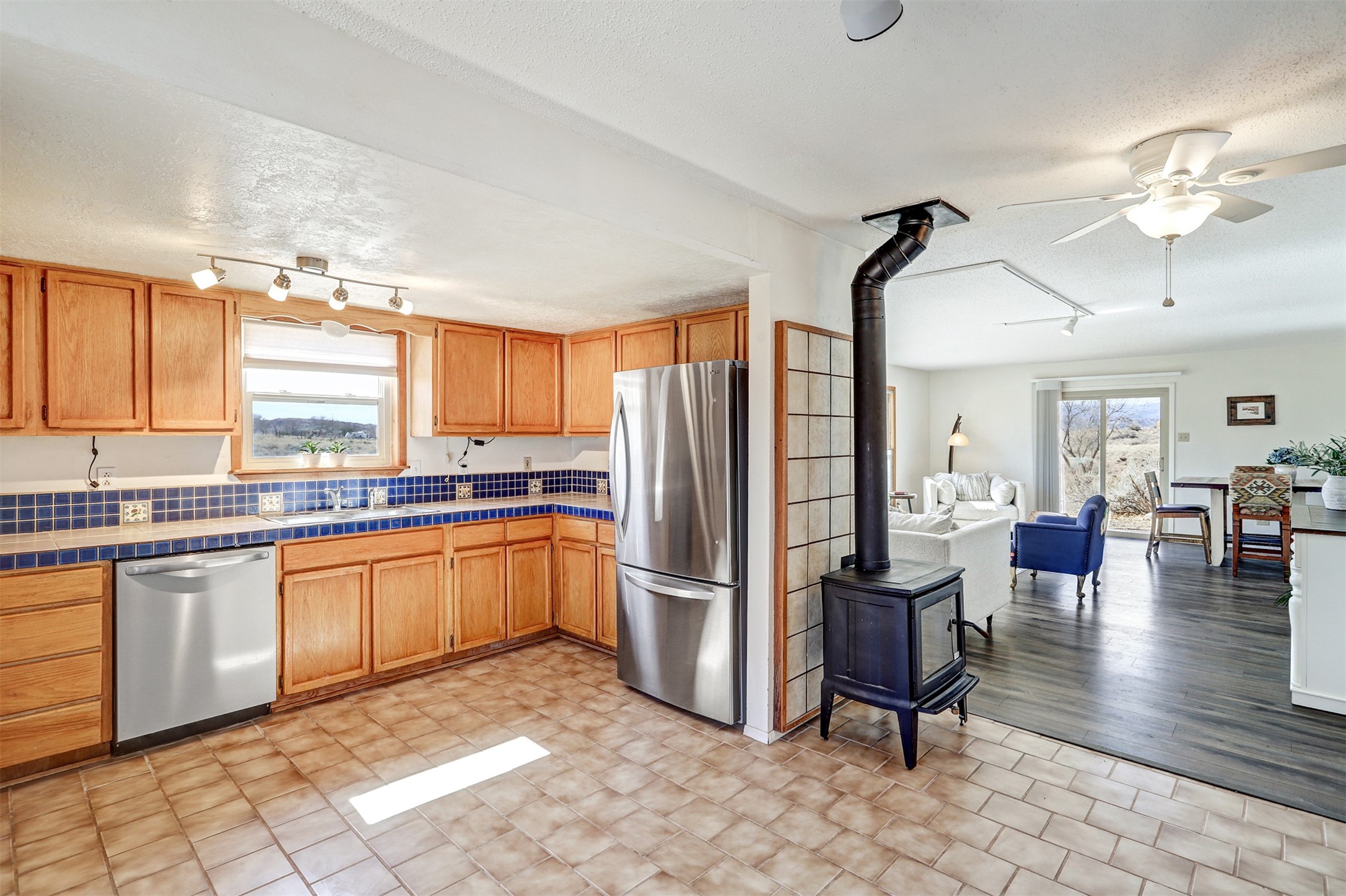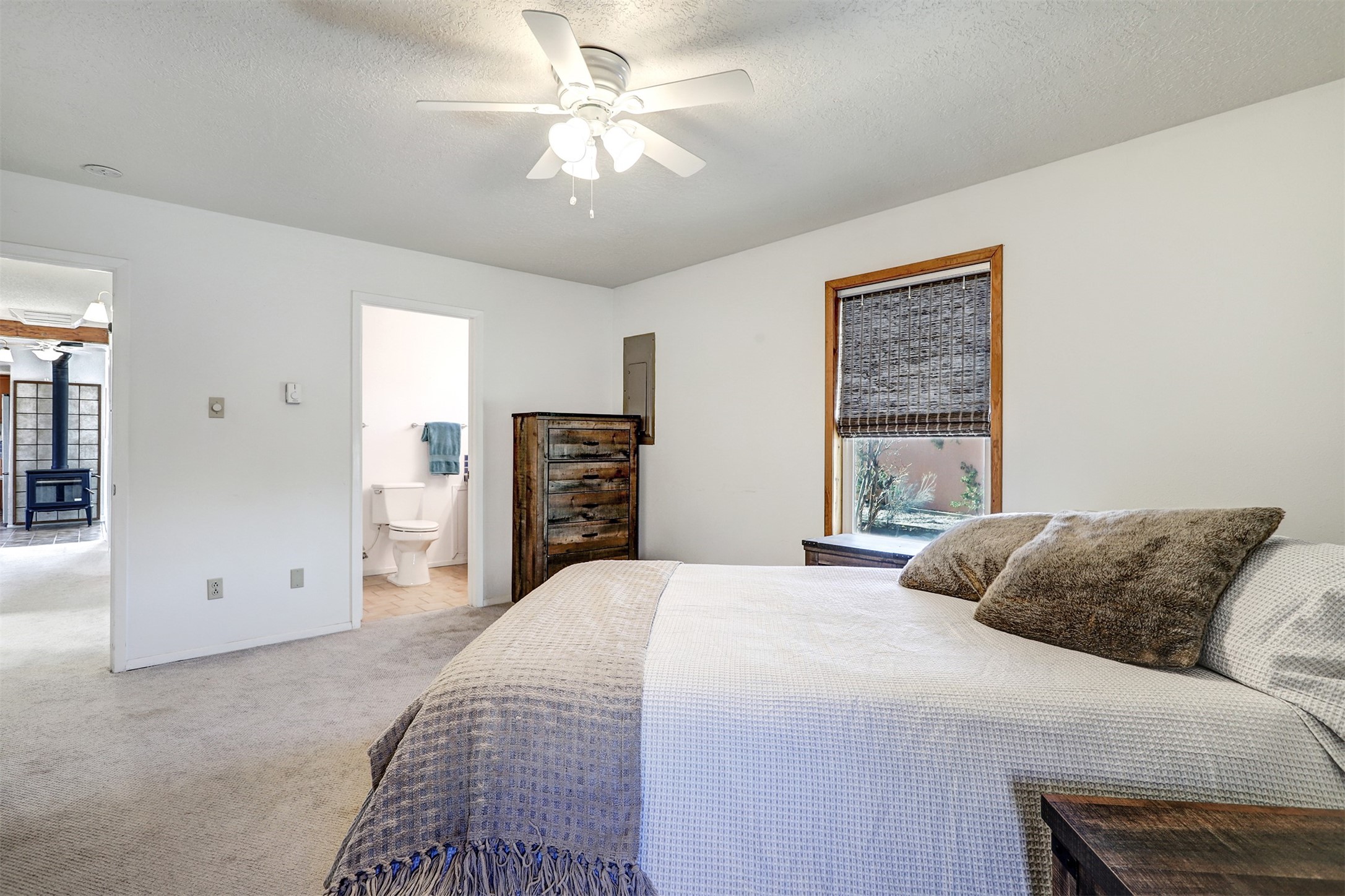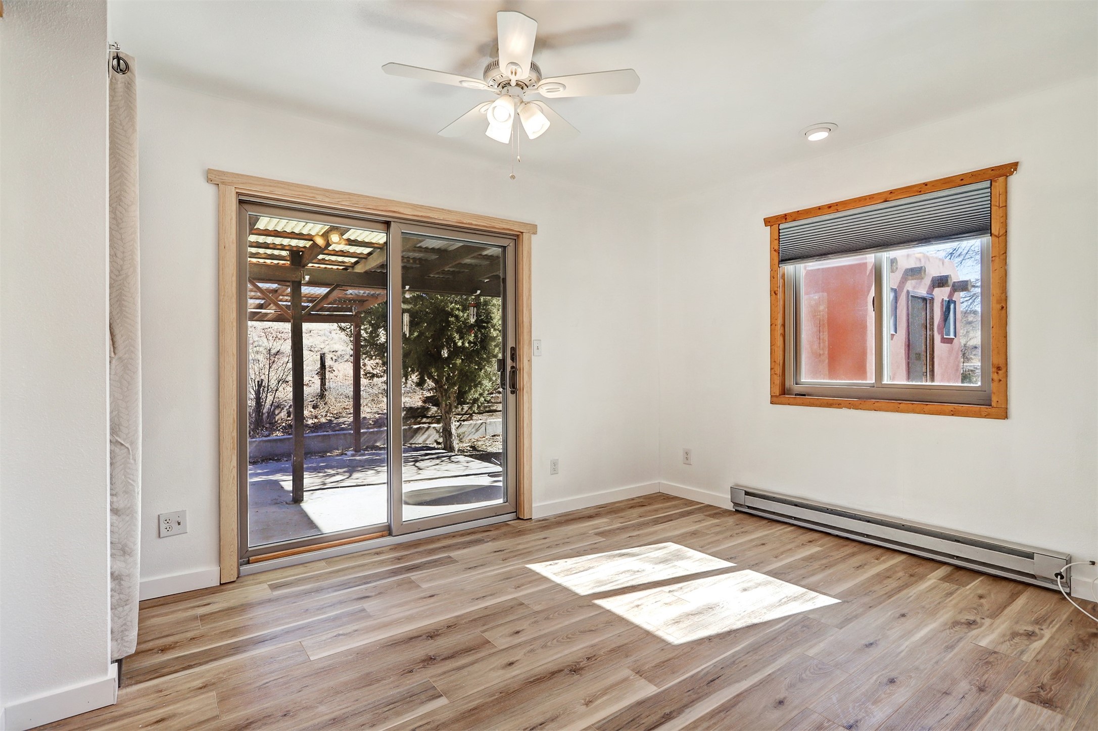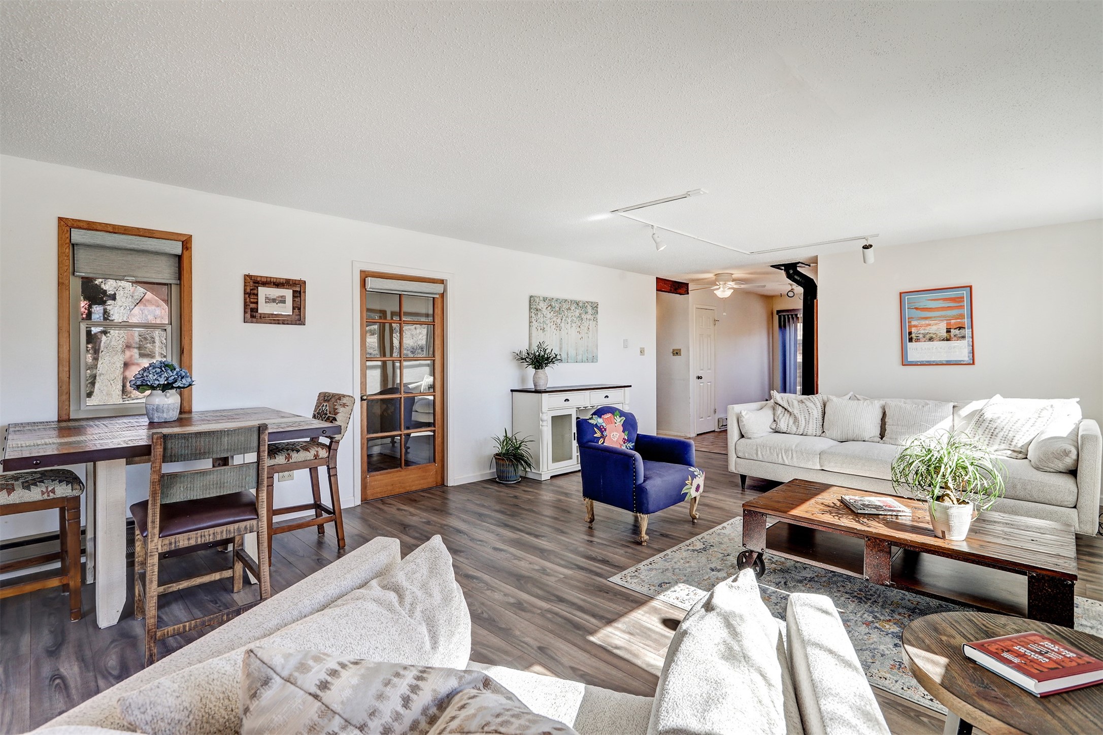 This charming, well-maintained, bright and airy Pueblo-style home is move-in ready and offers a unique blend of tranquility and modern upgrades. Nestled at the end of a private driveway, this 3-bedroom, 2-bath main house comes with a detached 1-bedroom, 1-bath casita, providing privacy and flexibility for guests or potential rental income. Surrounded on two sides by a 600-acre wildlife preserve, the home offers a peaceful retreat with stunning Jemez Mountain views and direct access to miles of hiking trails. Despite its serene setting, it is conveniently located just 20 miles from Santa Fe and Los Alamos.The main house has been thoughtfully updated in 2022 with a new TPO roof, elastomeric stucco painting, a new evaporative cooler, new Andersen windows with stylish new window treatments, a new soapstone wood stove for cozy winter nights, new wood laminate flooring in the living room, and newer carpeting in the bedrooms. Skylights in each bedroom enhance the natural light, creating a warm and inviting atmosphere.The detached casita, approximately 600 square feet, features high ceilings, a private patio, and a fresh modern feel. Recent updates include a new TPO roof, new windows, new wood laminate flooring, and fresh paint, making it a perfect retreat for guests, a rental, or a studio space.Between the main house and the casita, a small detached studio (approximately 120 sq. ft.) offers endless possibilities as a home office, yoga space, or artist's studio. While this unheated building with 220 electric is not included in the total square footage, it adds valuable flexible space.The enclosed courtyard is landscaped with mature trees that provide refreshing summer shade, while the low-maintenance design ensures easy upkeep. Additionally, an insulated storage shed provides extra space for tools and outdoor gear.Offering a rare combination of privacy, stunning natural surroundings, and modern updates, this peaceful oasis is the perfect place to call home.