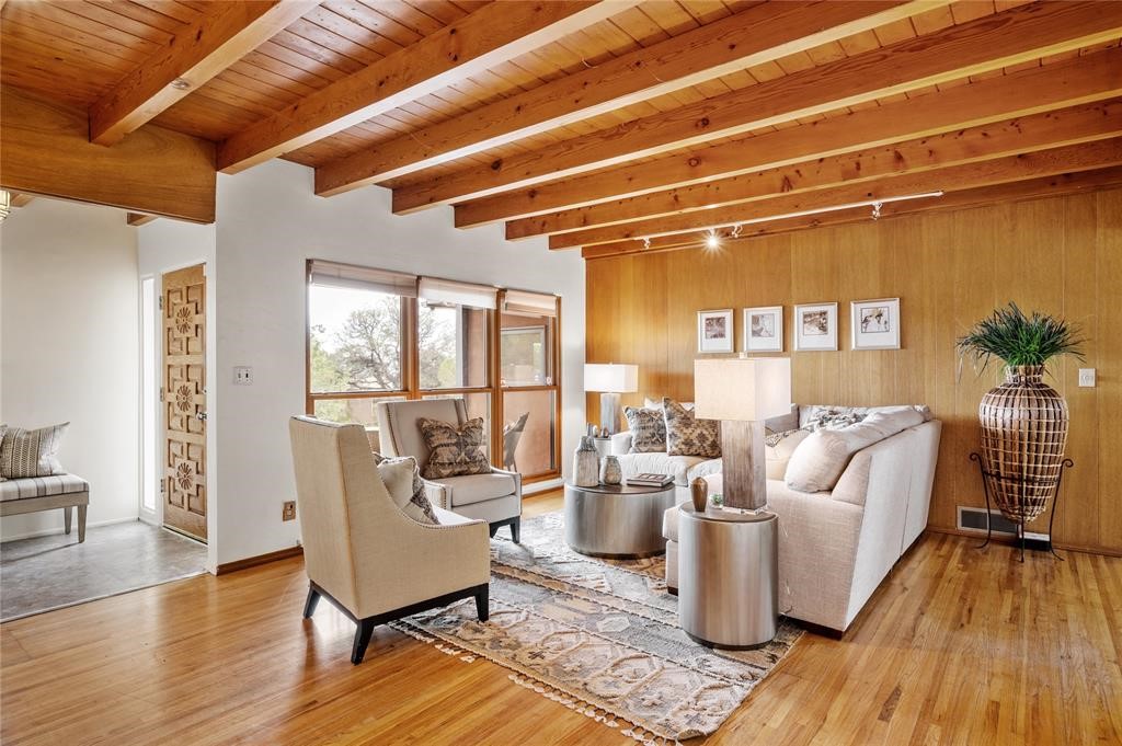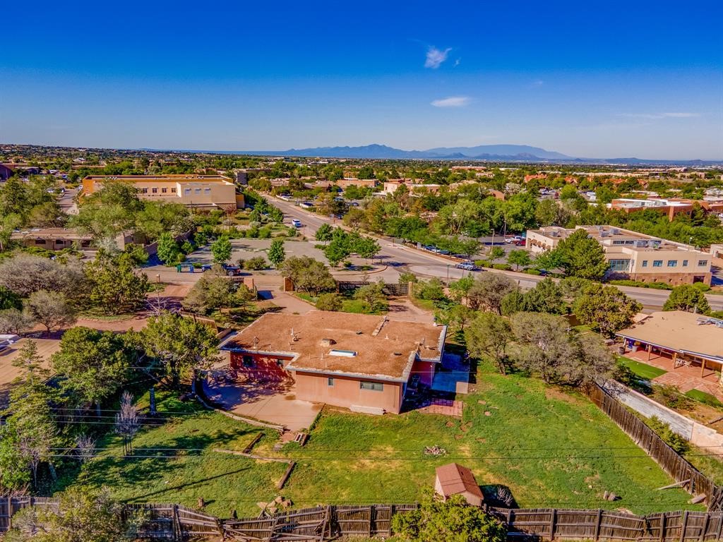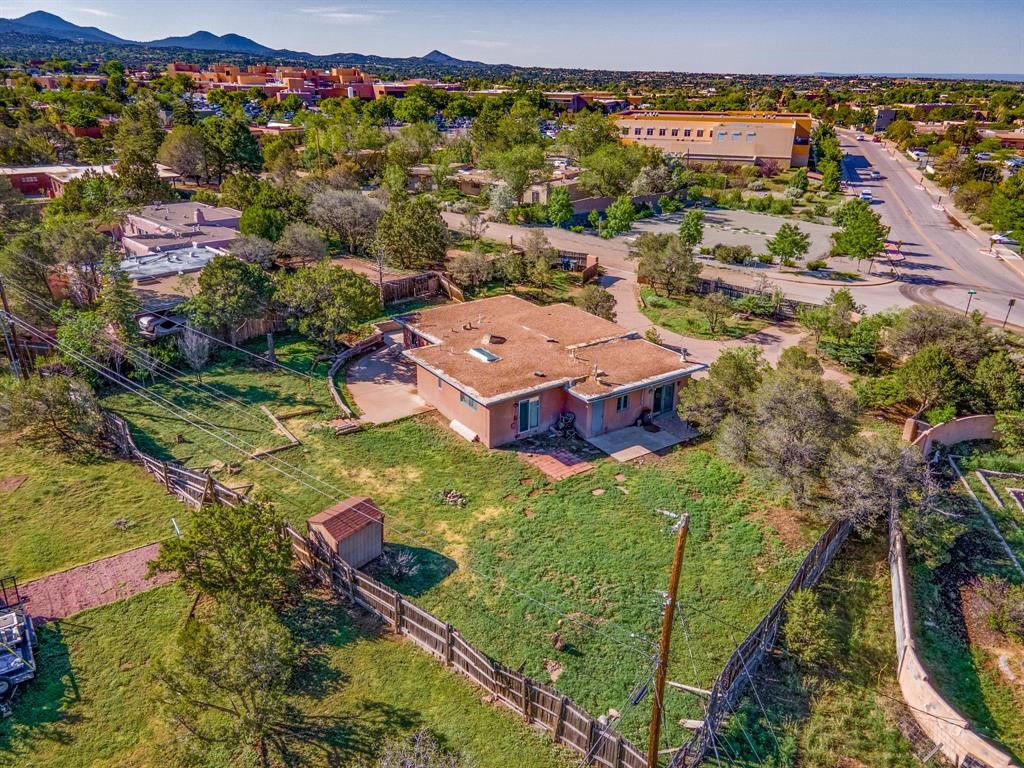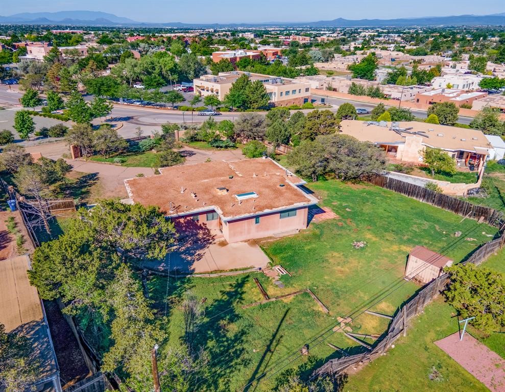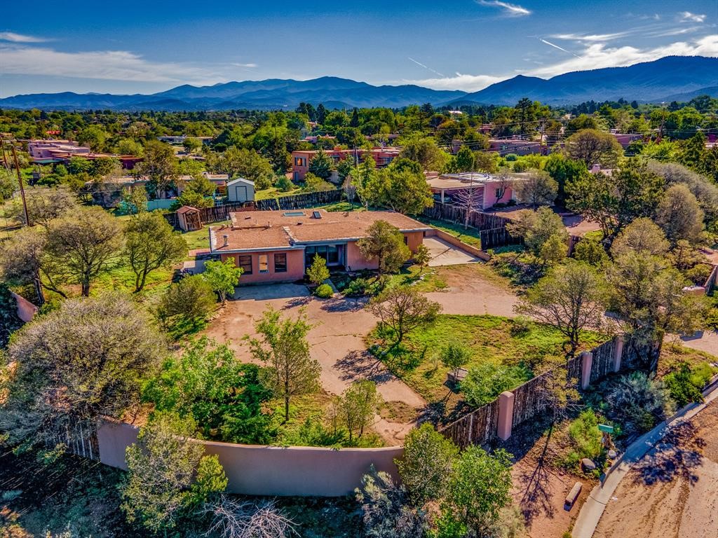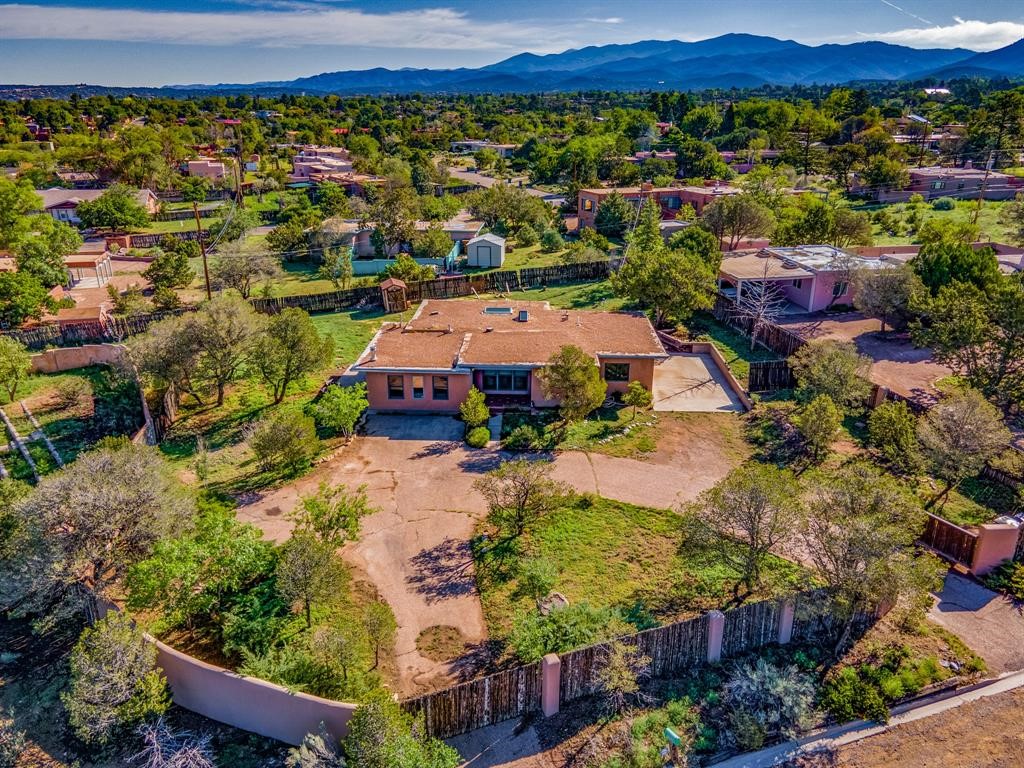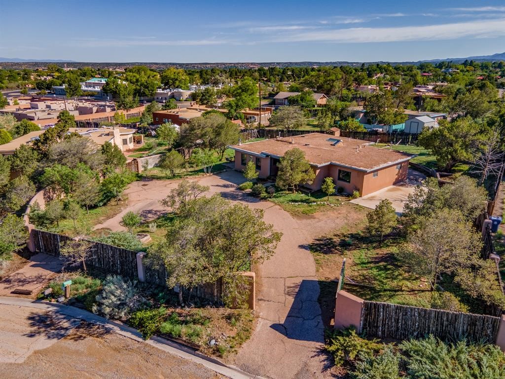 2,000 SF Mid-century Stamm home on .5 acre just south of South Capital. Close to schools,hospital, parks, and hiking. 3 Bedrooms, 2.5 Baths with a large second living area/den or possible fourth bedroom. A charming south-facing front patio welcomes you into the home. Walk through the entryway into a light-filled living room with exposed beams and original oak hardwood floors. The open floorplan is inviting, with the living room opening into a dining area and a beautifully updated kitchen with dining bar and granite counter tops. Skylight in the kitchen and dinning area lets in natural light. Excellent separation of bedrooms with the master and den at one end of the house and the two other bedrooms at the other. Double sinks and slate shower in the master bath. From the master bedroom, full-length glass doors lead outside and offer Jemez mountain views. Interior steps lead into the large and light-filled office or den, which boasts a Kiva fireplace and glass doors leading to a small shaded patio. Dedicated laundry room with utility sink. The concrete pad to the east of the house is perfect for RV/toys parking or possible basketball practice zone. Paved circular driveway and large yard with lots of room to garden or add-on. Several pinon trees in the front of the house. Backyard is a blank slate with views of the Jemez. Roof was redone in 2022 and is under transferable warranty. Aerial photos showing property location were taken before roof re-do.