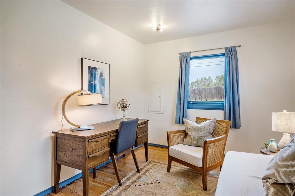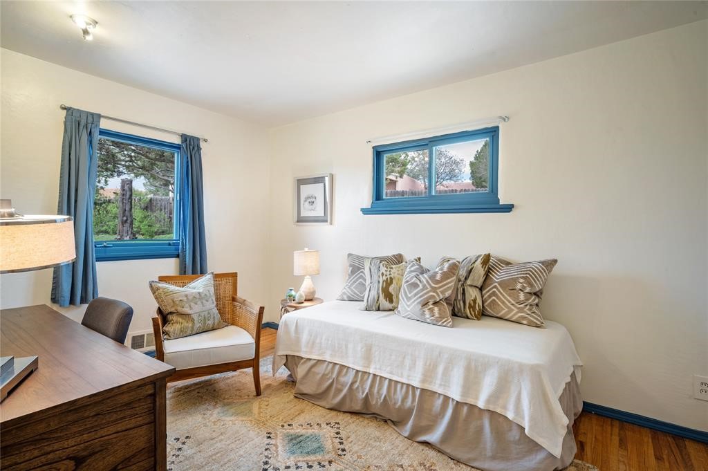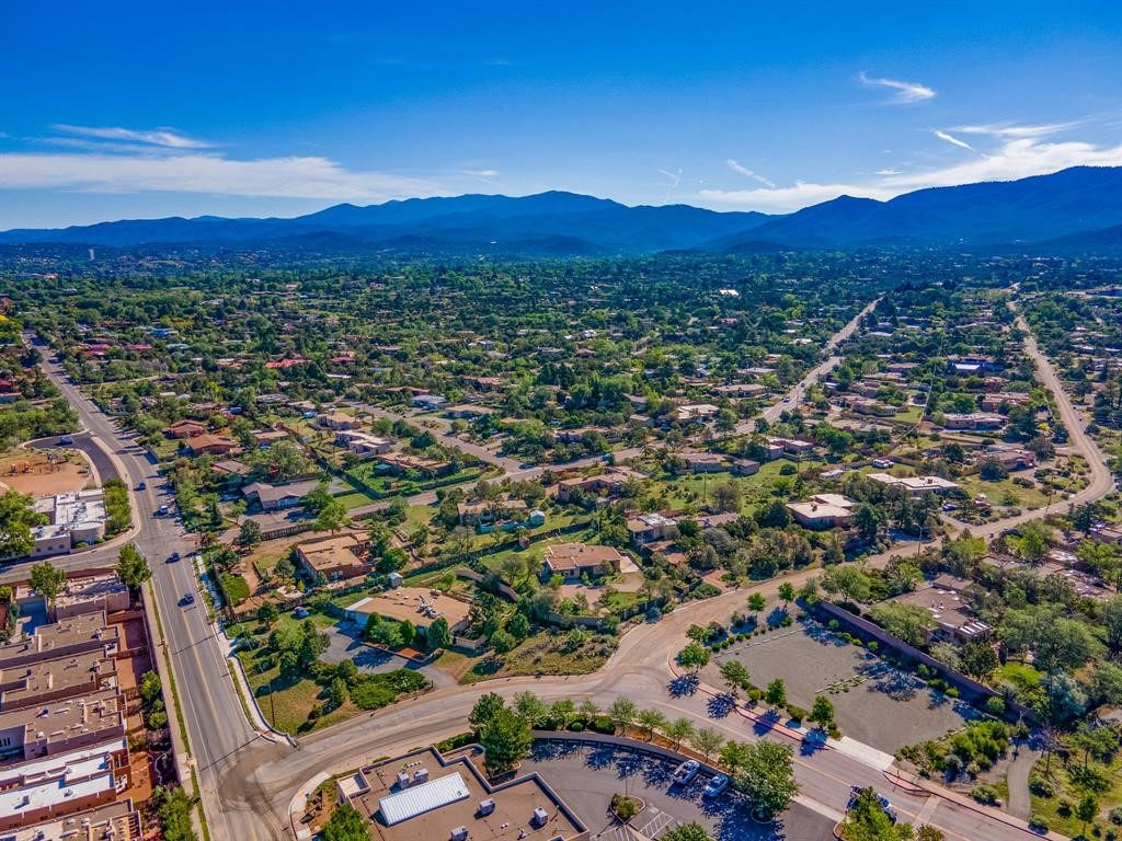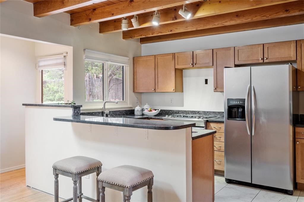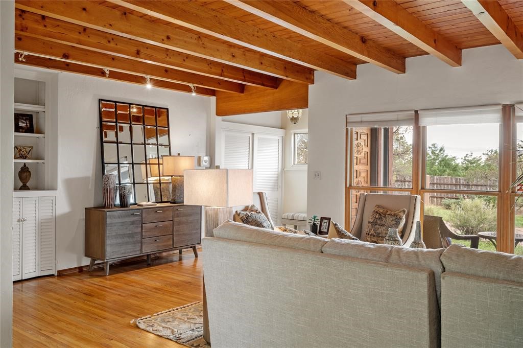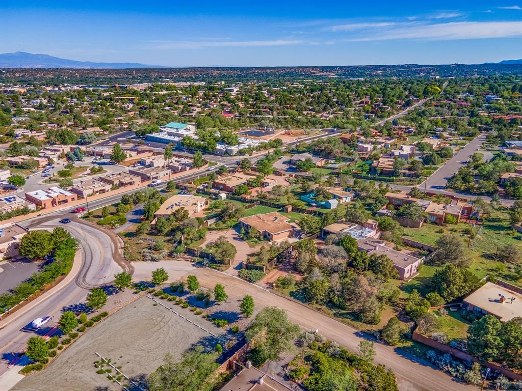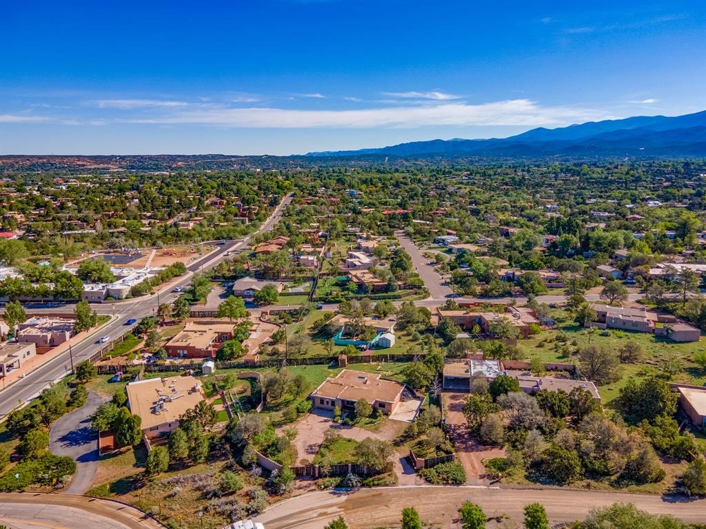 2,000 SF Mid-century Stamm home on .5 acre just south of South Capital. Close to schools,hospital, parks, and hiking. 3 Bedrooms, 2.5 Baths with a large second living area/den or possible fourth bedroom. A charming south-facing front patio welcomes you into the home. Walk through the entryway into a light-filled living room with exposed beams and original oak hardwood floors. The open floorplan is inviting, with the living room opening into a dining area and a beautifully updated kitchen with dining bar and granite counter tops. Skylight in the kitchen and dinning area lets in natural light. Excellent separation of bedrooms with the master and den at one end of the house and the two other bedrooms at the other. Double sinks and slate shower in the master bath. From the master bedroom, full-length glass doors lead outside and offer Jemez mountain views. Interior steps lead into the large and light-filled office or den, which boasts a Kiva fireplace and glass doors leading to a small shaded patio. Dedicated laundry room with utility sink. The concrete pad to the east of the house is perfect for RV/toys parking or possible basketball practice zone. Paved circular driveway and large yard with lots of room to garden or add-on. Several pinon trees in the front of the house. Backyard is a blank slate with views of the Jemez. Roof was redone in 2022 and is under transferable warranty. Aerial photos showing property location were taken before roof re-do.