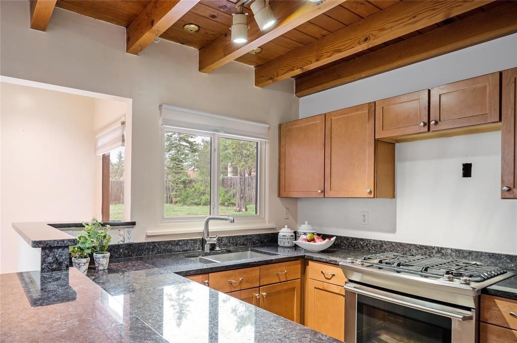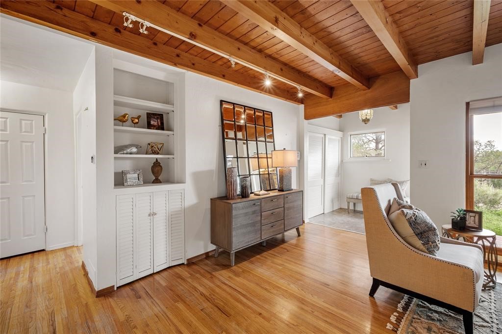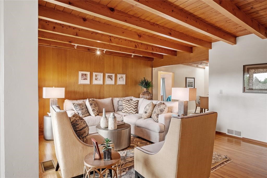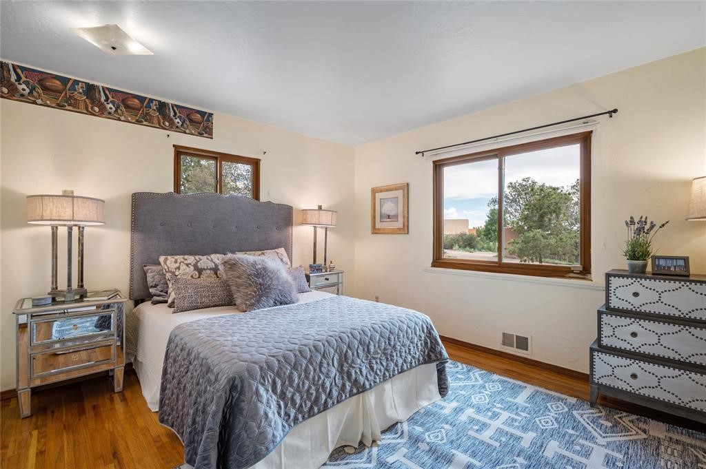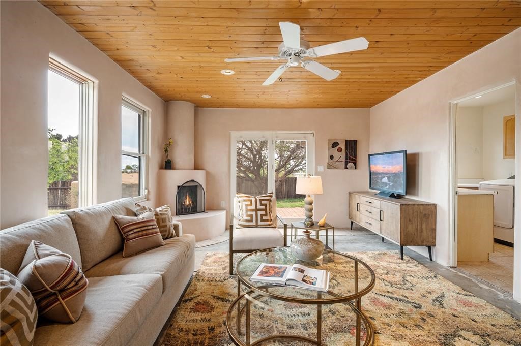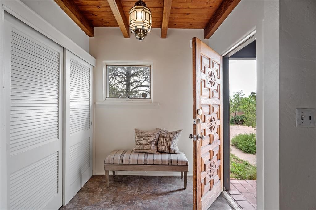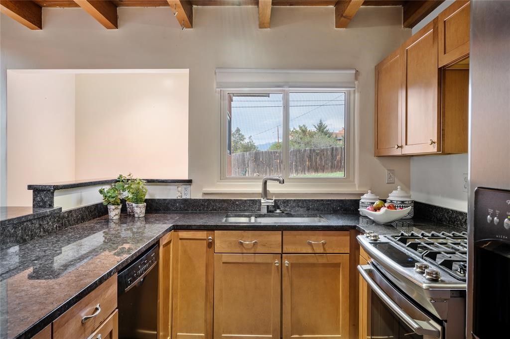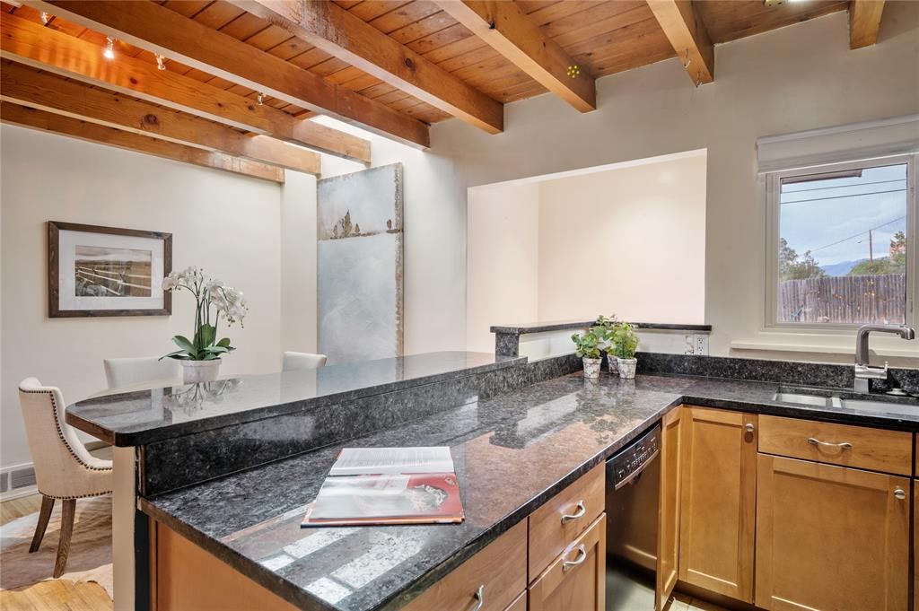 2,000 SF Mid-century Stamm home on .5 acre just south of South Capital. Close to schools,hospital, parks, and hiking. 3 Bedrooms, 2.5 Baths with a large second living area/den or possible fourth bedroom. A charming south-facing front patio welcomes you into the home. Walk through the entryway into a light-filled living room with exposed beams and original oak hardwood floors. The open floorplan is inviting, with the living room opening into a dining area and a beautifully updated kitchen with dining bar and granite counter tops. Skylight in the kitchen and dinning area lets in natural light. Excellent separation of bedrooms with the master and den at one end of the house and the two other bedrooms at the other. Double sinks and slate shower in the master bath. From the master bedroom, full-length glass doors lead outside and offer Jemez mountain views. Interior steps lead into the large and light-filled office or den, which boasts a Kiva fireplace and glass doors leading to a small shaded patio. Dedicated laundry room with utility sink. The concrete pad to the east of the house is perfect for RV/toys parking or possible basketball practice zone. Paved circular driveway and large yard with lots of room to garden or add-on. Several pinon trees in the front of the house. Backyard is a blank slate with views of the Jemez. Roof was redone in 2022 and is under transferable warranty. Aerial photos showing property location were taken before roof re-do.