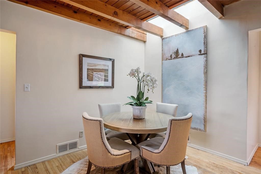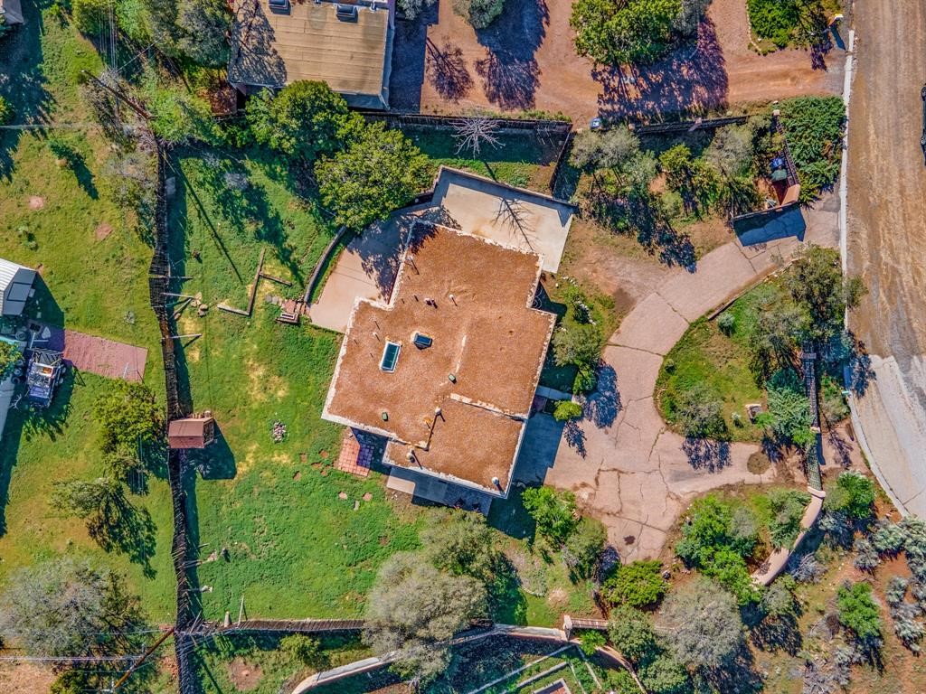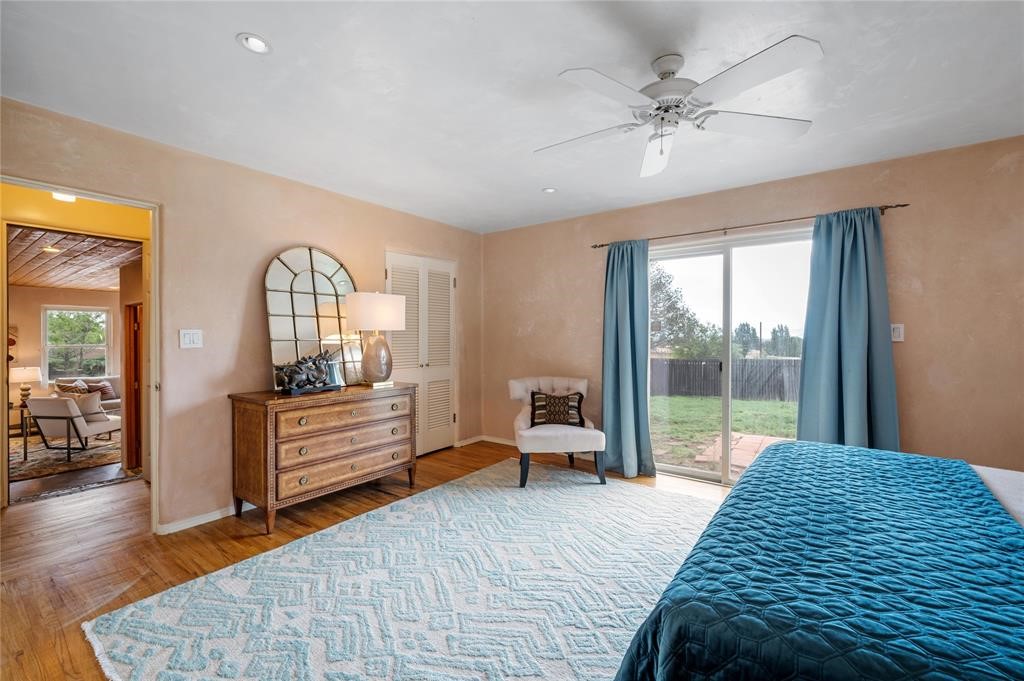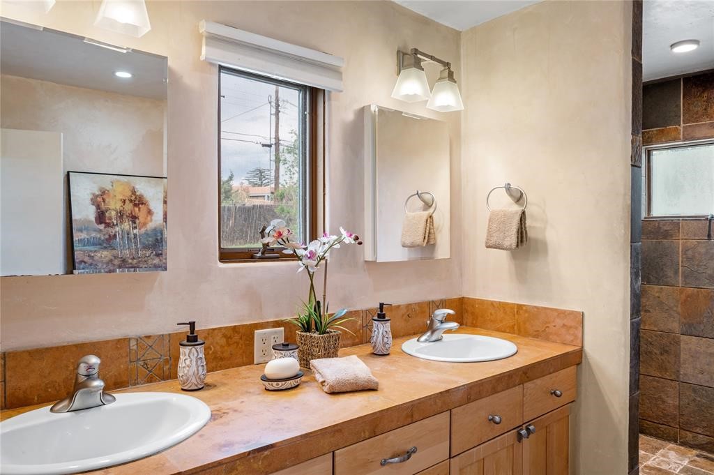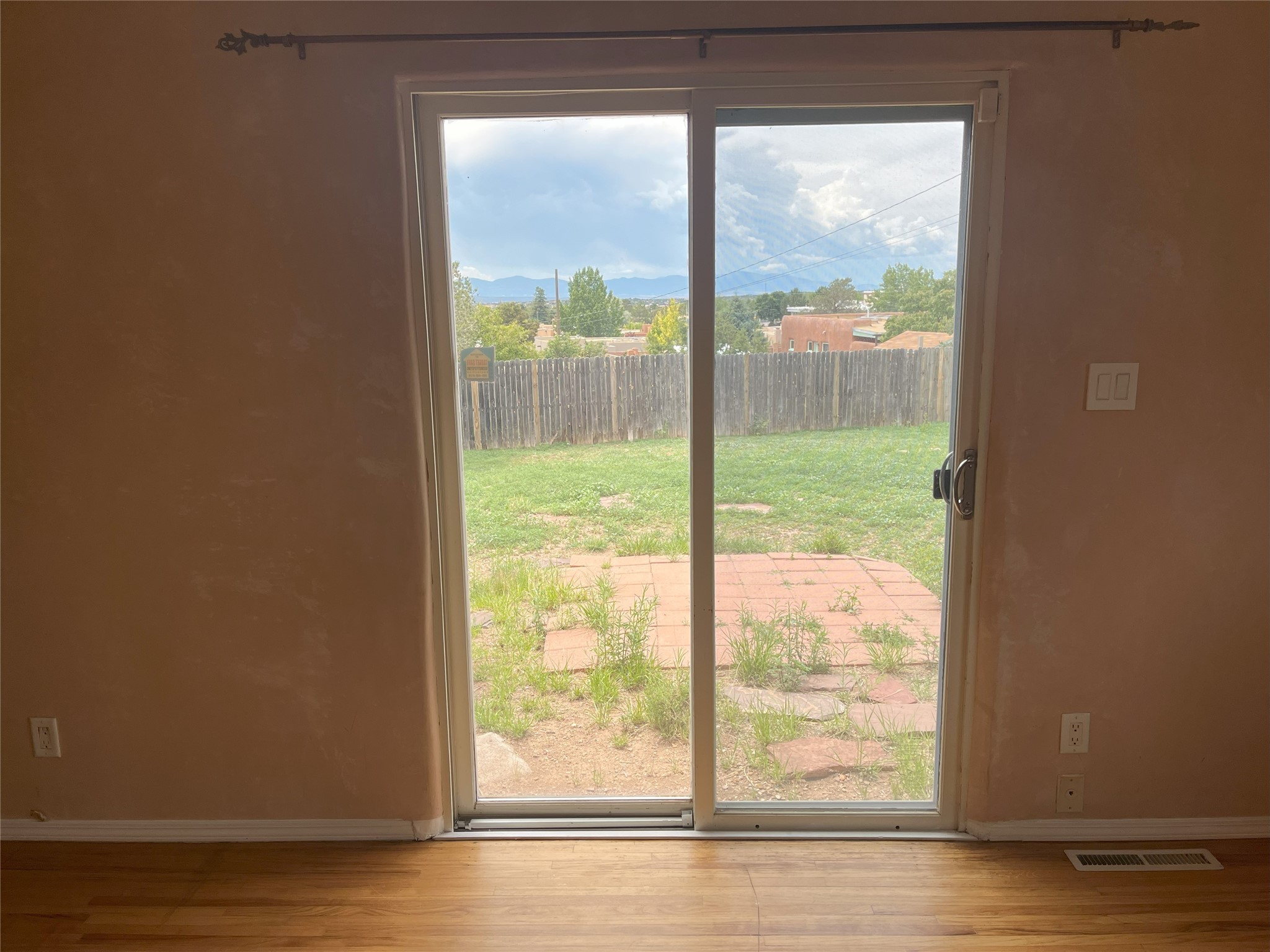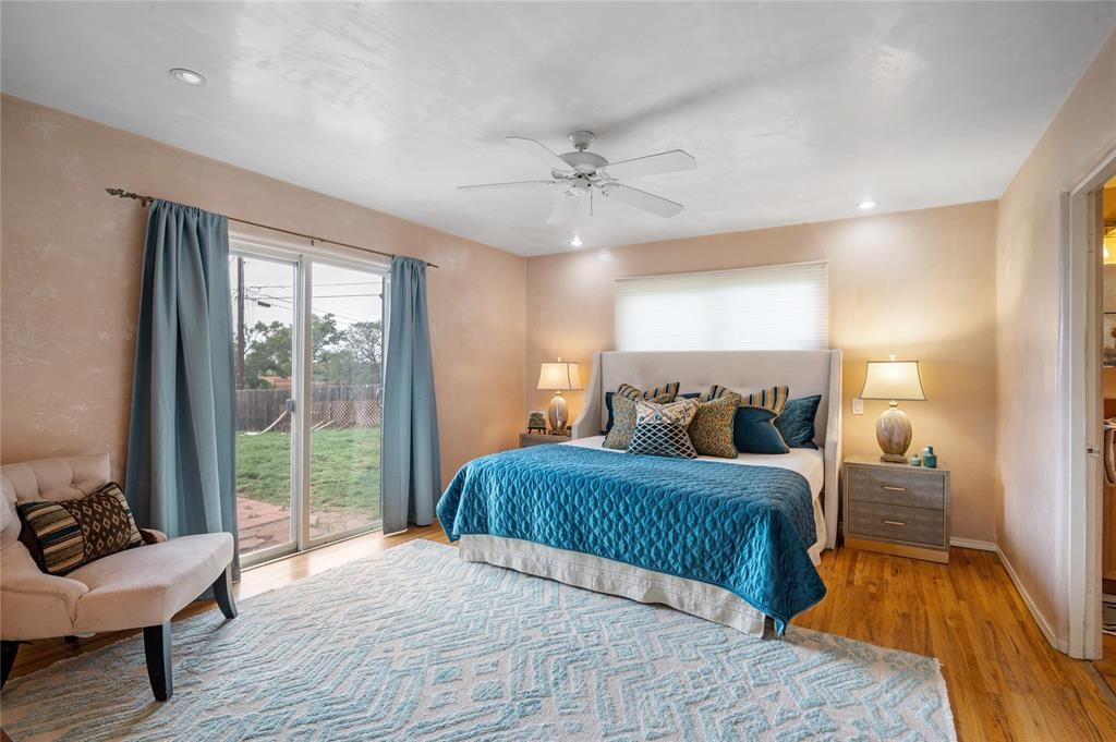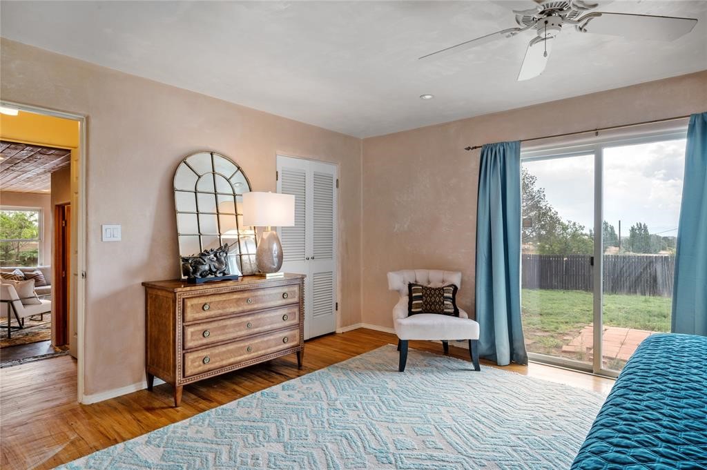 2,000 SF Mid-century Stamm home on .5 acre just south of South Capital. Close to schools,hospital, parks, and hiking. 3 Bedrooms, 2.5 Baths with a large second living area/den or possible fourth bedroom. A charming south-facing front patio welcomes you into the home. Walk through the entryway into a light-filled living room with exposed beams and original oak hardwood floors. The open floorplan is inviting, with the living room opening into a dining area and a beautifully updated kitchen with dining bar and granite counter tops. Skylight in the kitchen and dinning area lets in natural light. Excellent separation of bedrooms with the master and den at one end of the house and the two other bedrooms at the other. Double sinks and slate shower in the master bath. From the master bedroom, full-length glass doors lead outside and offer Jemez mountain views. Interior steps lead into the large and light-filled office or den, which boasts a Kiva fireplace and glass doors leading to a small shaded patio. Dedicated laundry room with utility sink. The concrete pad to the east of the house is perfect for RV/toys parking or possible basketball practice zone. Paved circular driveway and large yard with lots of room to garden or add-on. Several pinon trees in the front of the house. Backyard is a blank slate with views of the Jemez. Roof was redone in 2022 and is under transferable warranty. Aerial photos showing property location were taken before roof re-do.