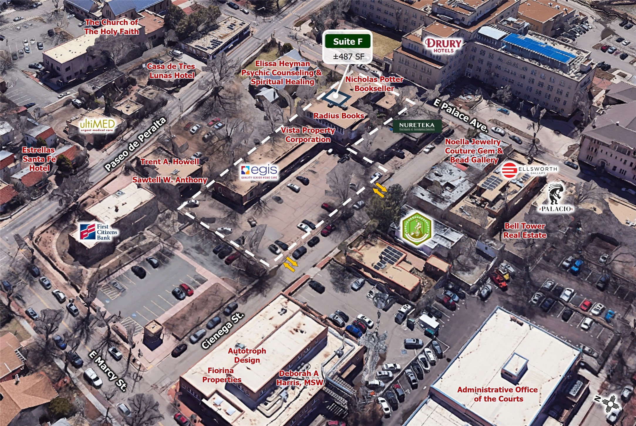 AVAILABLE: Suite F: 487 SF | SALE PRICE:$180,000 | ZONING: BCD, Business Capital District | HIGHLIGHTS: Layout: 2 offices, reception, bathroom and kitchenette, Two designated parking spaces and metered parking on street, Desirable location in downtown, Part of Kruger Building with 22 units and 46 parking spaces, Shared heating system. New mini-splits to be installed in 2025, COA Dues: $539.20/month, Year Built: 1950, Surrounded by: Professional offices, Retail businesses, Galleries, Restaurants, Hotels, Museums, Santa Fe Plaza