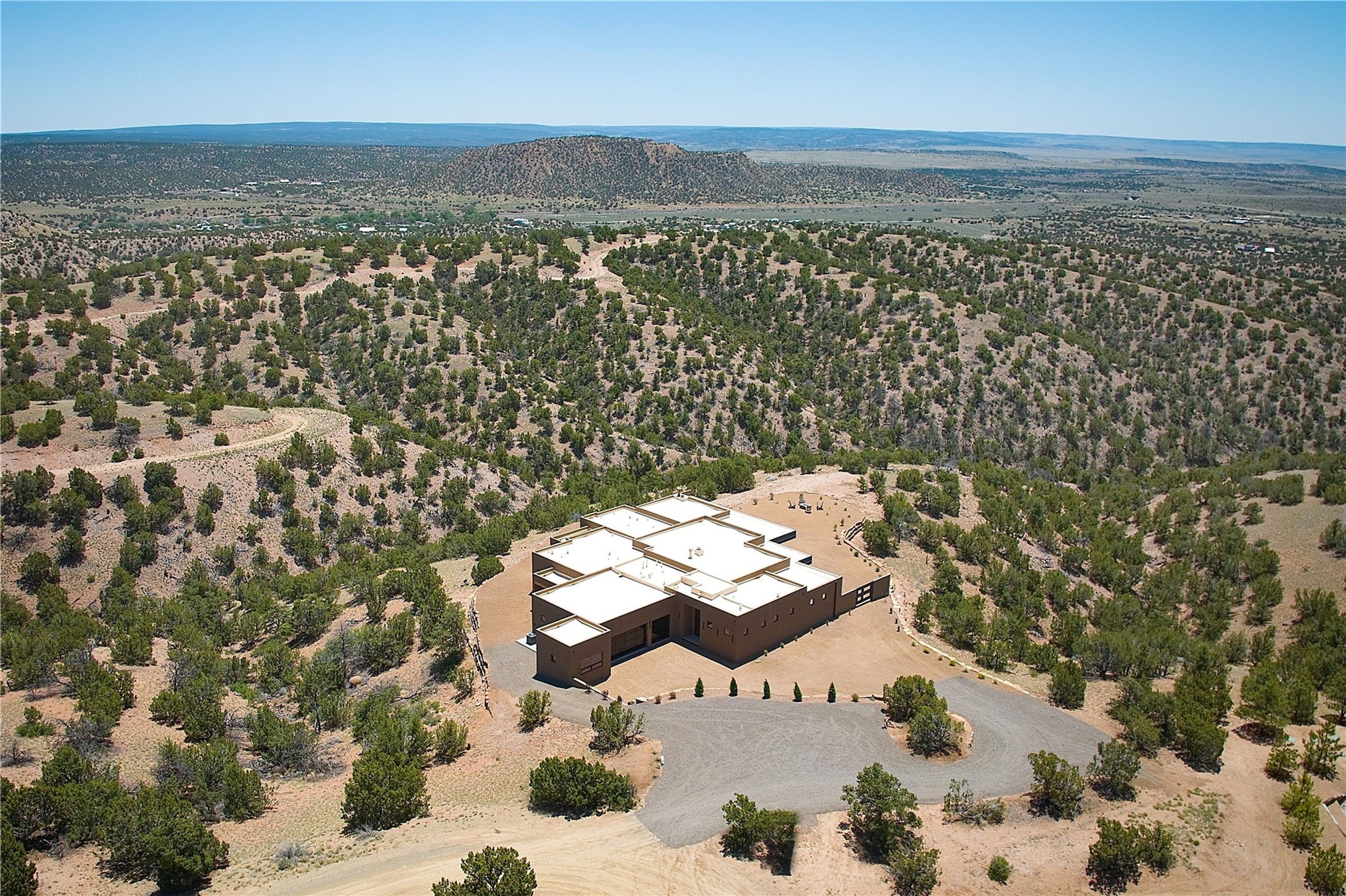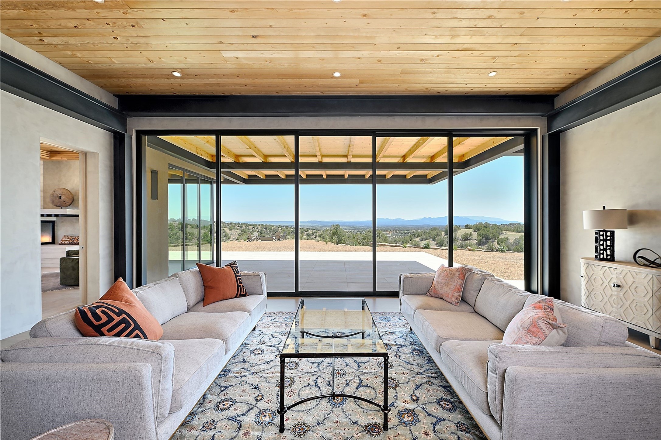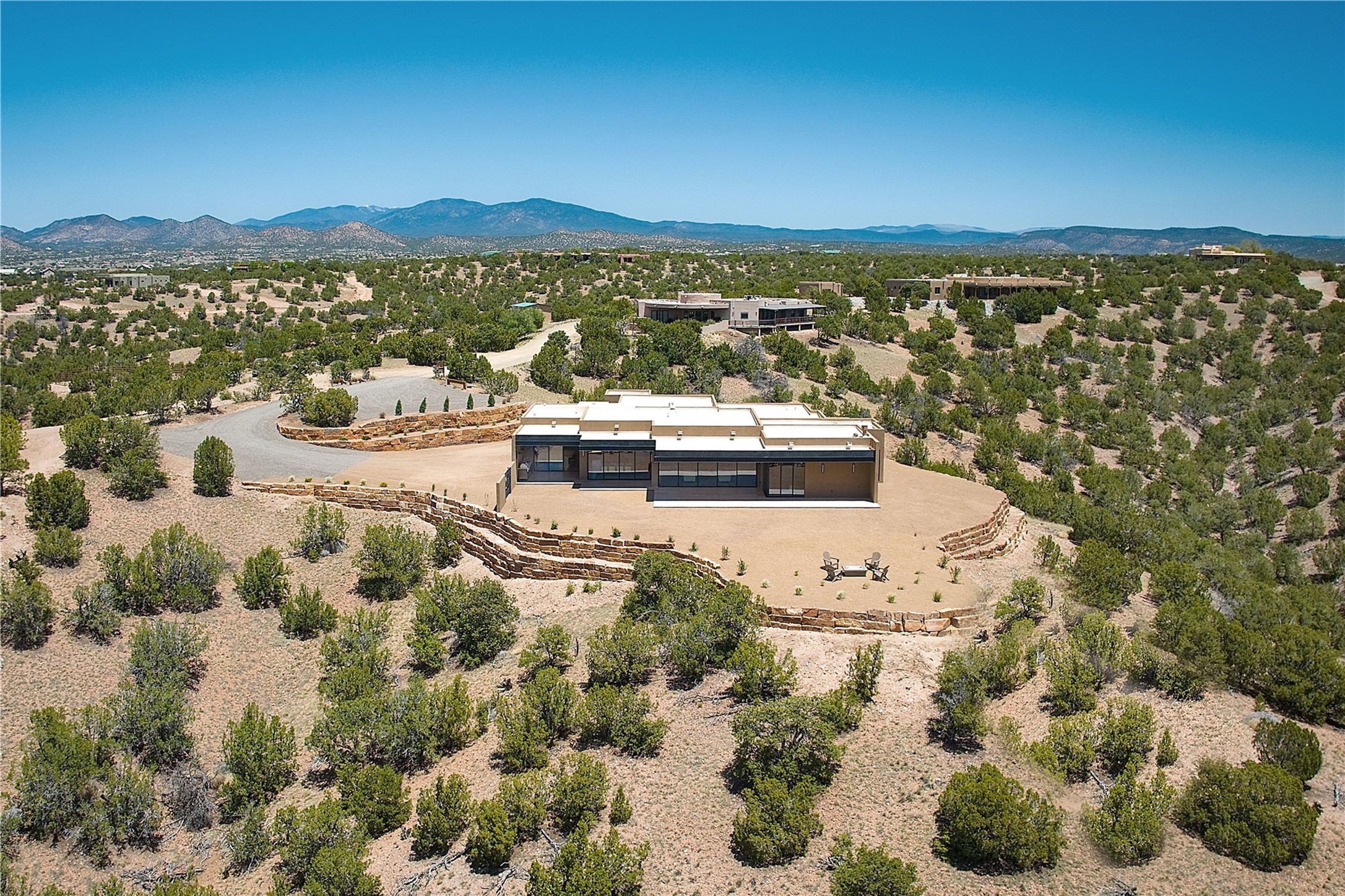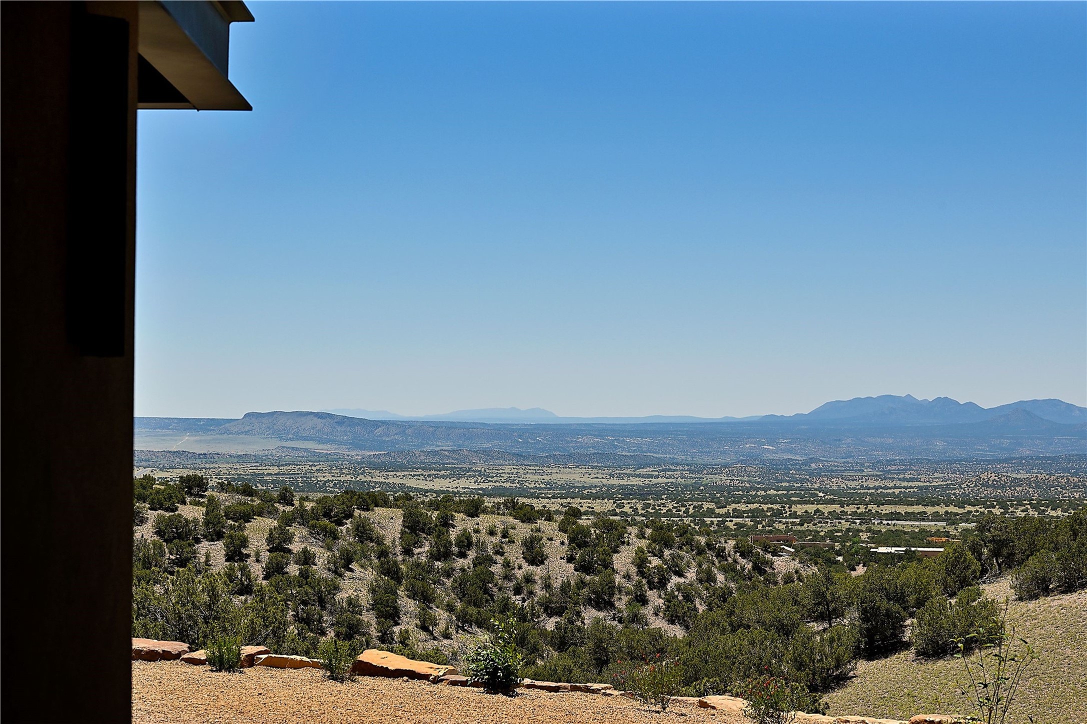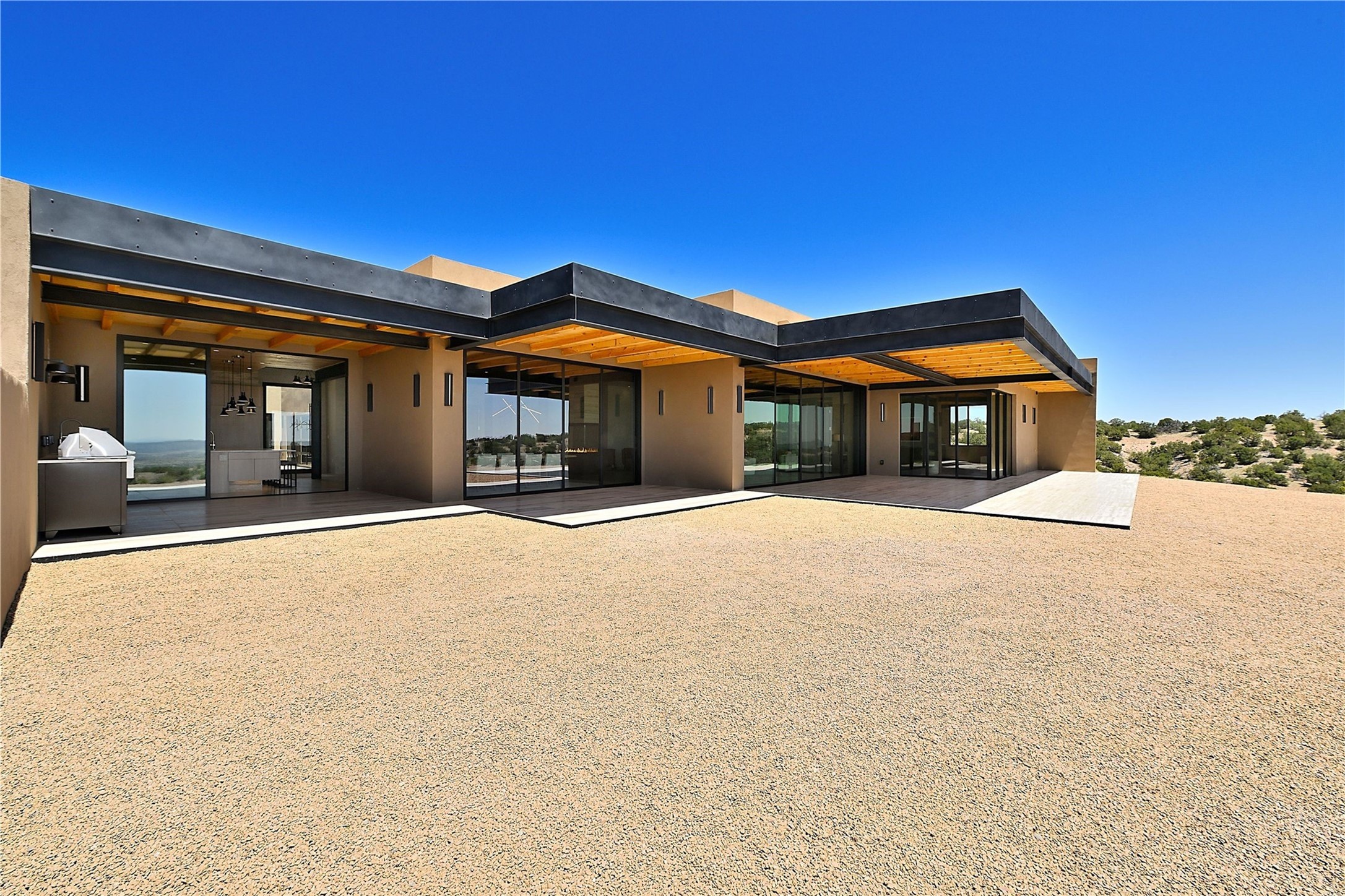 ** 2025 Grand Hacienda Winner!17 Vista Bella will be the #1 Property on the Haciendas 2025 Parade of Homes Tour 8/8-8/10 and 8/15-8/17. Breathtaking views and stellar night skies- this new build is move in ready! Boasting (approx.) 4,400 sq. ft. & nestled on 12.68 acres, this home offers unparalleled views of the Galisteo Basin and mountains. Designed by Mark Schwebel of Big Art Builders, 2024 Parade of Homes for Natural Materials winner, this masterpiece blends cantilevered steel beams, glass, natural wood, and stone to harmonize with its high-desert surroundings. A contemporary design brings the outdoors in, with expansive windows, a stunning outdoor kitchen, and spaces perfect for entertaining. Each element has been meticulously crafted to highlight the surrounding beauty while creating a warm, luxurious environment. The kitchen's stunning centerpiece is crafted from white oak slabs, complemented by Italian stone floors and walls. Counters are custom-milled Brazilian stone, with BlueStar appliances and True refrigeration. Each bathroom is a work of art, clad in exotic stones sourced from Mexico, Turkey, and Italy. Vanities are crafted from exotic hardwoods like West African Padauk and Black Limba, paired with countertops of Persian travertine, Brazilian Taj Mahal, and Namibian granite. The powder room features Italian stone and a unique concrete sink. Refined details include: 7" French white oak floors, Lake Tahoe white fir ceilings, and two showpiece gas fireplaces: a modern shepherd's design in the primary suite and a black granite-clad peninsula in the living room. Take advantage of the unrivaled comfort this home offers with High-efficiency Carrier forced air heating and cooling, radiant heating throughout, and superior insulation with closed-cell spray foam (R60 ceilings, R30 walls). This home is a celebration of luxury, nature, and artistry, a truly one-of-a-kind property that must be experienced.