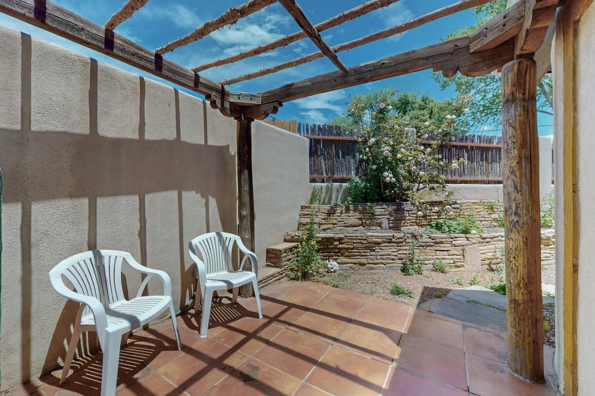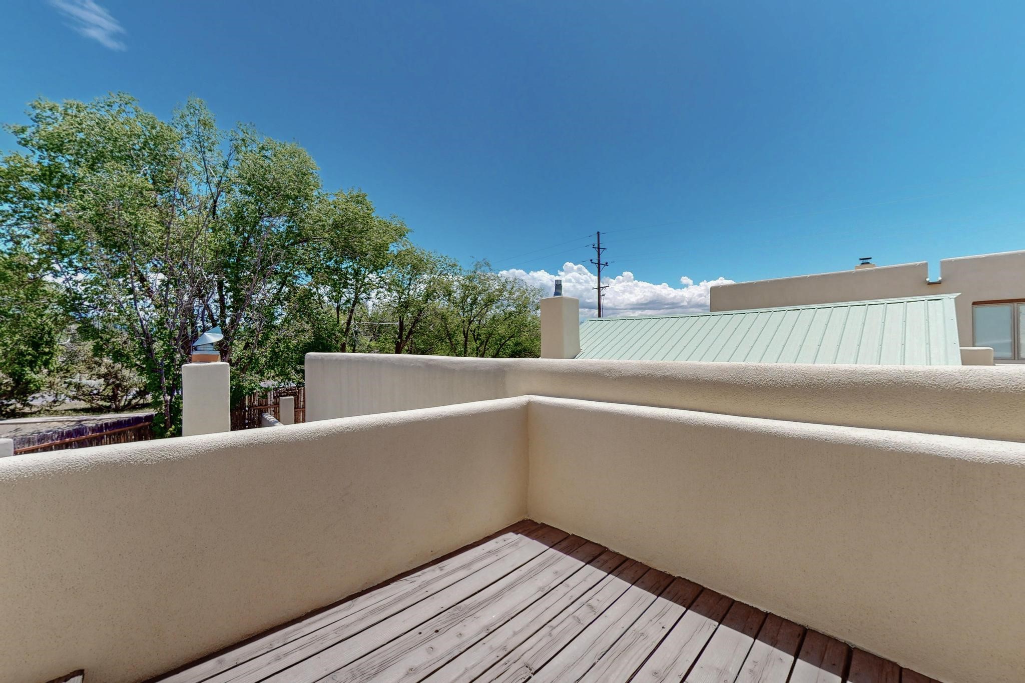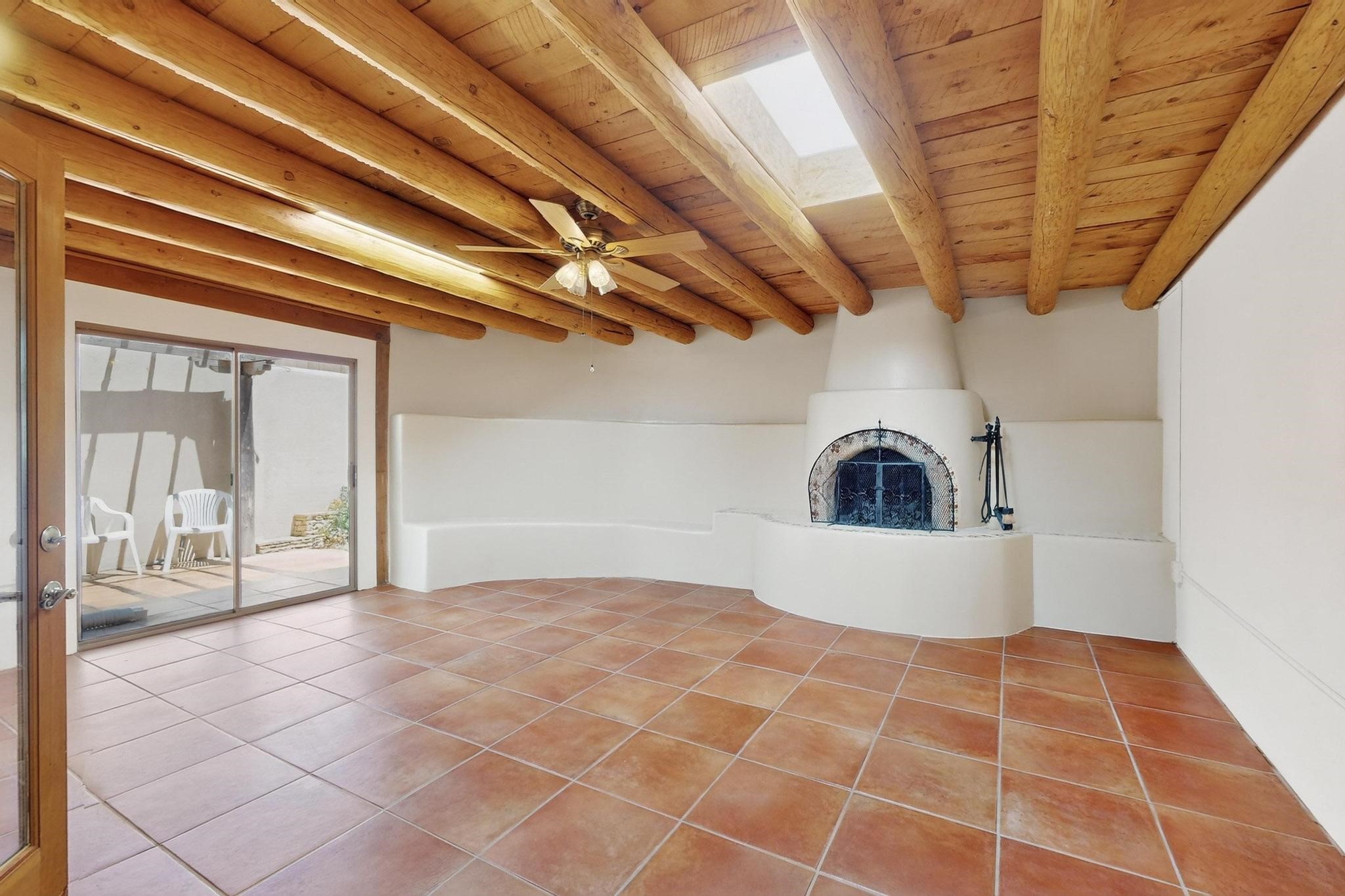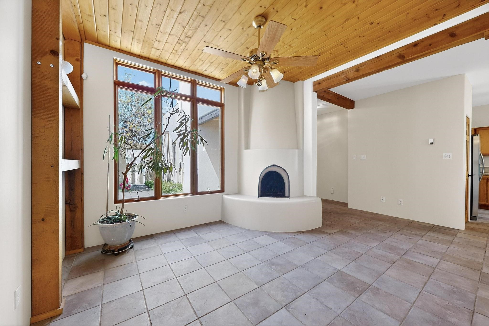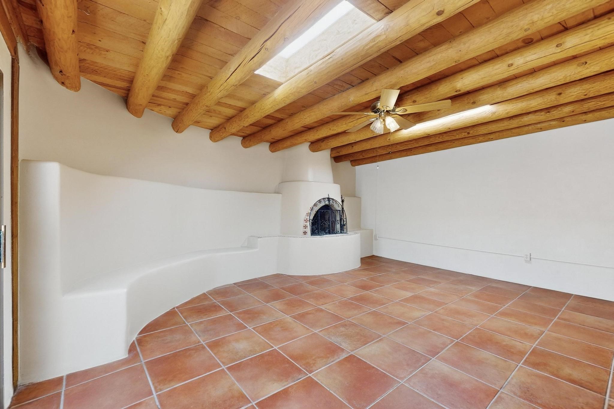 This charming Santa Fe home blends classic Southwestern character with thoughtful modern updates. A standout feature is the large room addition at the back, a true showpiece with traditional vigas, an elaborate built-in banco, oversized tile flooring, and a striking kiva fireplace. This spacious and versatile area can serve as a second living room, a creative studio, or an entertainment space. The home also boasts new kitchen appliances, radiant heat floors for cozy winter living, and two kiva fireplaces that add warmth and Southwestern charm. Two upstairs decks extend from each bedroom, providing private outdoor spaces perfect for relaxation. The interior has been freshly painted, giving the home a clean, move-in ready feel. The lush, colorful garden is complemented by a cistern system, offering an eco-friendly solution for watering. This home invites both comfort and functionality, with Santa Fe style at its core.