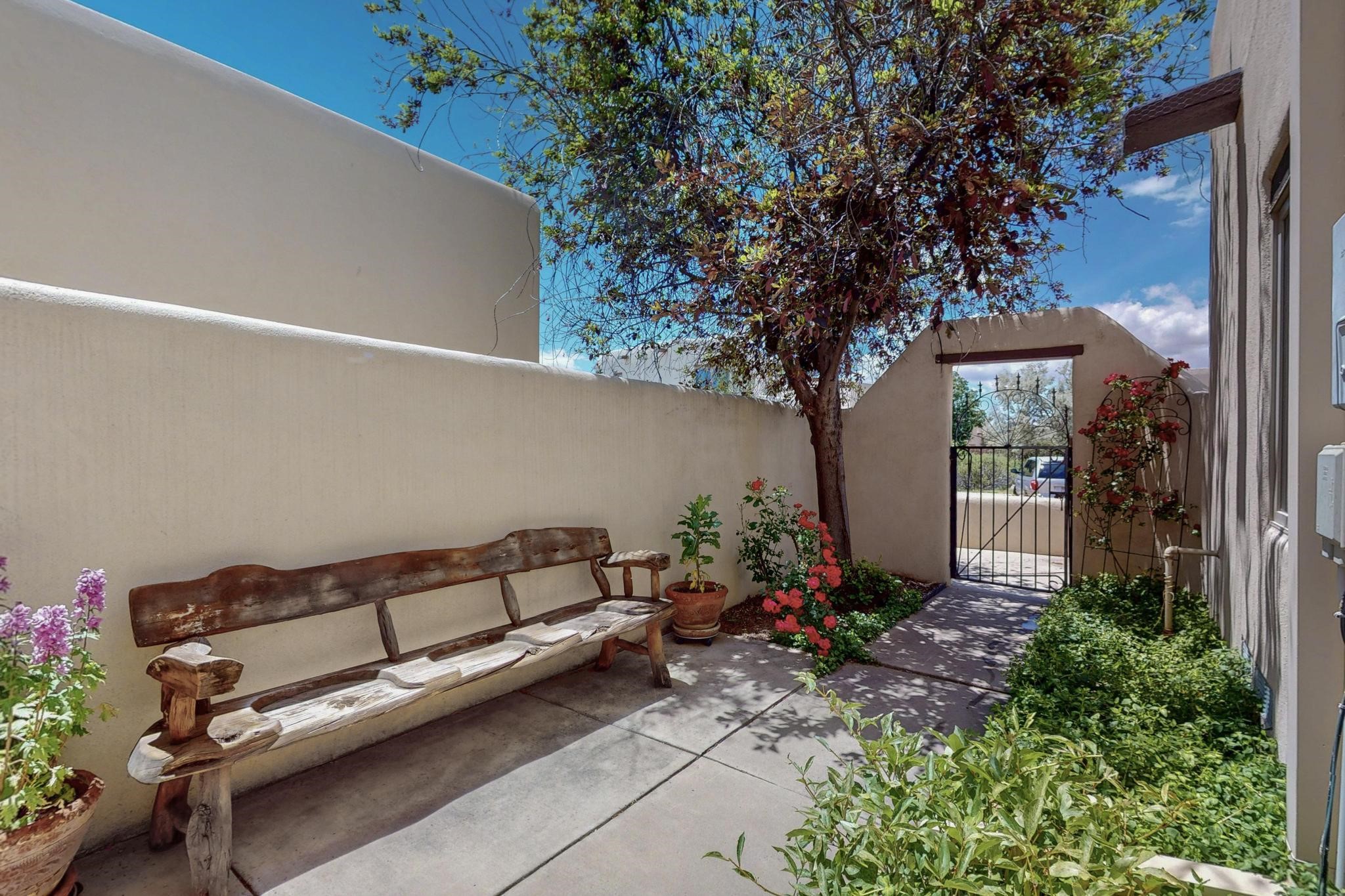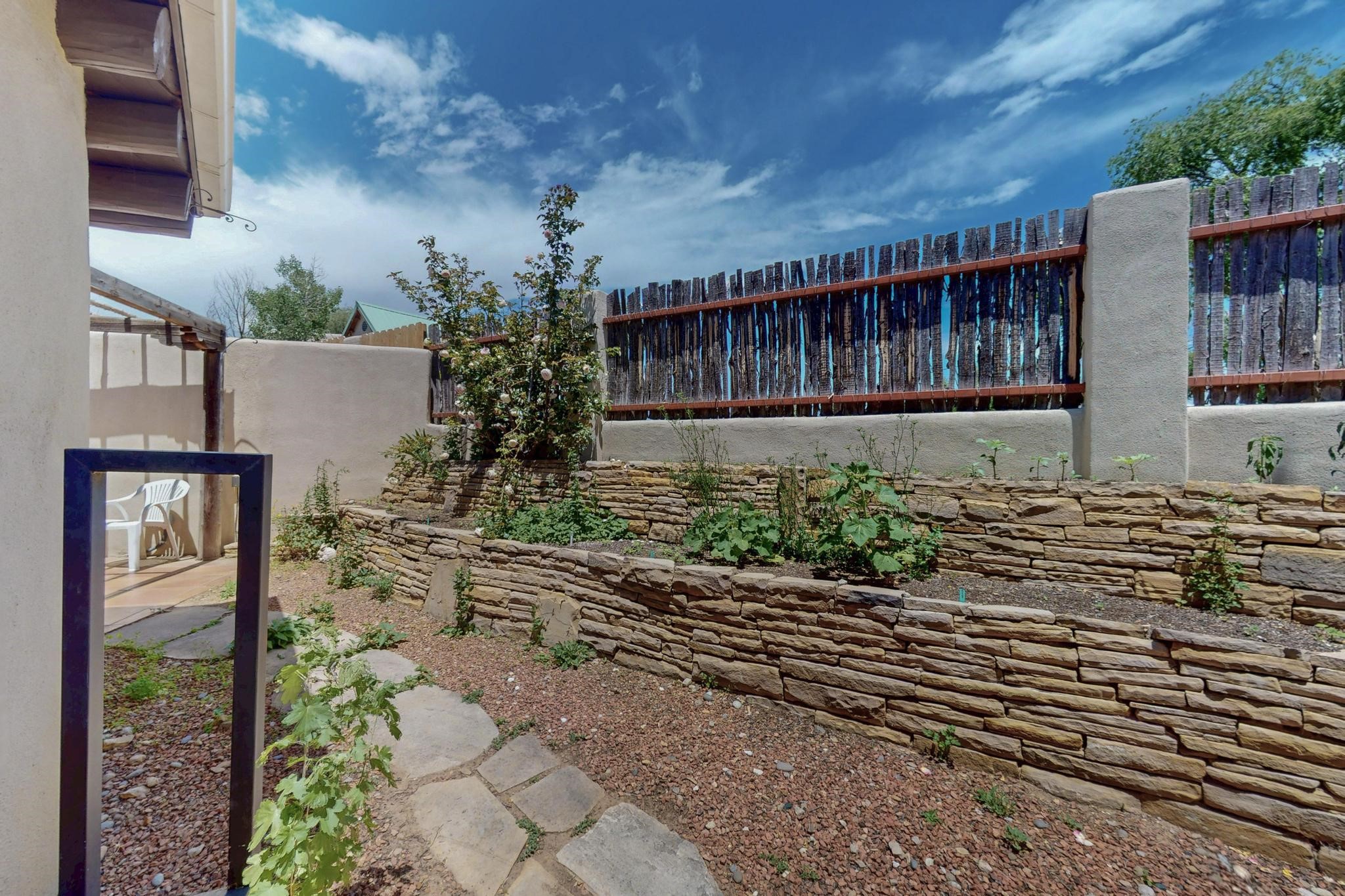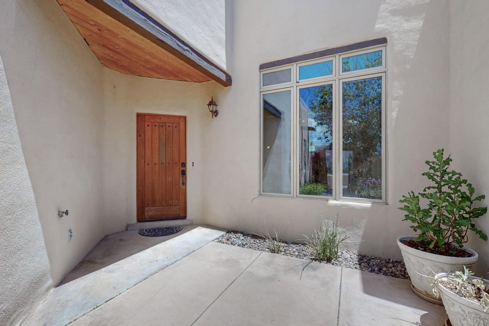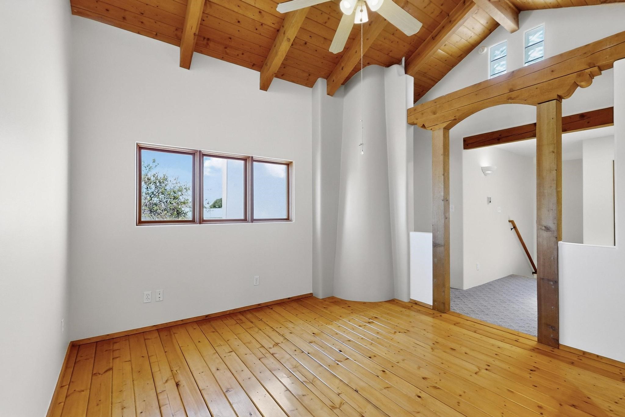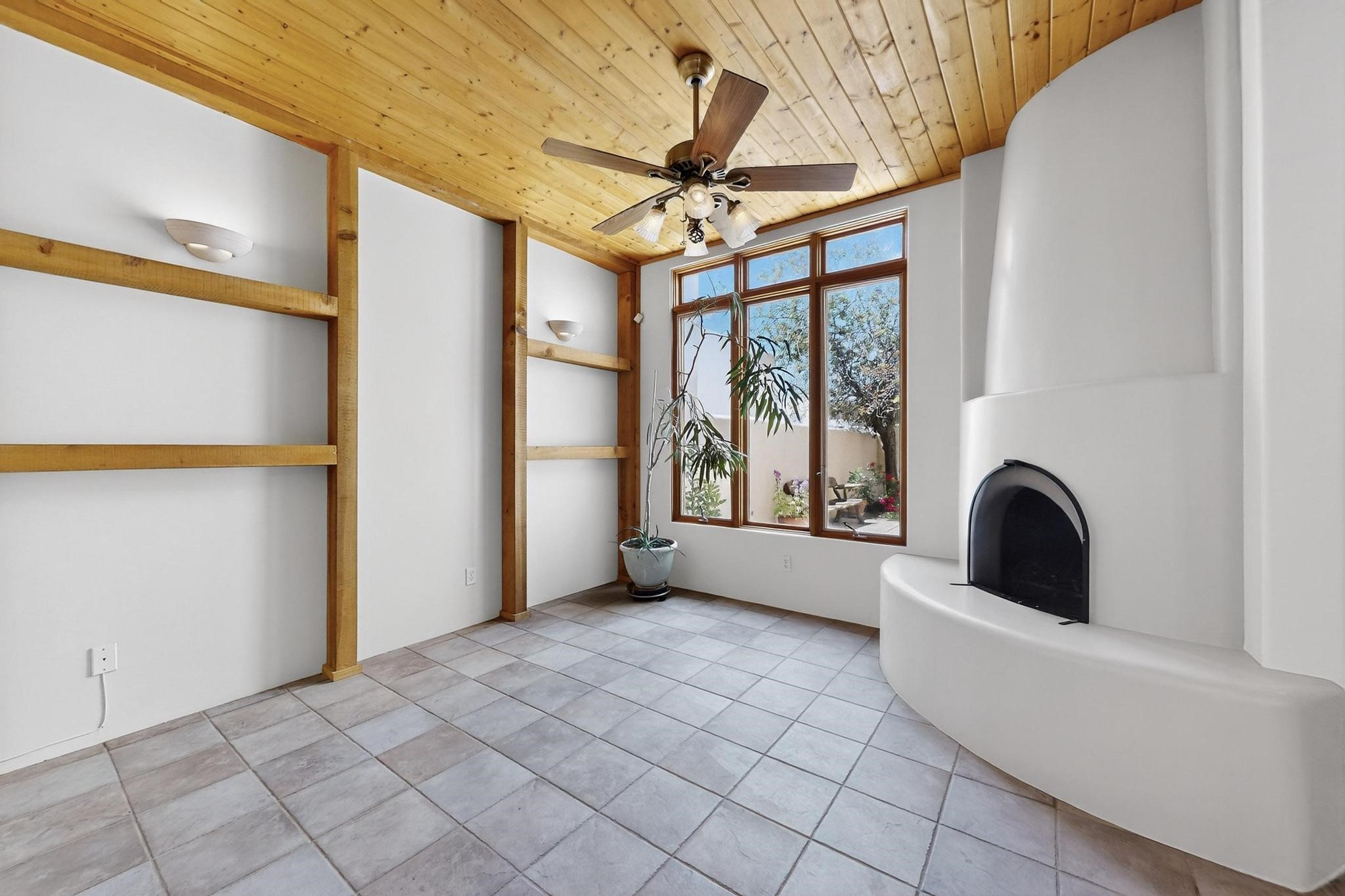This charming Santa Fe home blends classic Southwestern character with thoughtful modern updates. A standout feature is the large room addition at the back, a true showpiece with traditional vigas, an elaborate built-in banco, oversized tile flooring, and a striking kiva fireplace. This spacious and versatile area can serve as a second living room, a creative studio, or an entertainment space. The home also boasts new kitchen appliances, radiant heat floors for cozy winter living, and two kiva fireplaces that add warmth and Southwestern charm. Two upstairs decks extend from each bedroom, providing private outdoor spaces perfect for relaxation. The interior has been freshly painted, giving the home a clean, move-in ready feel. The lush, colorful garden is complemented by a cistern system, offering an eco-friendly solution for watering. This home invites both comfort and functionality, with Santa Fe style at its core.