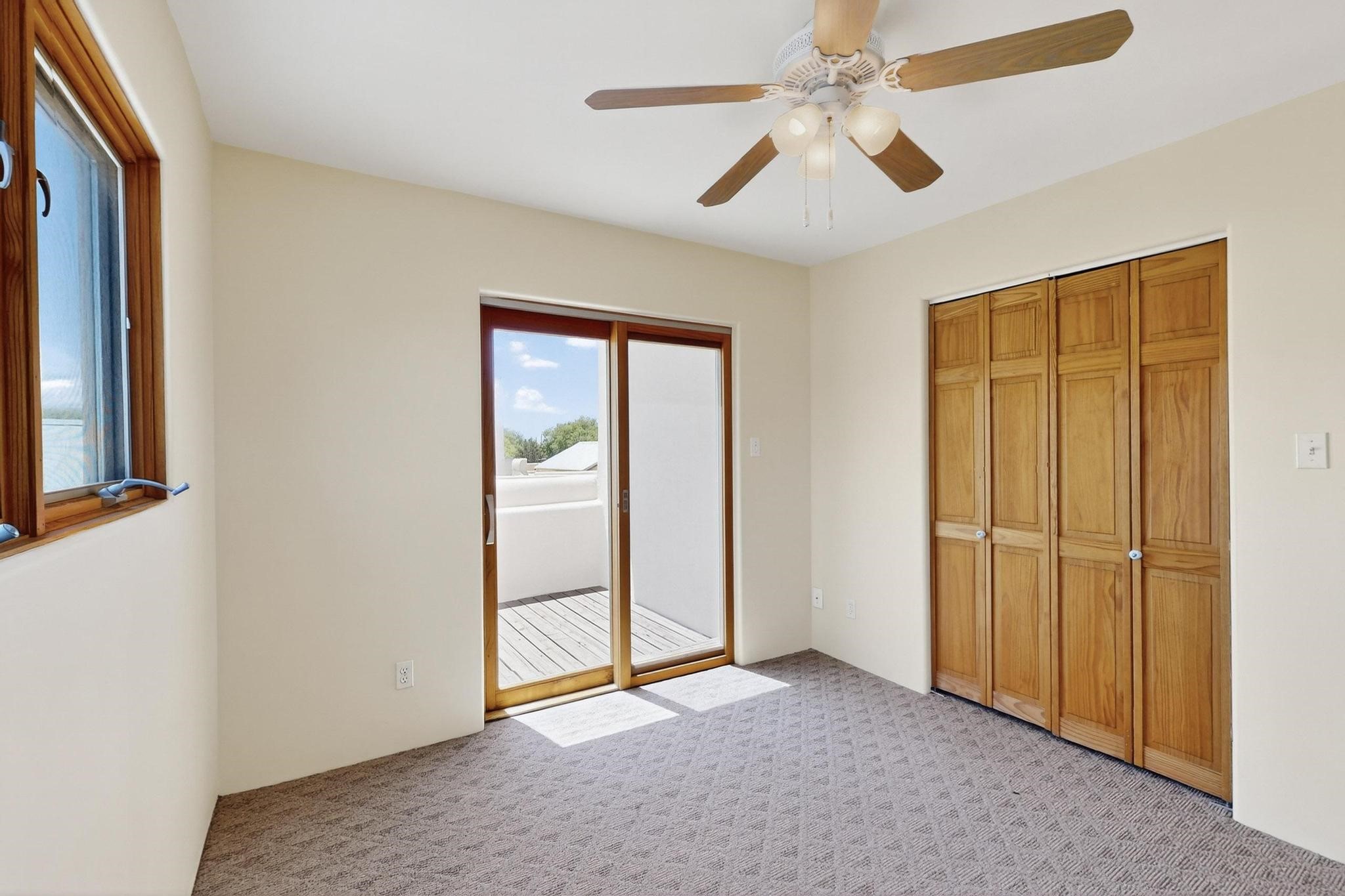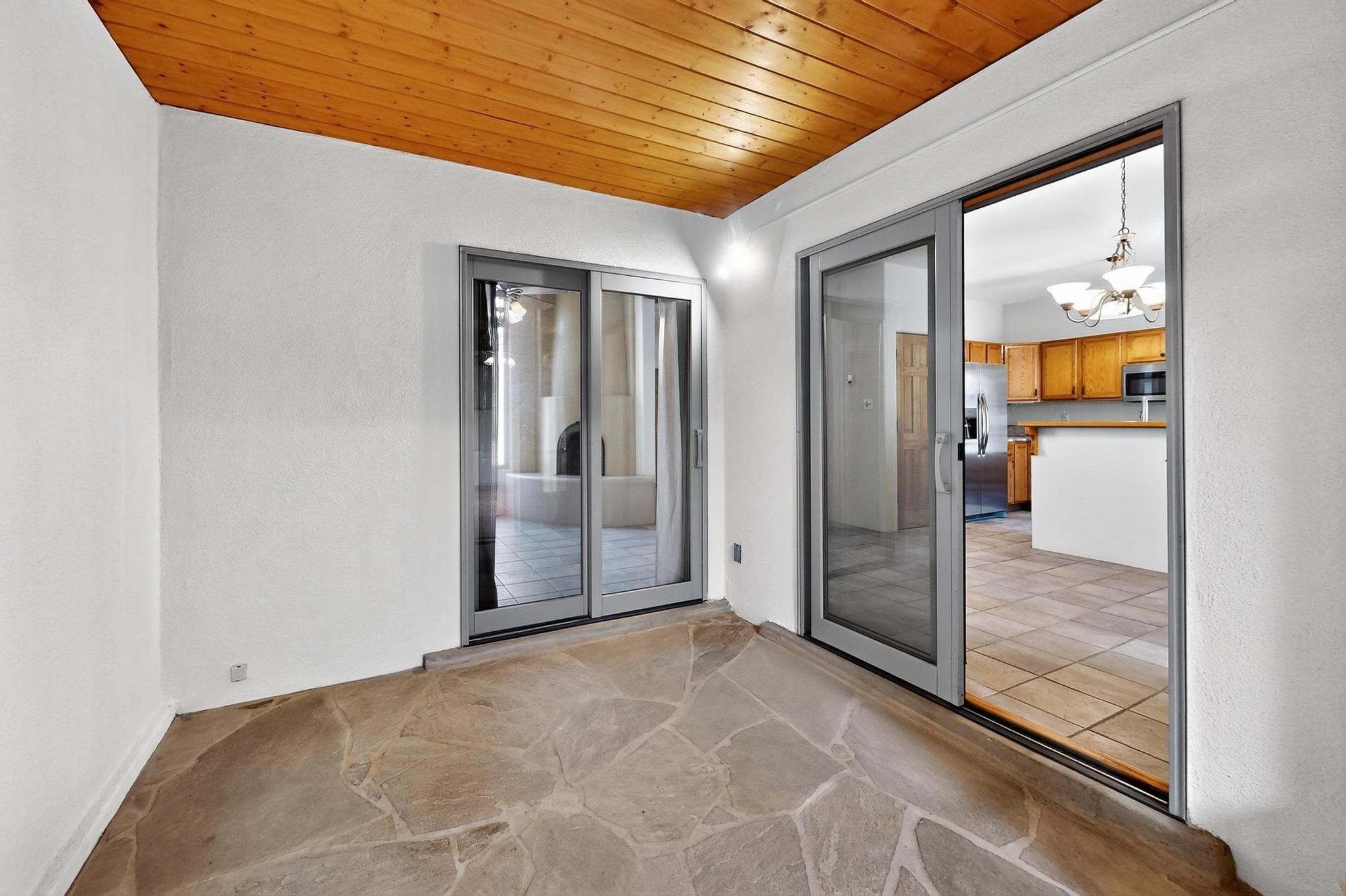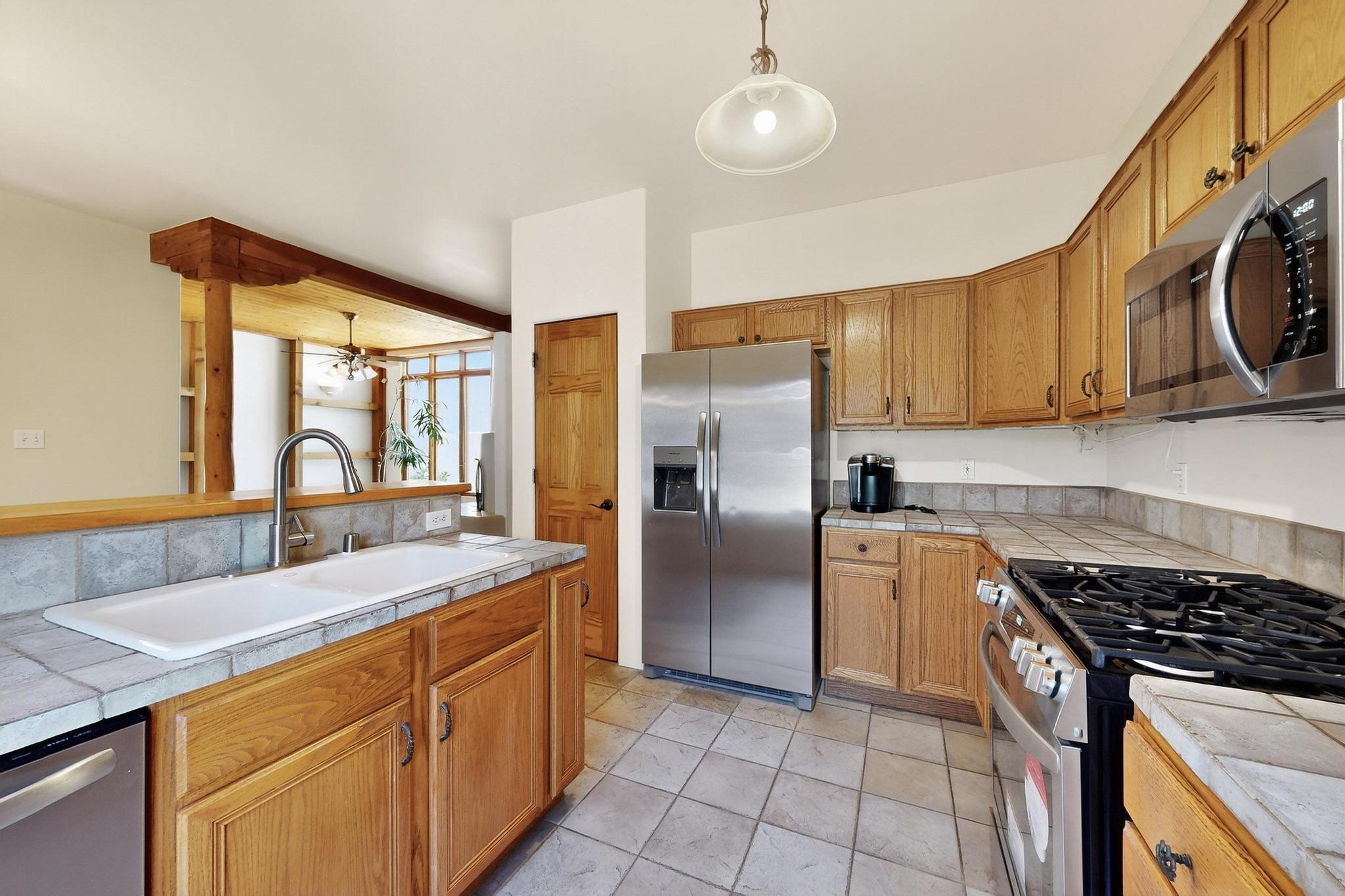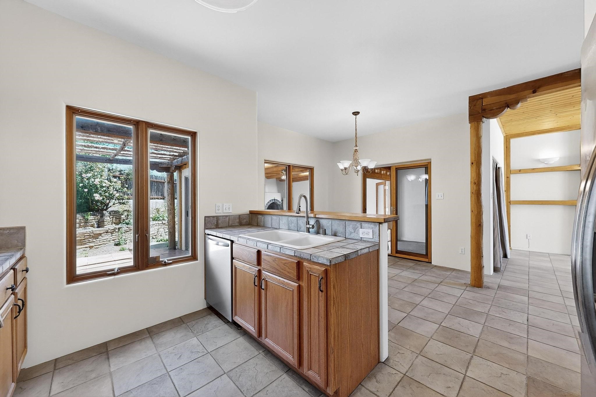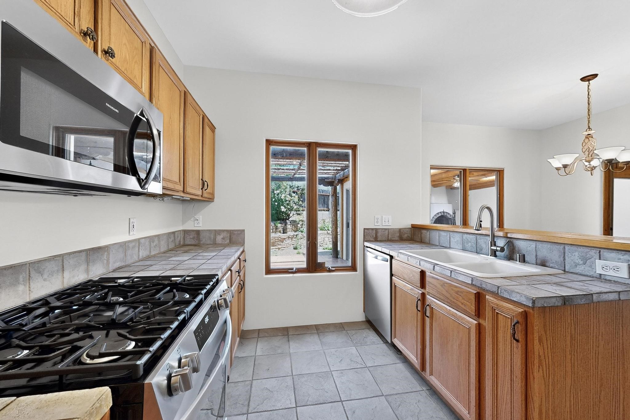 This charming Santa Fe home blends classic Southwestern character with thoughtful modern updates. A standout feature is the large room addition at the back, a true showpiece with traditional vigas, an elaborate built-in banco, oversized tile flooring, and a striking kiva fireplace. This spacious and versatile area can serve as a second living room, a creative studio, or an entertainment space. The home also boasts new kitchen appliances, radiant heat floors for cozy winter living, and two kiva fireplaces that add warmth and Southwestern charm. Two upstairs decks extend from each bedroom, providing private outdoor spaces perfect for relaxation. The interior has been freshly painted, giving the home a clean, move-in ready feel. The lush, colorful garden is complemented by a cistern system, offering an eco-friendly solution for watering. This home invites both comfort and functionality, with Santa Fe style at its core.