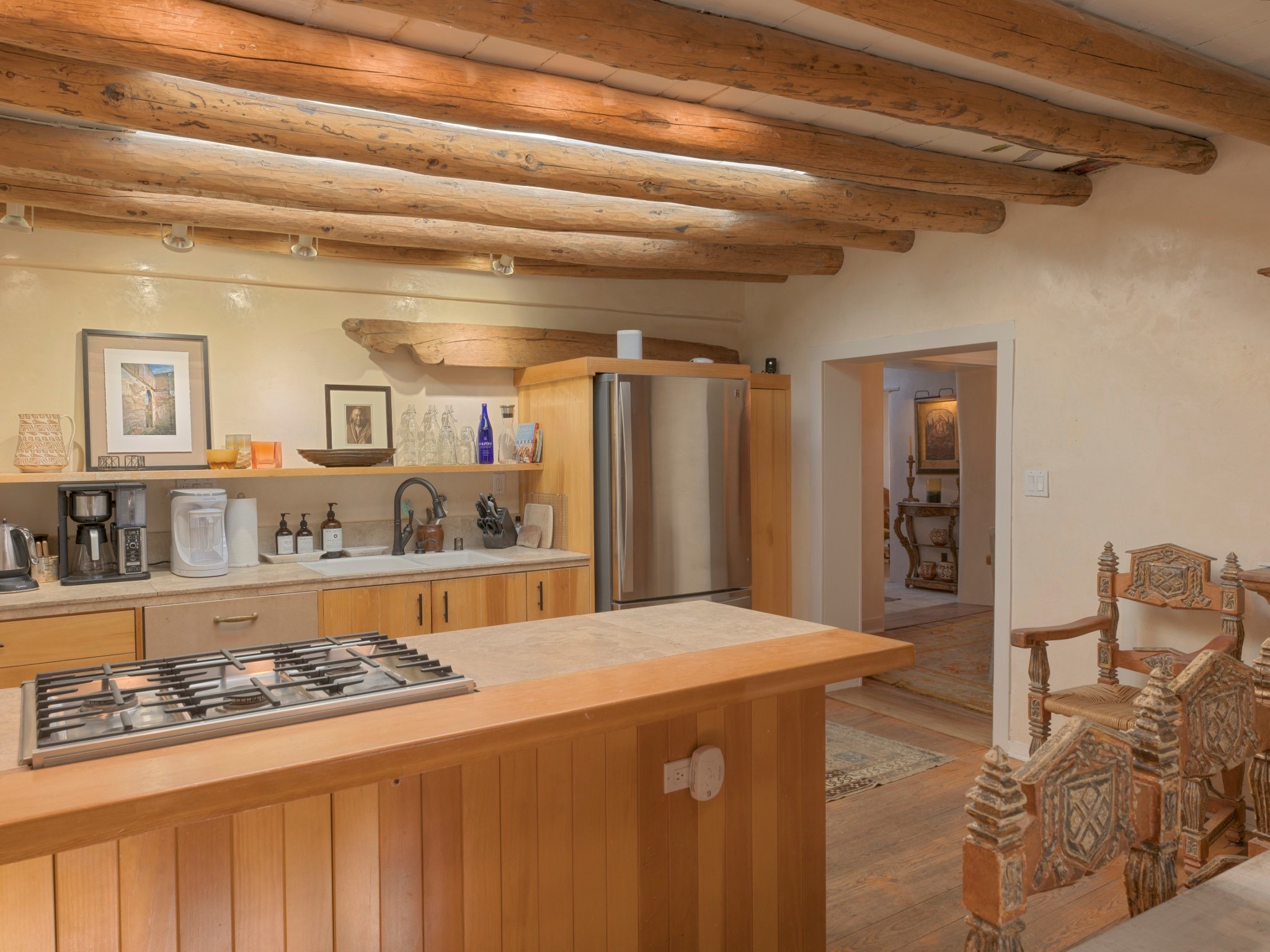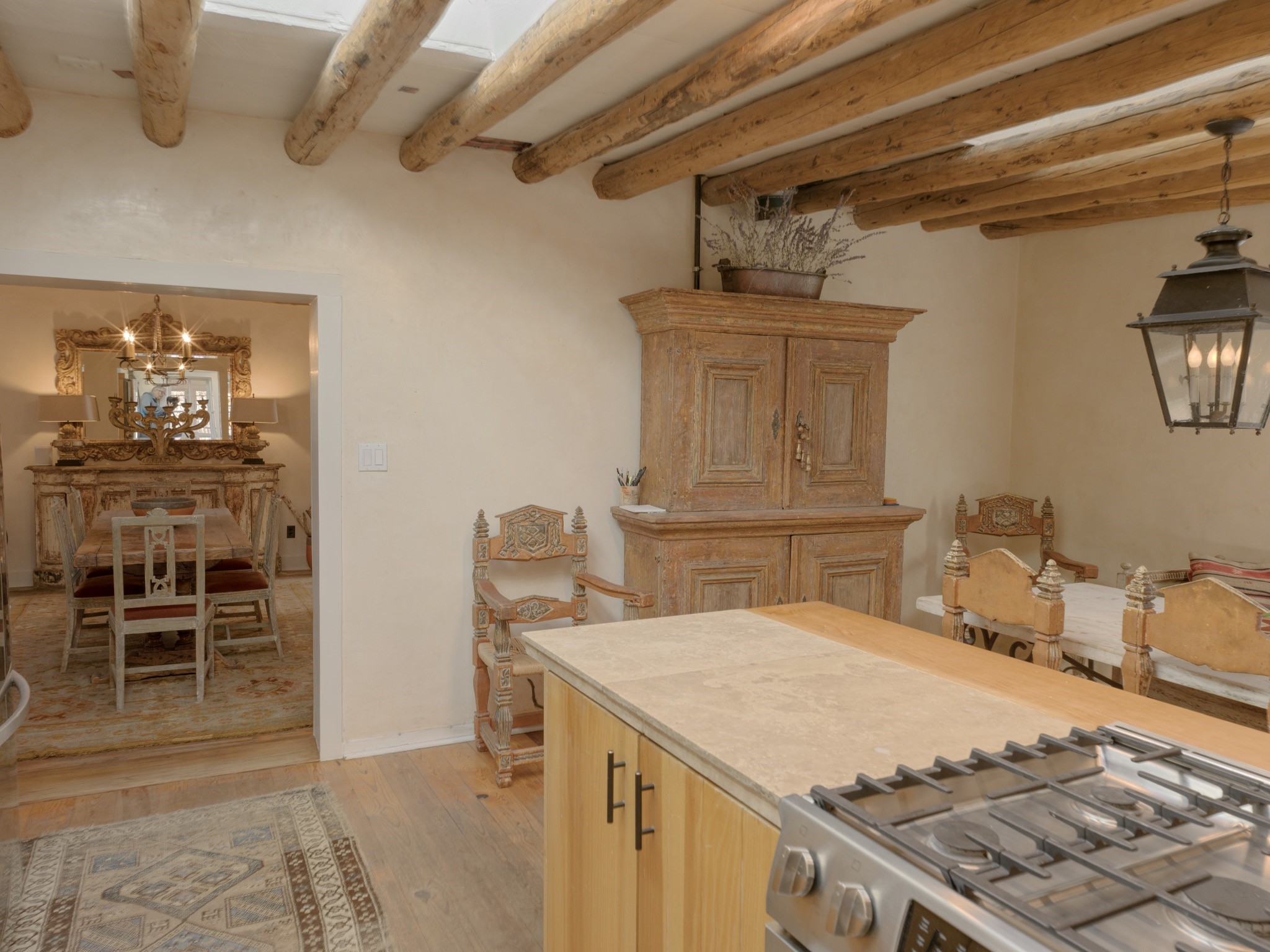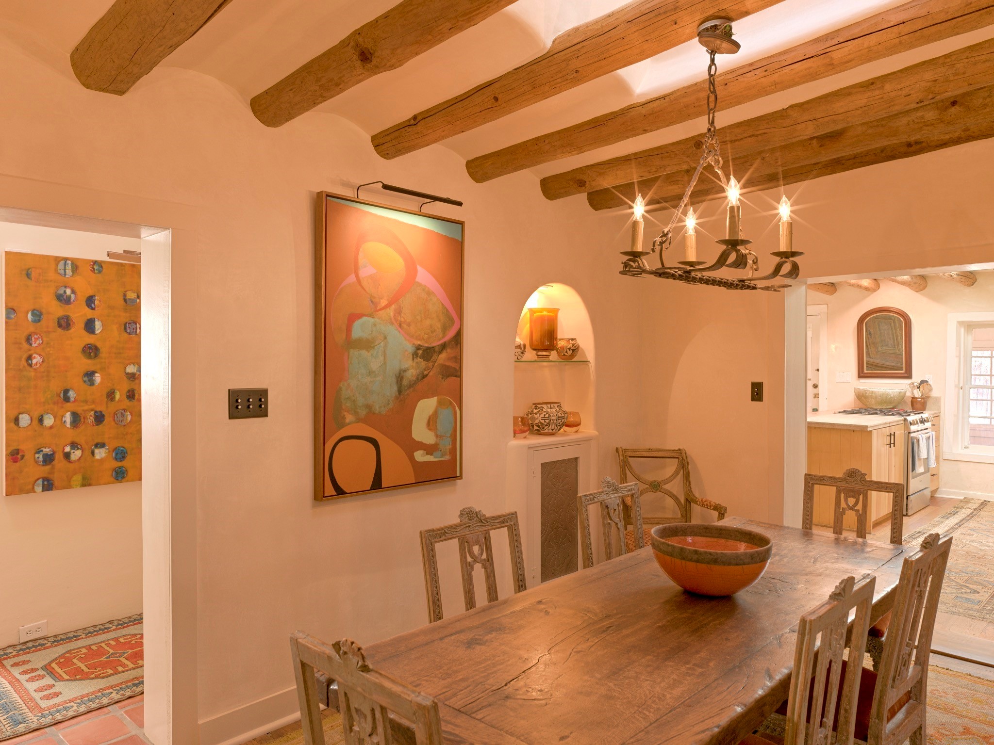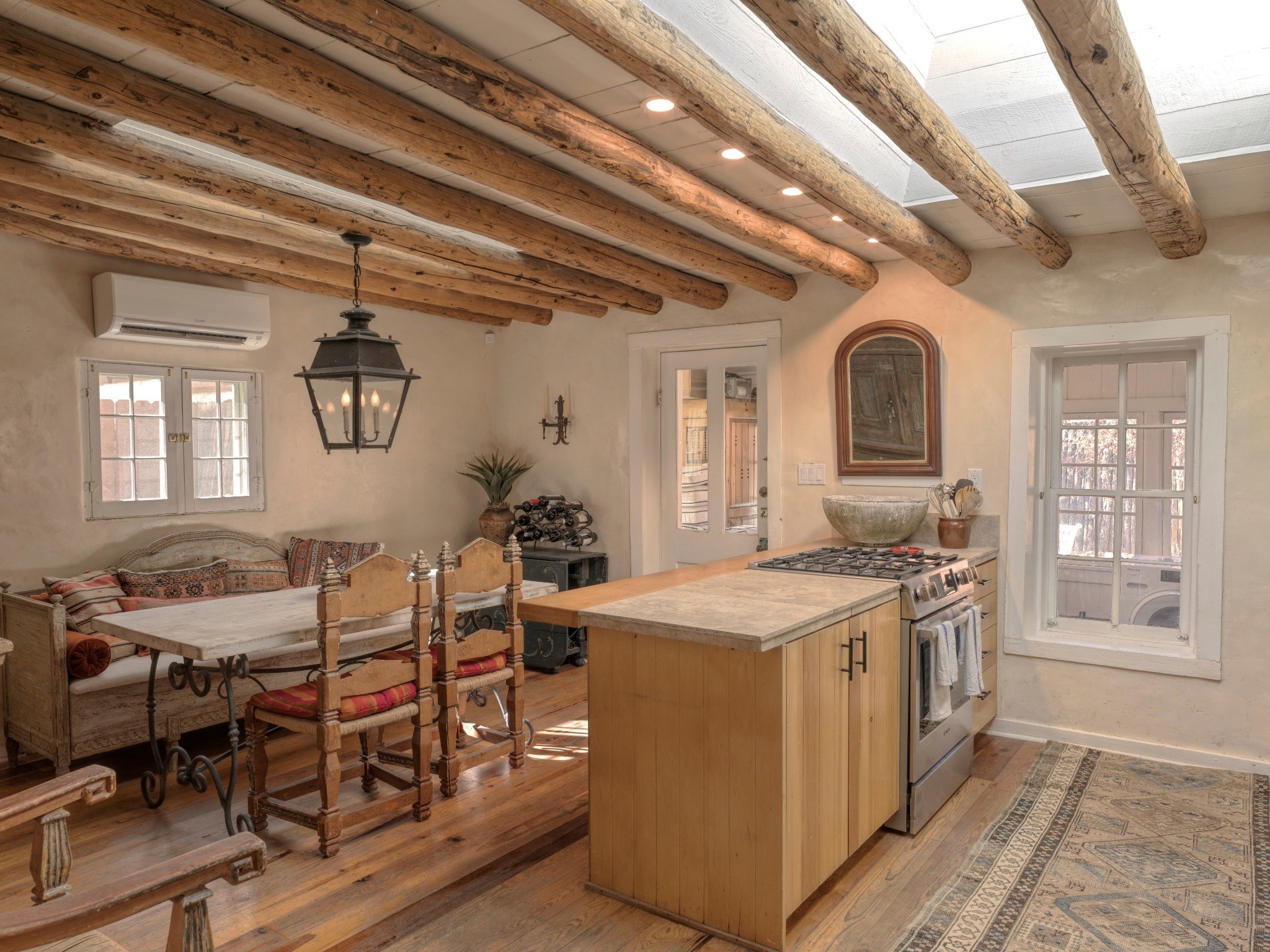 Suppose you're looking for a superb east-side location (Canyon Road is a short distance away) with a refined, intimate ambiance and excellent entertainment spaces. In that case, this might be your property. The current owners revised the floor plan so this property could be described as "first time on the market."It's a thick-walled adobe with coved plaster between exposed vigas as ceiling treatment. A traditional wood-burning Kiva fireplace occupies a corner of the living room. Skylights in common areas provide ample daylight. The main house amenities include an updated floor plan, hardwood and tile floors, a Miele dishwasher, Miele washer and dryer, mini-splits for heating or cooling, and 3-4 off-street parking places.The second bedroom is in the detached guest quarters. A private entry with a kitchenette and 3/4 bath is appointed to comprise your guest's private space. Outdoor spaces include a front seating area with a water fountain and a rear garden area.If you like the furnishings, a comprehensive furniture/art/accessory package is available, makingthis a "turn-key" property.