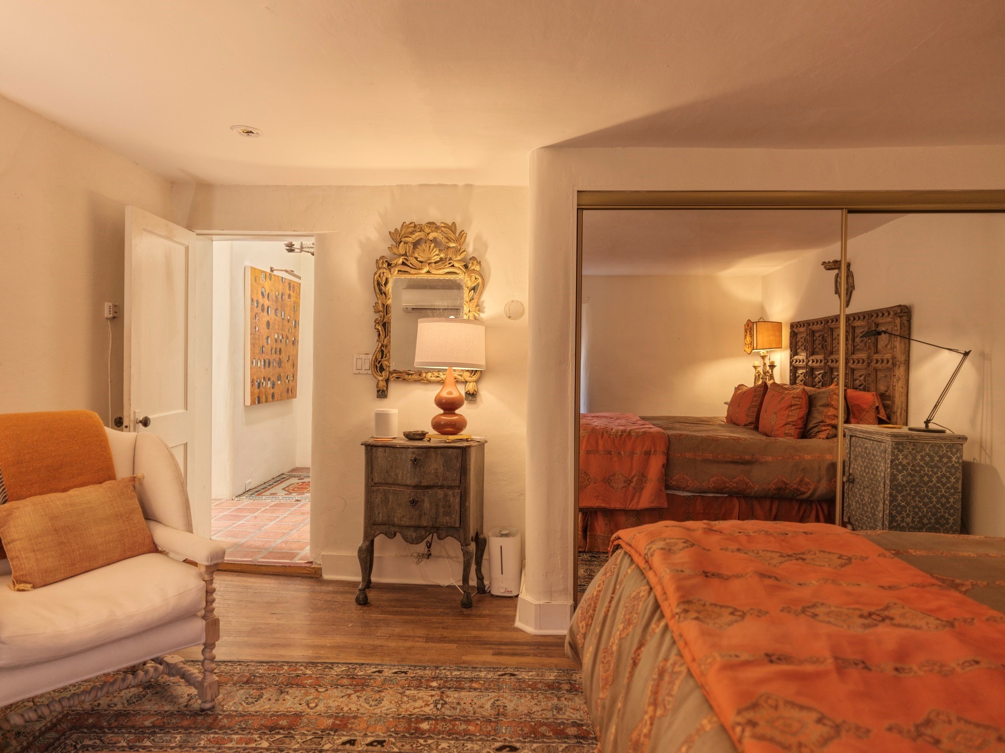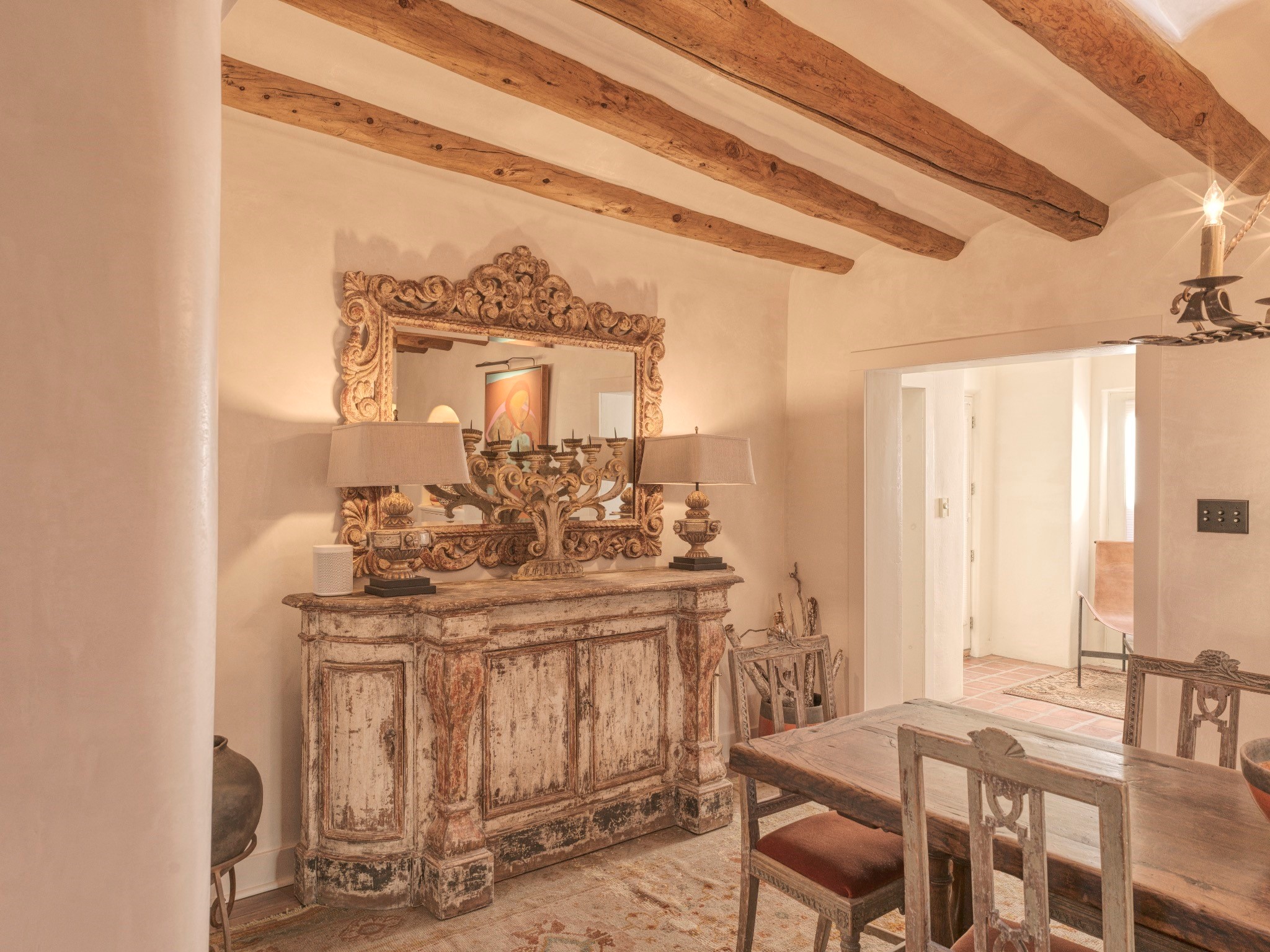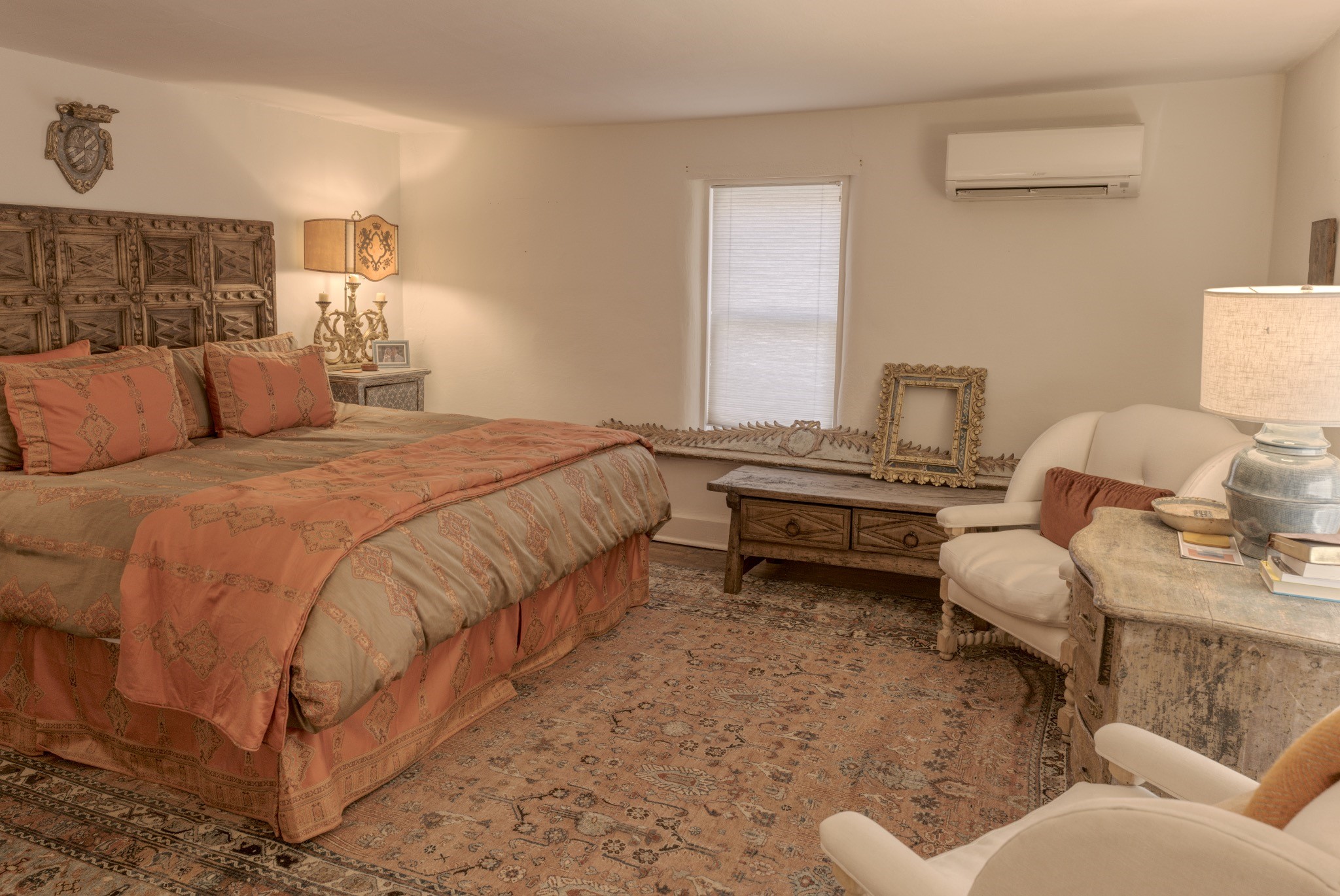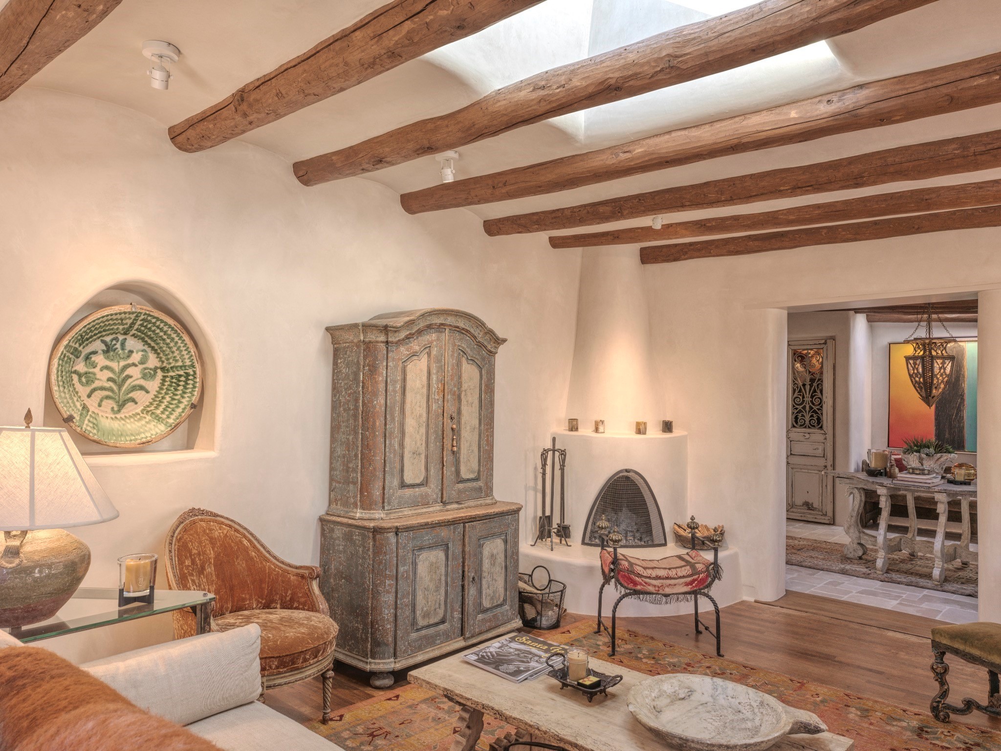 Suppose you're looking for a superb east-side location (Canyon Road is a short distance away) with a refined, intimate ambiance and excellent entertainment spaces. In that case, this might be your property. The current owners revised the floor plan so this property could be described as "first time on the market."It's a thick-walled adobe with coved plaster between exposed vigas as ceiling treatment. A traditional wood-burning Kiva fireplace occupies a corner of the living room. Skylights in common areas provide ample daylight. The main house amenities include an updated floor plan, hardwood and tile floors, a Miele dishwasher, Miele washer and dryer, mini-splits for heating or cooling, and 3-4 off-street parking places.The second bedroom is in the detached guest quarters. A private entry with a kitchenette and 3/4 bath is appointed to comprise your guest's private space. Outdoor spaces include a front seating area with a water fountain and a rear garden area.If you like the furnishings, a comprehensive furniture/art/accessory package is available, makingthis a "turn-key" property.