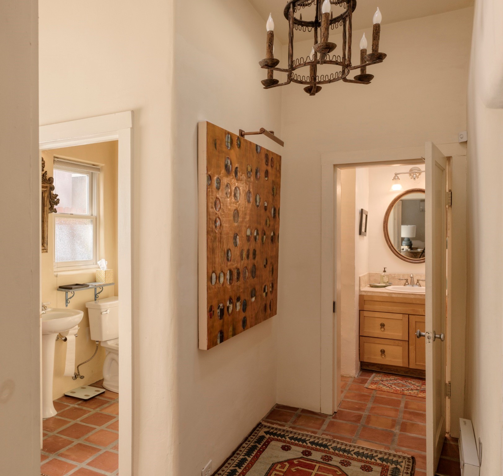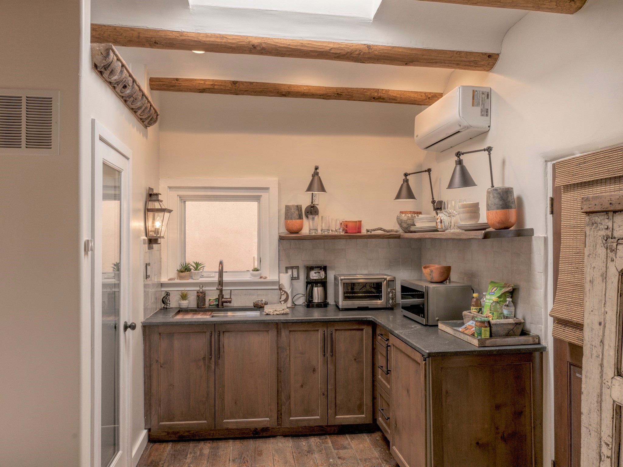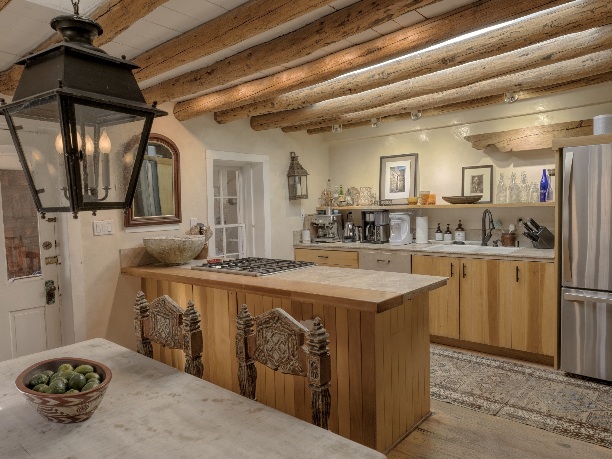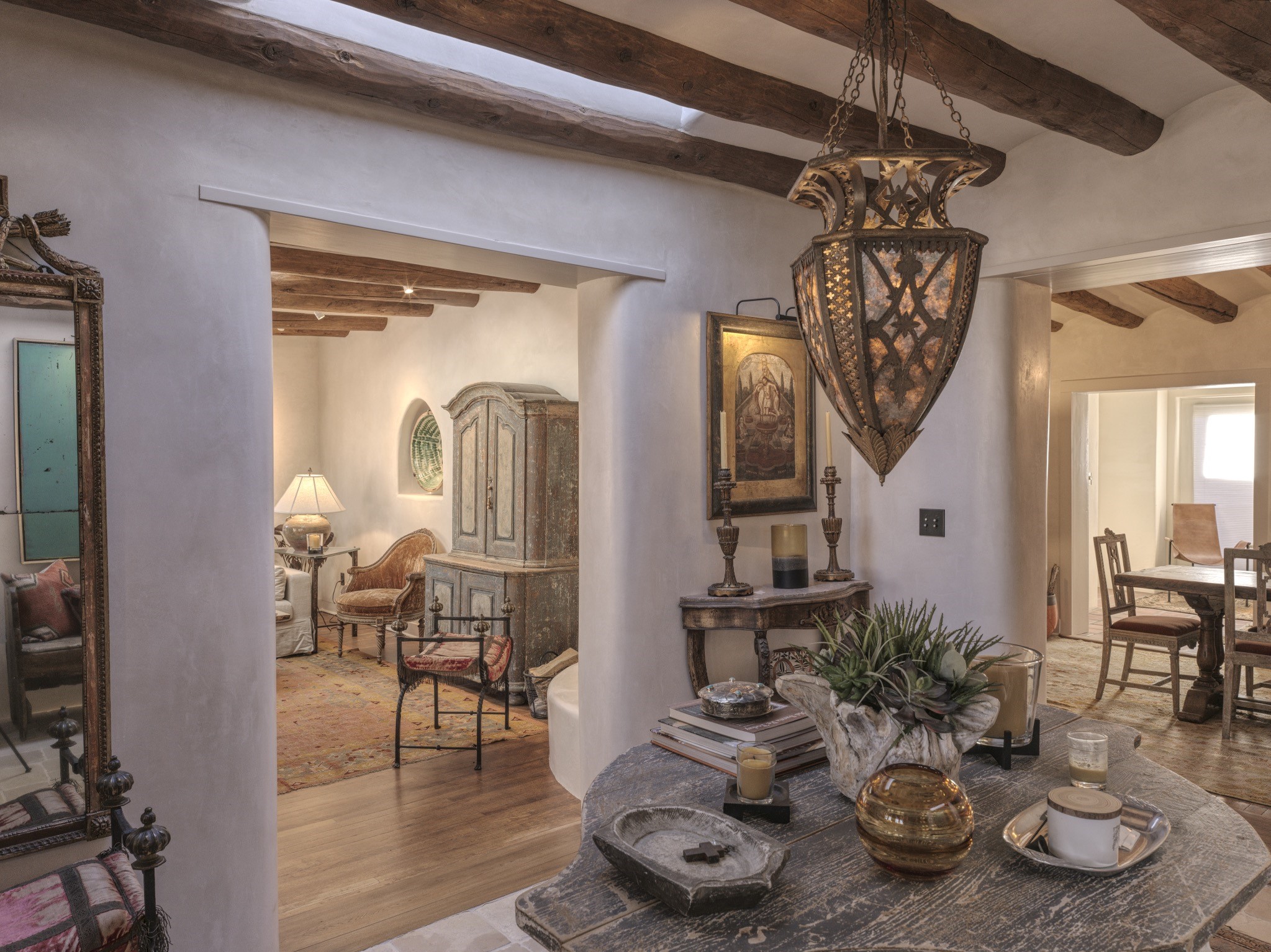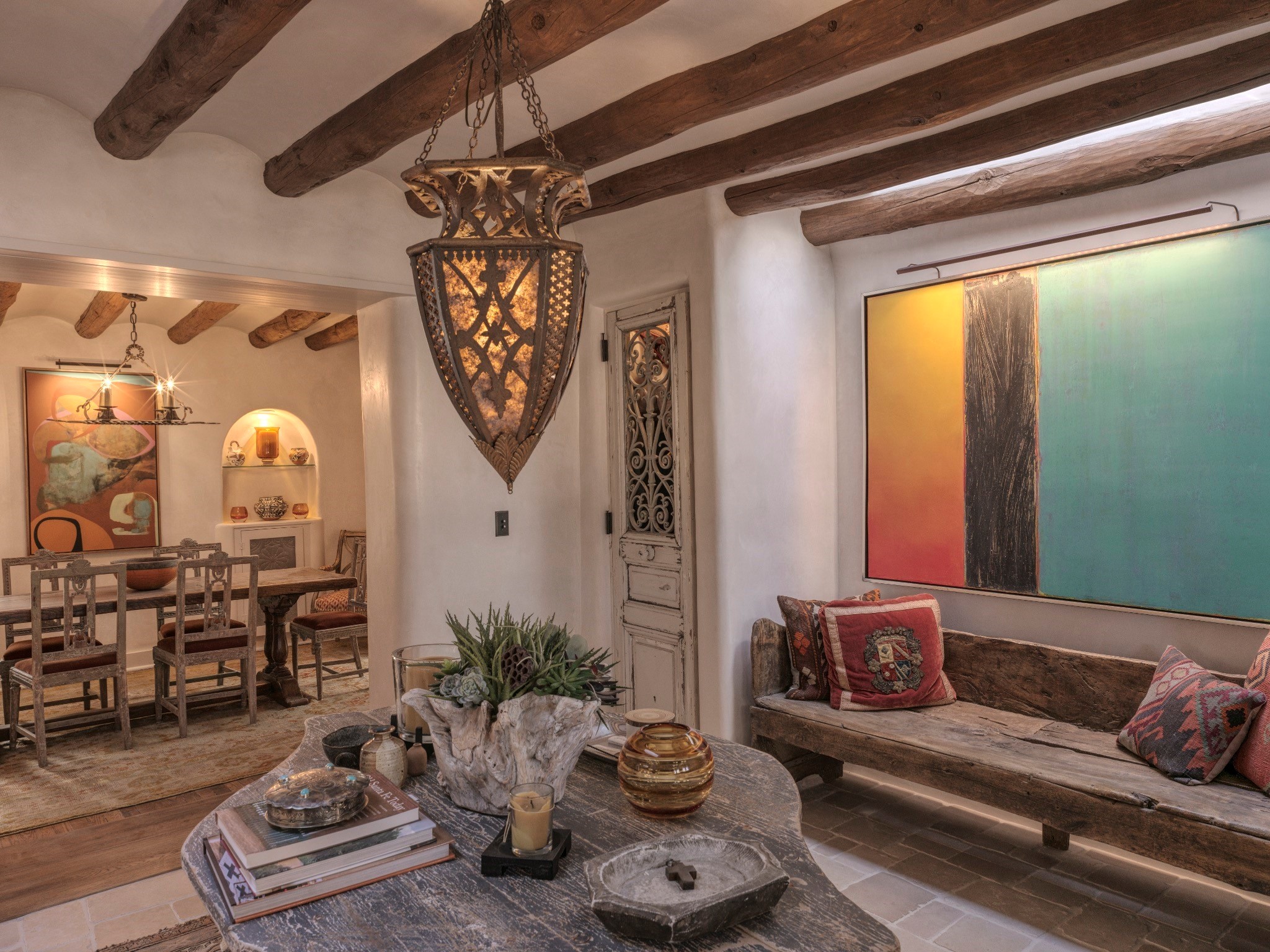 Suppose you're looking for a superb east-side location (Canyon Road is a short distance away) with a refined, intimate ambiance and excellent entertainment spaces. In that case, this might be your property. The current owners revised the floor plan so this property could be described as "first time on the market."It's a thick-walled adobe with coved plaster between exposed vigas as ceiling treatment. A traditional wood-burning Kiva fireplace occupies a corner of the living room. Skylights in common areas provide ample daylight. The main house amenities include an updated floor plan, hardwood and tile floors, a Miele dishwasher, Miele washer and dryer, mini-splits for heating or cooling, and 3-4 off-street parking places.The second bedroom is in the detached guest quarters. A private entry with a kitchenette and 3/4 bath is appointed to comprise your guest's private space. Outdoor spaces include a front seating area with a water fountain and a rear garden area.If you like the furnishings, a comprehensive furniture/art/accessory package is available, makingthis a "turn-key" property.
