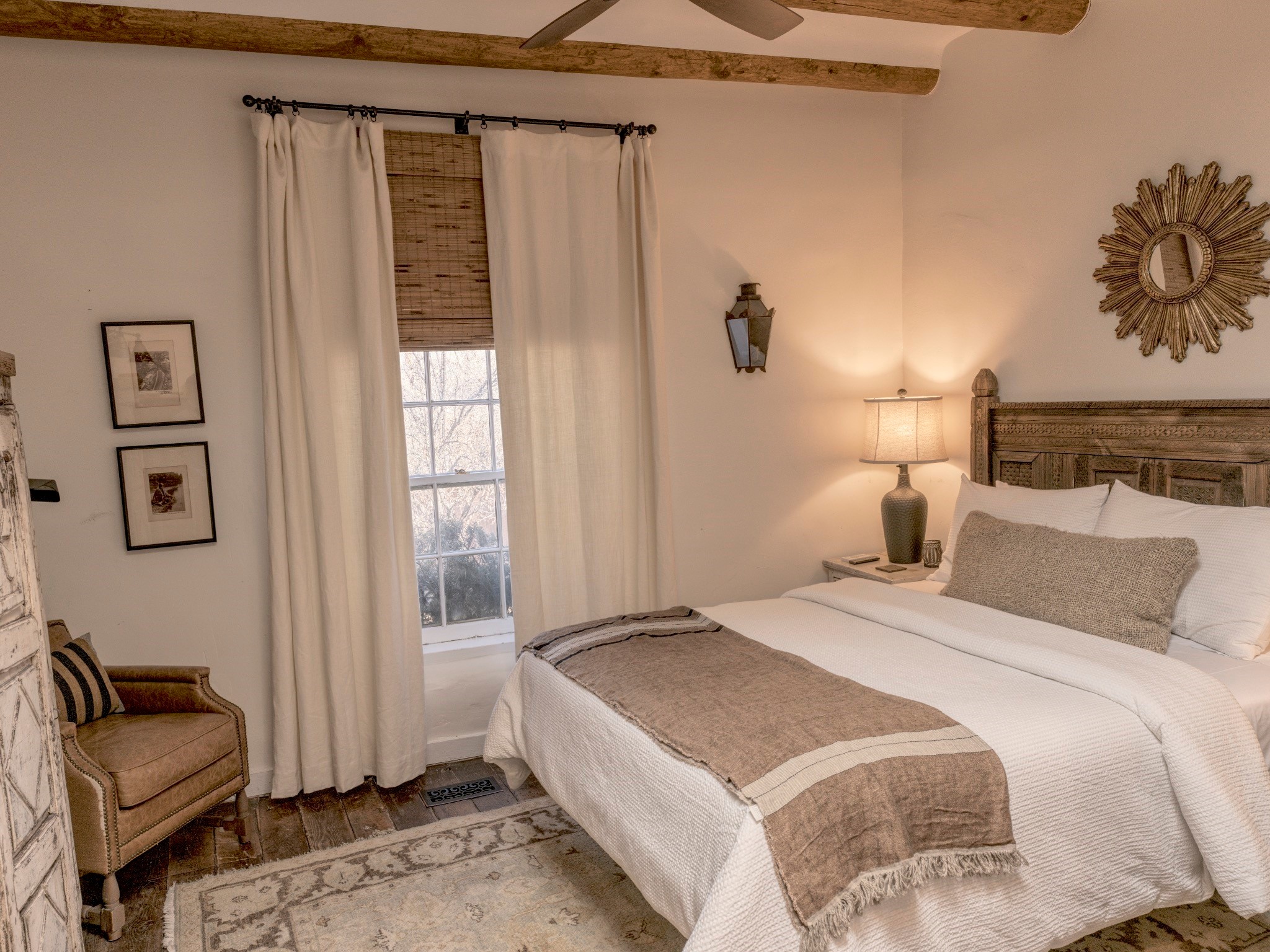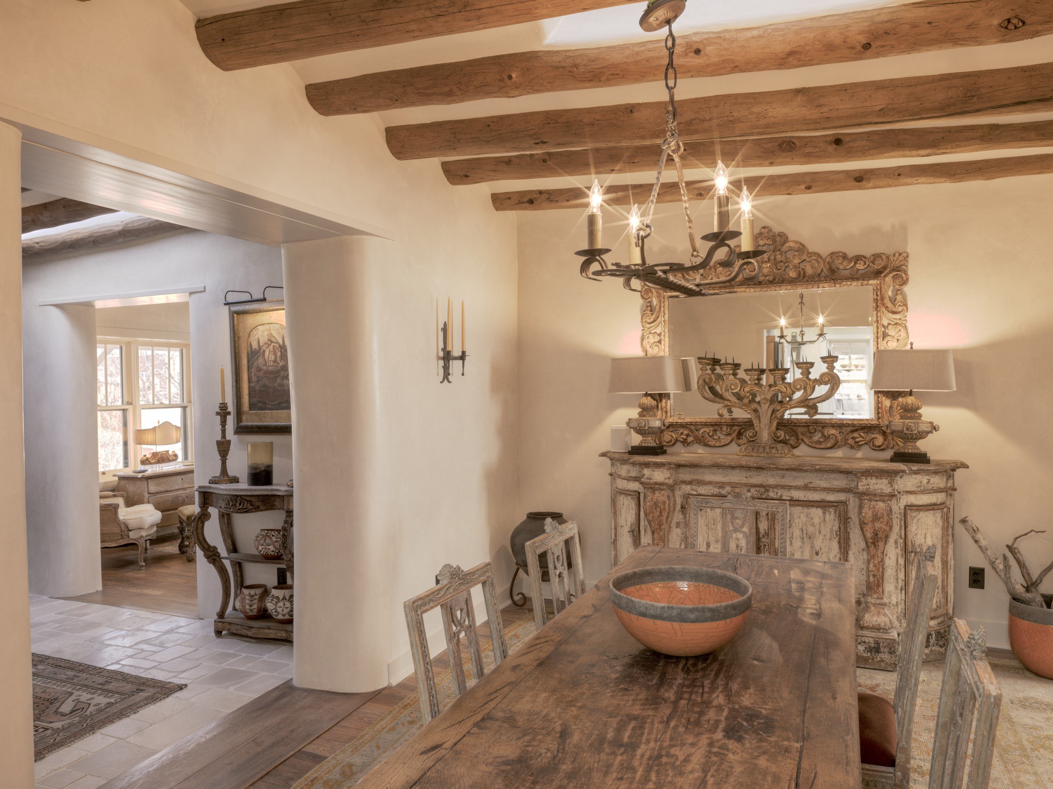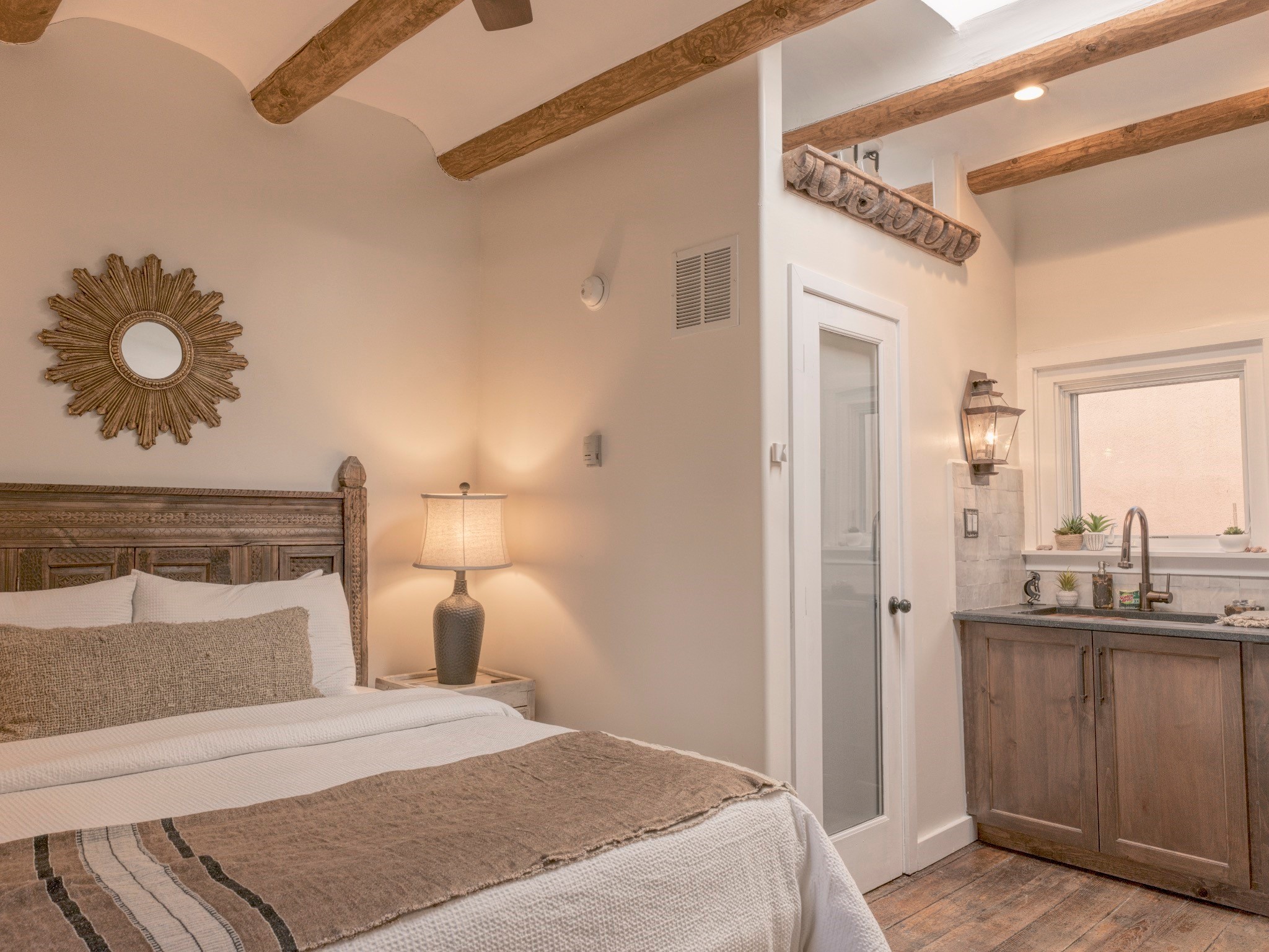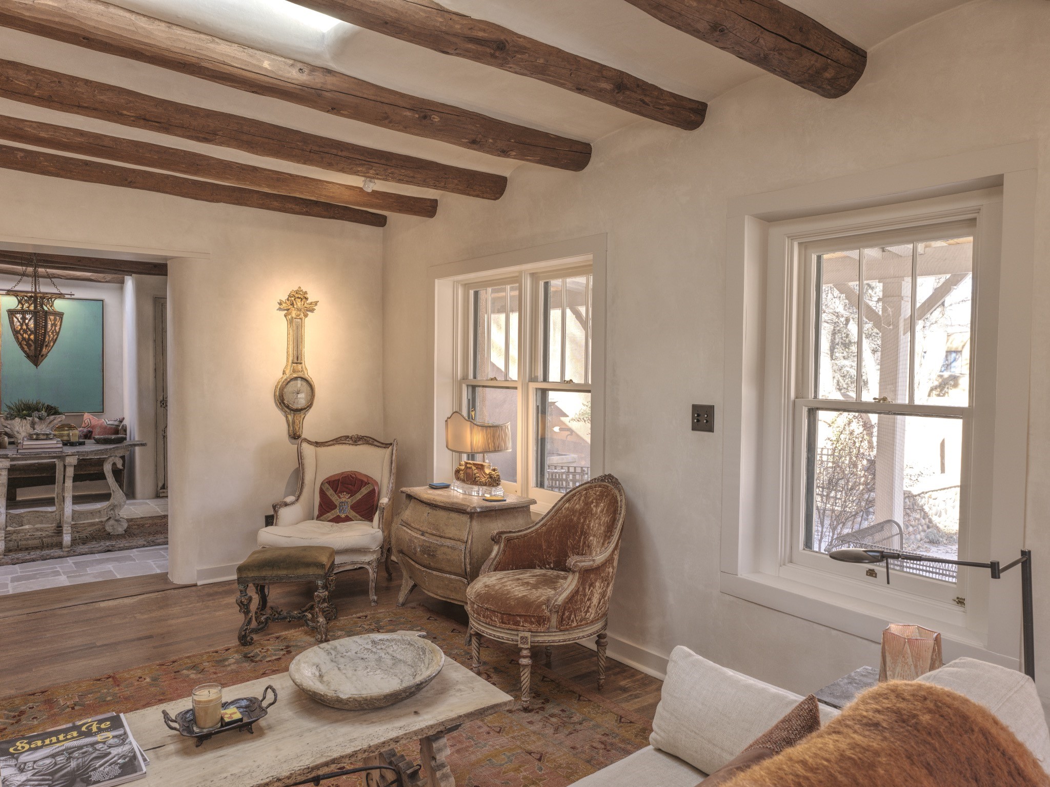 Suppose you're looking for a superb east-side location (Canyon Road is a short distance away) with a refined, intimate ambiance and excellent entertainment spaces. In that case, this might be your property. The current owners revised the floor plan so this property could be described as "first time on the market."It's a thick-walled adobe with coved plaster between exposed vigas as ceiling treatment. A traditional wood-burning Kiva fireplace occupies a corner of the living room. Skylights in common areas provide ample daylight. The main house amenities include an updated floor plan, hardwood and tile floors, a Miele dishwasher, Miele washer and dryer, mini-splits for heating or cooling, and 3-4 off-street parking places.The second bedroom is in the detached guest quarters. A private entry with a kitchenette and 3/4 bath is appointed to comprise your guest's private space. Outdoor spaces include a front seating area with a water fountain and a rear garden area.If you like the furnishings, a comprehensive furniture/art/accessory package is available, makingthis a "turn-key" property.