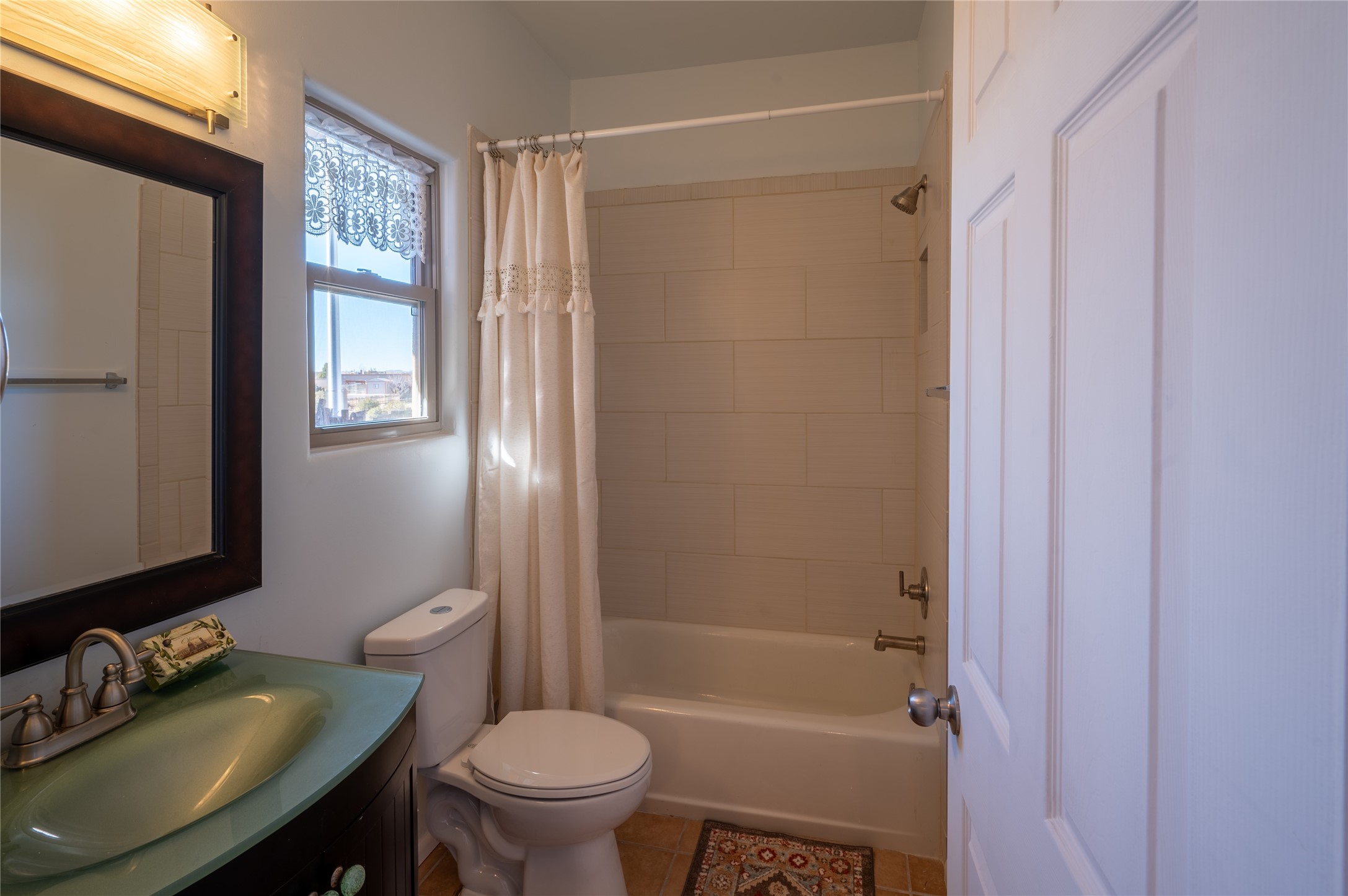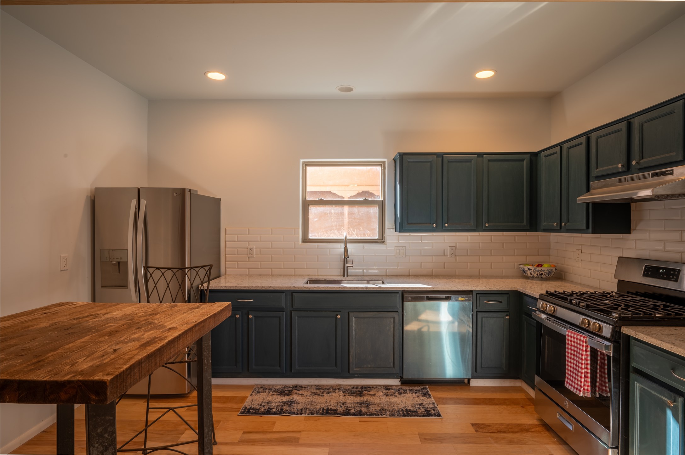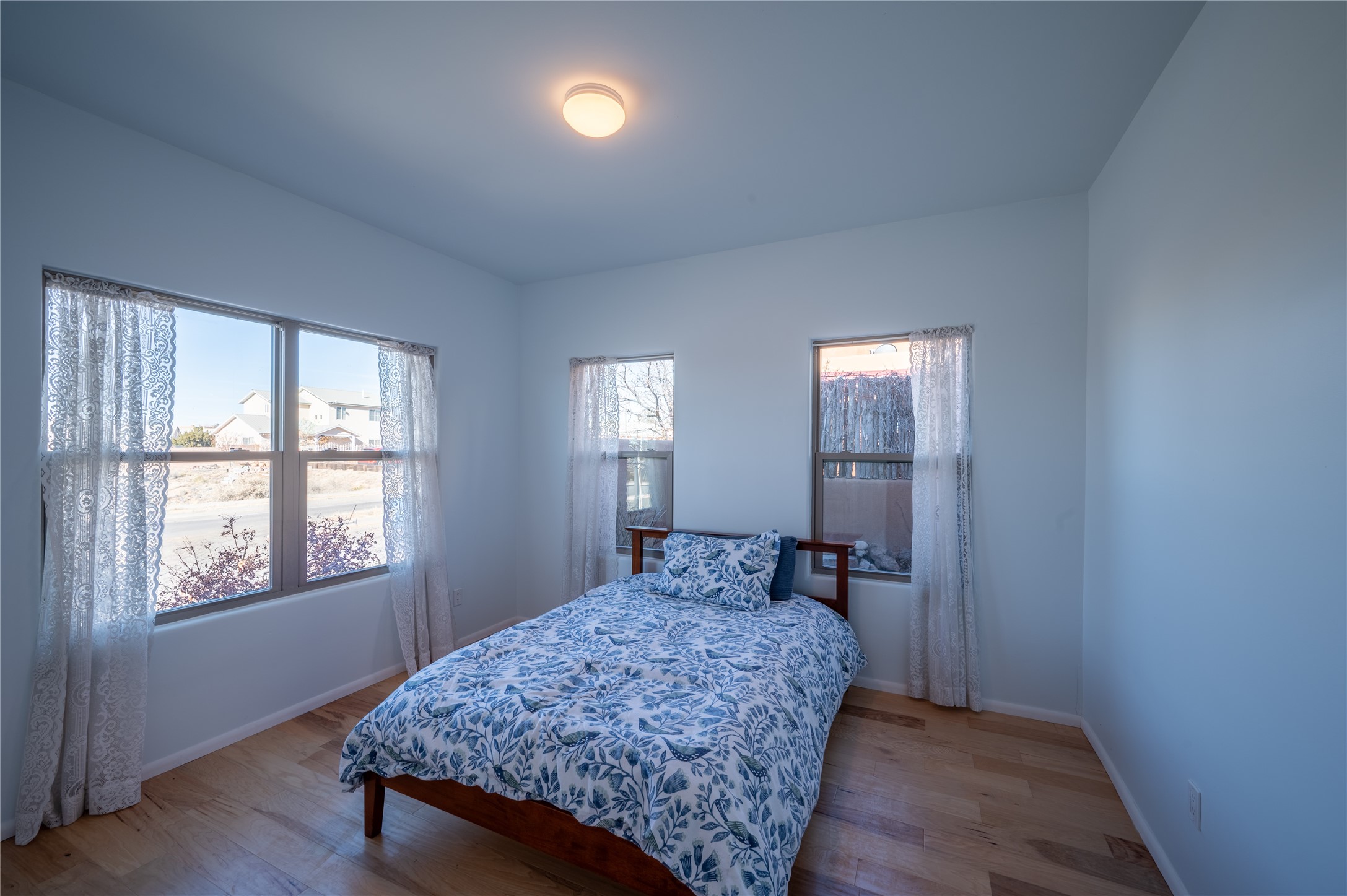 Live 8 years longer. Laugh out loud every day, eat nuts and live in a house with stairs. There is one bedroom and bath downstairs and 2 bedrooms and bath up stairs. This fully remodeled home was finished with a wood floor and tile, remodeled kitchen and baths and new appliances. The floor plan is a light filled open concept. It's very private with access to 2 lovely court yards. 2 covered parking spaces are included. Shopping and dining are not far, a great library is just a block away, and easy access to highway 599 provides for an easy commute to the airport, Los Alamos, Albuquerque and downtown Santa Fe. This price is a bargain. Come see today.