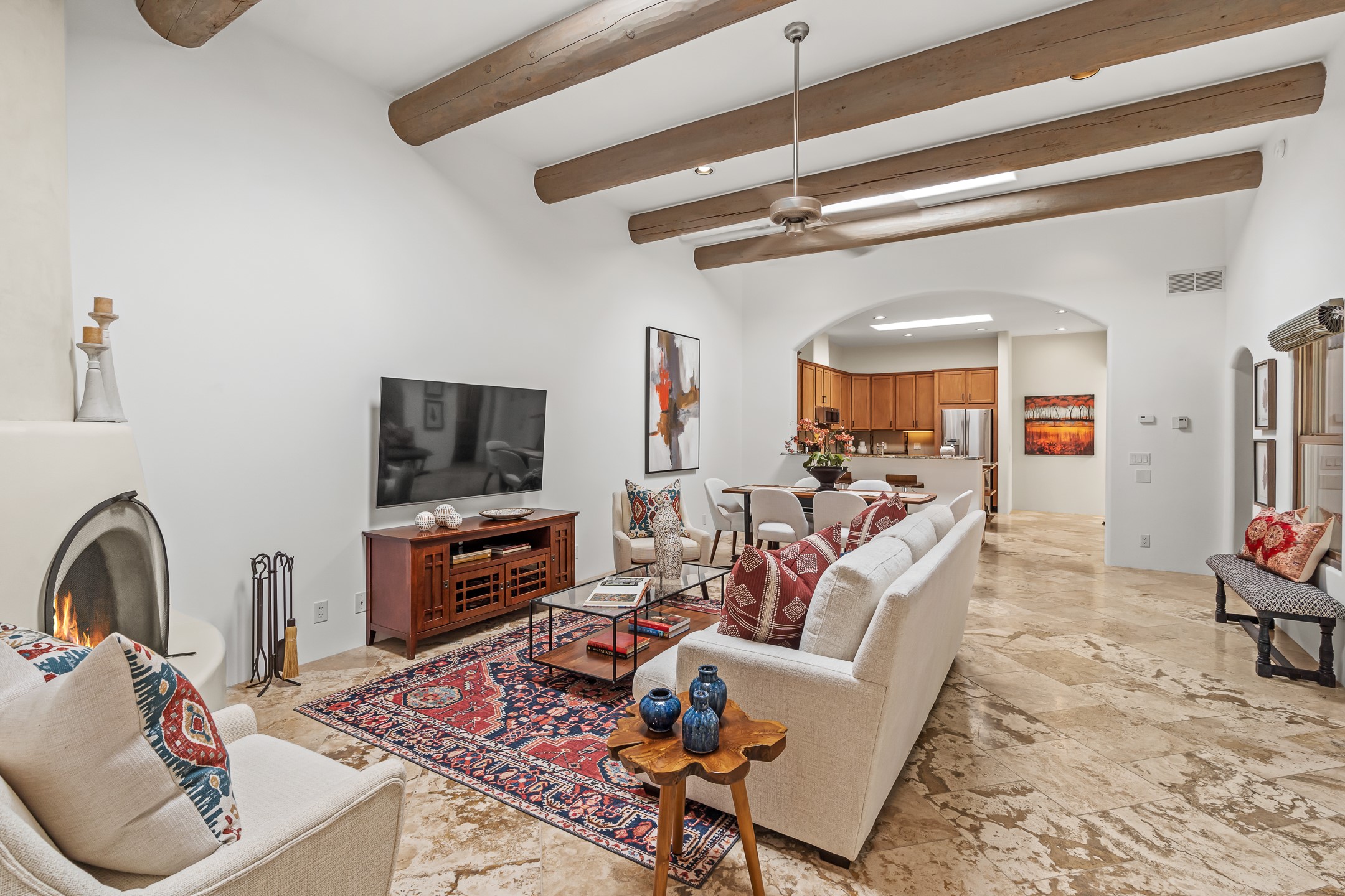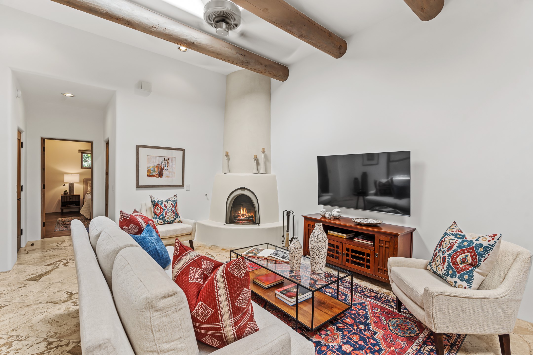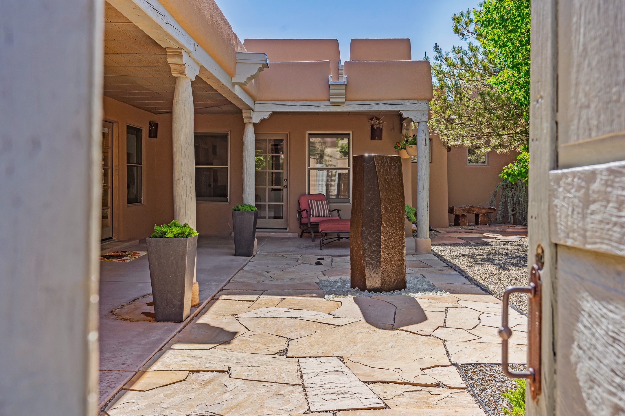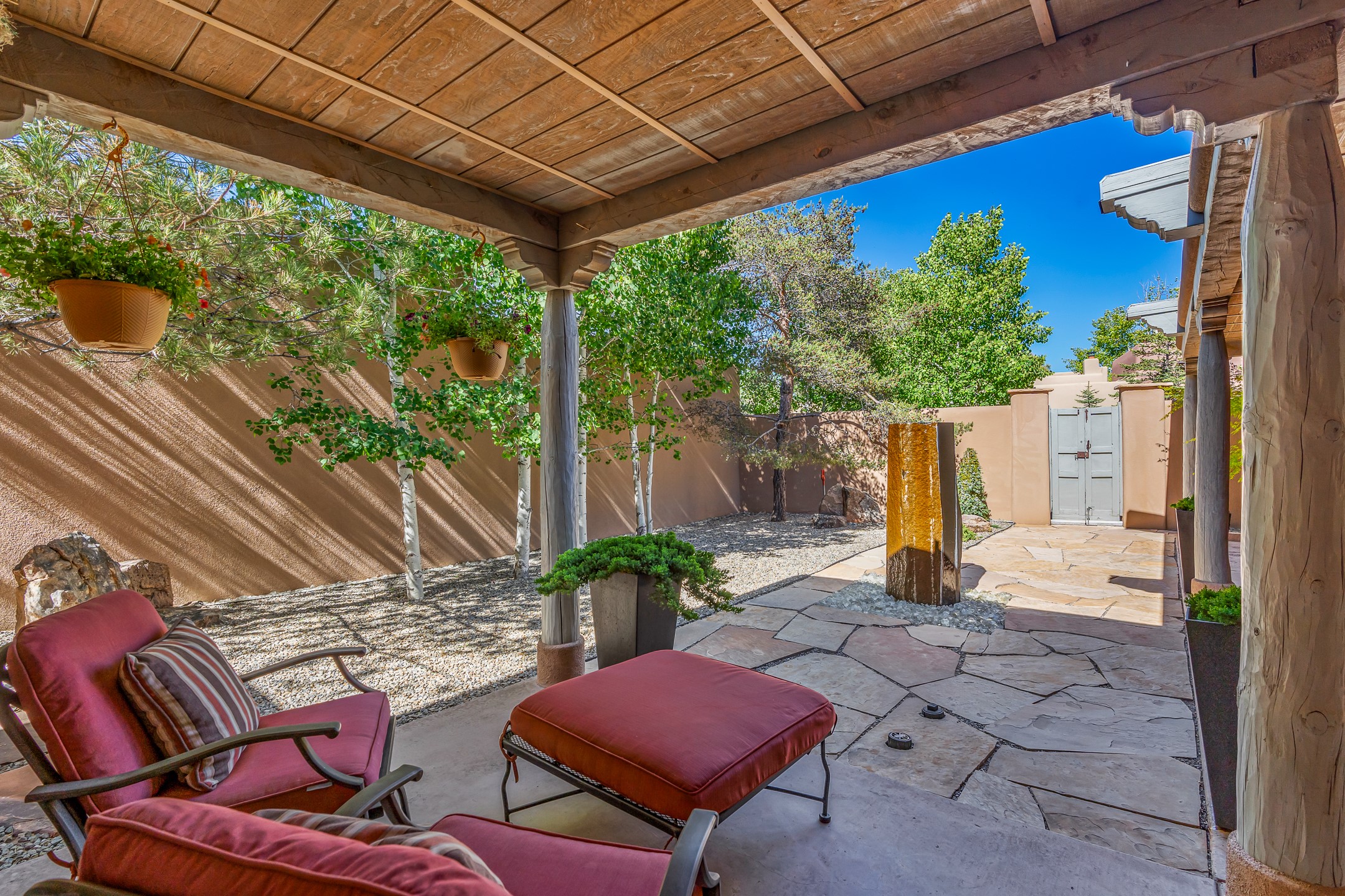 Experience Effortless Elegance in Aldea de Santa FeWelcome to your enchanting Santa Fe retreat -- a refined lock-and-leave courtyard residence crafted by Casas De Vistas. This 2-bedroom, 2-bath home effortlessly blends timeless Southwestern charm with modern comfort, offering a serene lifestyle all on one level and just minutes from the heart of Santa Fe. Step through private gates into a sun-drenched courtyard, where covered portals invite morning coffee, sunset cocktails, and peaceful moments of reflection. Inside, warm French doors open to a living space that radiates character -- soaring beamed ceilings, a cozy kiva fireplace, and cool travertine stone floors set the stage for relaxed luxury. The chef's kitchen is both functional and beautiful, with granite countertops, artful tile backsplashes, and sleek stainless steel appliances -- a perfect space to create and entertain. Both bedrooms are private sanctuaries with elegant tile floors, while the primary suite offers a tray ceiling and French doors that open directly to your secluded courtyard oasis. A spacious two-car garage adds practicality, and a fenced backyard provides the perfect space for your four-legged companions to roam safely. Whether you're seeking a full-time home or a seasonal escape, this Santa Fe gem offers low-maintenance luxury and authentic style in one of the region's most desirable communities. Here you will find 13 miles of walking trails, Tennis, pickle ball and Basket ball court, many parks throughout, including one with a playground, acres of open space with views and a coffee shop on the plaza. On site HOA Management. Come explore the active lifestyle this new urbanist community has to offer.