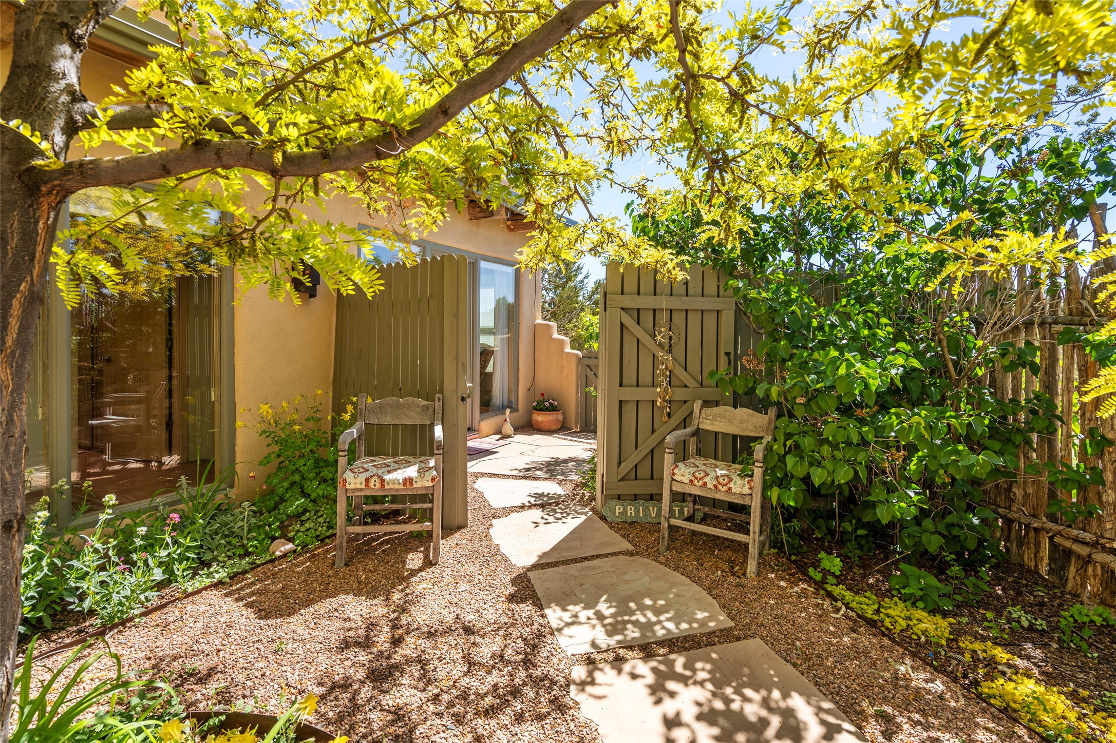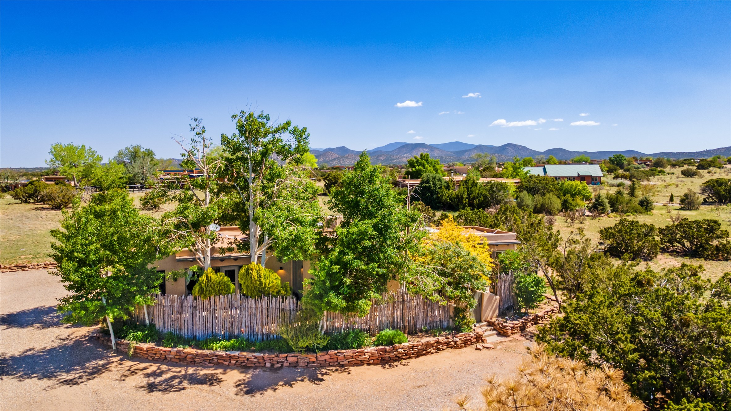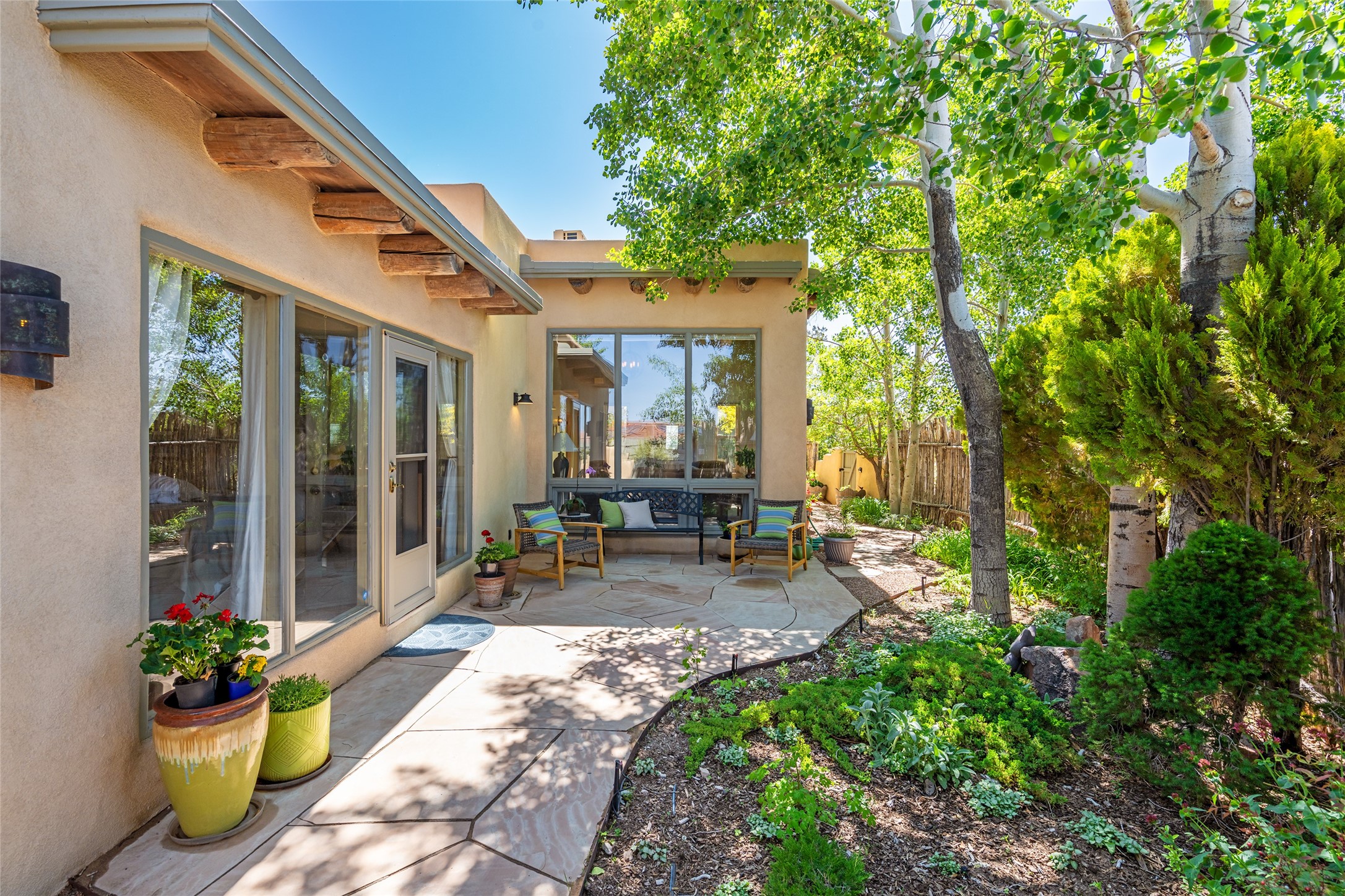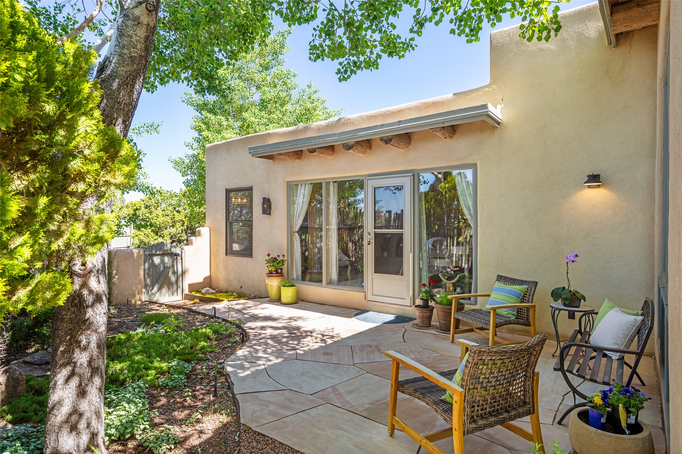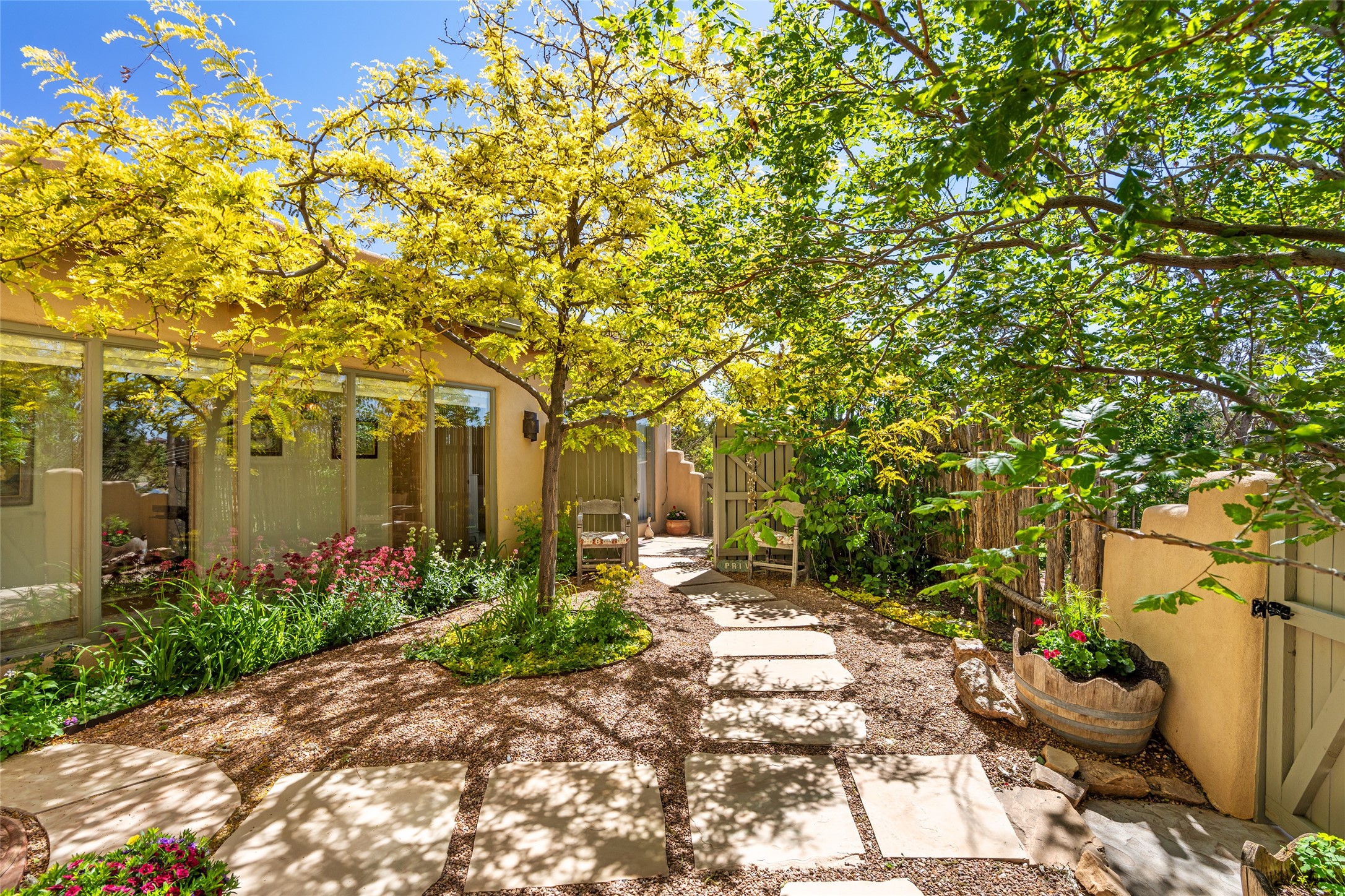 Discover the beauty and serenity of this stunningly landscaped Santa Fe retreat at 22 Esquila Rd. Boasting 3 bedrooms and 2 bathrooms, this thoughtfully designed and updated home offers a perfect blend of Southwestern charm and modern comfort.The primary suite is a true sanctuary, featuring a cozy corner kiva fireplace, a spacious walk-in closet, and bathroom with jetted tub--ideal for relaxation after a busy day. The open kitchen with stainless steel appliances is directly connected to the living area which is airy and inviting; soaring ceilings and vibrant Vigas add authentic southwestern character. Large windows flood the space with natural light and frame breathtaking views of the gorgeously landscaped patio courtyard, creating an idyllic setting for outdoor entertaining or quiet retreat. The lovely guest room is a second primary with adjoining bathroom which opens into the courtyard.Step outside to your private oasis where meticulously curated gardens on a timed sprinkler system create a peaceful haven with vibrant coloring plants. The landscaping was designed for maximum color and minimum maintenance. Walk out onto inviting patios with plentiful shade provided by mature Aspens in the warm Summer months. Whether enjoying a morning coffee or hosting friends beneath the starry sky, this property seamlessly combines indoor comfort with outdoor paradise.Don't miss the opportunity to make this beautifully landscaped Santa Fe home your own!