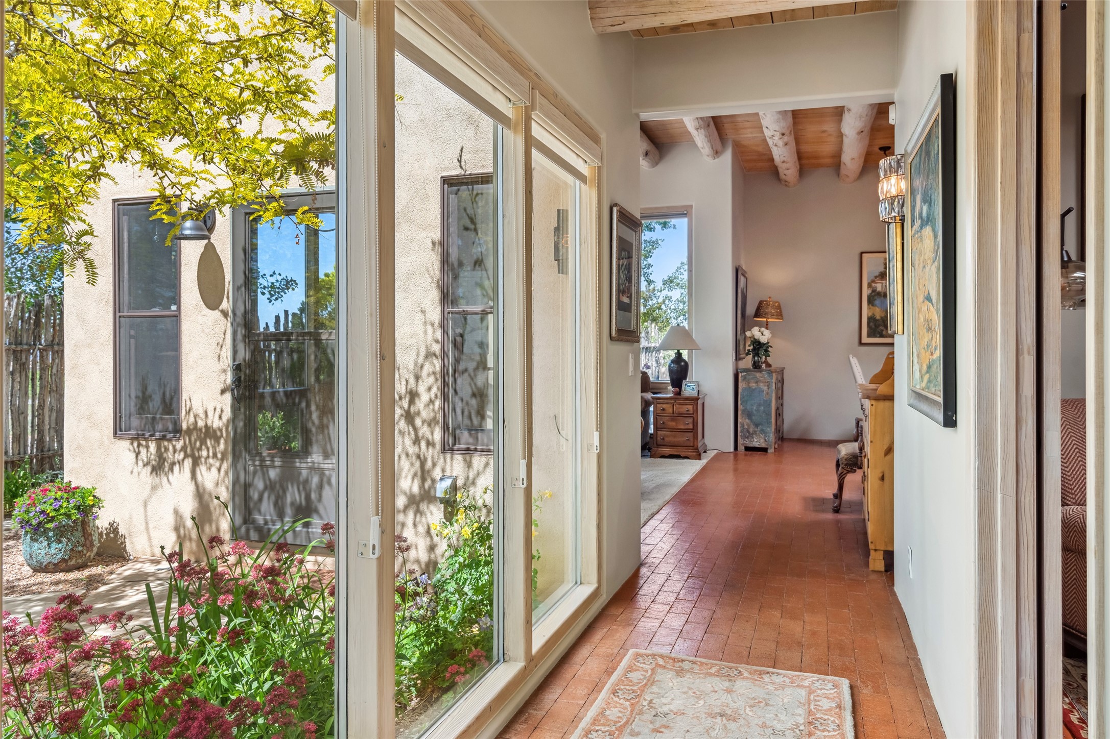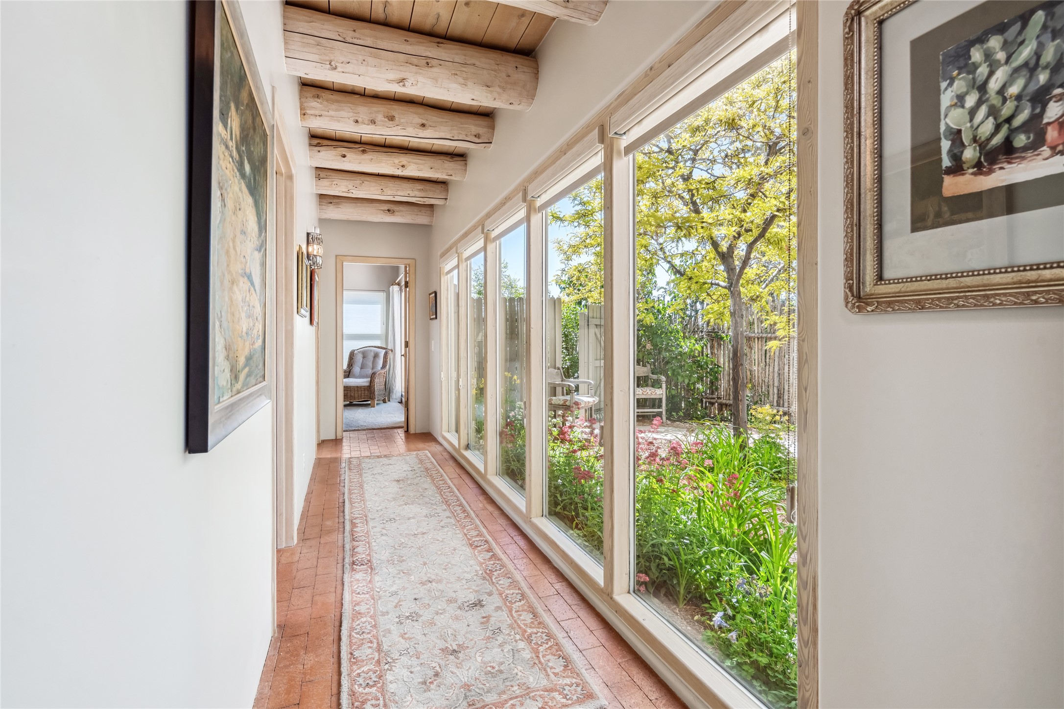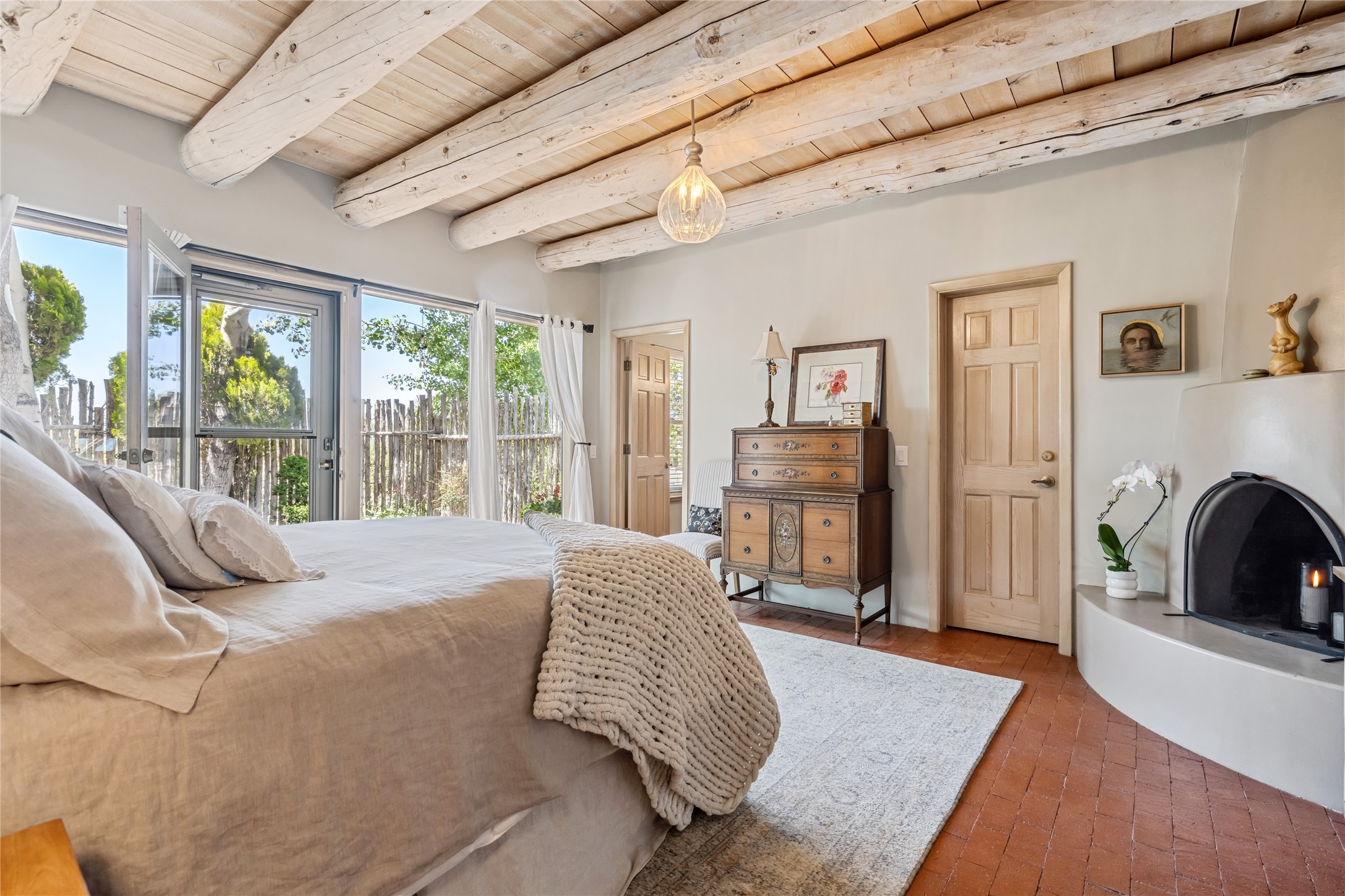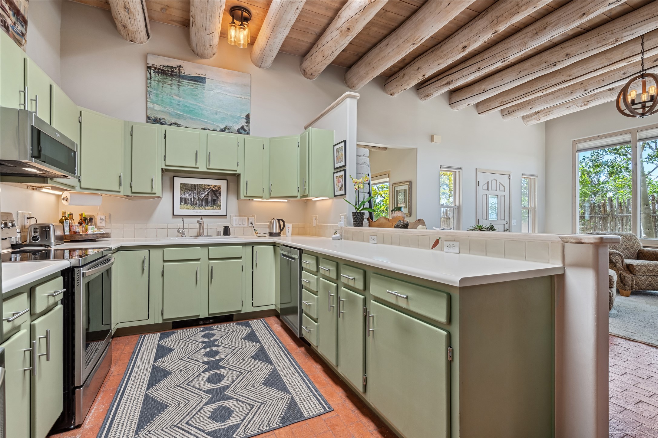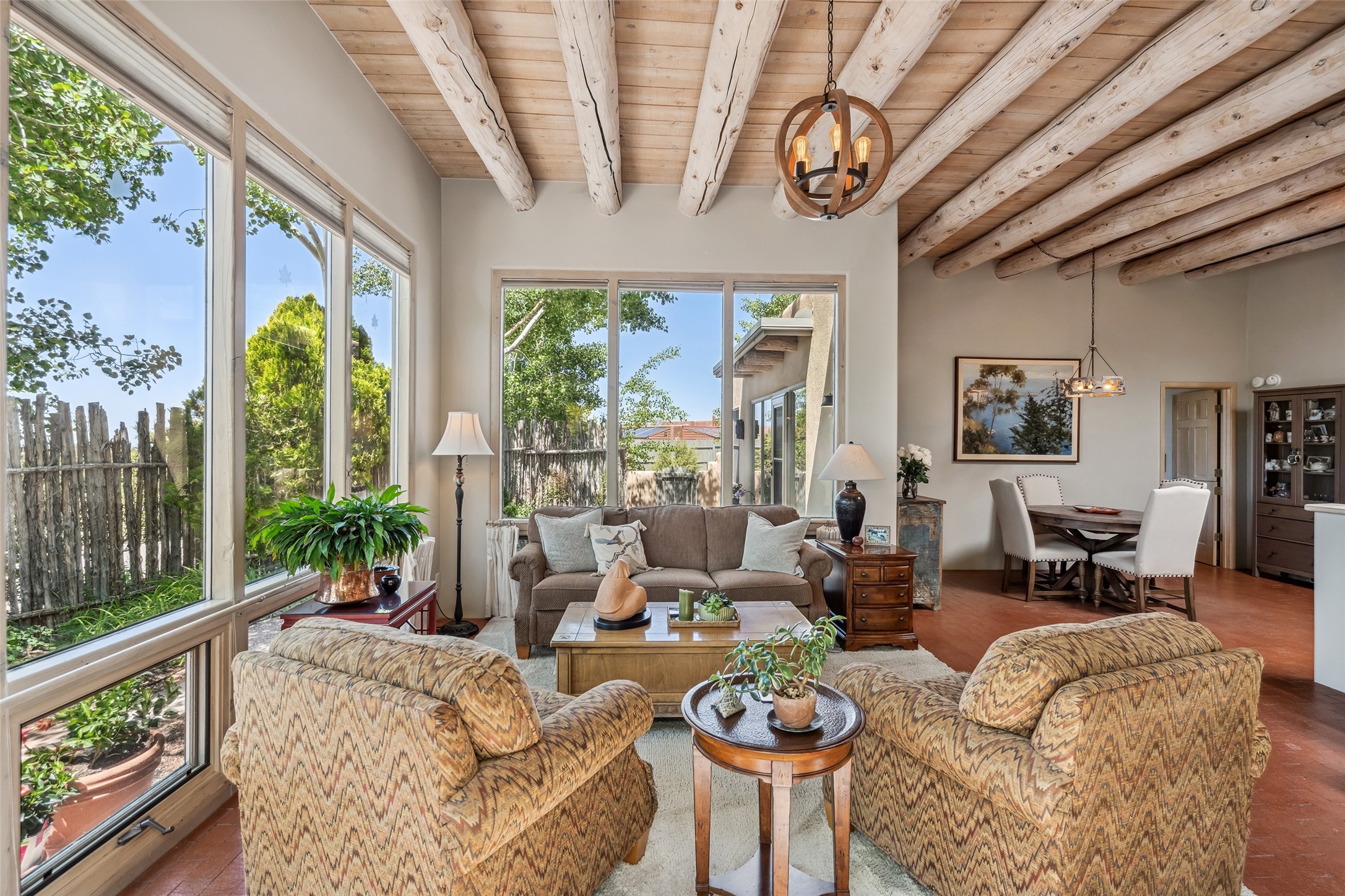 Discover the beauty and serenity of this stunningly landscaped Santa Fe retreat at 22 Esquila Rd. Boasting 3 bedrooms and 2 bathrooms, this thoughtfully designed and updated home offers a perfect blend of Southwestern charm and modern comfort.The primary suite is a true sanctuary, featuring a cozy corner kiva fireplace, a spacious walk-in closet, and bathroom with jetted tub--ideal for relaxation after a busy day. The open kitchen with stainless steel appliances is directly connected to the living area which is airy and inviting; soaring ceilings and vibrant Vigas add authentic southwestern character. Large windows flood the space with natural light and frame breathtaking views of the gorgeously landscaped patio courtyard, creating an idyllic setting for outdoor entertaining or quiet retreat. The lovely guest room is a second primary with adjoining bathroom which opens into the courtyard.Step outside to your private oasis where meticulously curated gardens on a timed sprinkler system create a peaceful haven with vibrant coloring plants. The landscaping was designed for maximum color and minimum maintenance. Walk out onto inviting patios with plentiful shade provided by mature Aspens in the warm Summer months. Whether enjoying a morning coffee or hosting friends beneath the starry sky, this property seamlessly combines indoor comfort with outdoor paradise.Don't miss the opportunity to make this beautifully landscaped Santa Fe home your own!