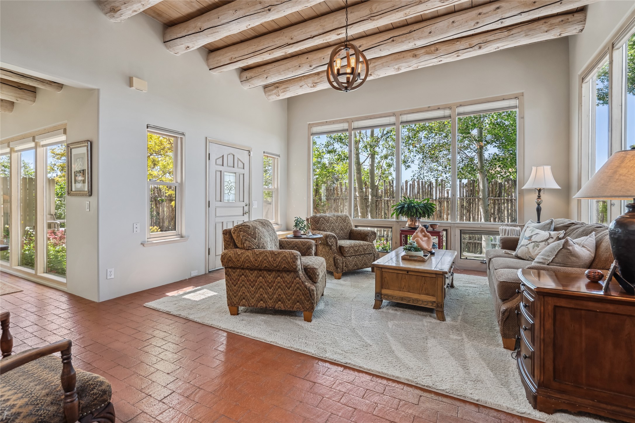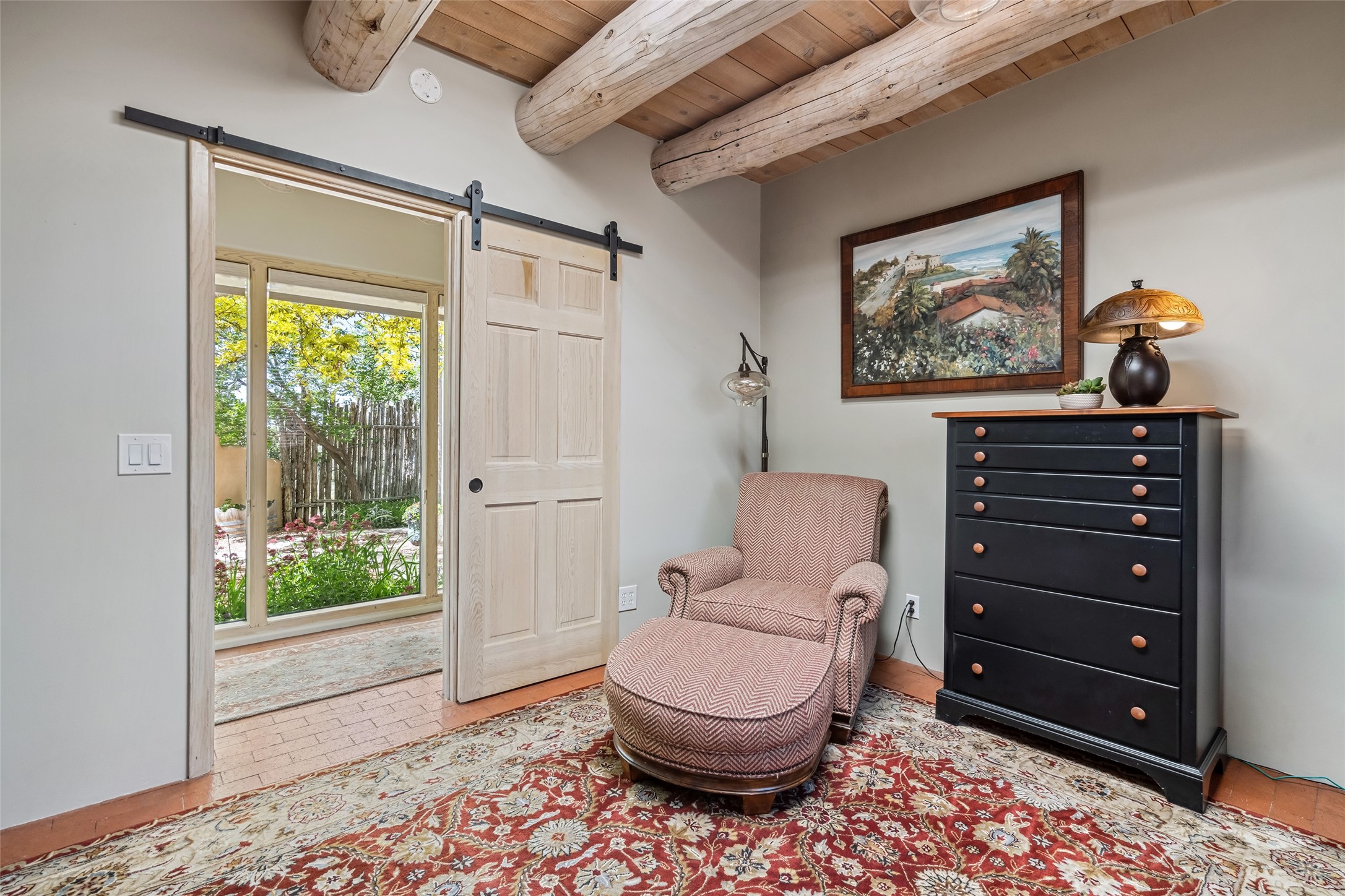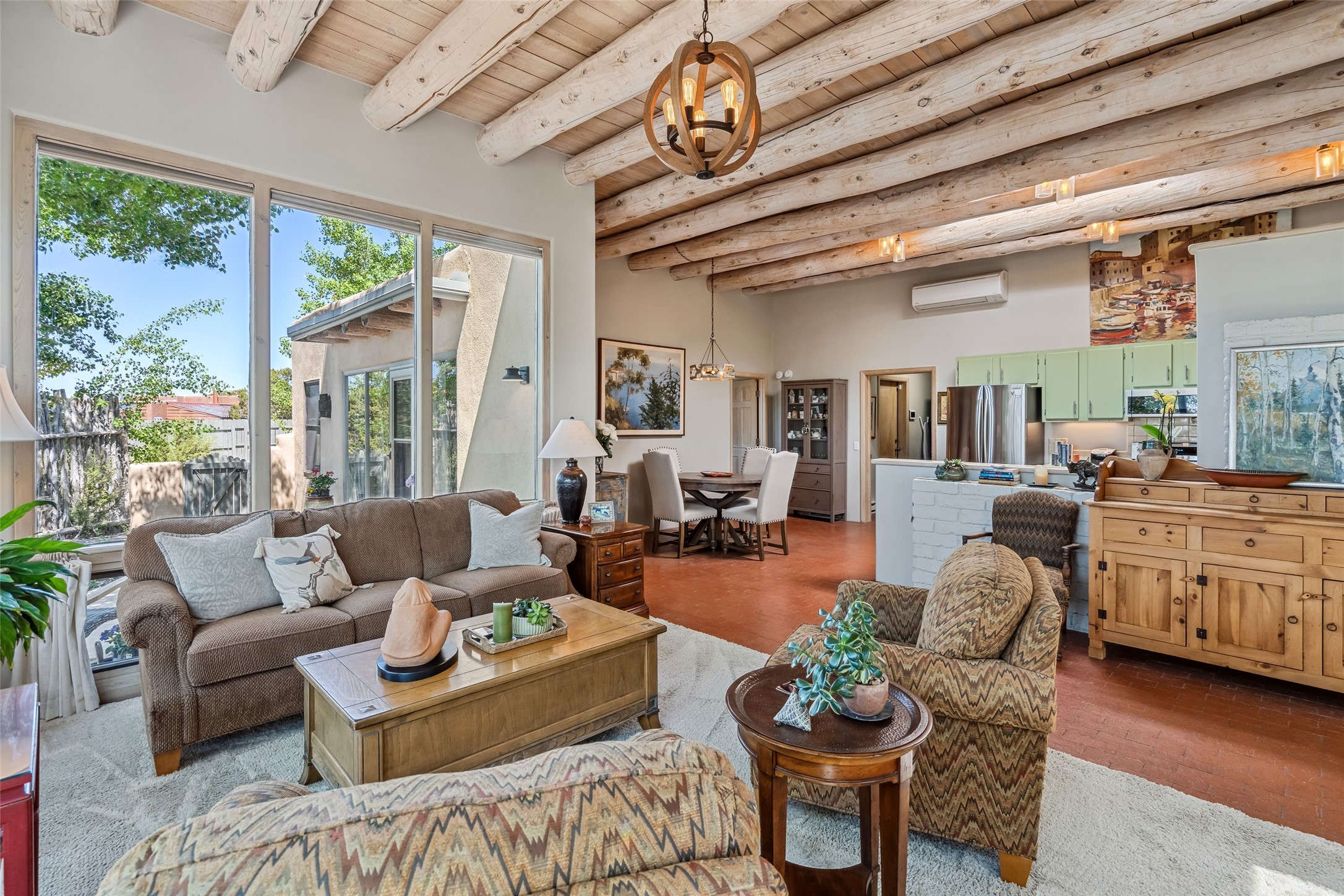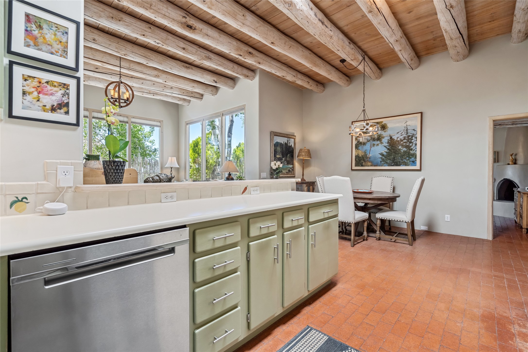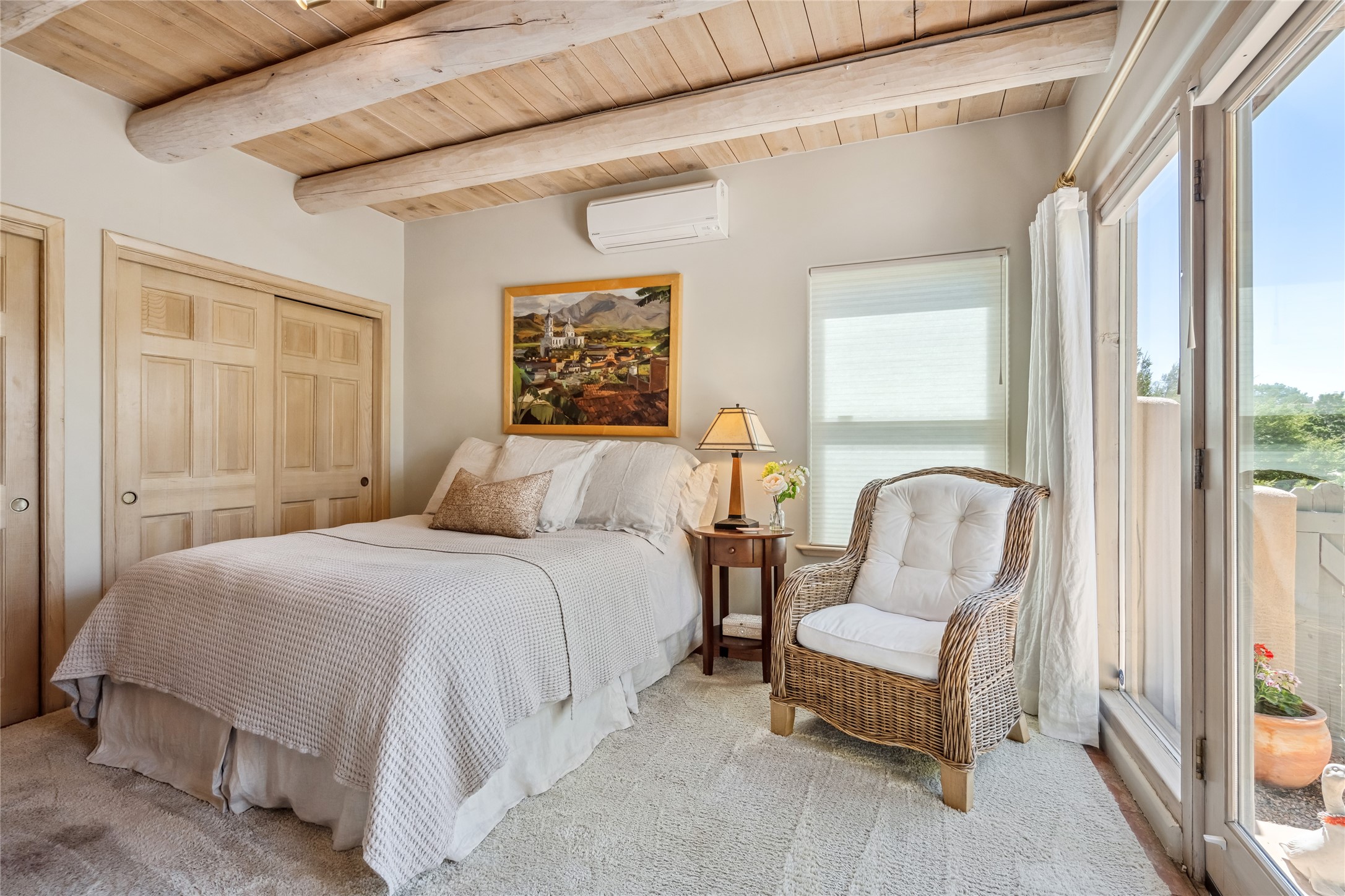 Discover the beauty and serenity of this stunningly landscaped Santa Fe retreat at 22 Esquila Rd. Boasting 3 bedrooms and 2 bathrooms, this thoughtfully designed and updated home offers a perfect blend of Southwestern charm and modern comfort.The primary suite is a true sanctuary, featuring a cozy corner kiva fireplace, a spacious walk-in closet, and bathroom with jetted tub--ideal for relaxation after a busy day. The open kitchen with stainless steel appliances is directly connected to the living area which is airy and inviting; soaring ceilings and vibrant Vigas add authentic southwestern character. Large windows flood the space with natural light and frame breathtaking views of the gorgeously landscaped patio courtyard, creating an idyllic setting for outdoor entertaining or quiet retreat. The lovely guest room is a second primary with adjoining bathroom which opens into the courtyard.Step outside to your private oasis where meticulously curated gardens on a timed sprinkler system create a peaceful haven with vibrant coloring plants. The landscaping was designed for maximum color and minimum maintenance. Walk out onto inviting patios with plentiful shade provided by mature Aspens in the warm Summer months. Whether enjoying a morning coffee or hosting friends beneath the starry sky, this property seamlessly combines indoor comfort with outdoor paradise.Don't miss the opportunity to make this beautifully landscaped Santa Fe home your own!